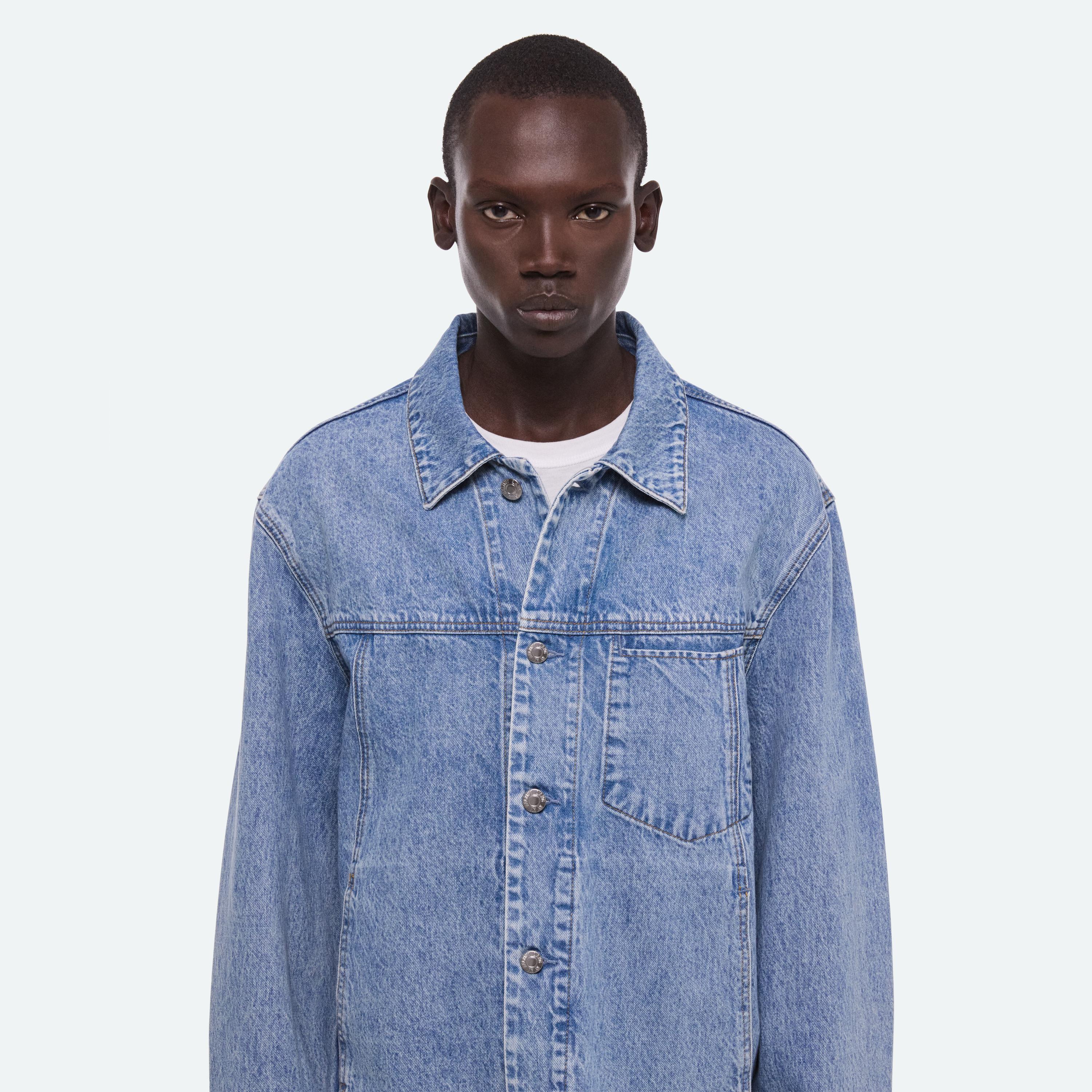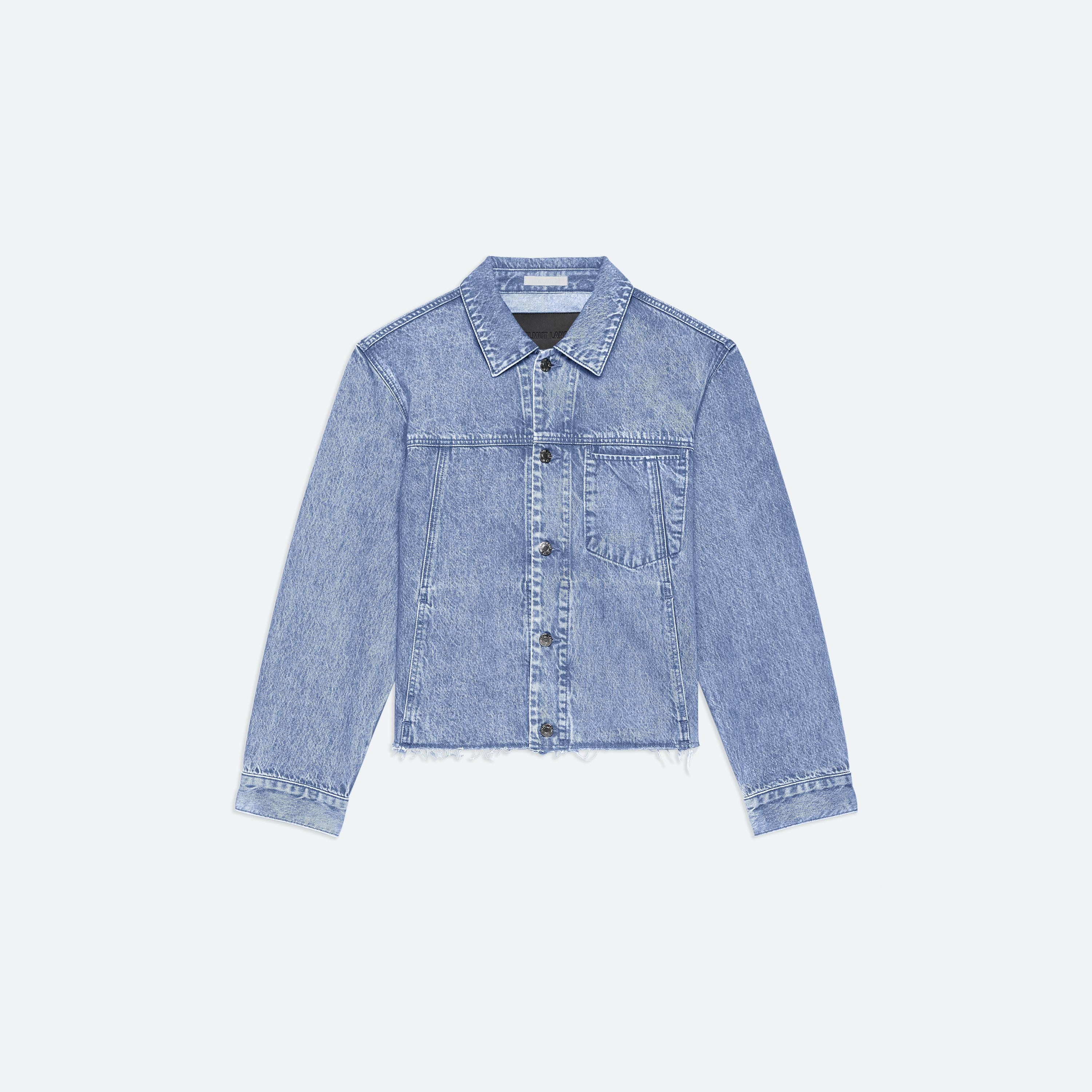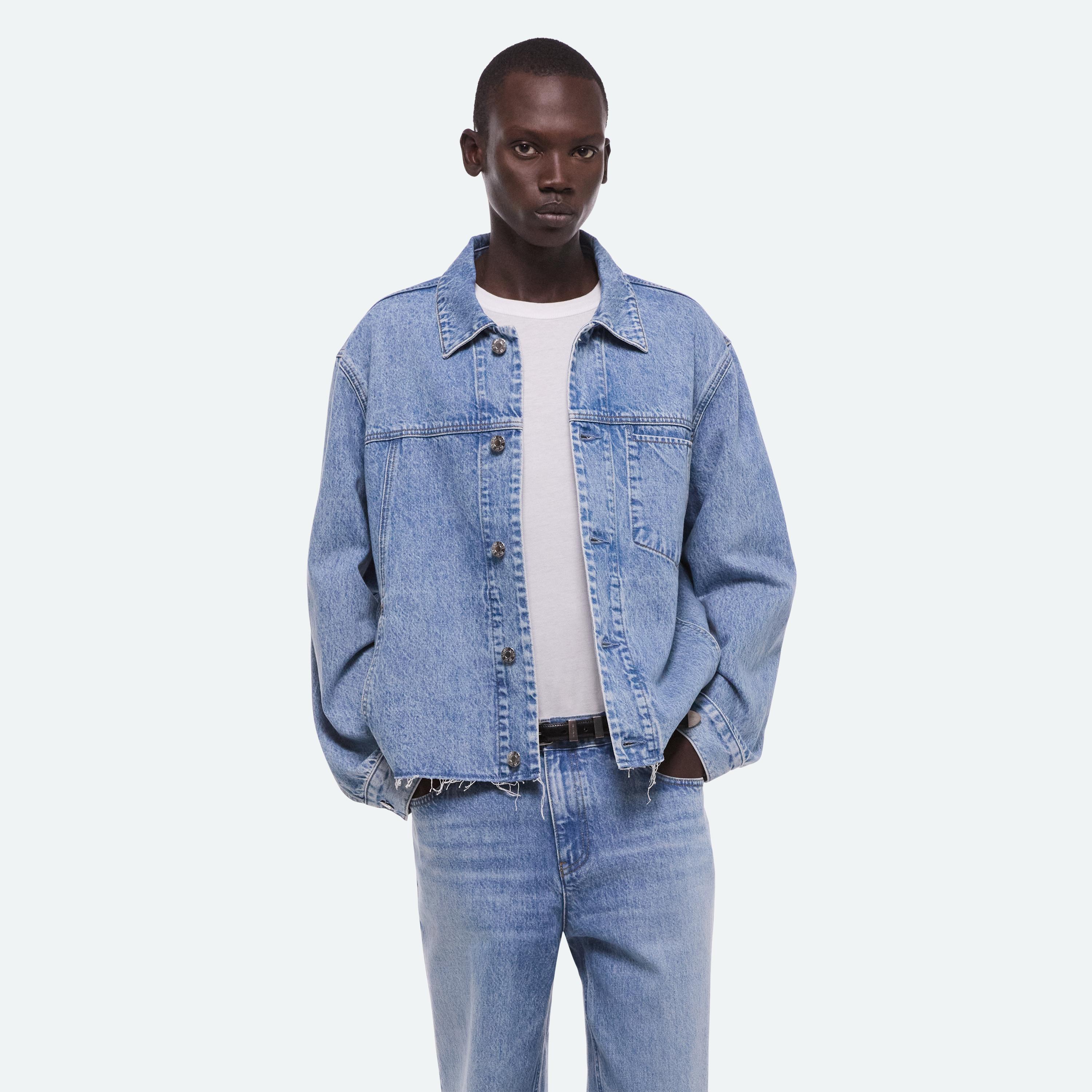 Trucker jacket in Italian denim with a light indigo rinse. Features a front welt pocket that reinterprets classic trucker construction and finished with a raw hem.