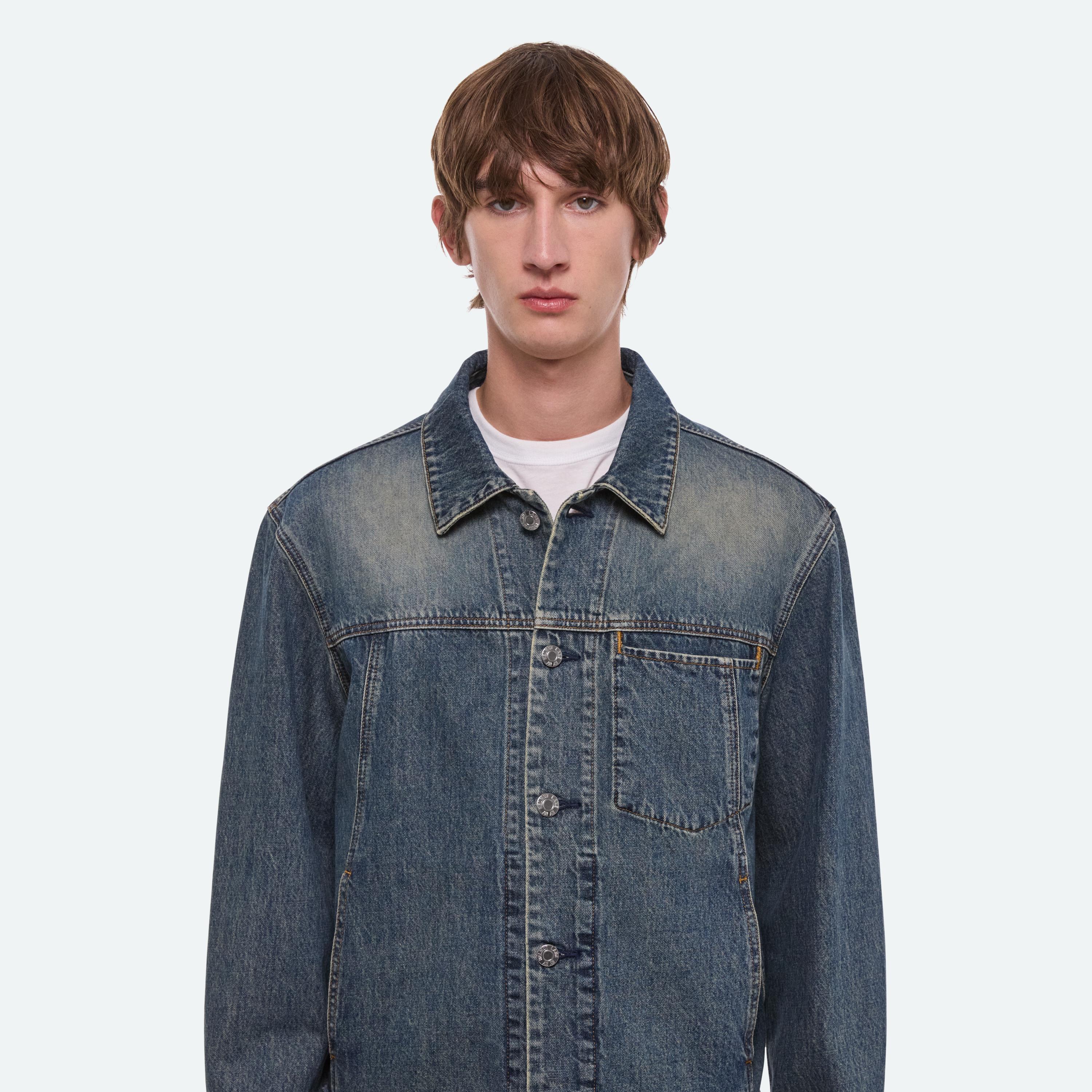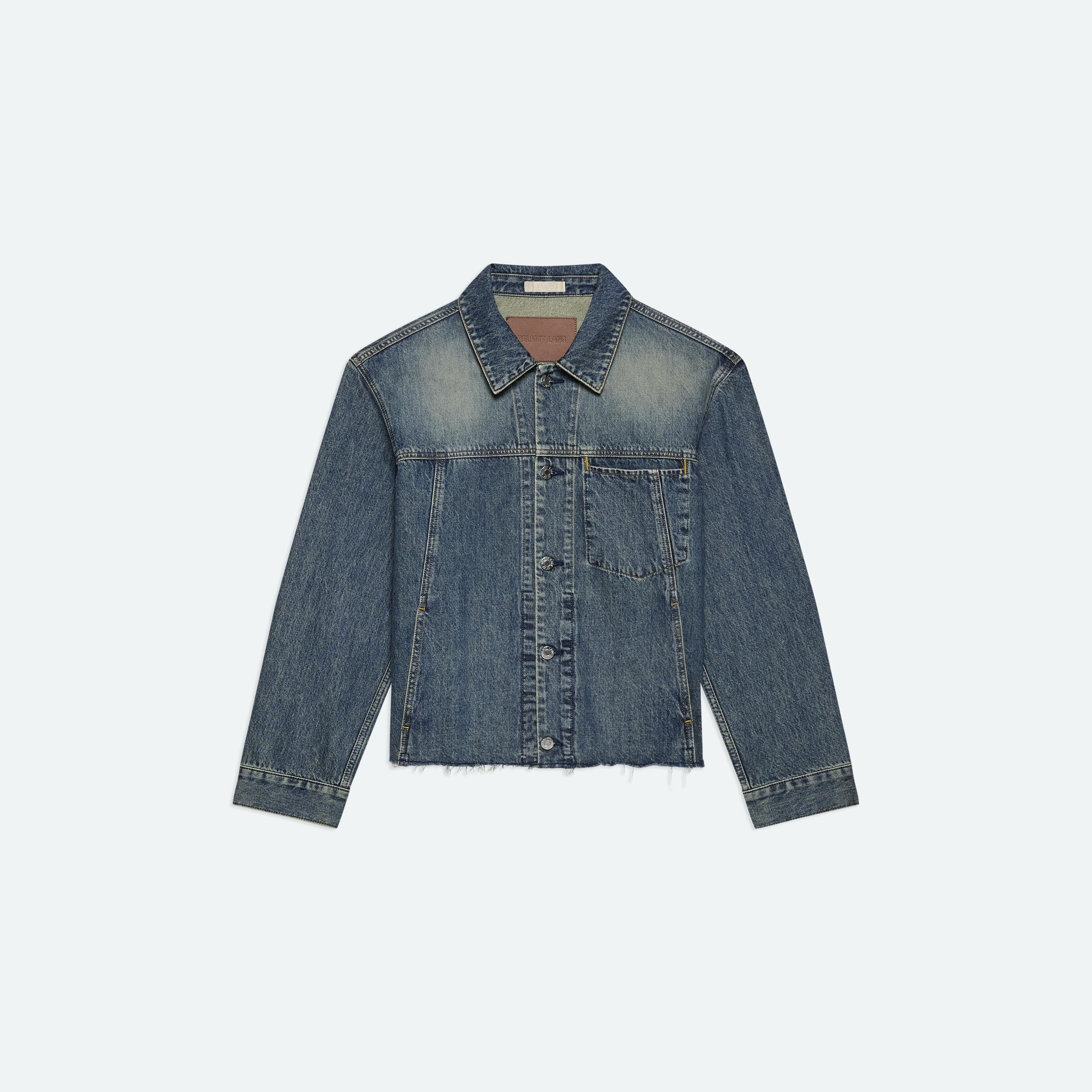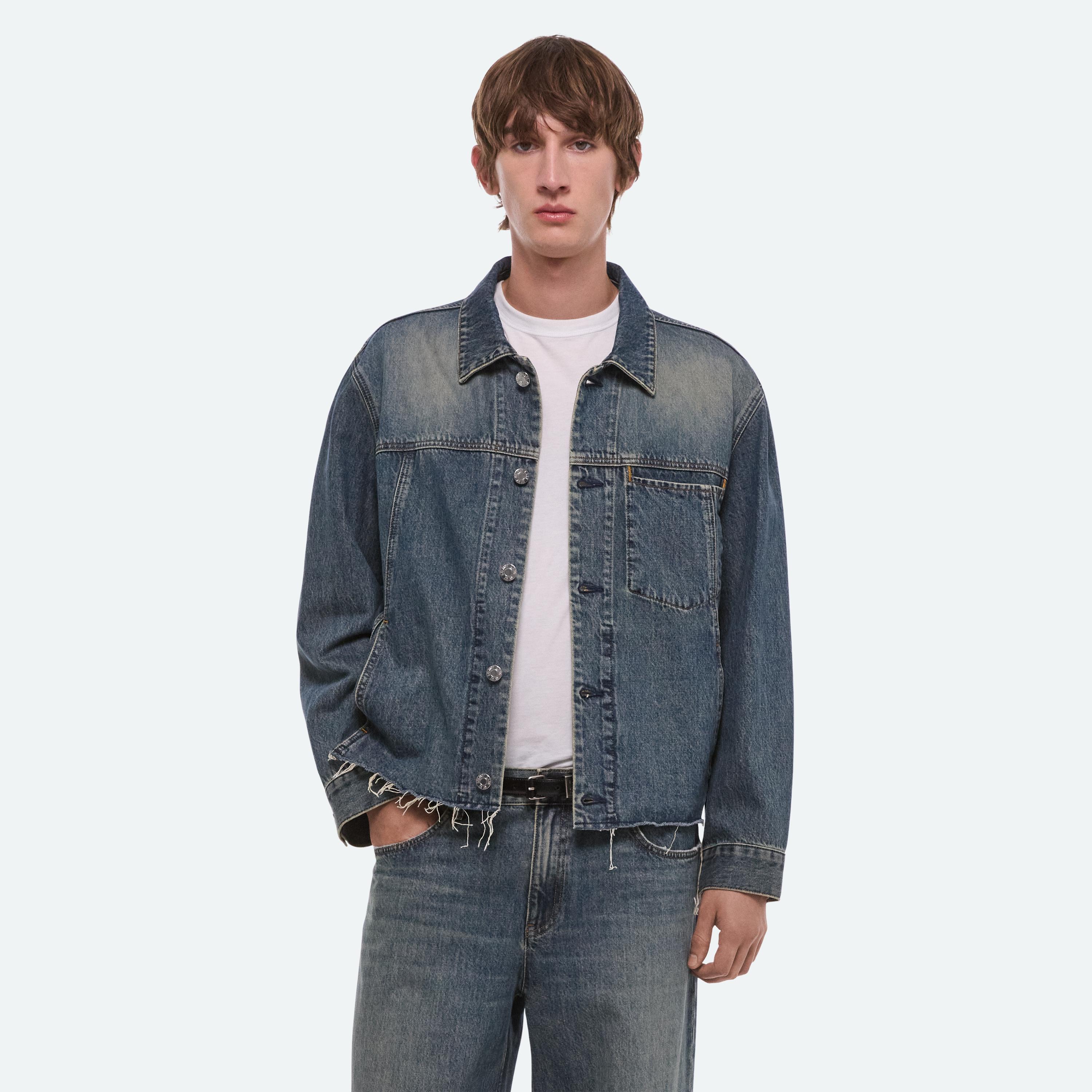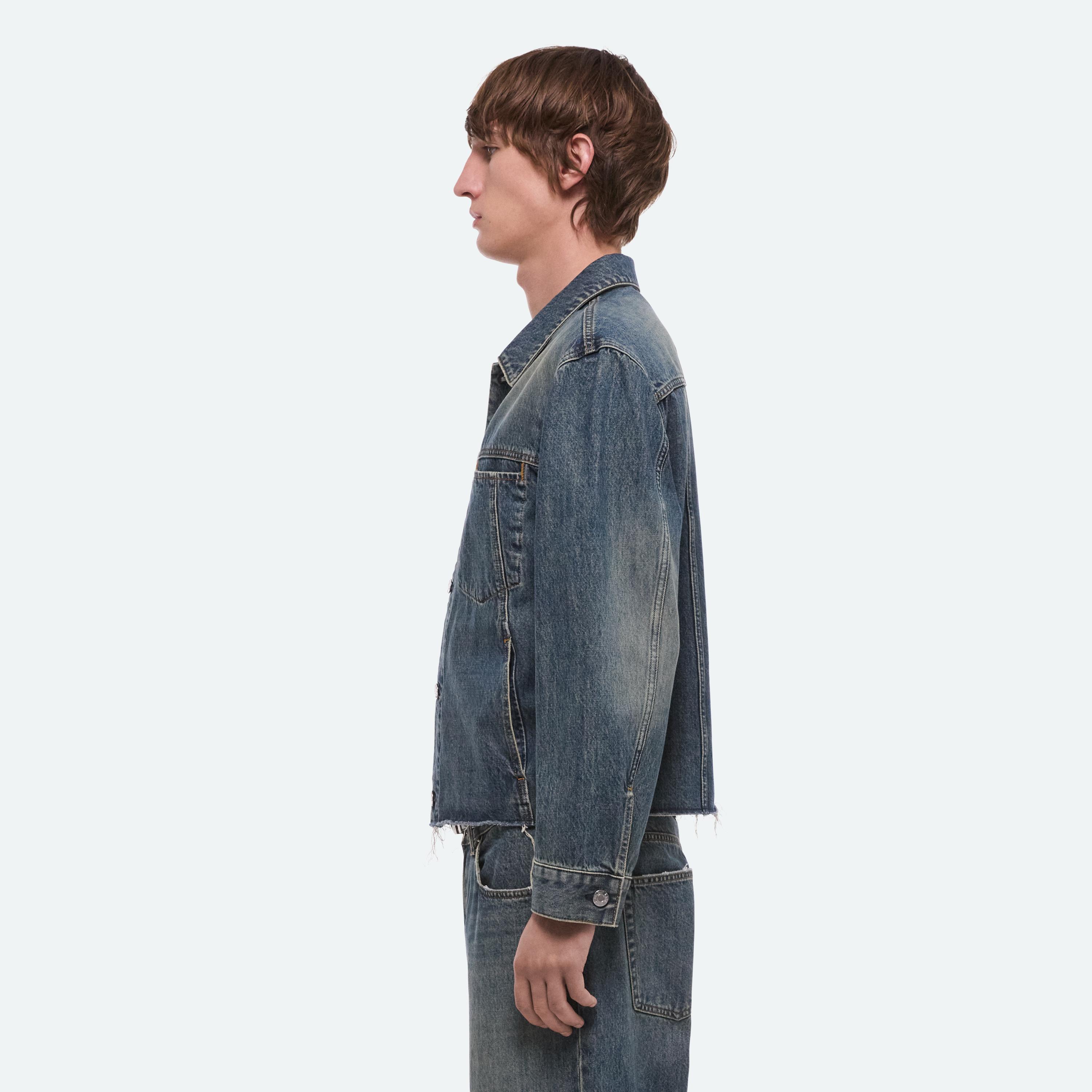 Trucker jacket in Italian denim with a dark indigo wash and a slight green tint. Features a front welt pocket that reinterprets classic trucker construction and finished with a raw hem.