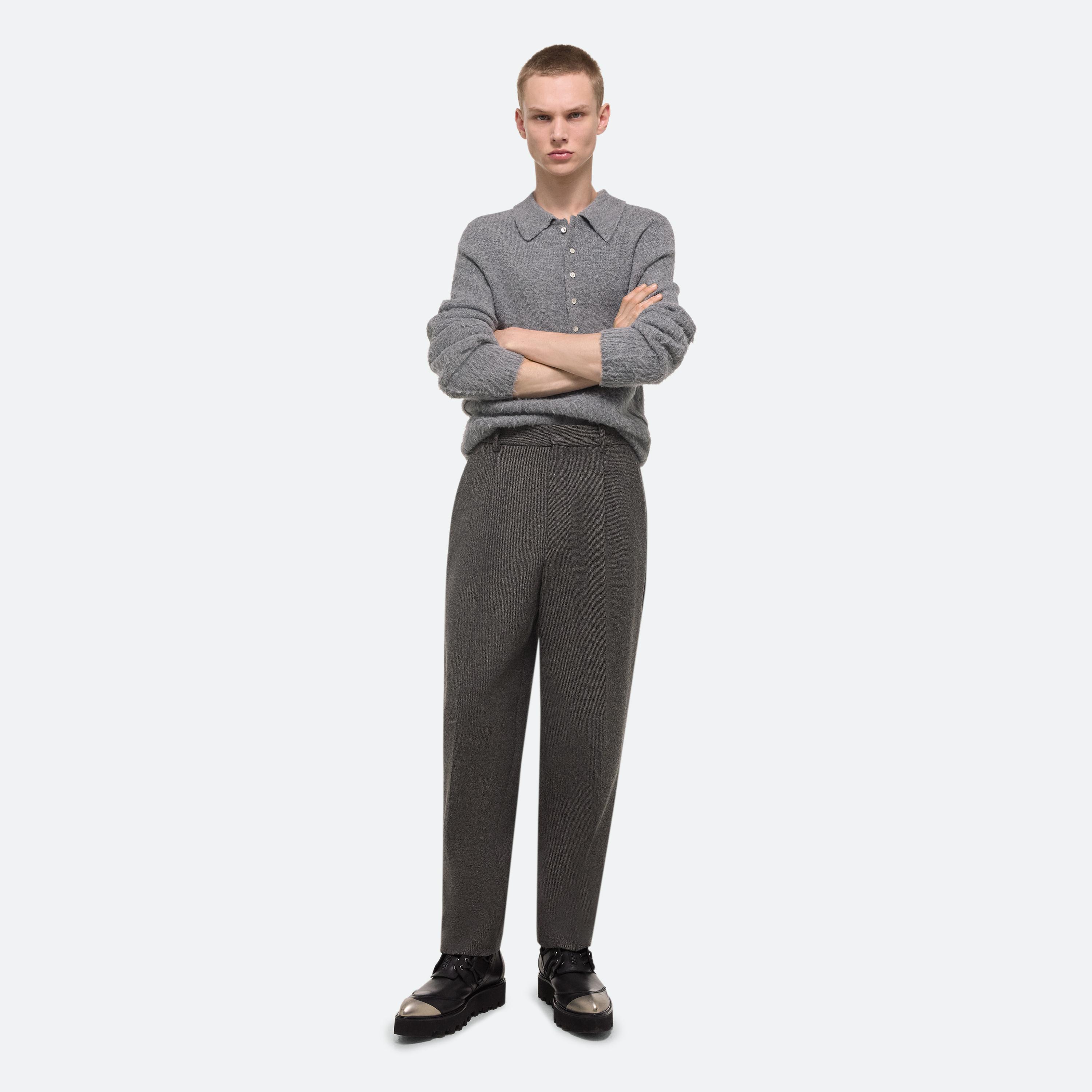Cropped trousers in soft wool twill. Front pleats and a relaxed rise create a fuller leg that tapers at the ankle for a slight carrot shape.