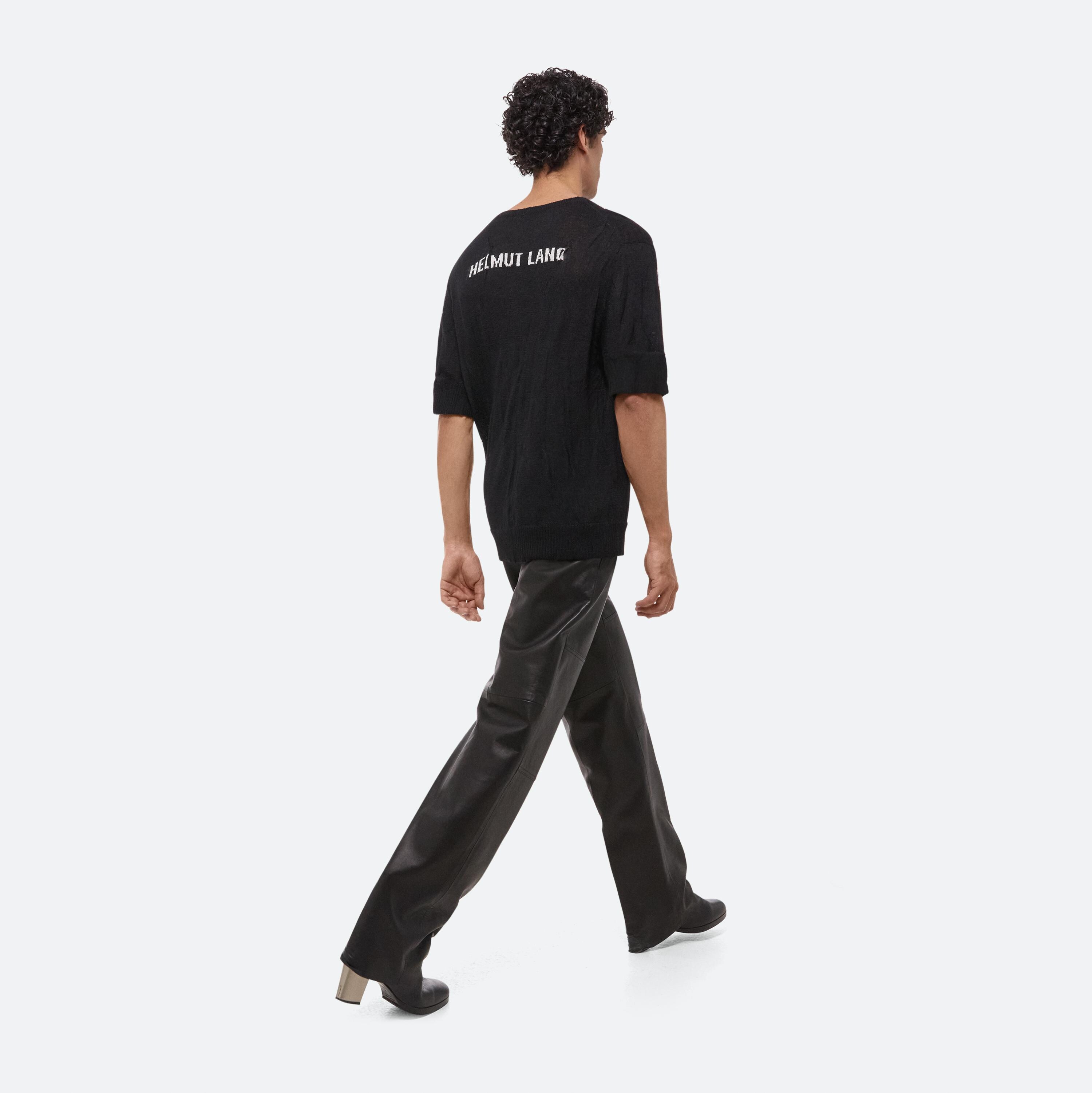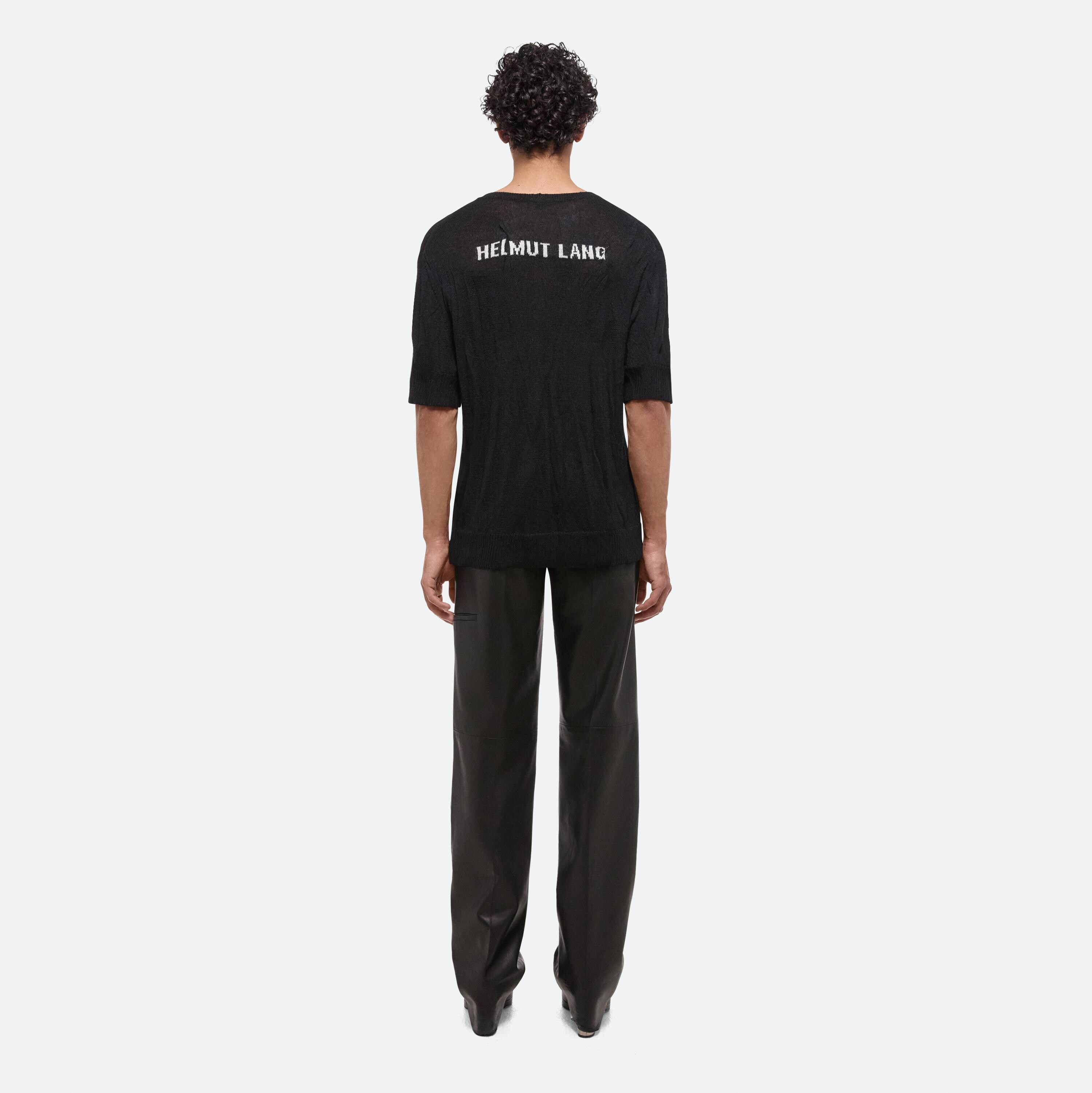 Fine gauge relaxed tee with the HELMUT LANG logo intarsia on back. The crush textured is formed by a special heat treatment executed by hand.