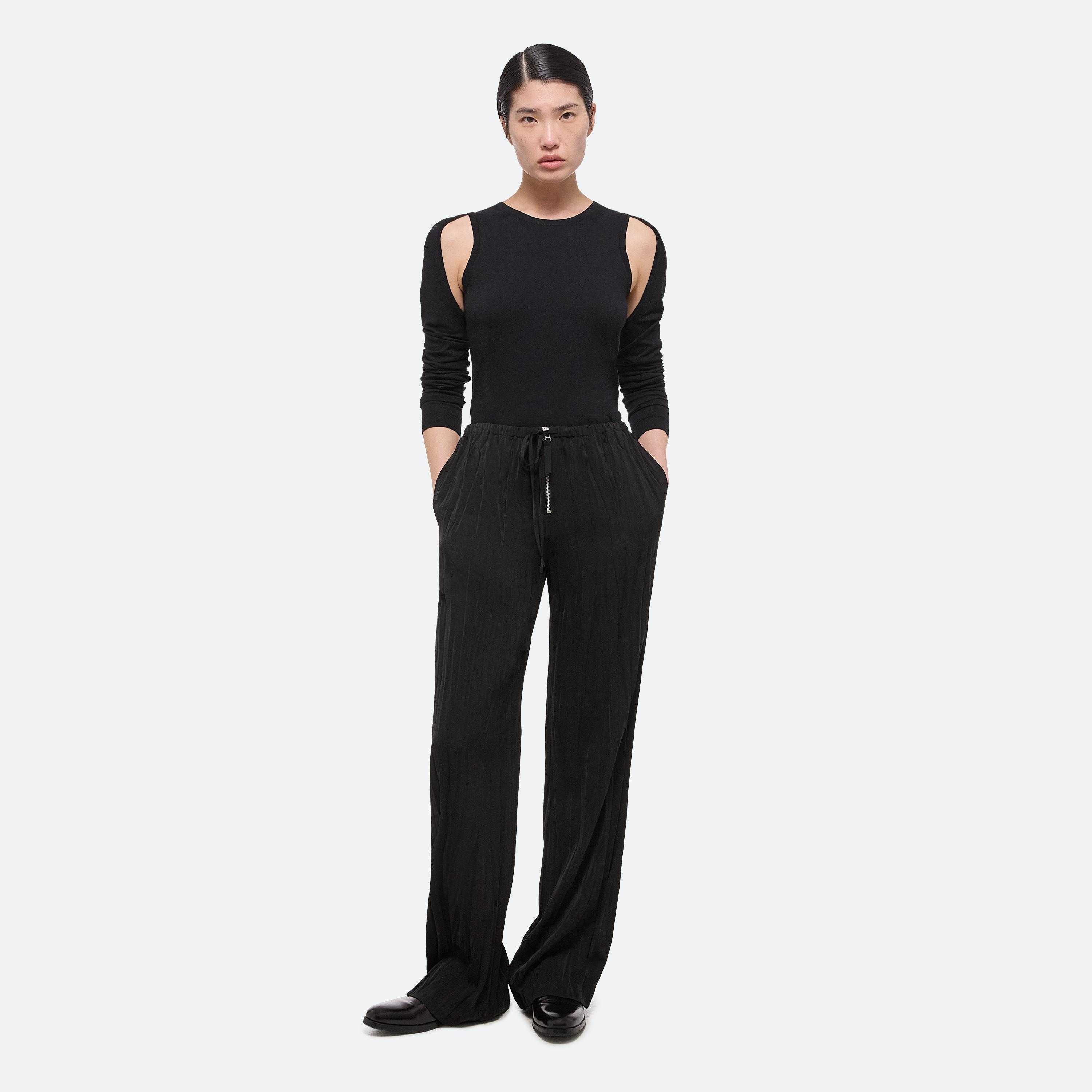 Drawstring trouser with an easy, relaxed fit. The pant has an exposed fly zip, with a unique, irregular crushed texture.