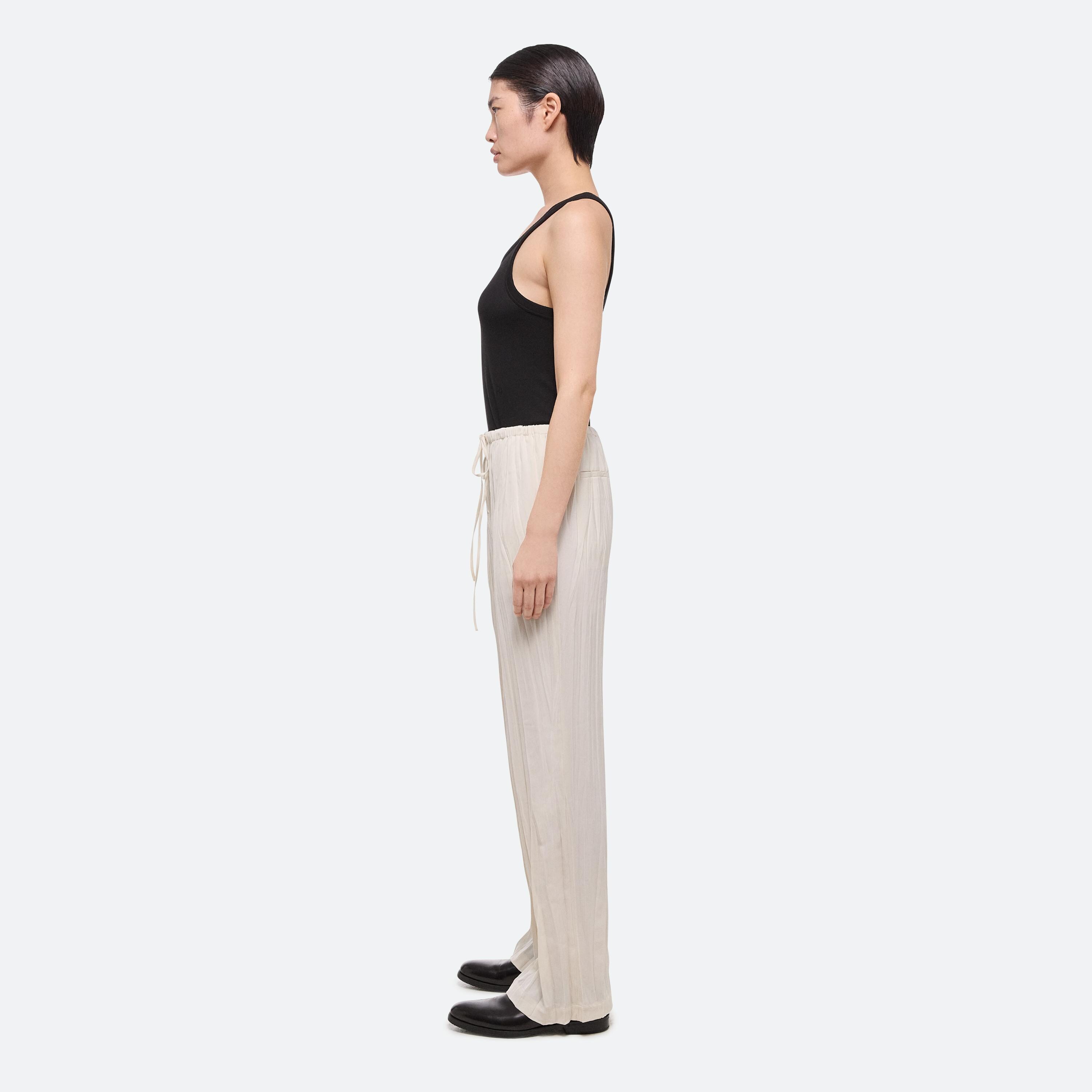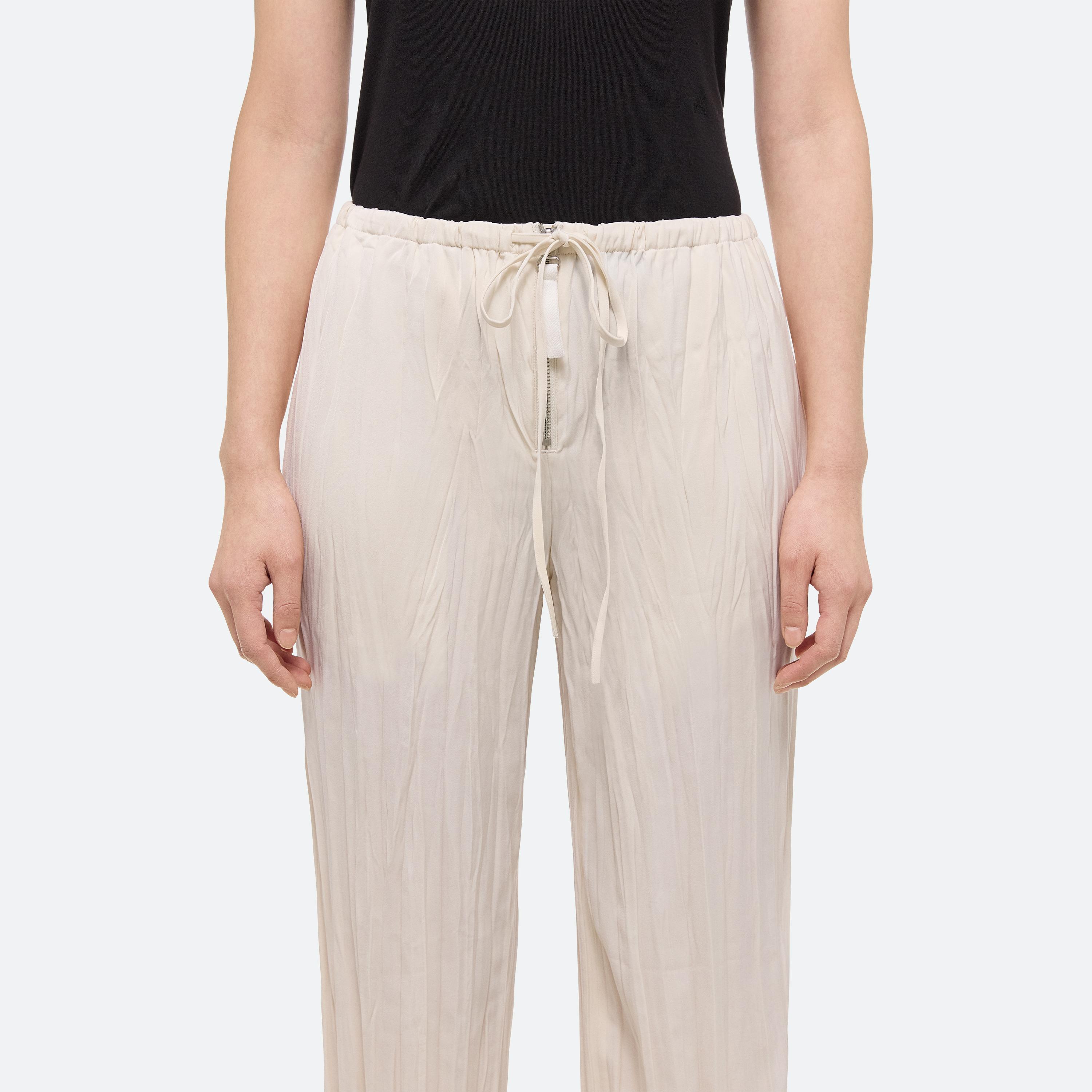 Drawstring trouser with an easy, relaxed fit. The pant has an exposed fly zip, with a unique, irregular crushed texture.