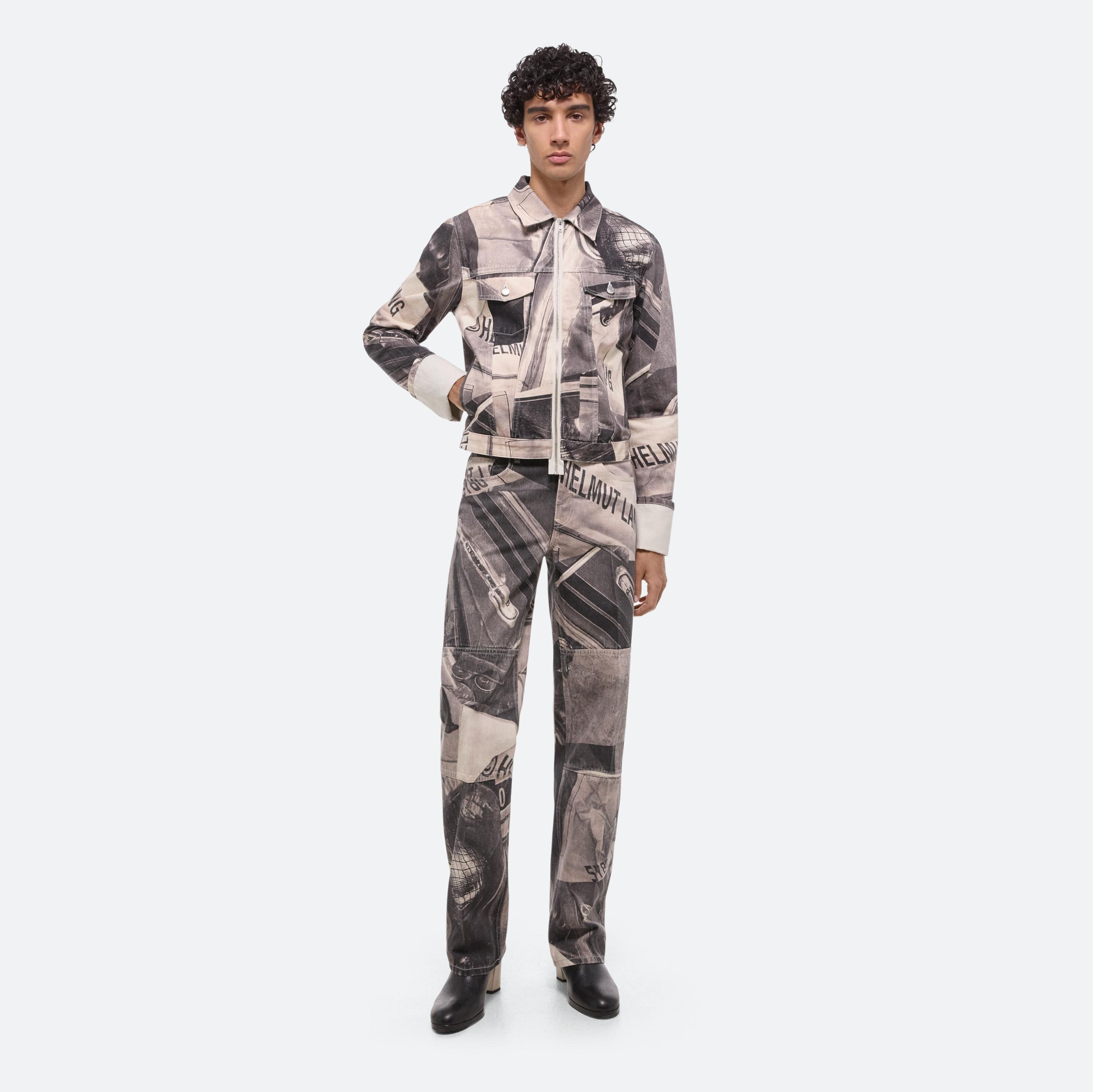 Straight fit denim trucker jacket with a front zip and exaggerated cuffs. Printed with a custom car graphic developed by our design studio.