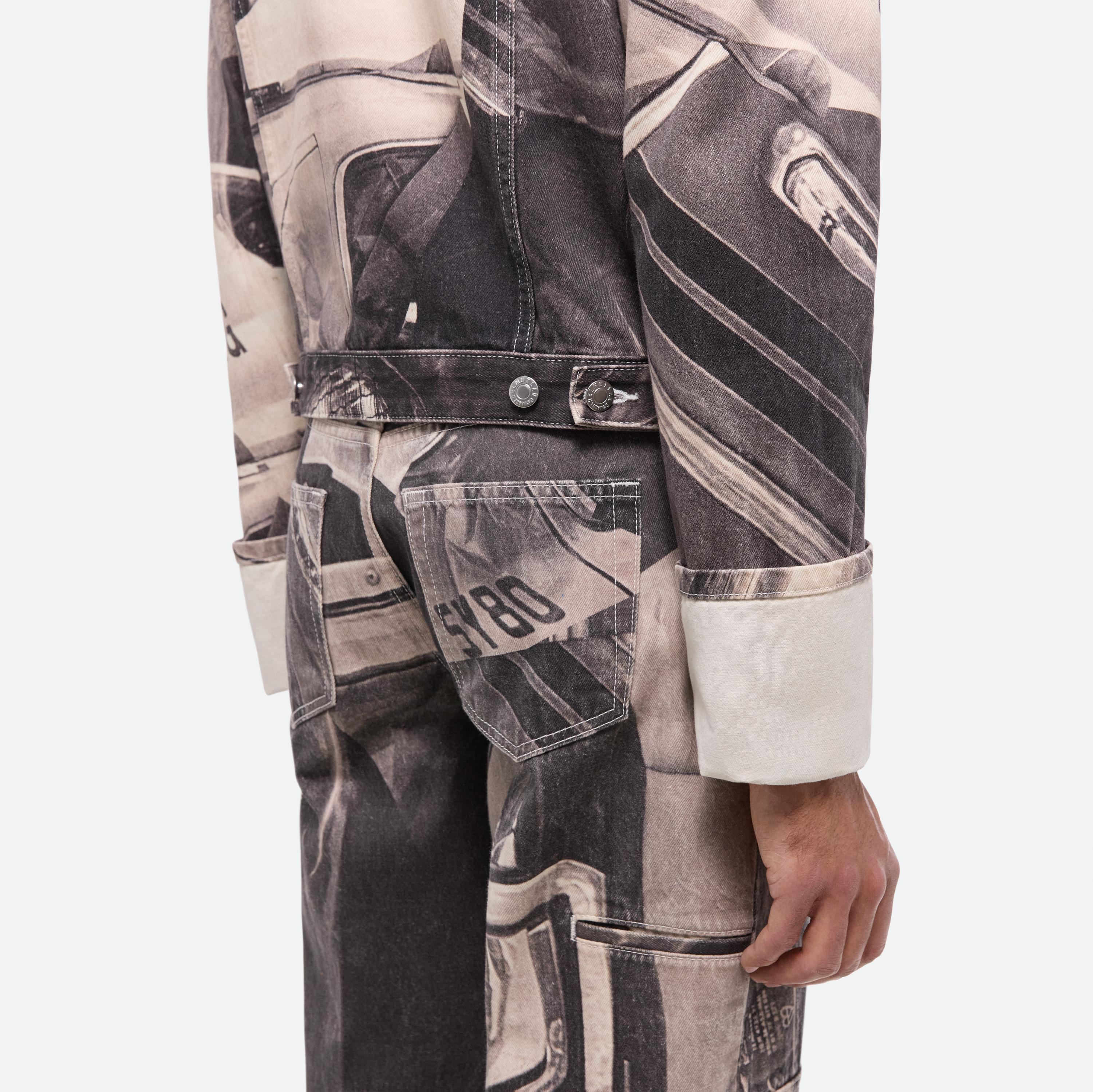 Straight fit denim trucker jacket with a front zip and exaggerated cuffs. Printed with a custom car graphic developed by our design studio.