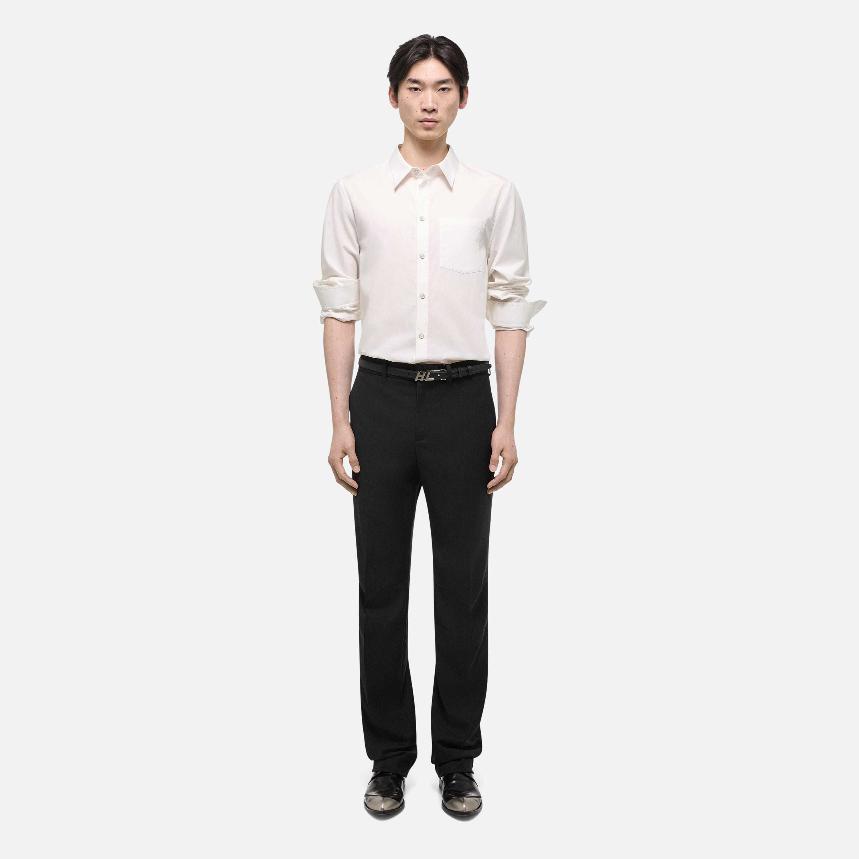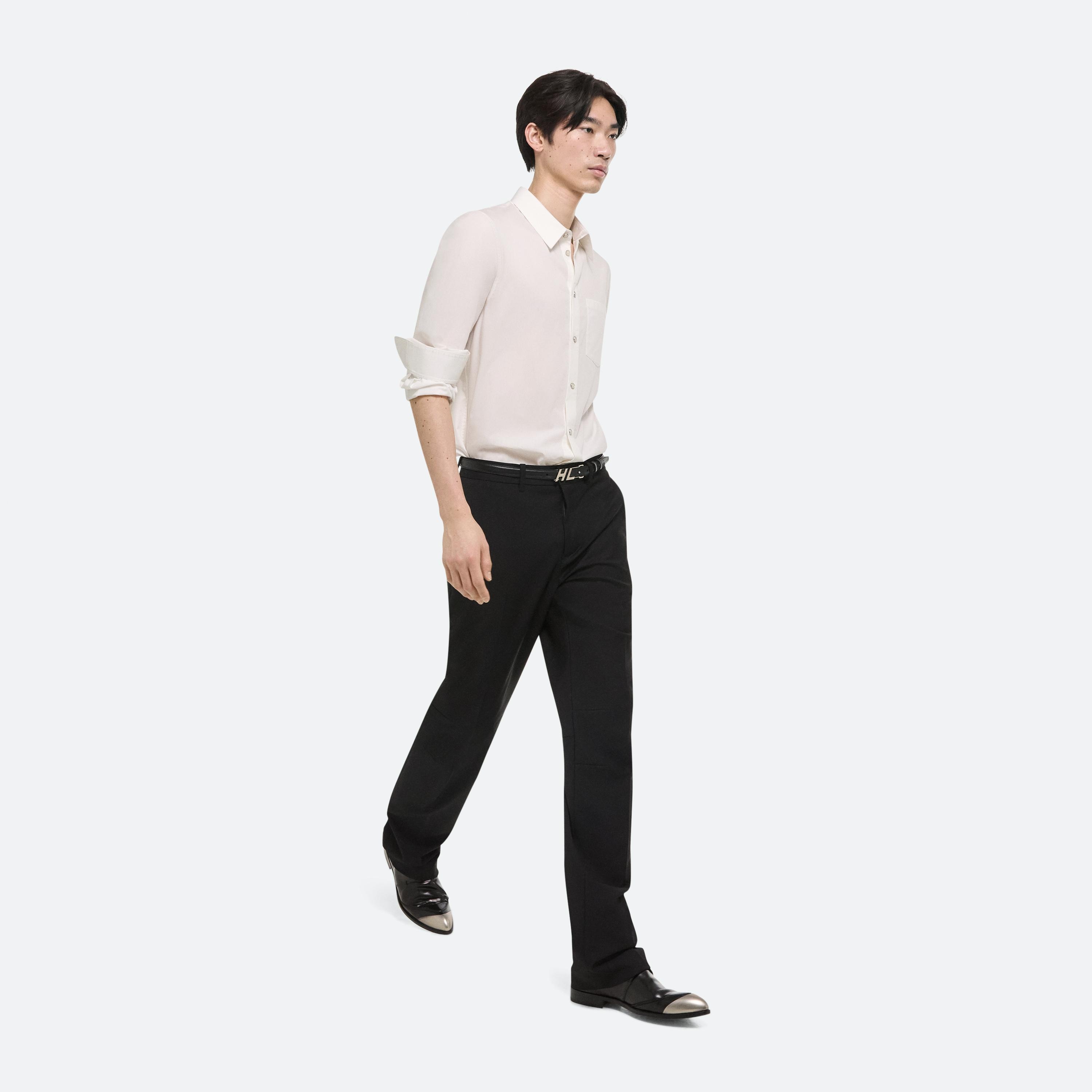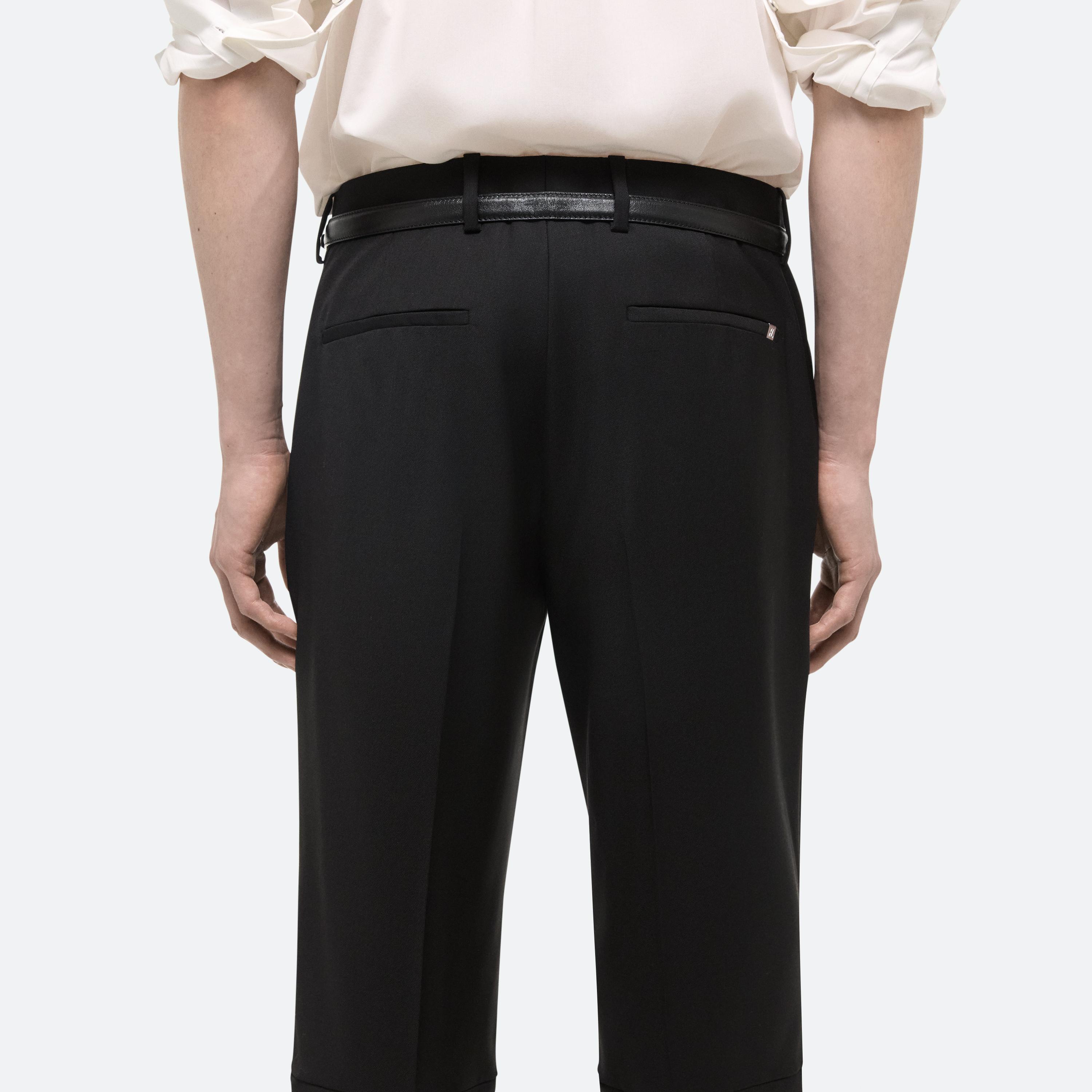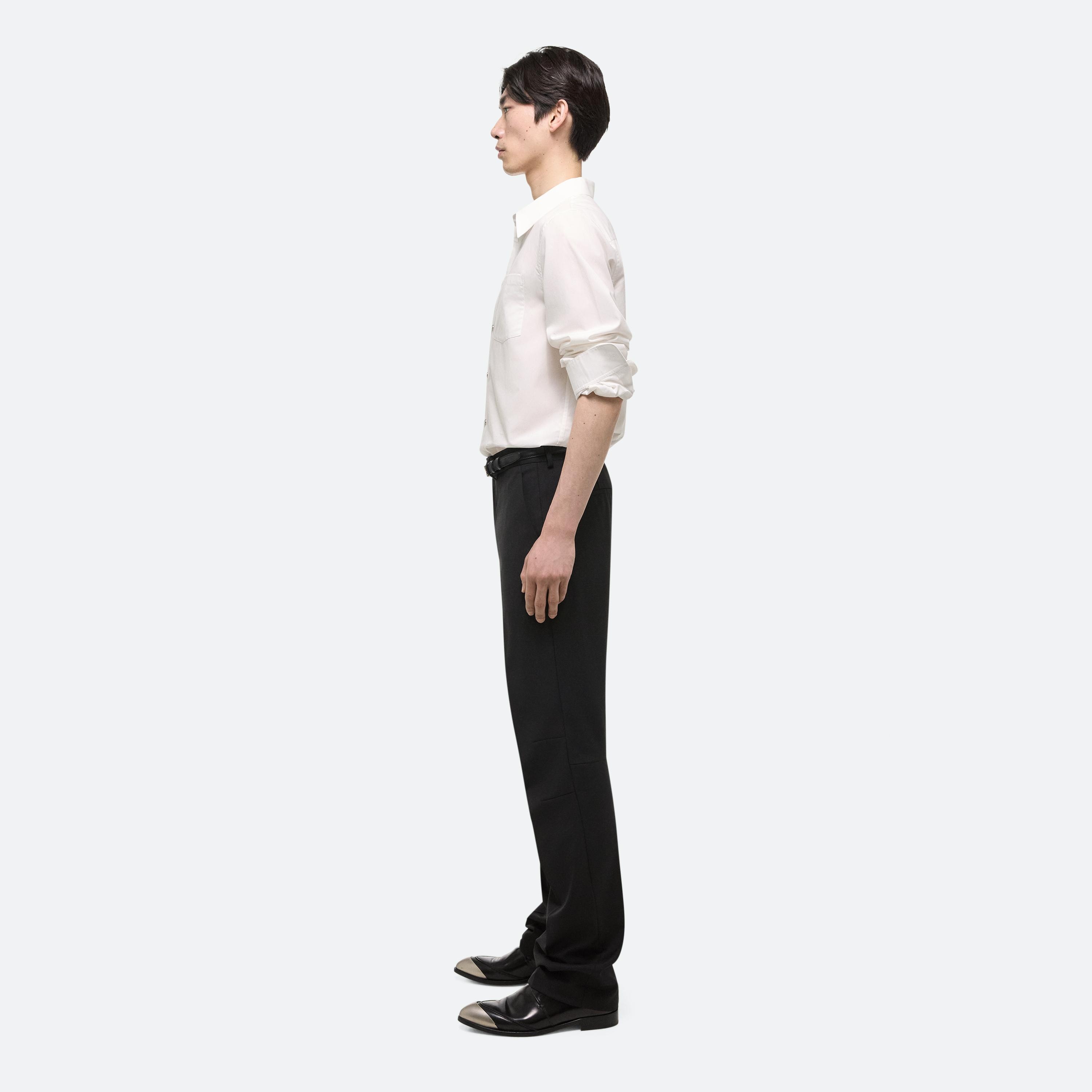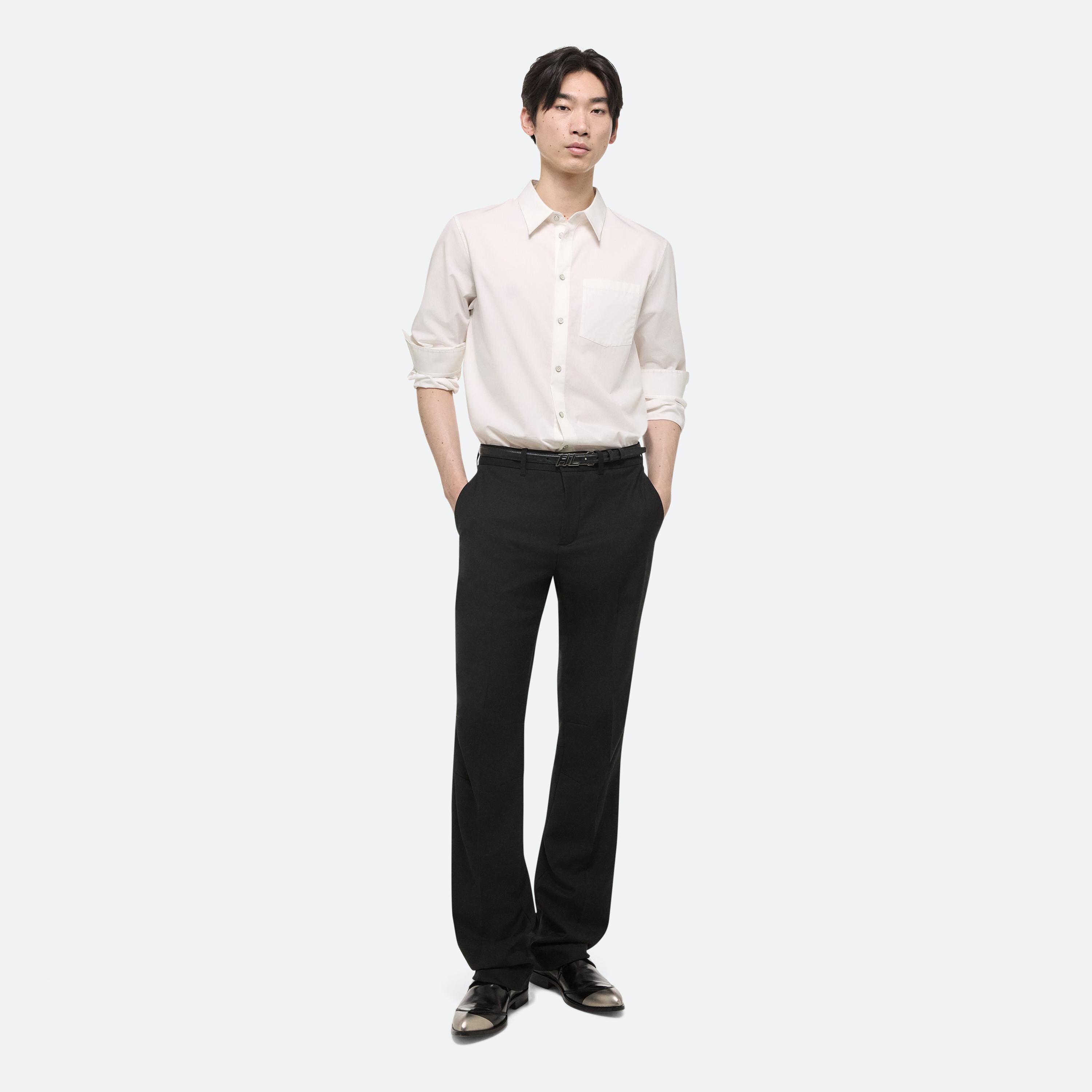 Tailored car trouser in virgin Italian wool suiting. Directional seaming creates a softly curved leg shape. Cut with a relaxed fit.