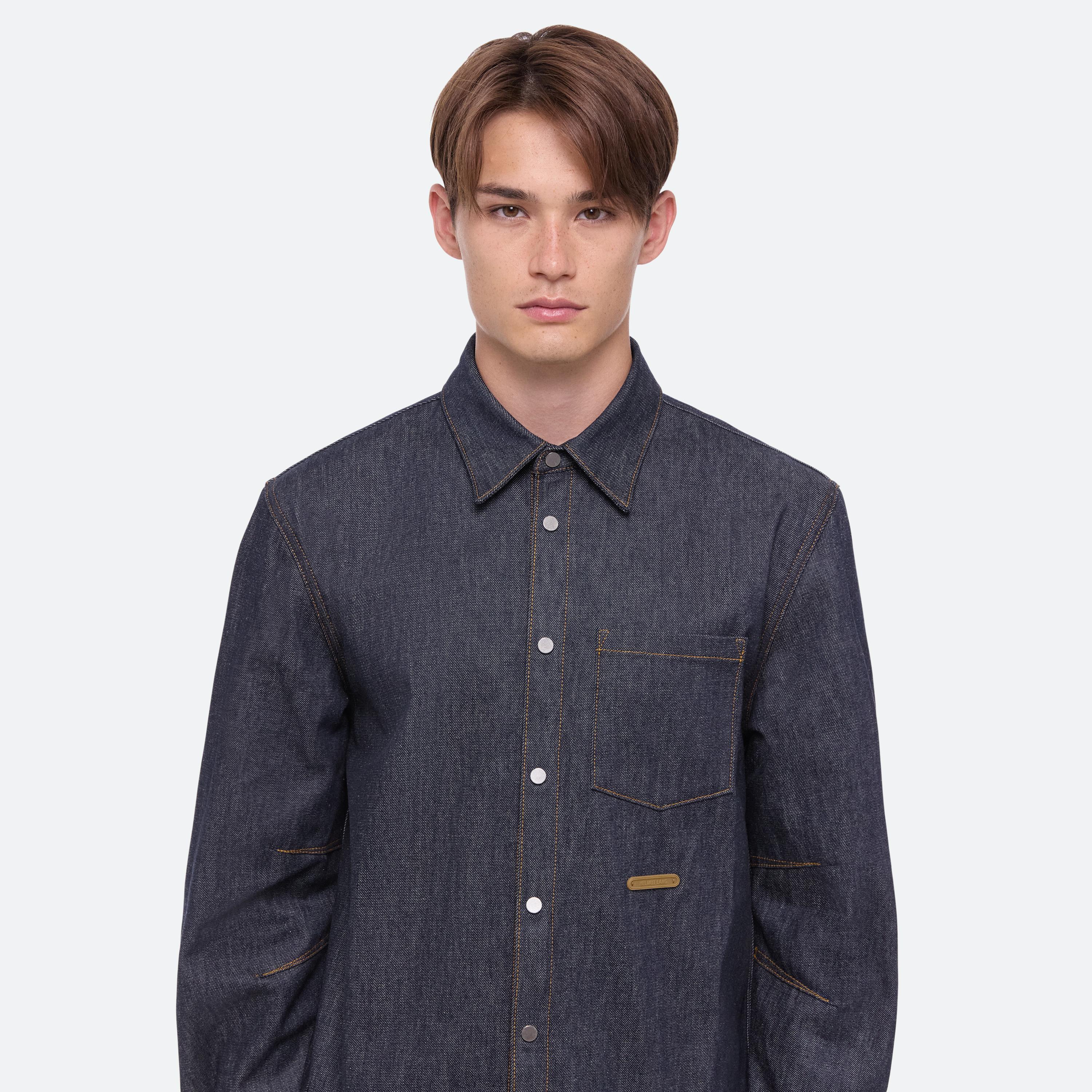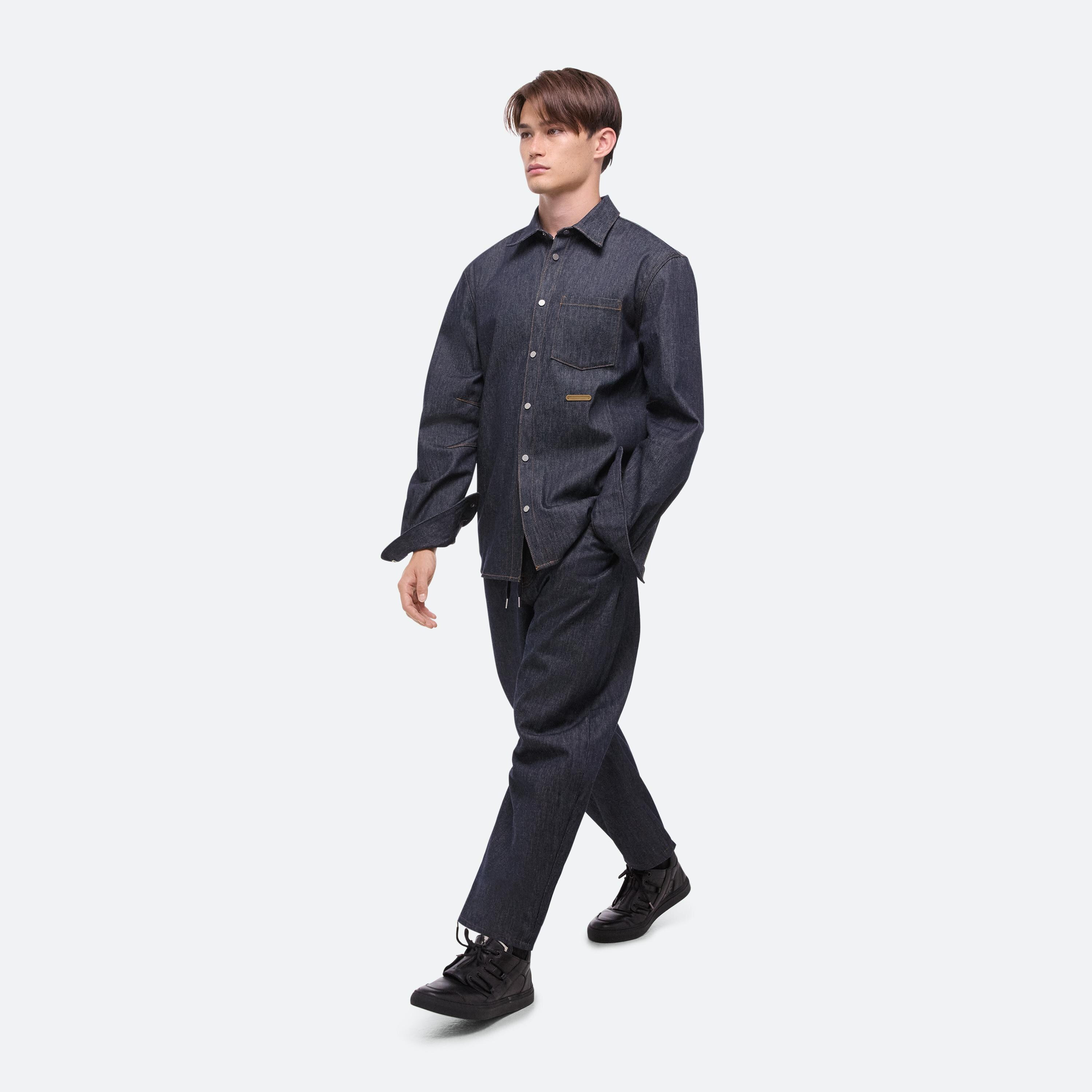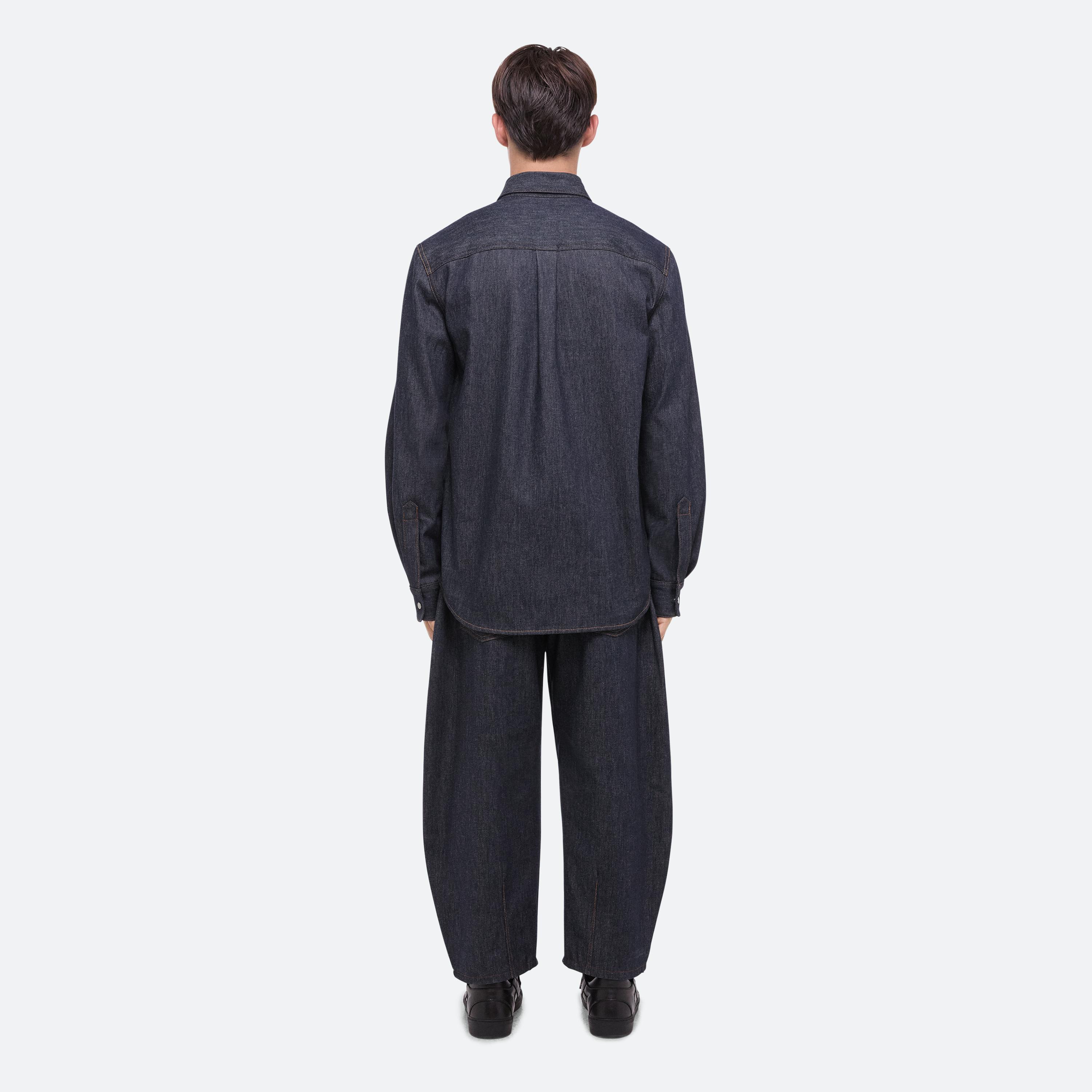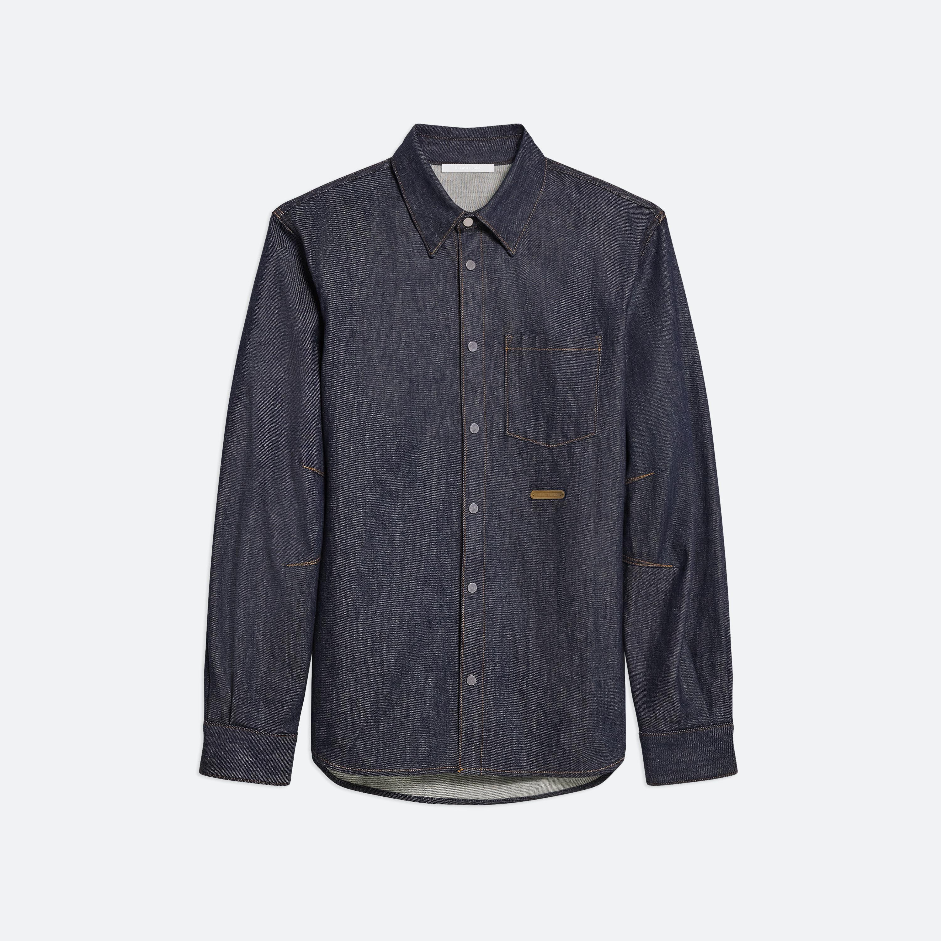 Classic button-front denim shirt in a raw indigo rinse. Directional seaming creates a softly curved sleeve.