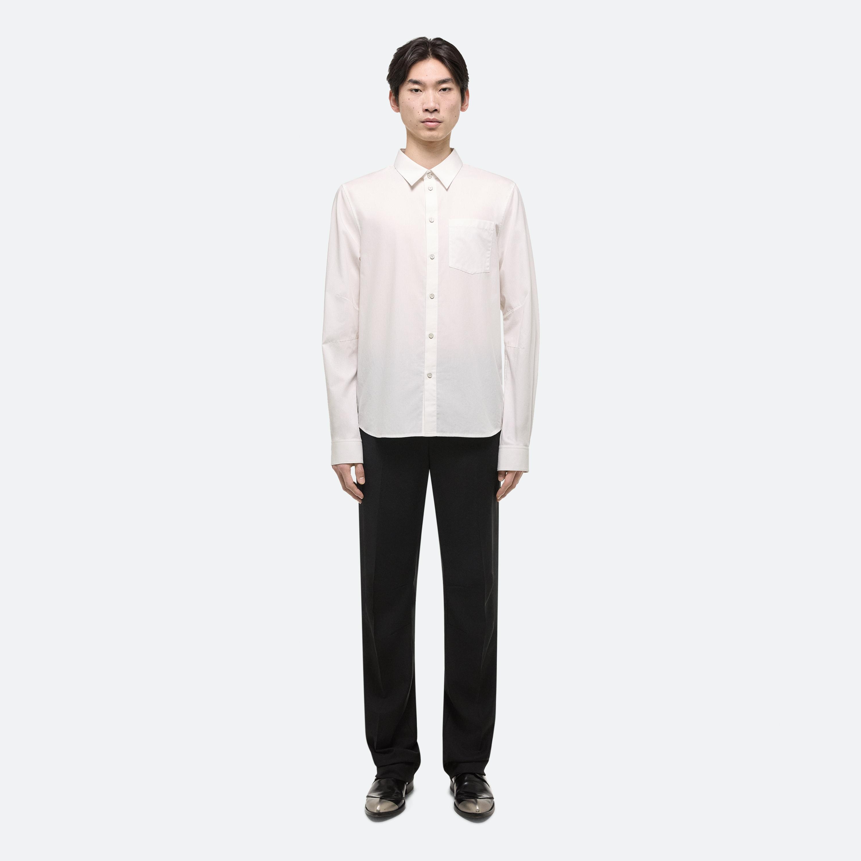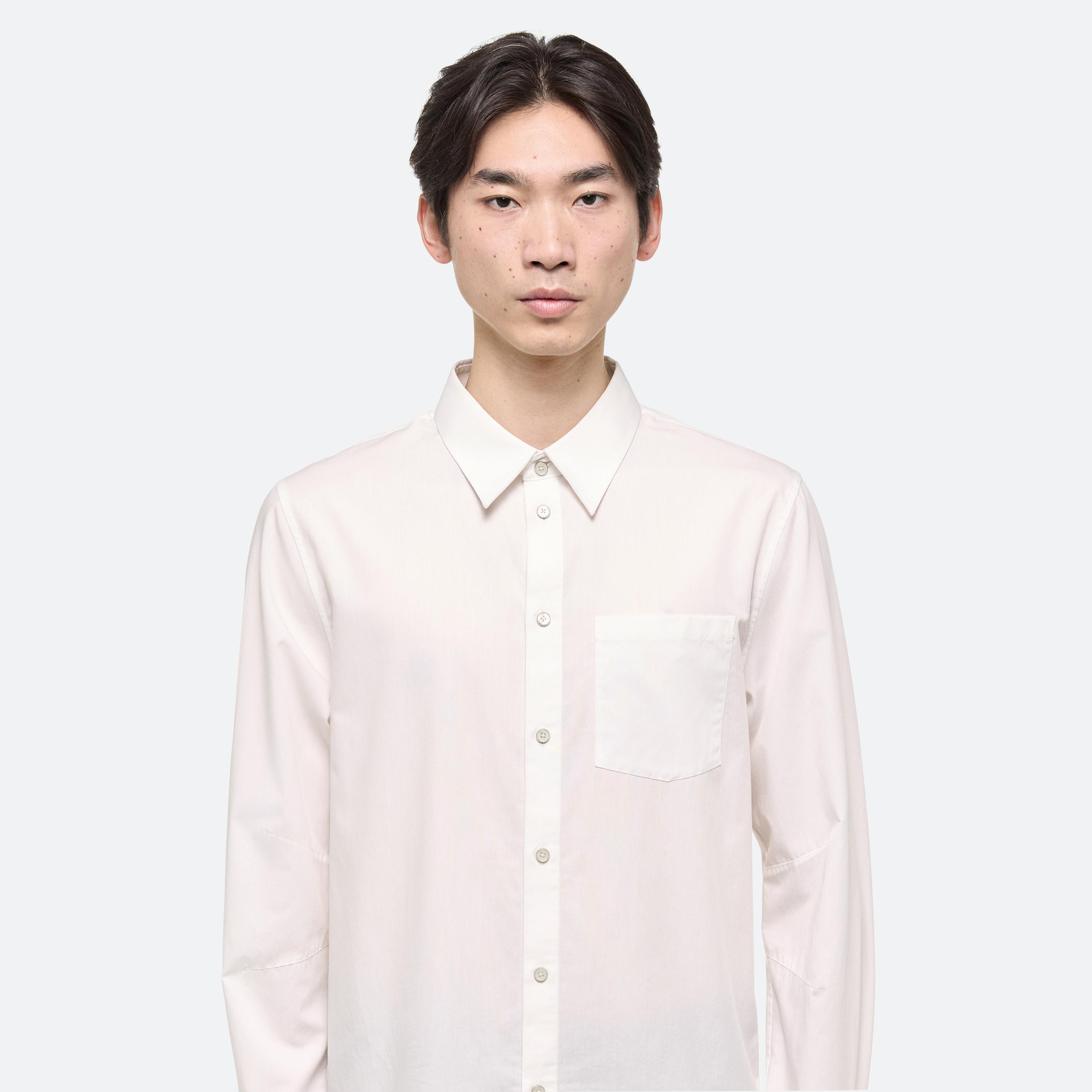 Classic shirt in soft cotton poplin with metal-wrapped buttons. Directional seaming creates a softly curved sleeve.