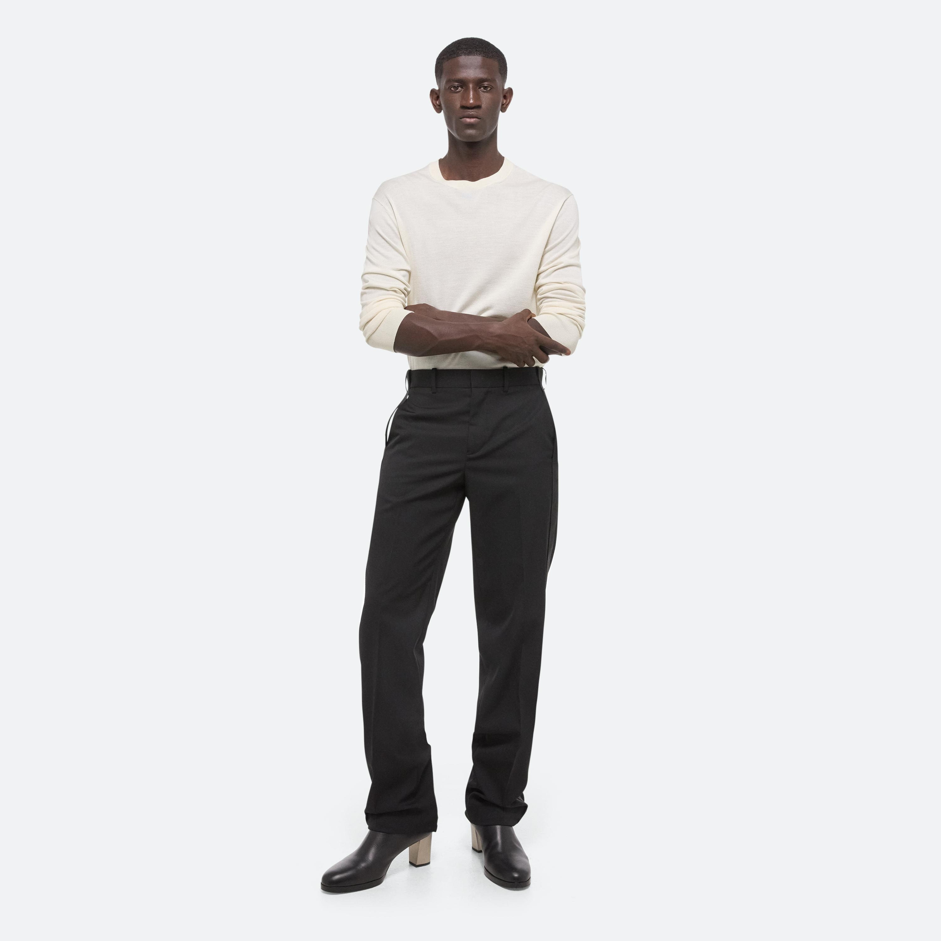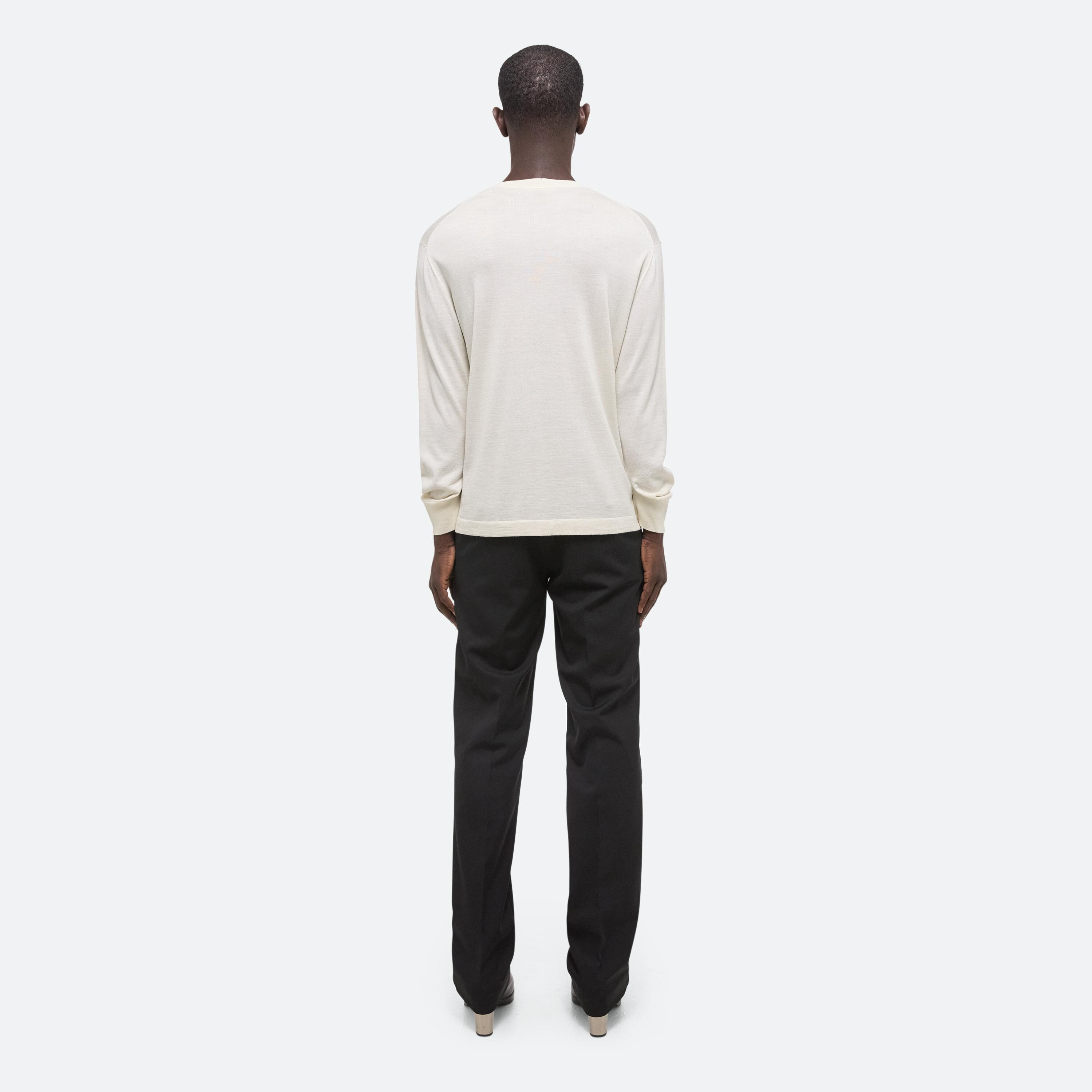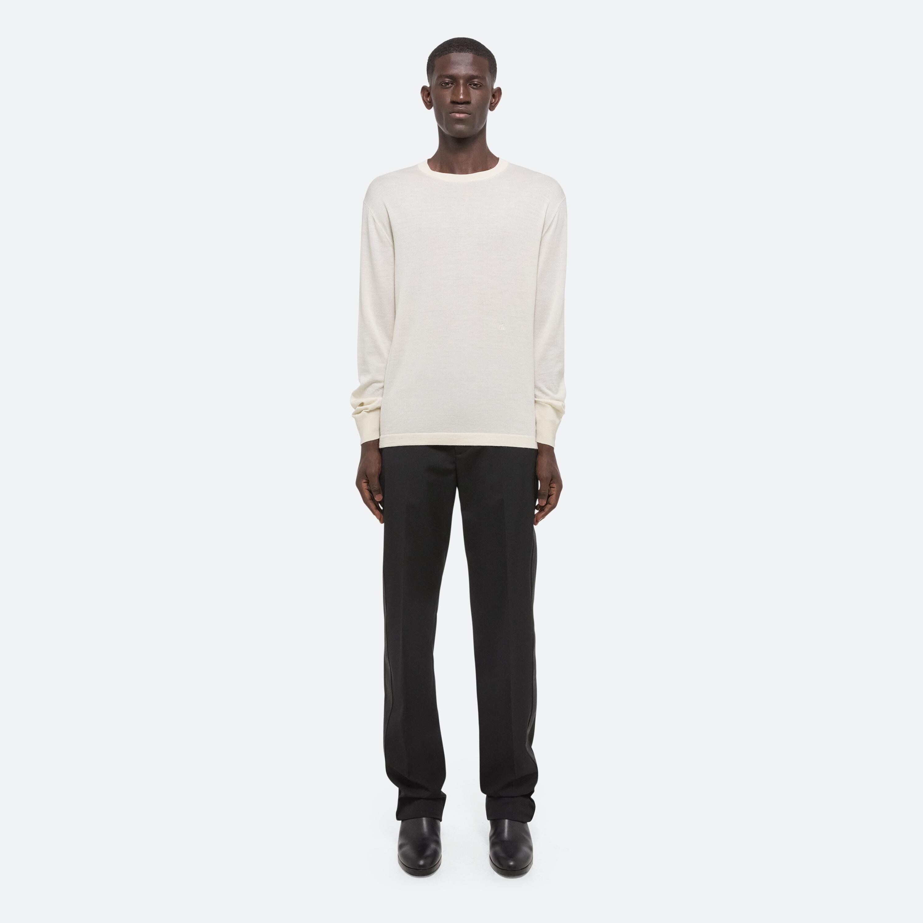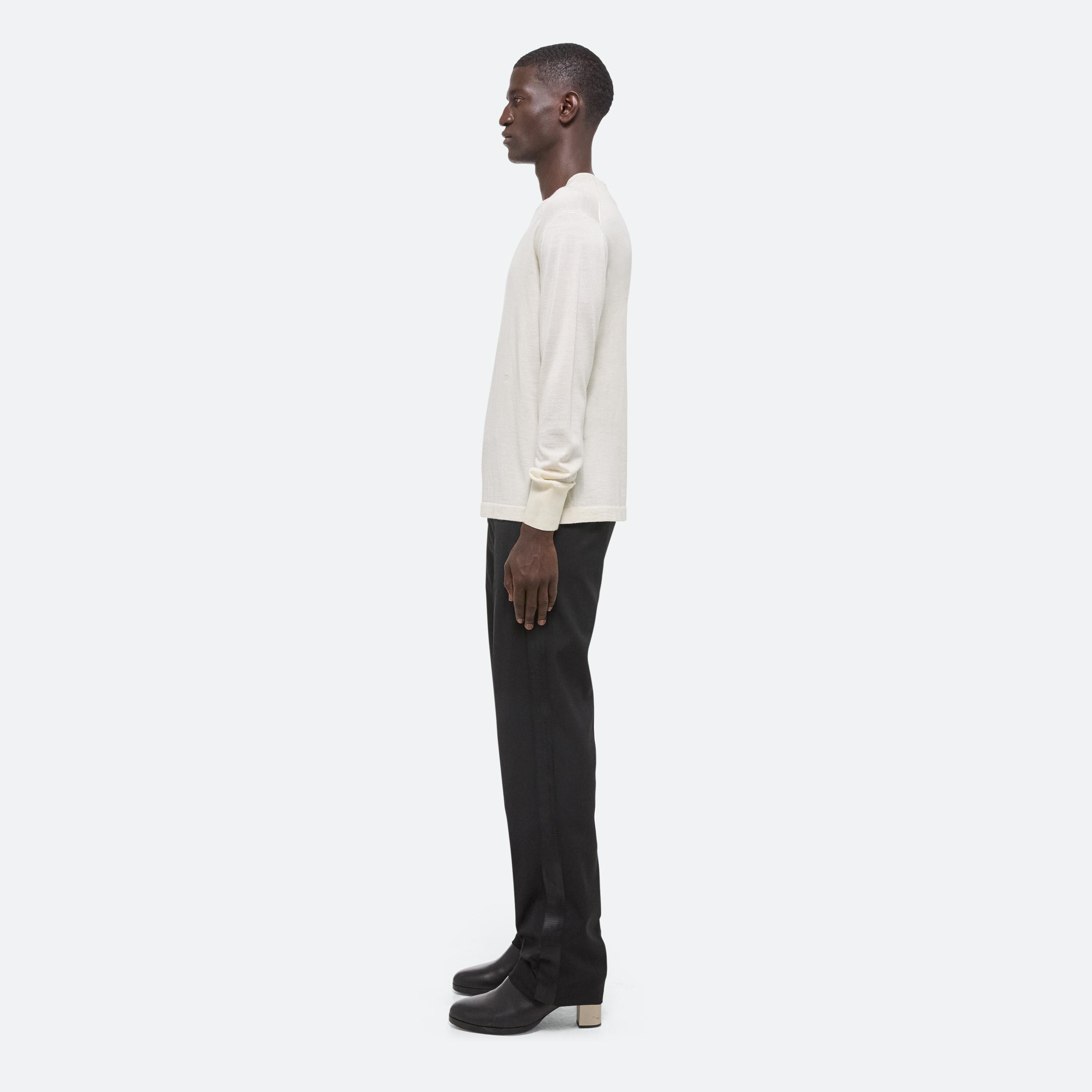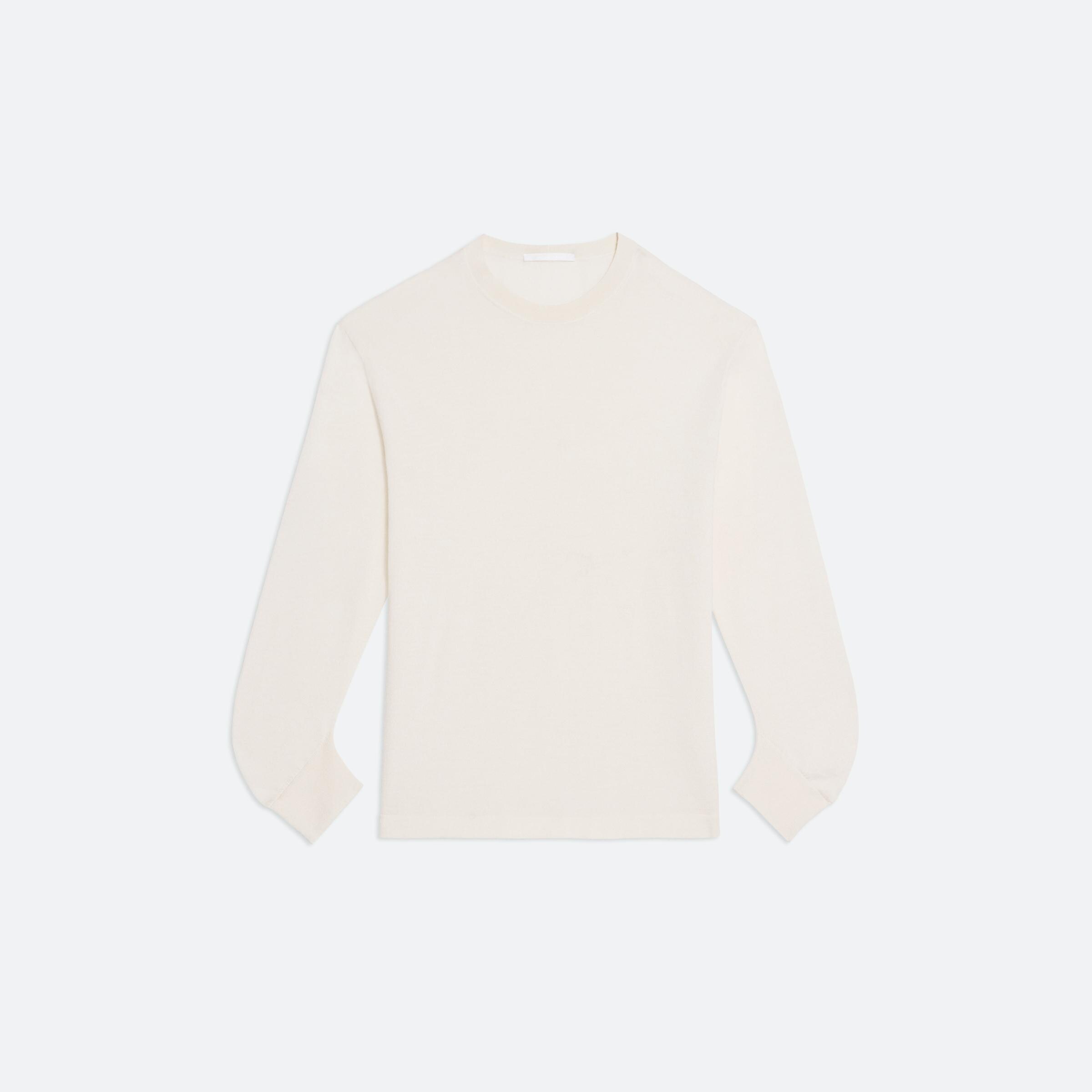 Crew neck sweater in a superfine Merino Wool Silk blend. Sleeves are shaped at the cuff to be worn at the elbows. This garment was designed with many body types and gender expressions in mind.