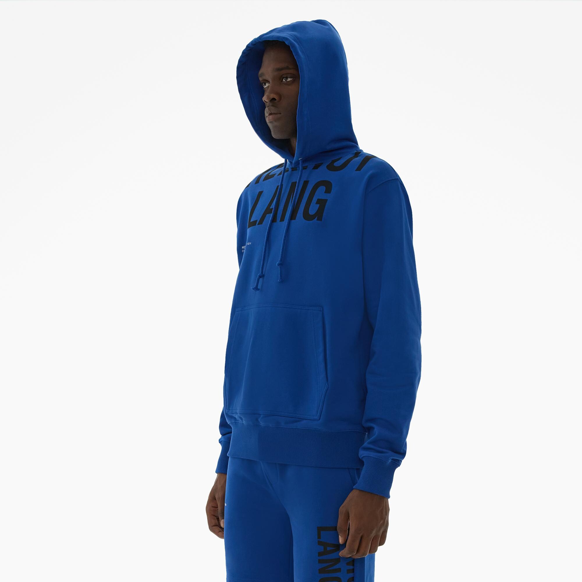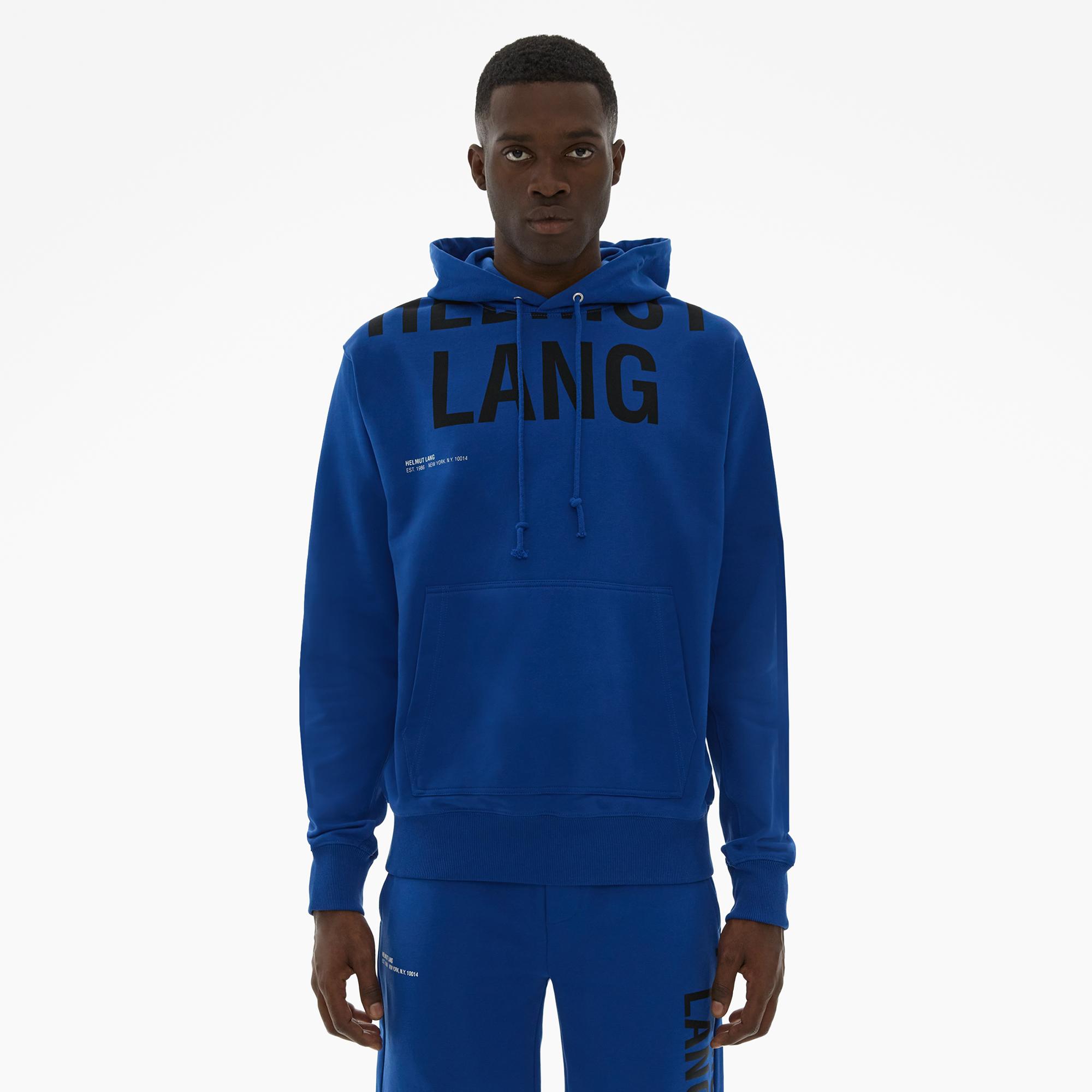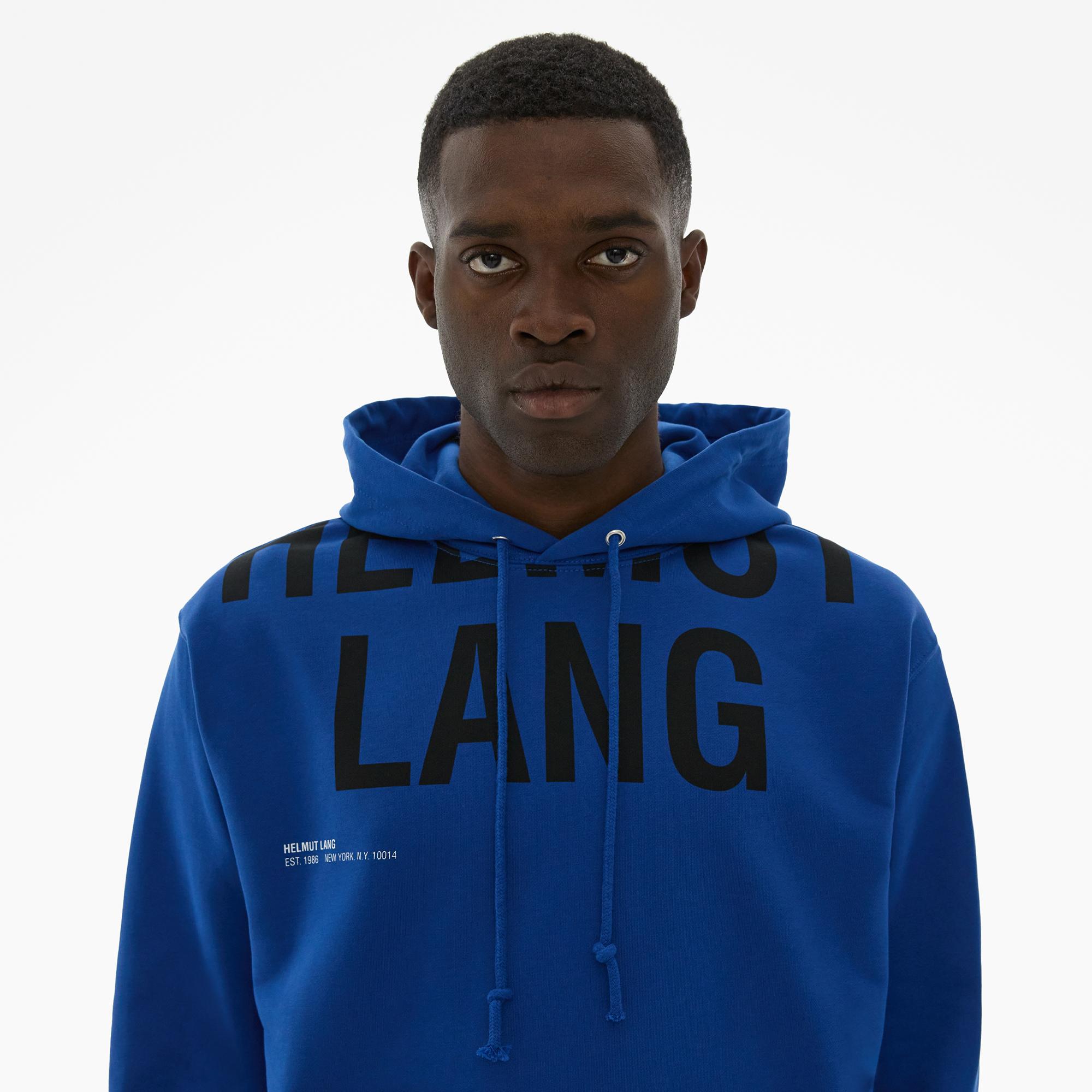 The Helmut Lang Cut-Off Logo Hoodie Jacket is a relaxed style in a compact French terry cloth with a cut-off HL logo, drawstring hood, kangaroo pocket, and rib knit details throughout.