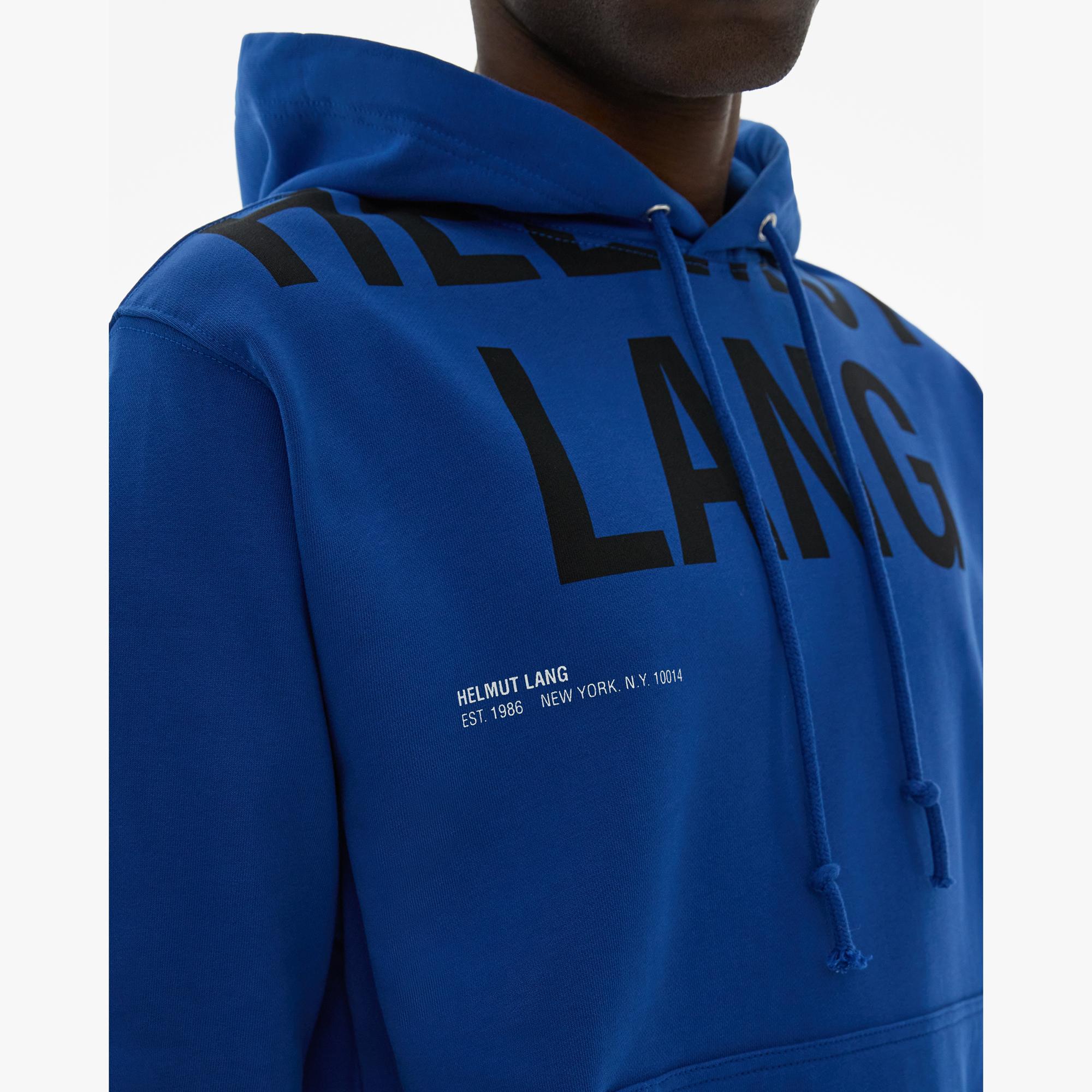 The Helmut Lang Cut-Off Logo Hoodie Jacket is a relaxed style in a compact French terry cloth with a cut-off HL logo, drawstring hood, kangaroo pocket, and rib knit details throughout.