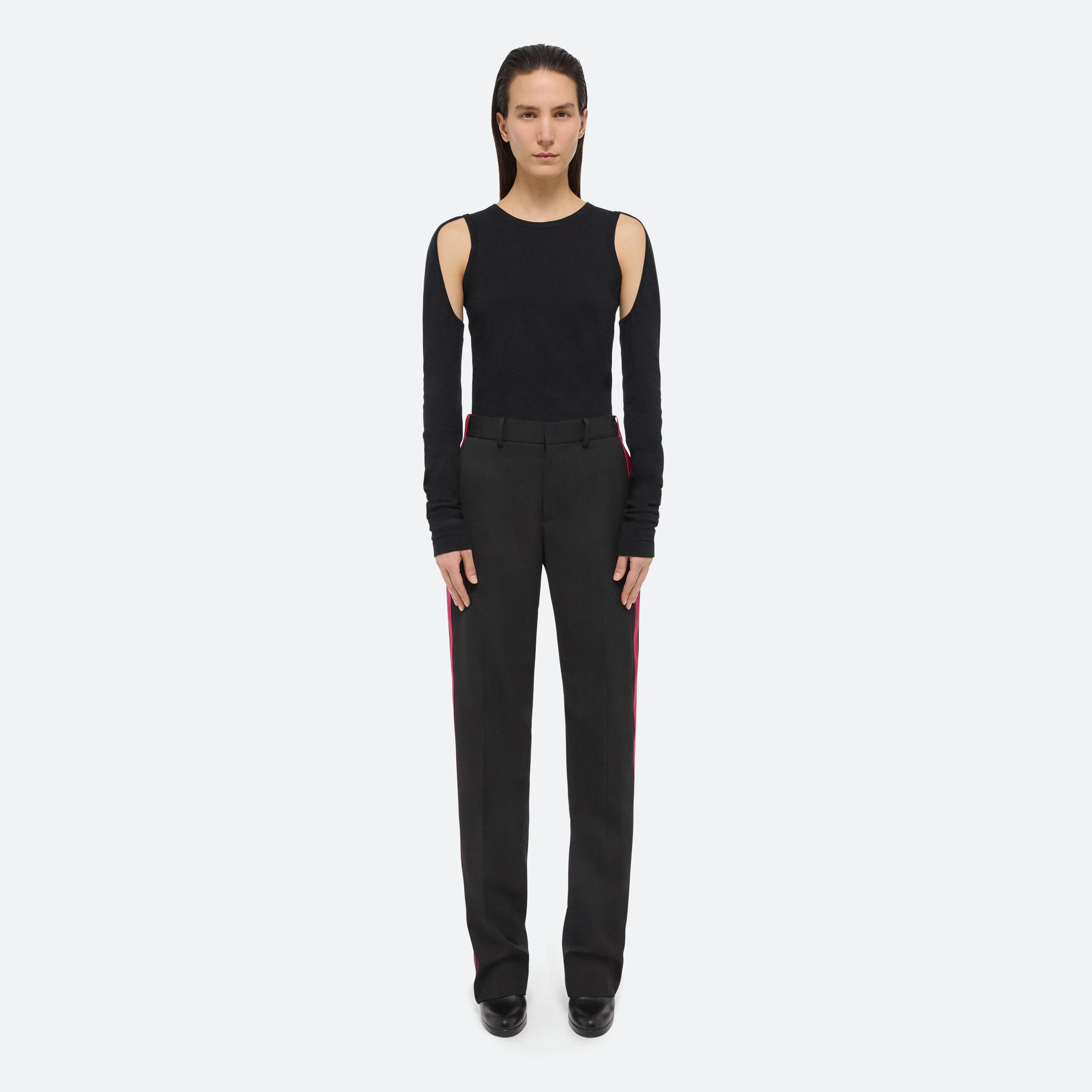 Fine gauge cotton sweater. Slim fit with cutouts at the underarms, cutouts are clean finished with self knit trims.