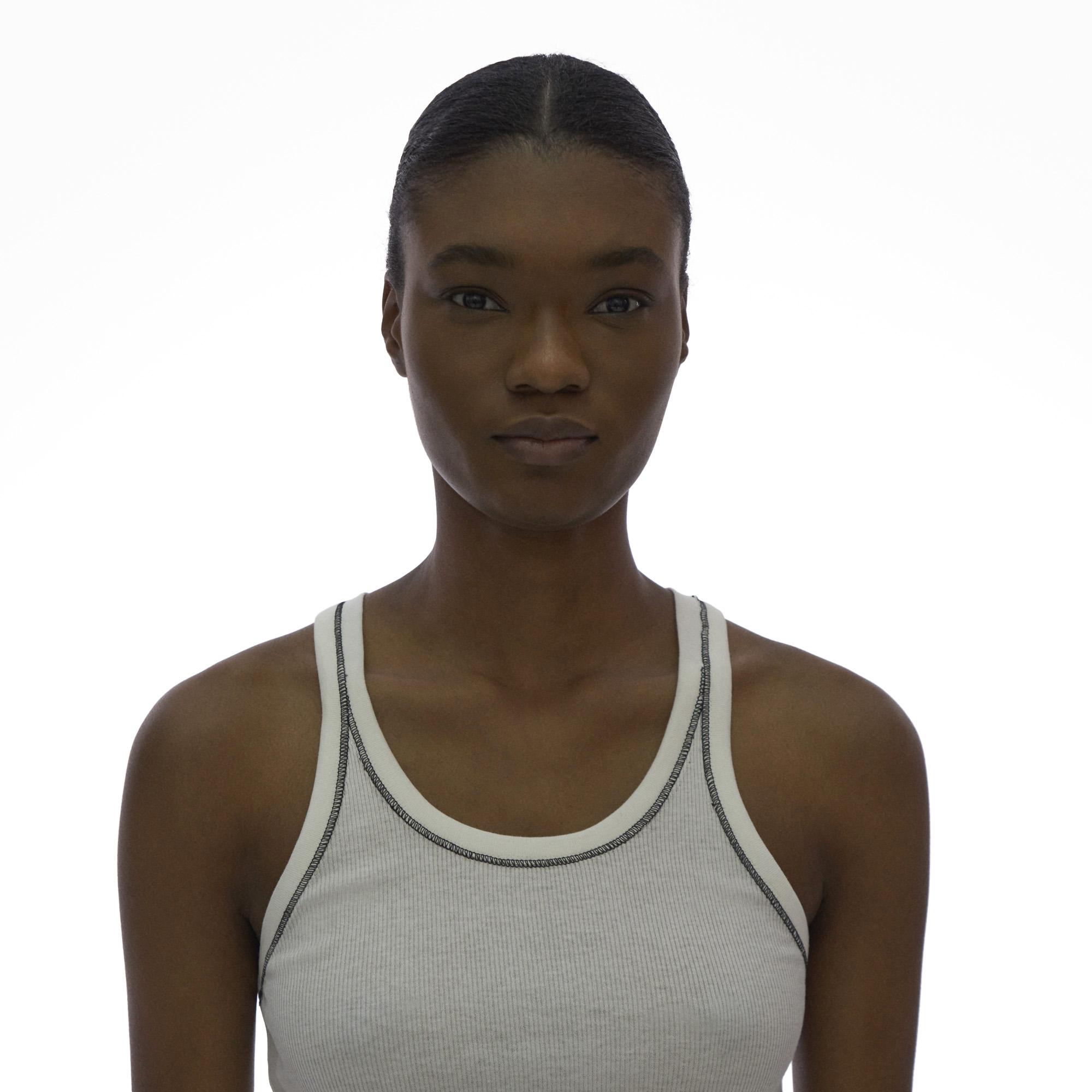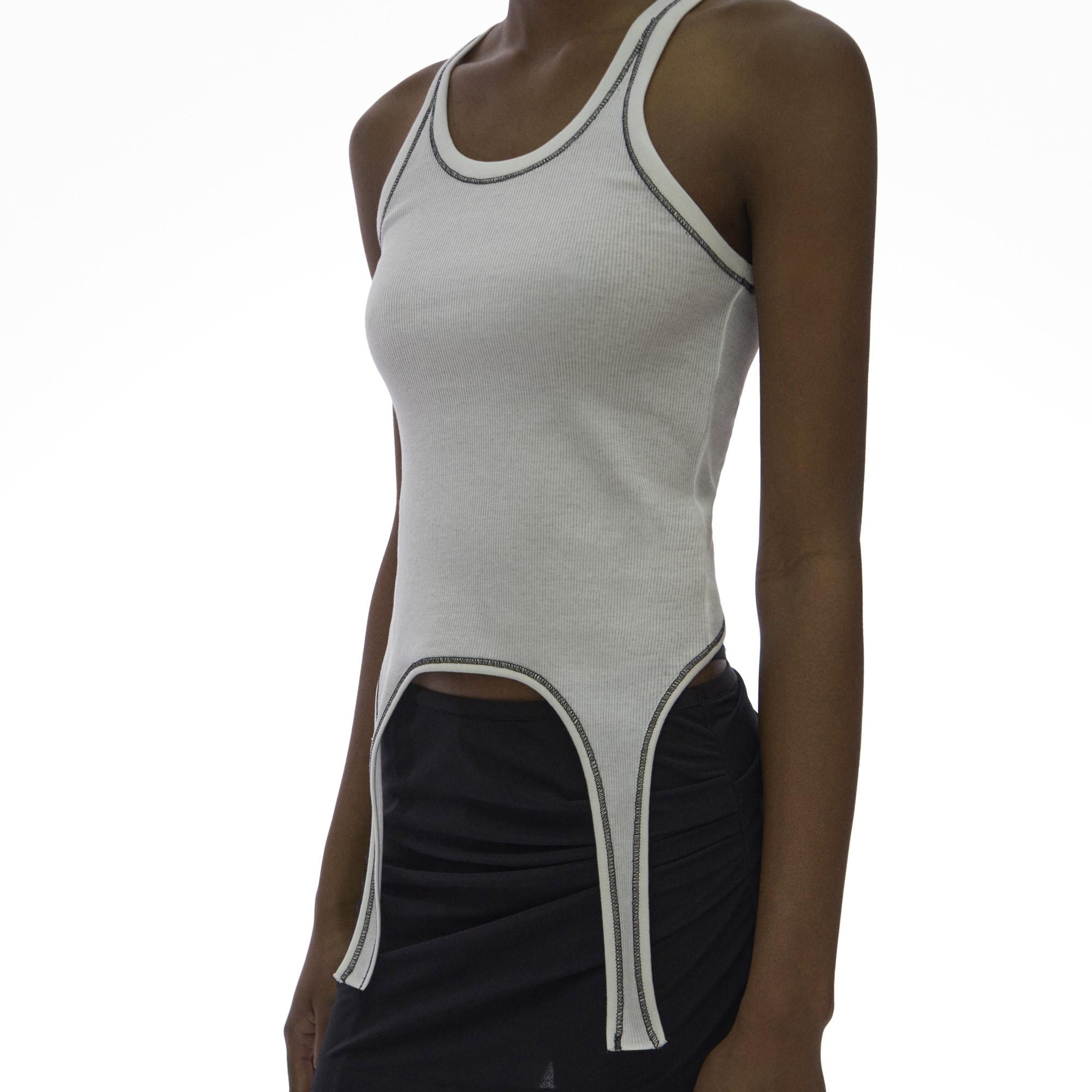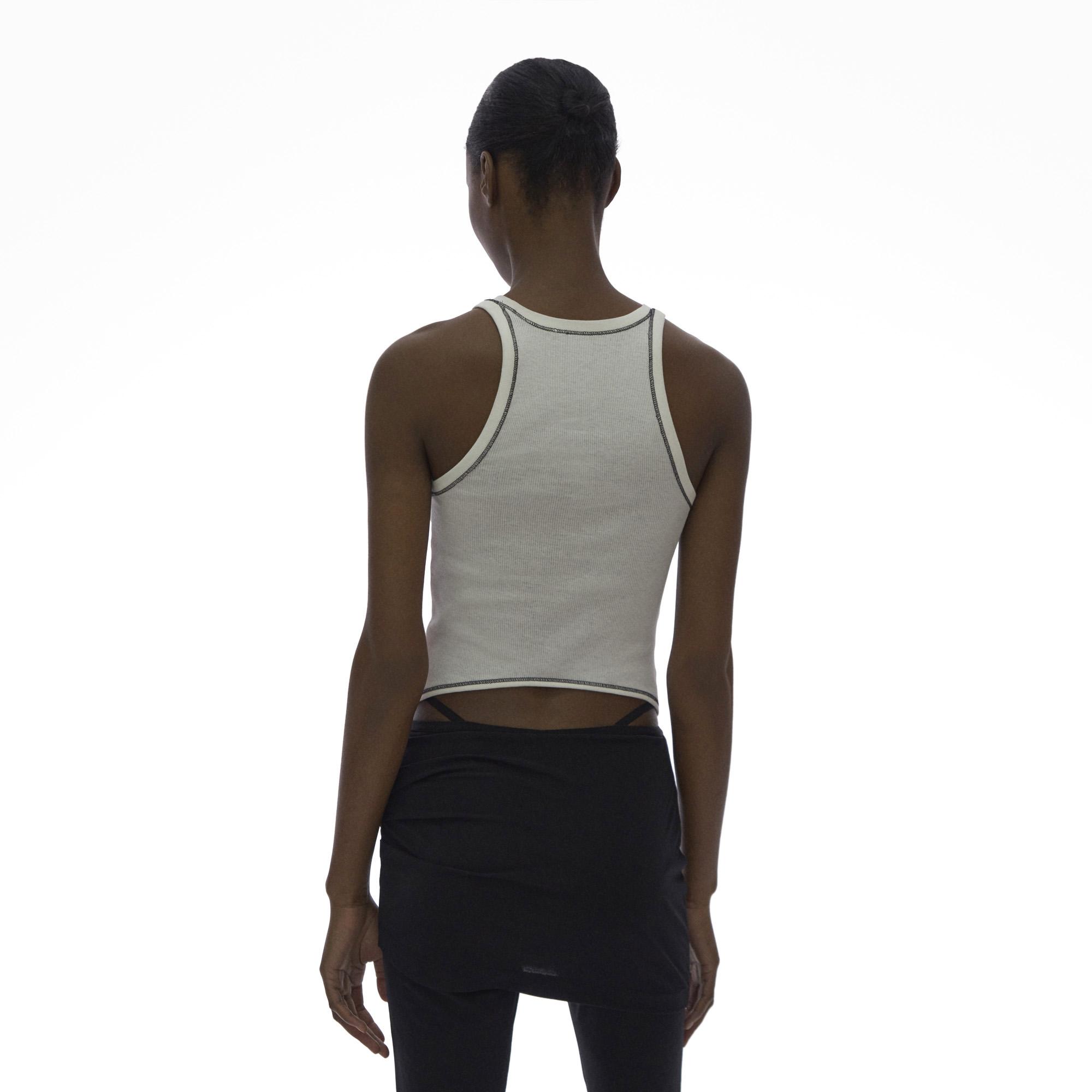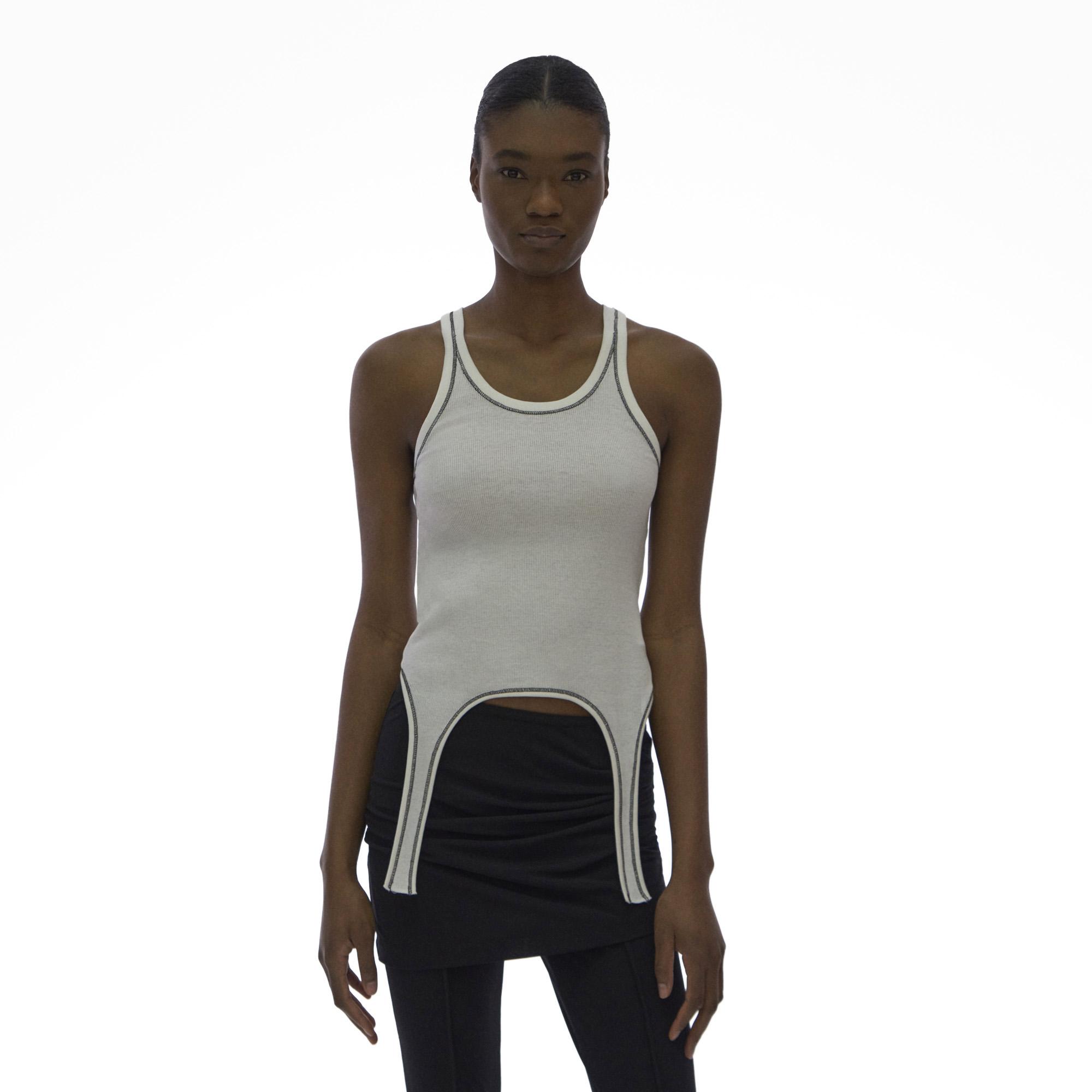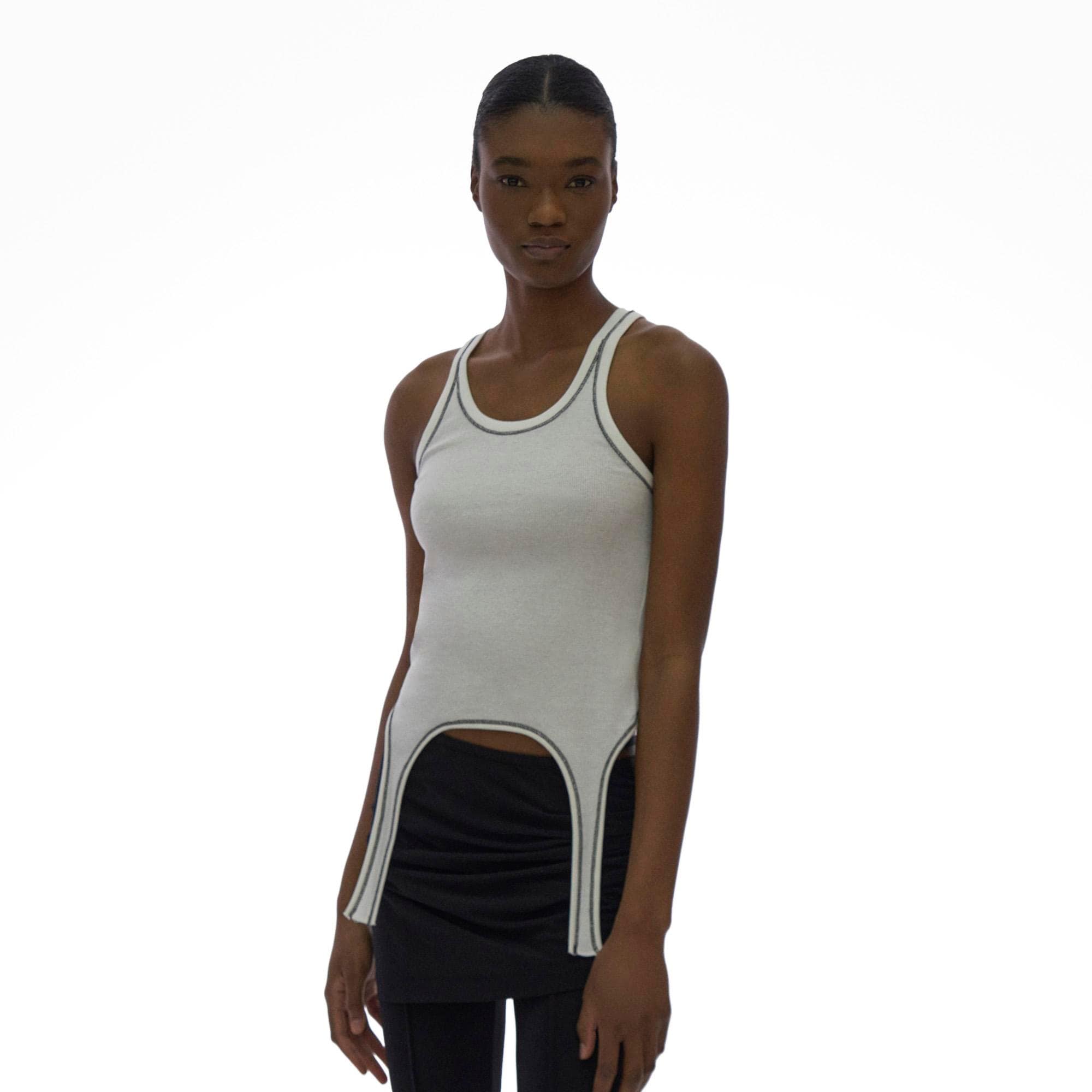 The Helmut Lang Cutaway Tank is a scoop neck tank in base double rib with a cutaway hem.
