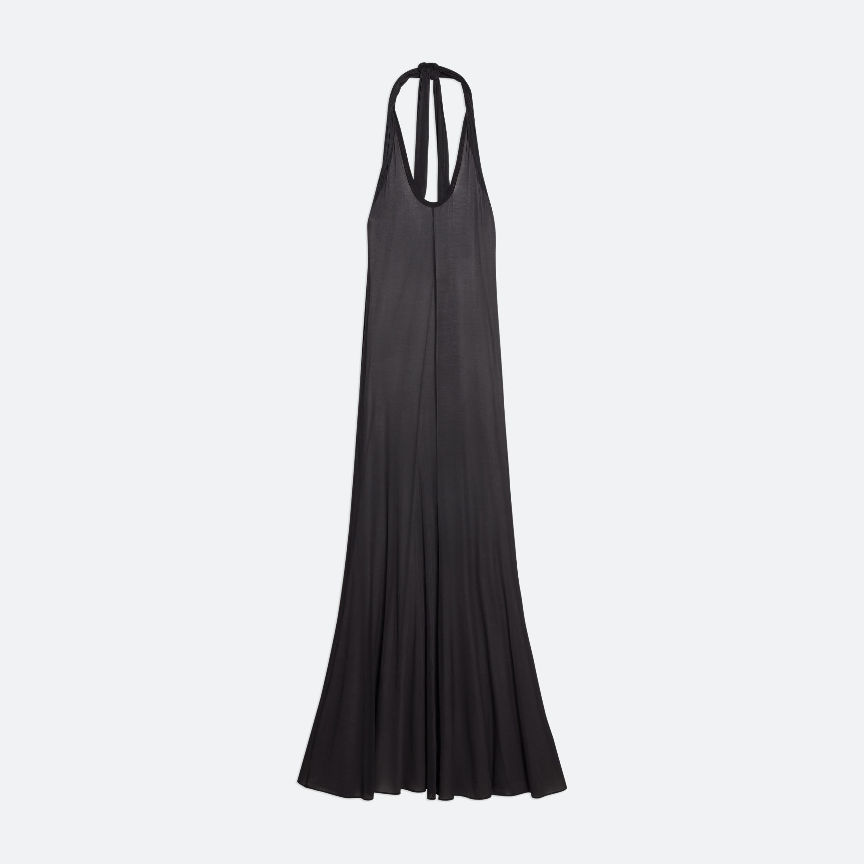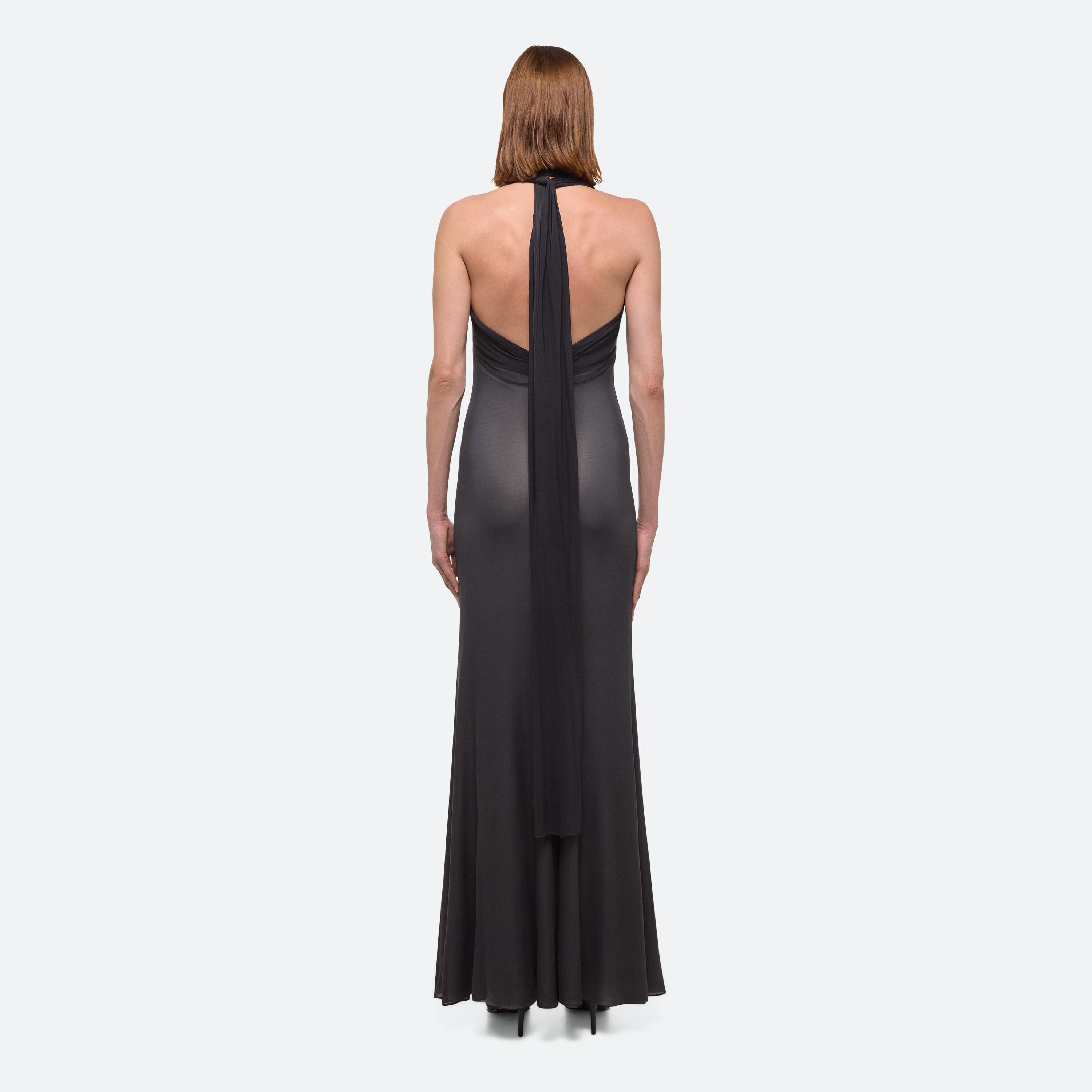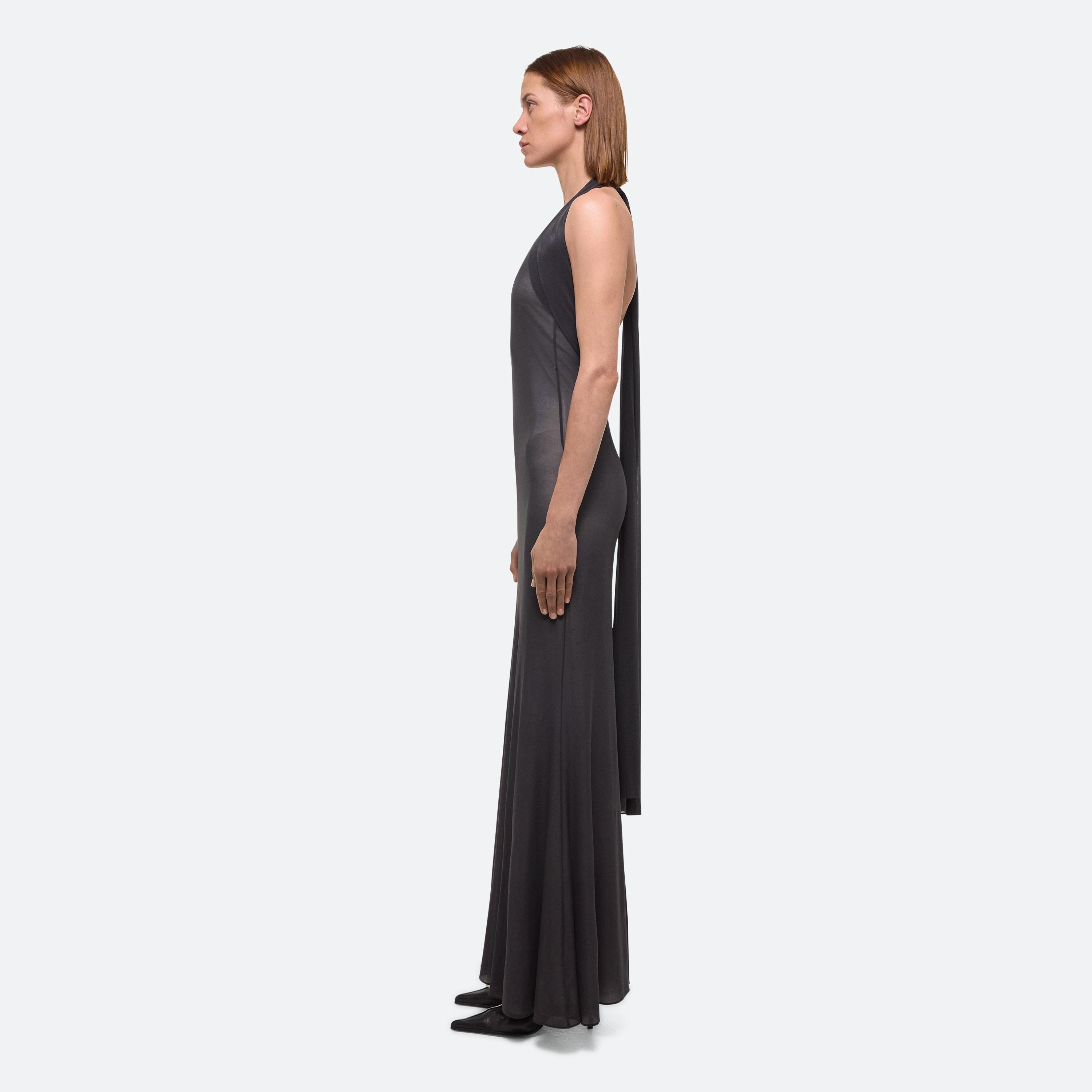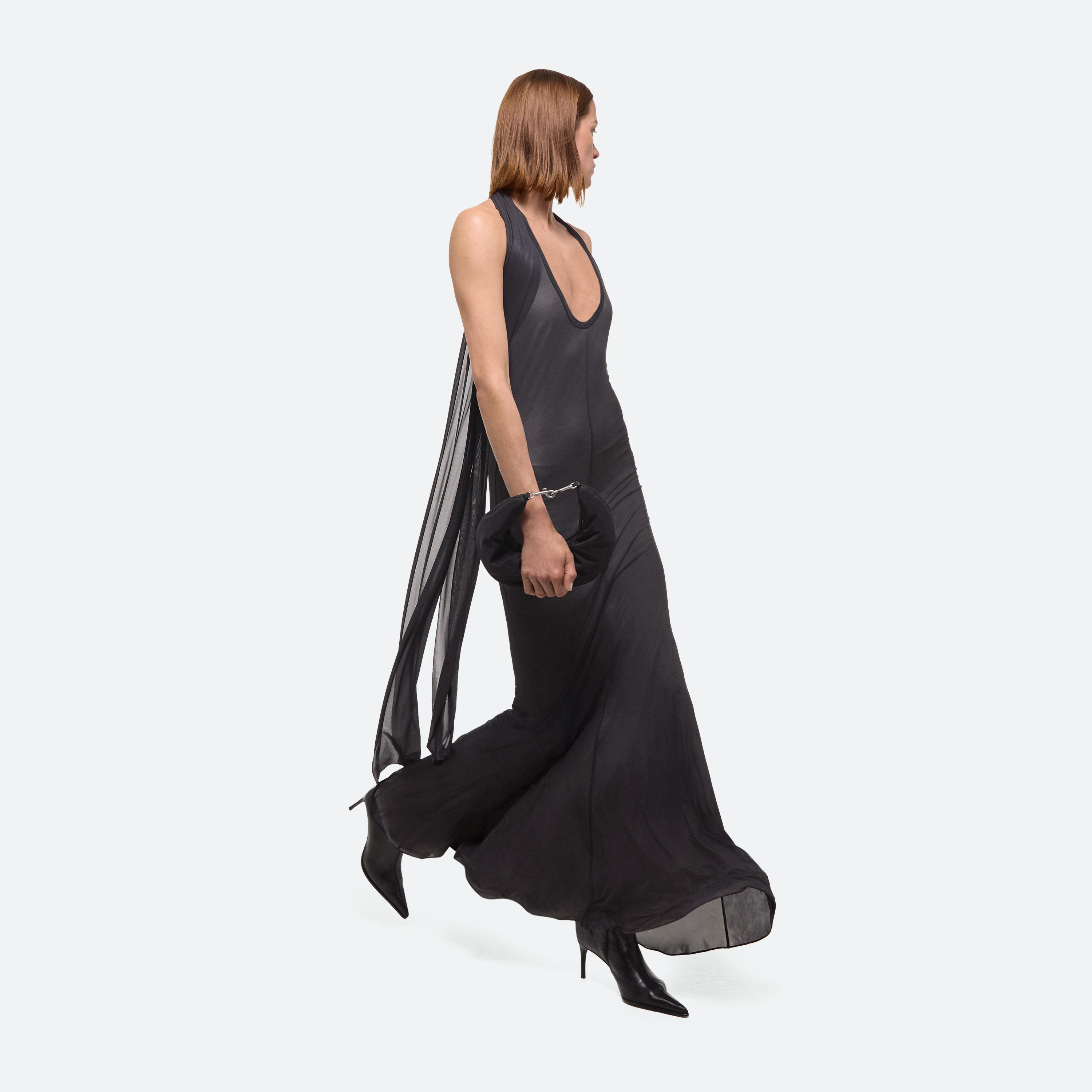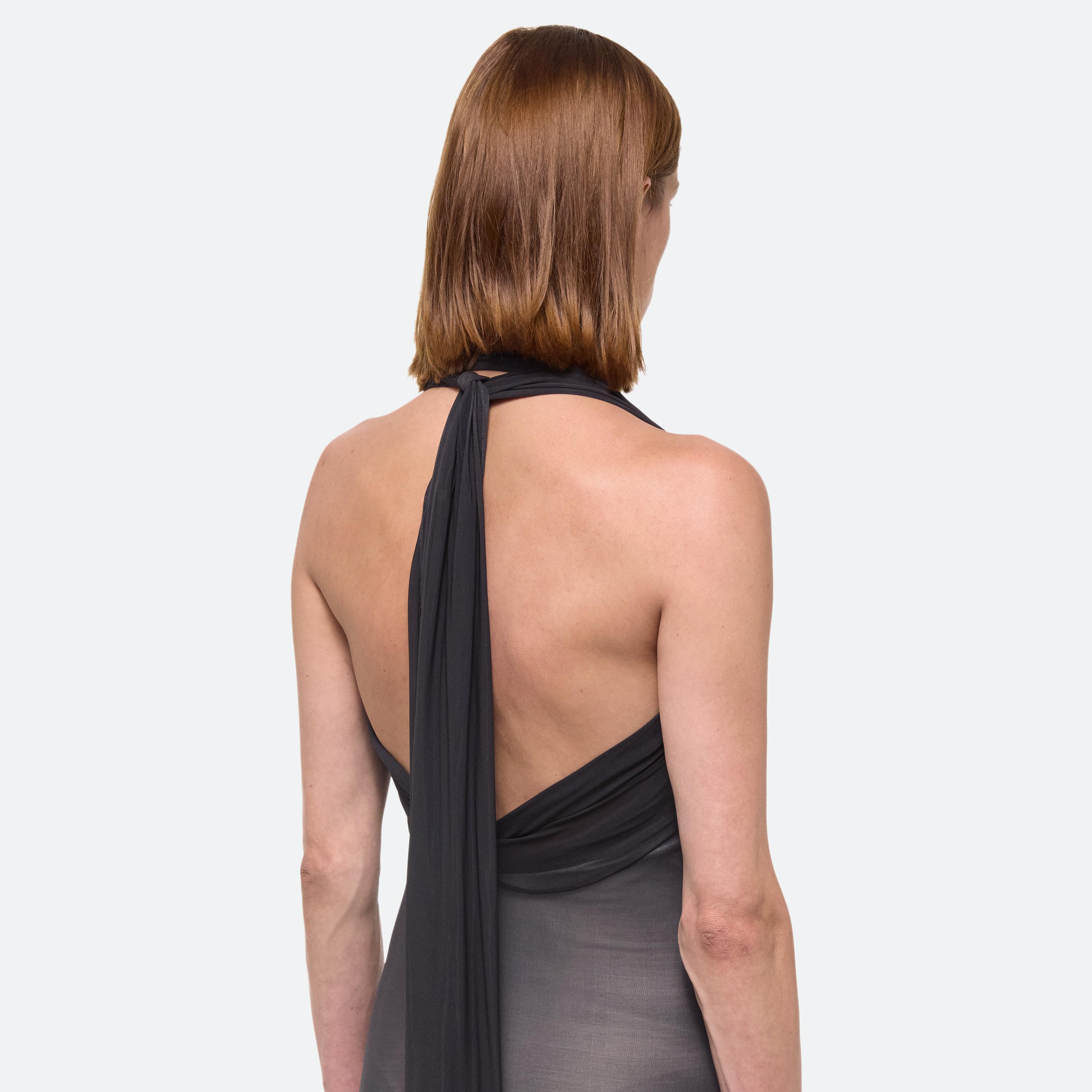 Halter-neck dress with an exaggerated tie detail that wraps around the body and over the shoulders. Contrasting textures that shift with every move, as the white base layer peeks through the sheer hosiery-inspired outer layer.