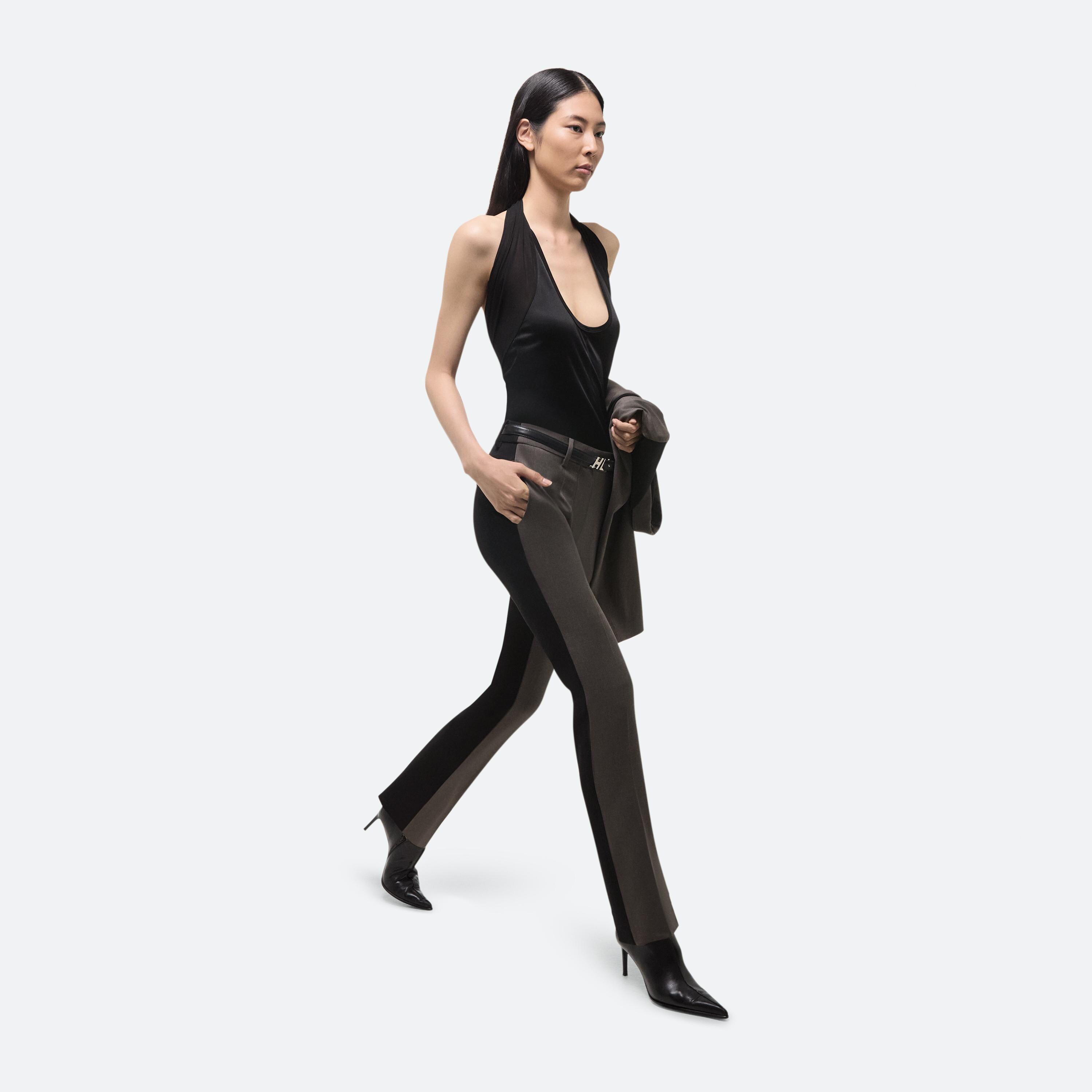 Halter-neck top in fluid Italian viscose jersey. A sheer tonal panel wraps around the body and over the shoulders, flowing into the neckline.