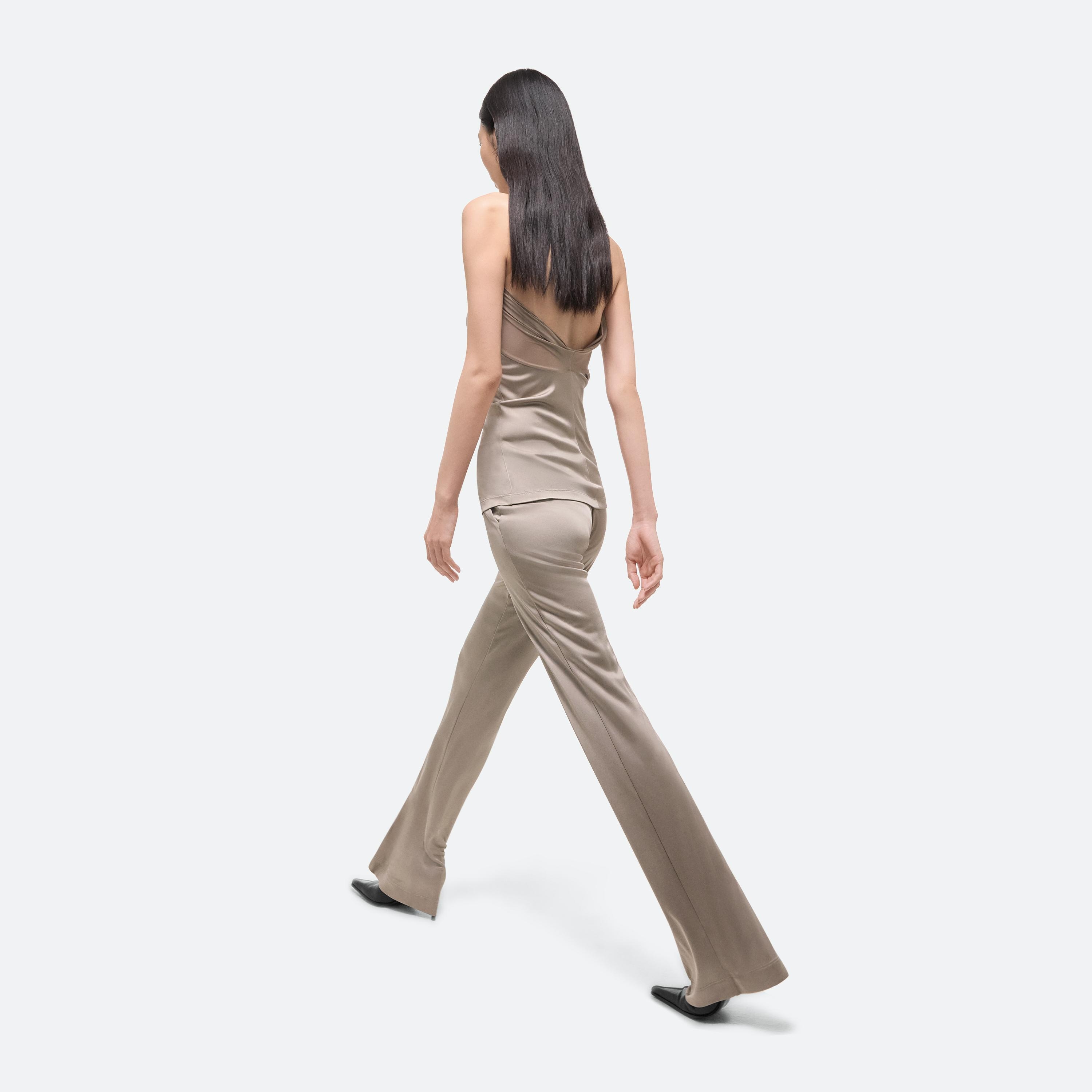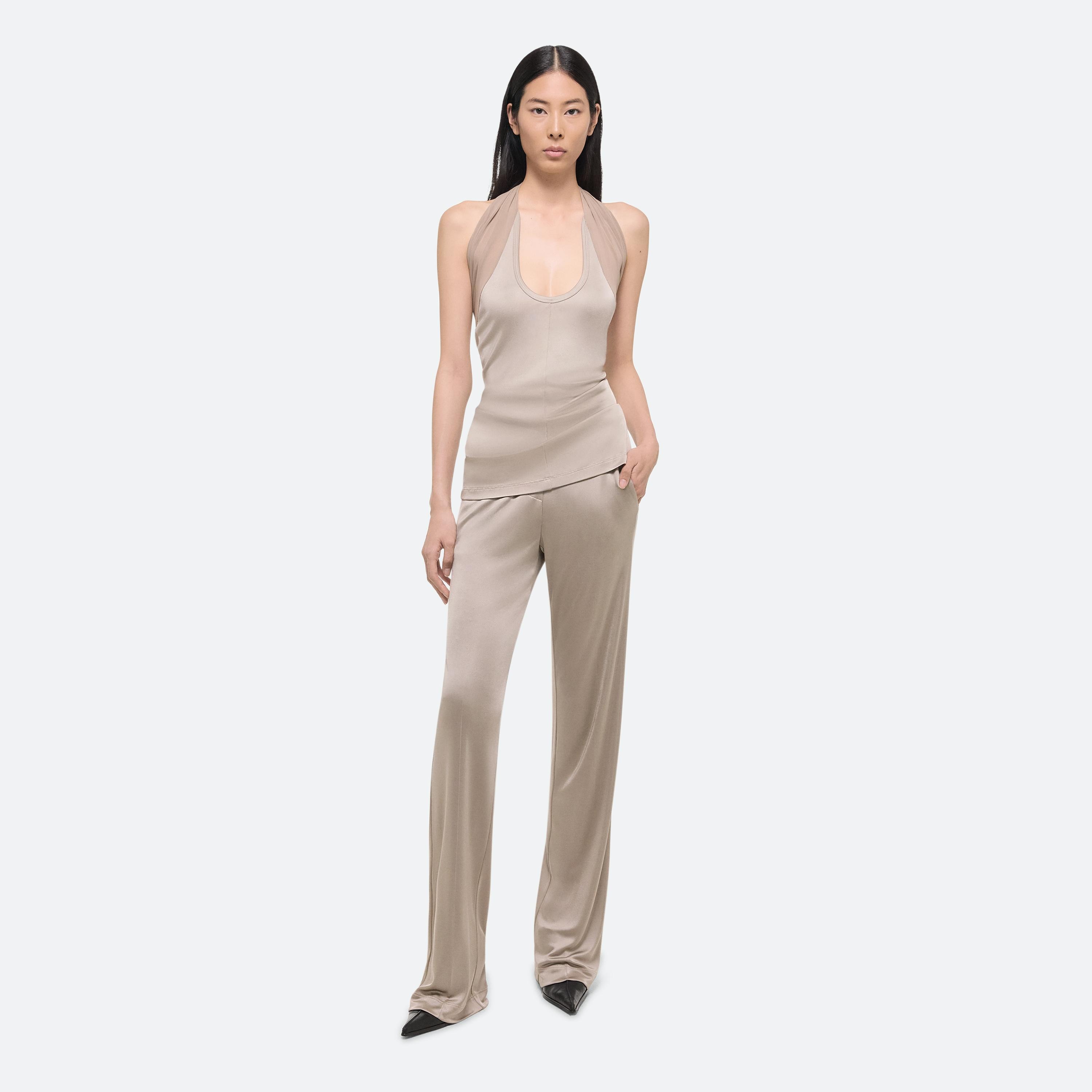 Halter-neck top in fluid Italian viscose jersey. A sheer tonal panel wraps around the body and over the shoulders, flowing into the neckline.