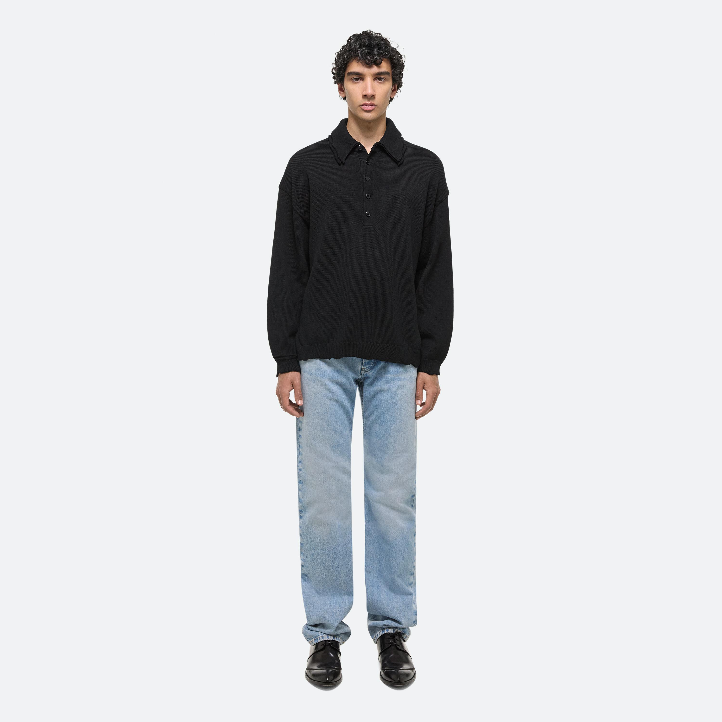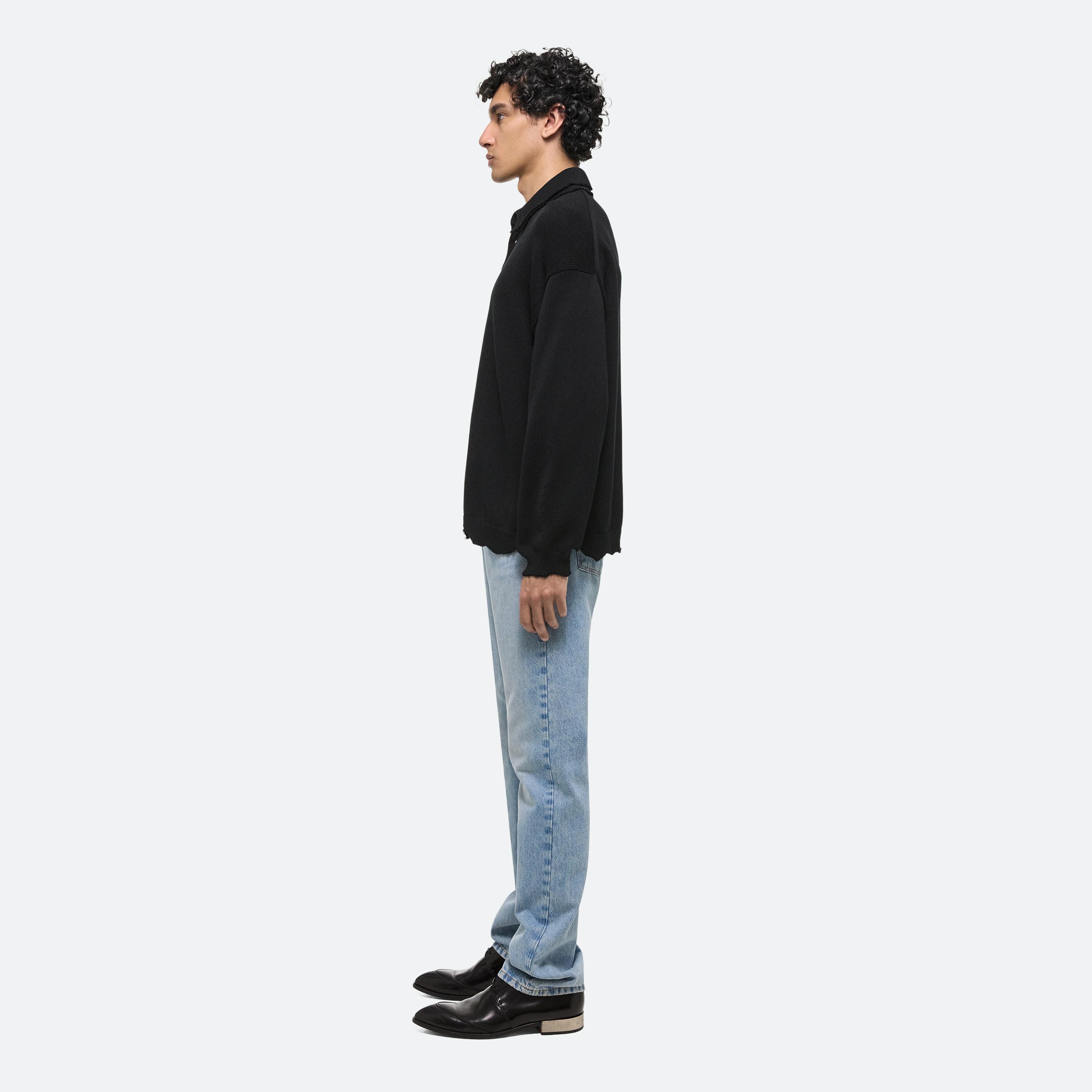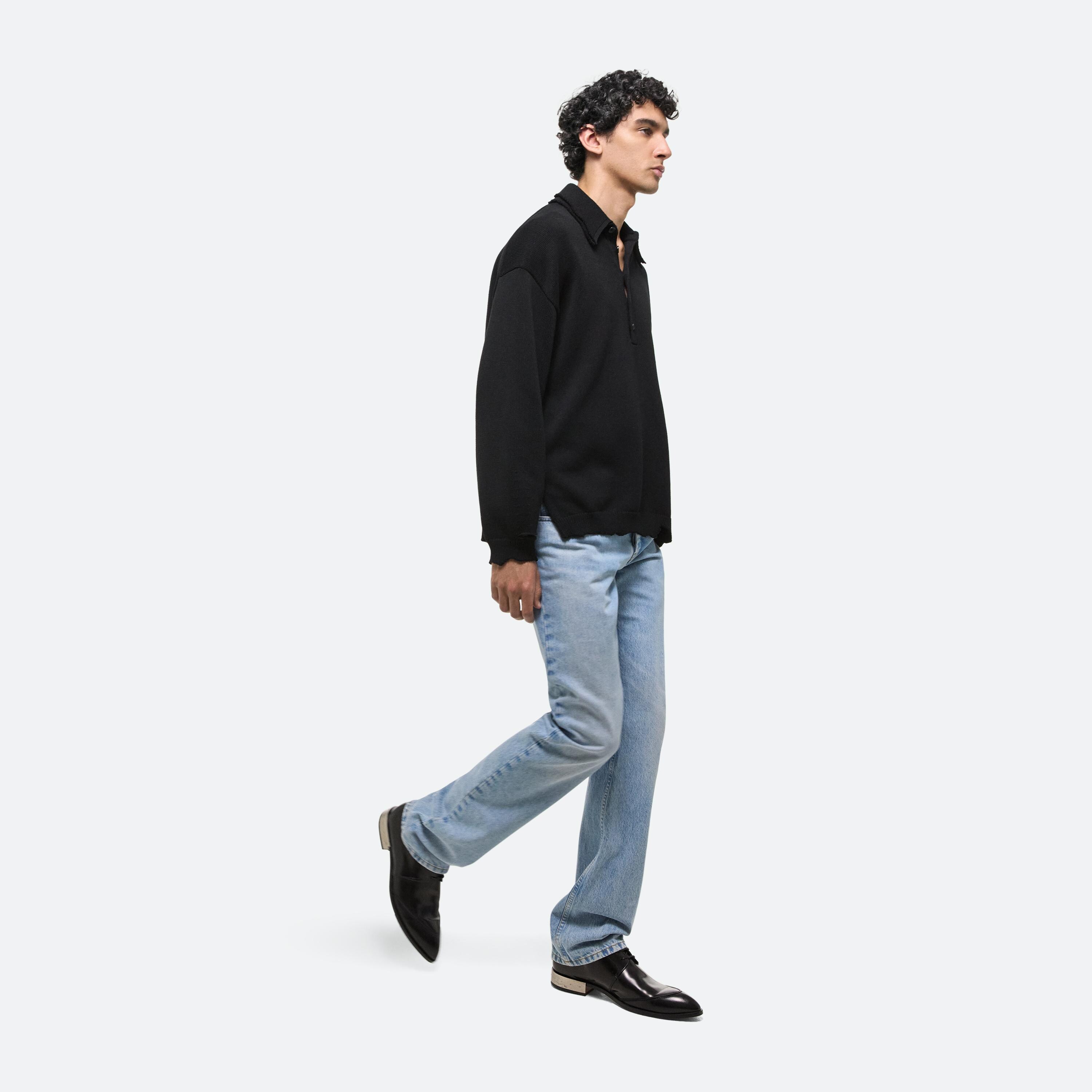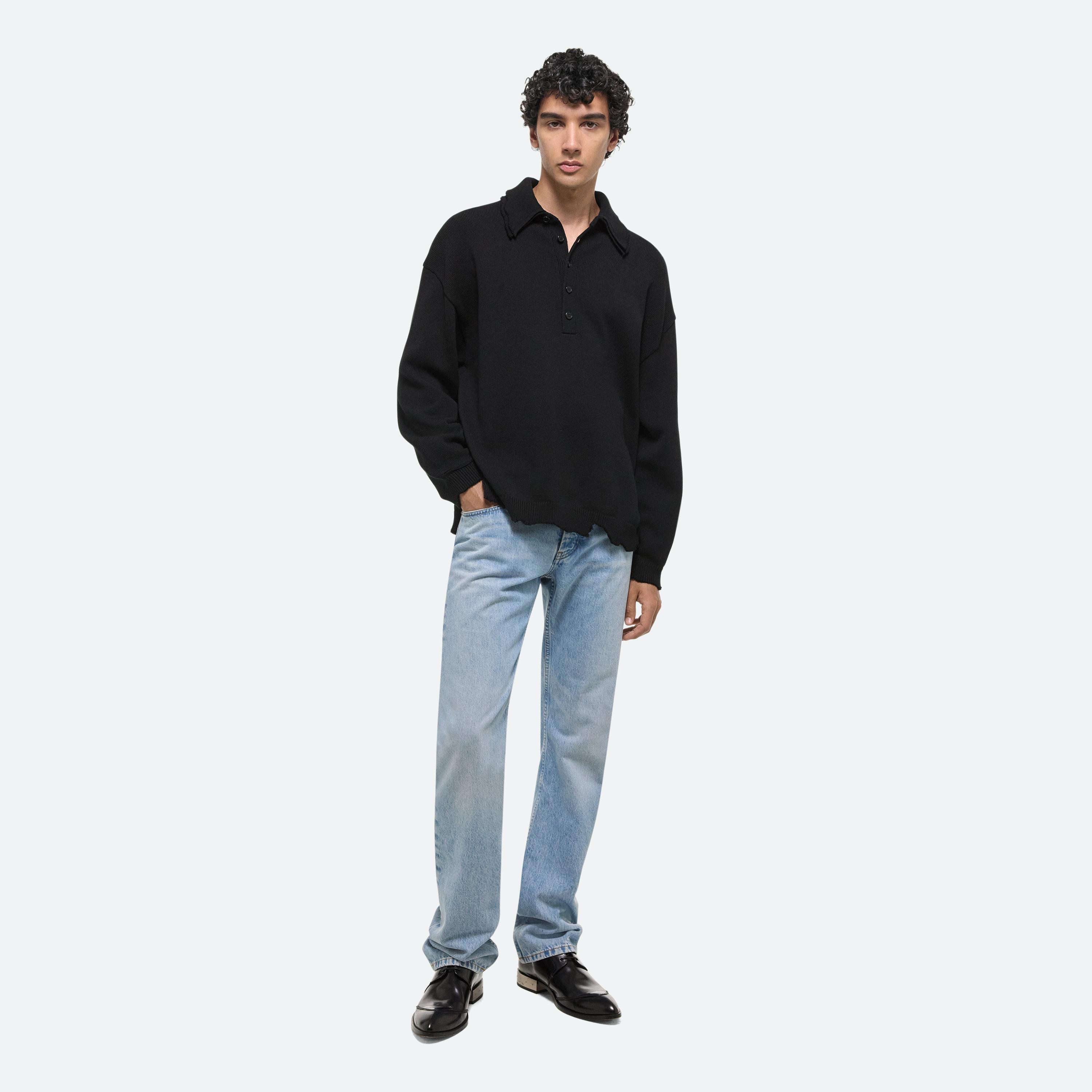 Ribbed polo sweater in bouncy Italian cotton knit. Visible distressing creates a doubled effect at the collar and the feeling of much-loved piece. Made with a dropped shoulder and roomy fit.