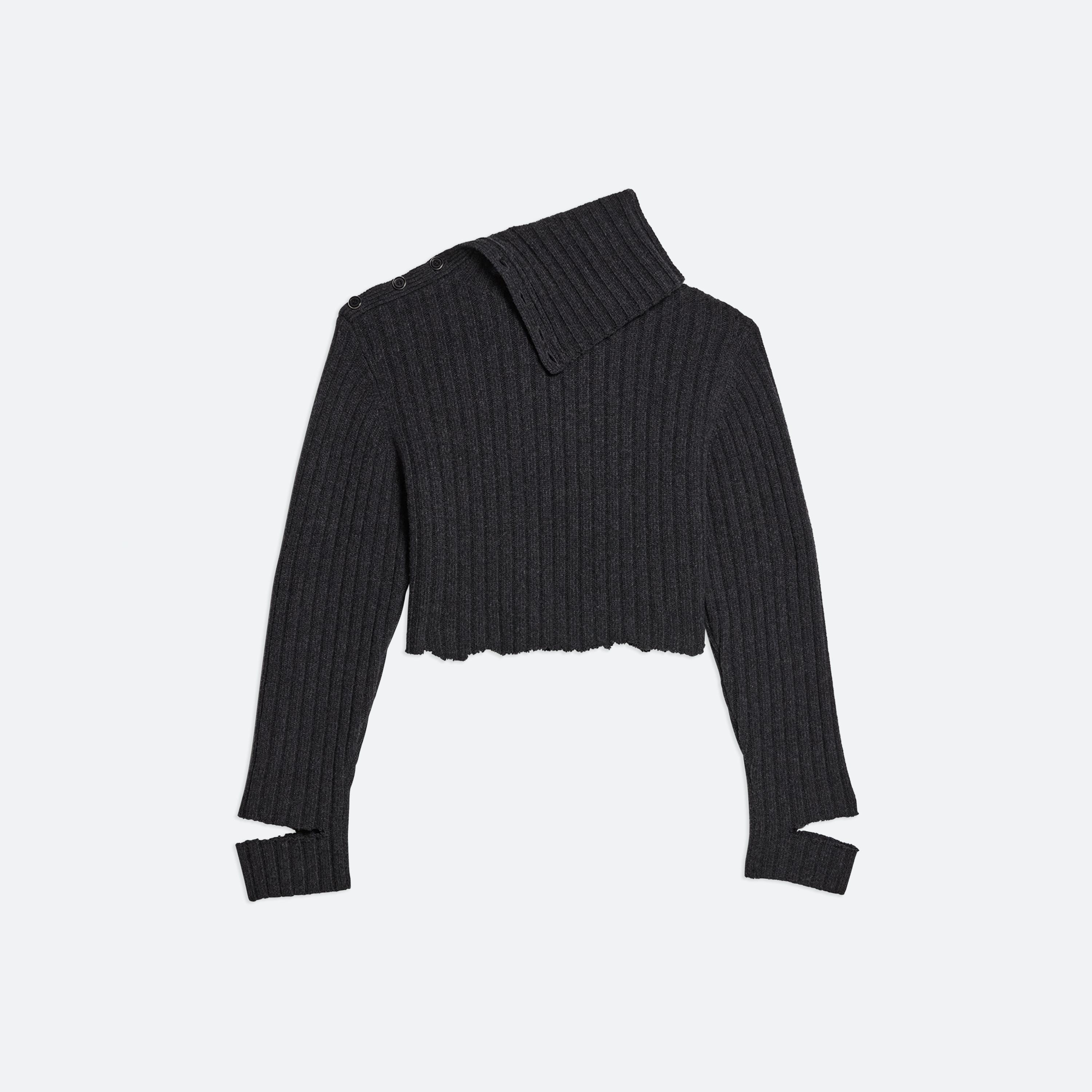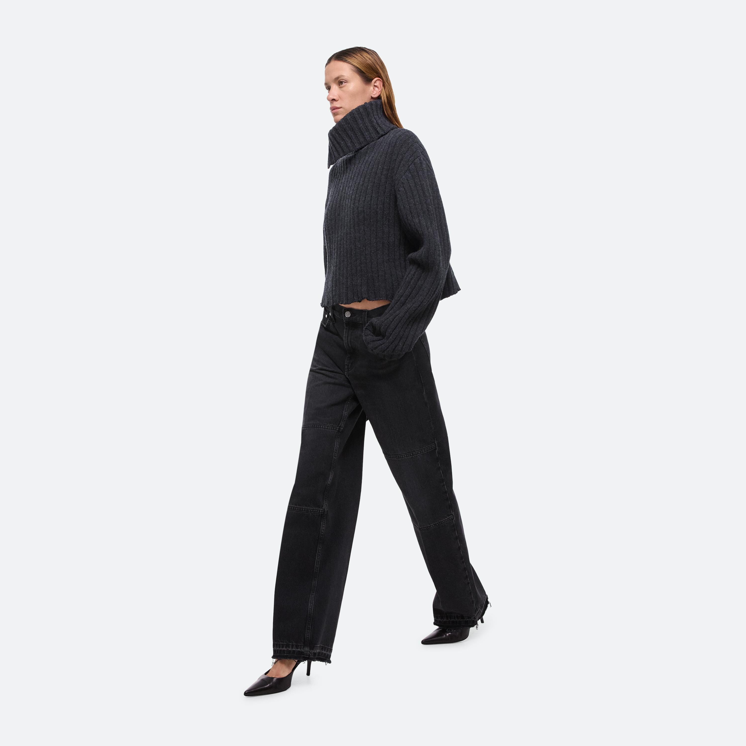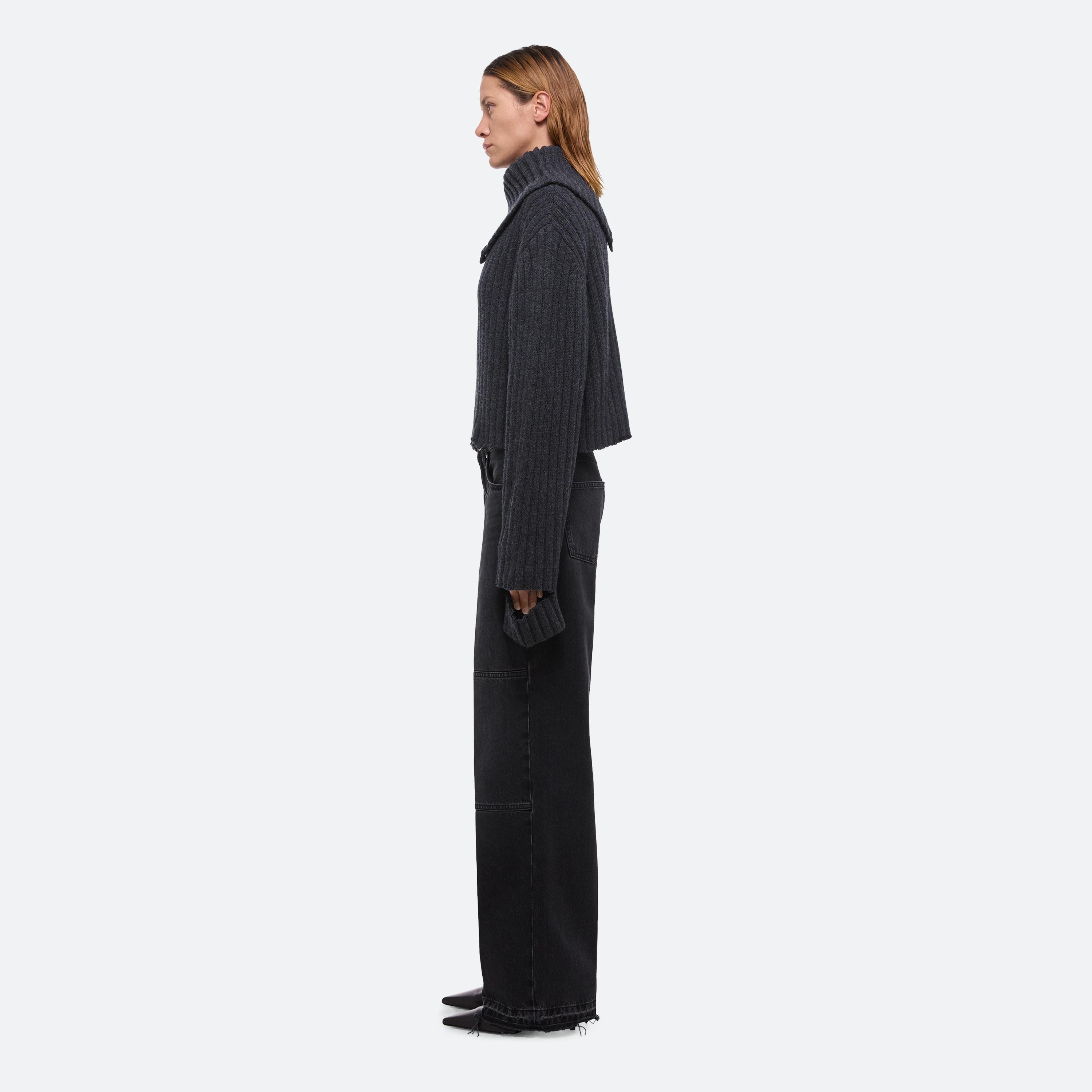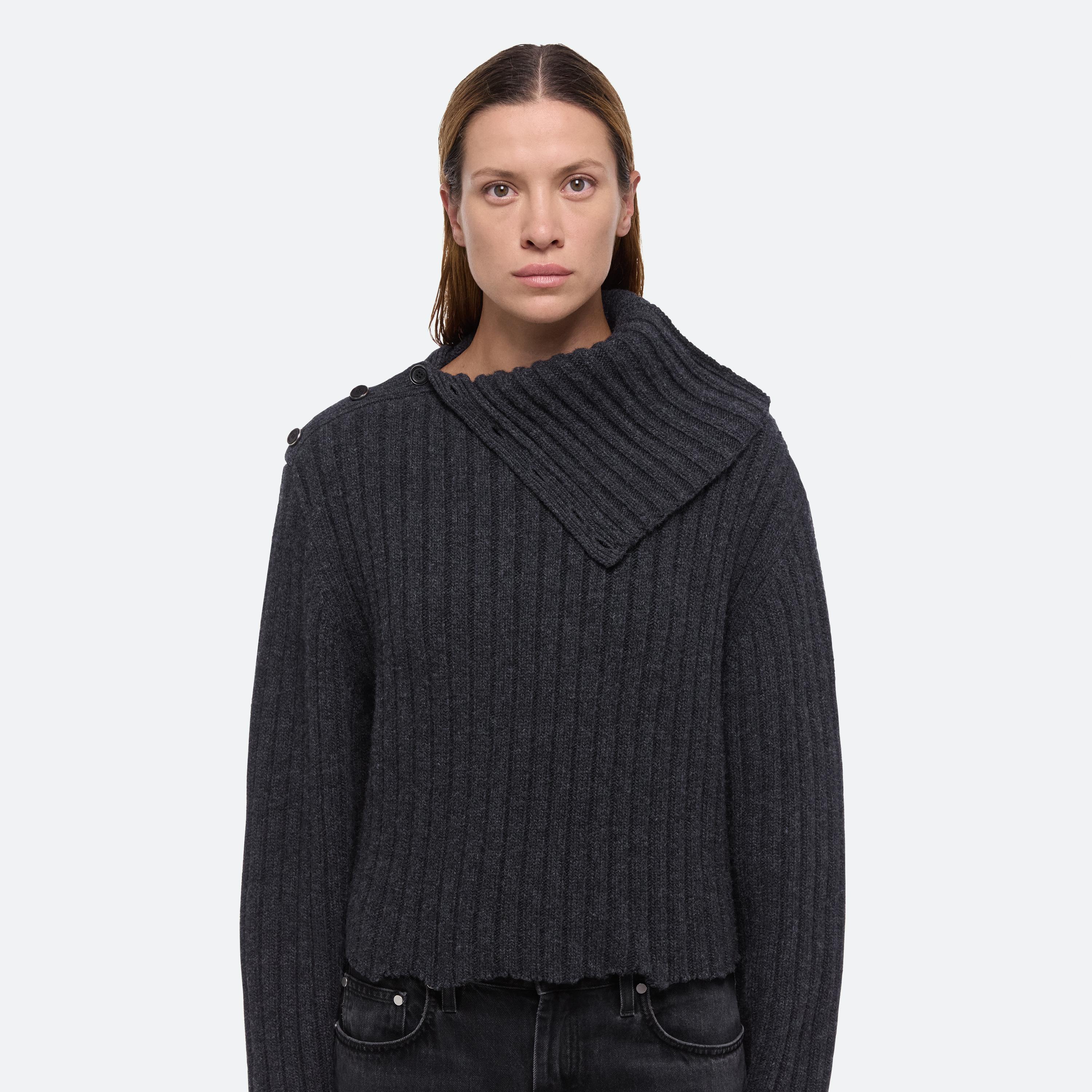 Wool sweater in a wide rib, with turtleneck that unbuttons for a relaxed neckline. Distressed detailing creates the feeling of a long-time favorite.