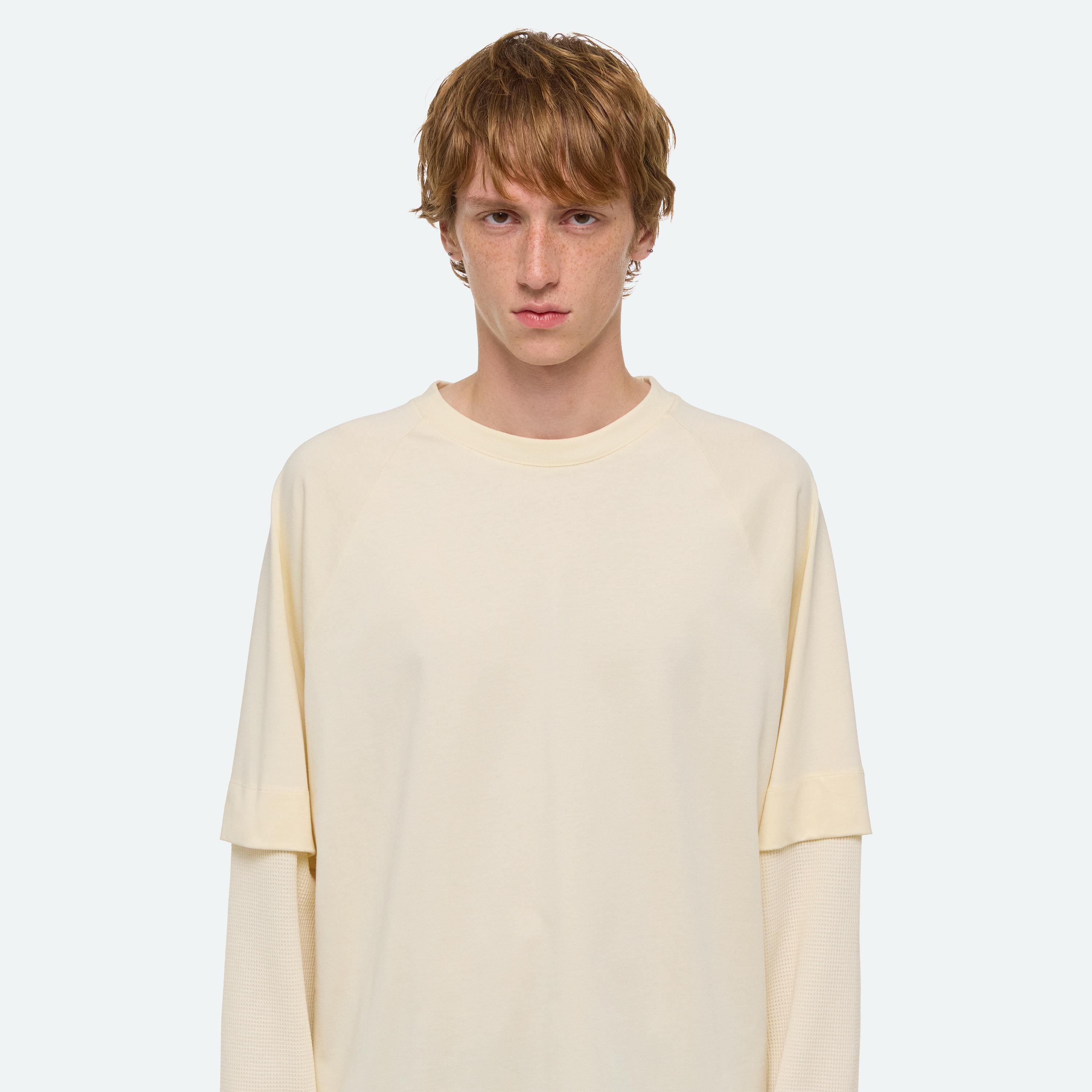 Long-sleeved crewneck with layered sleeves in a contrasting waffle knit.