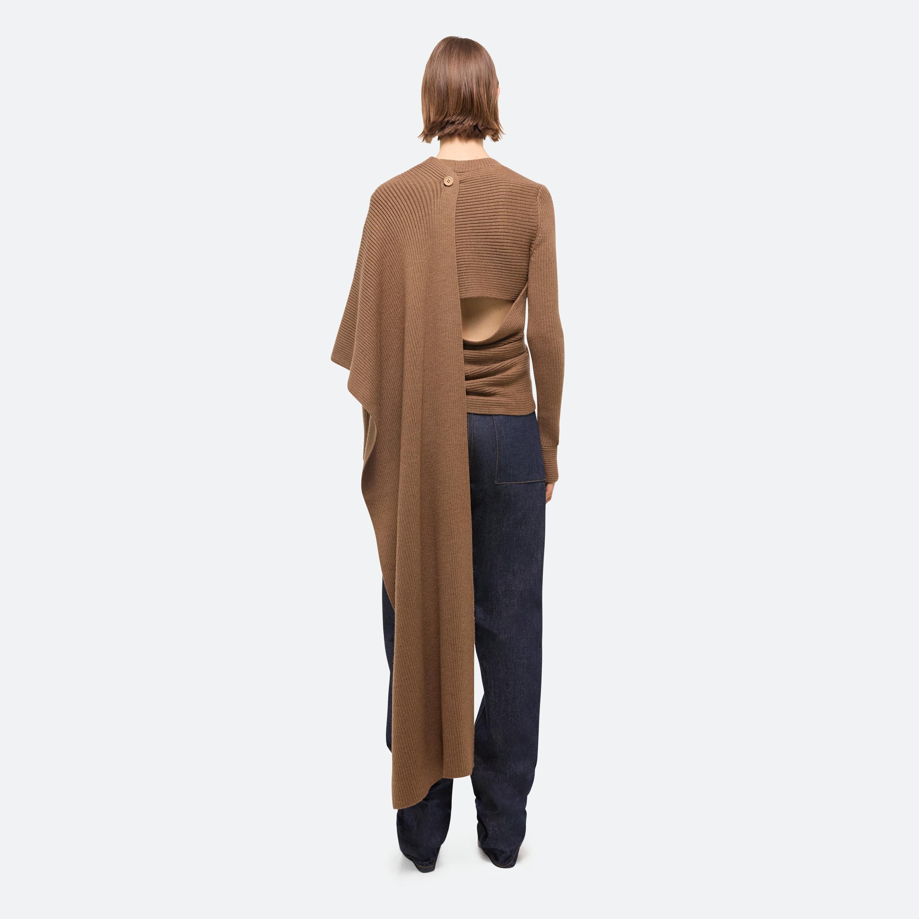 Wide rib crewneck sweater with draped scarf detail in Italian merino. Wind the long knit panel over the shoulder and leave the back open, or wrap it close for a warmer fit.