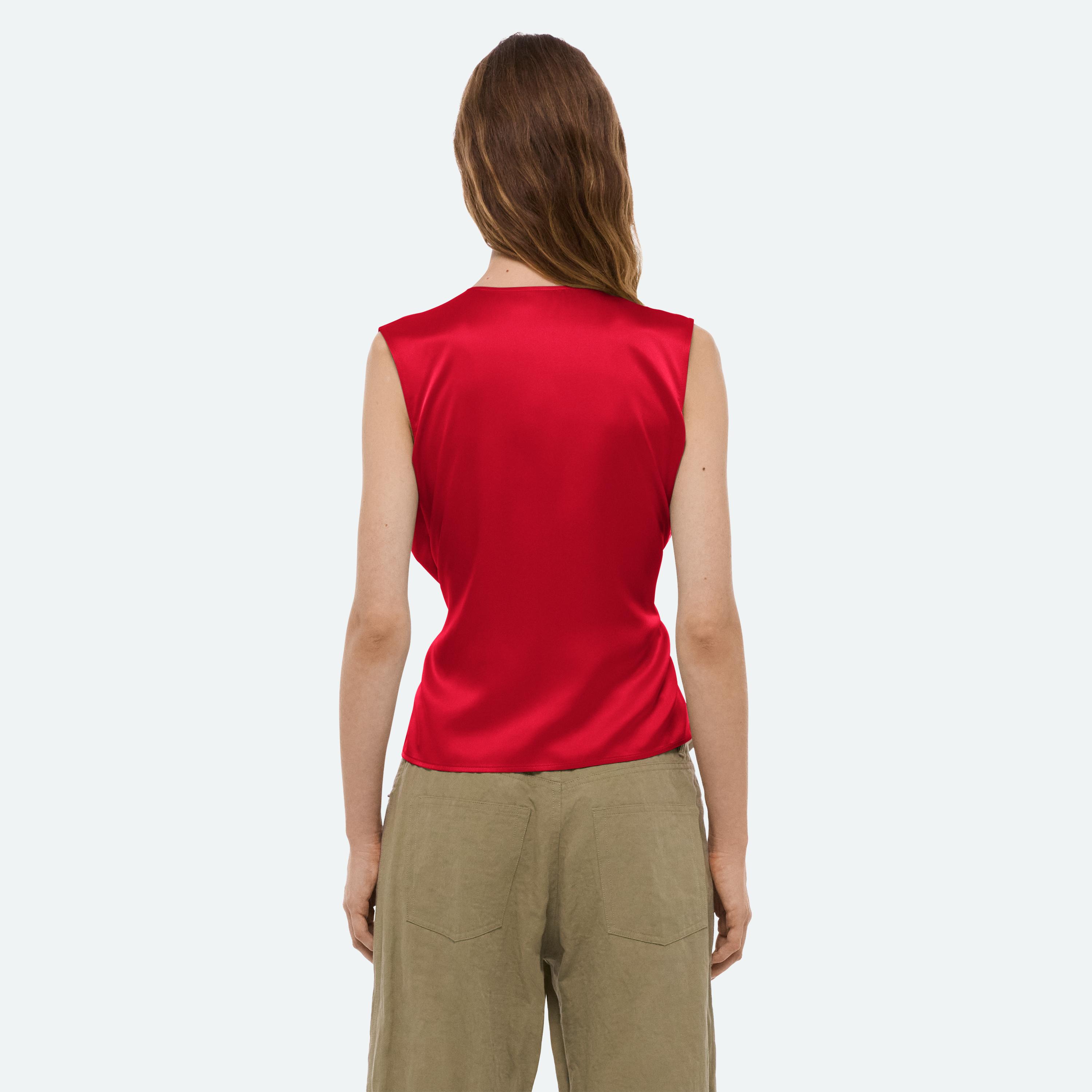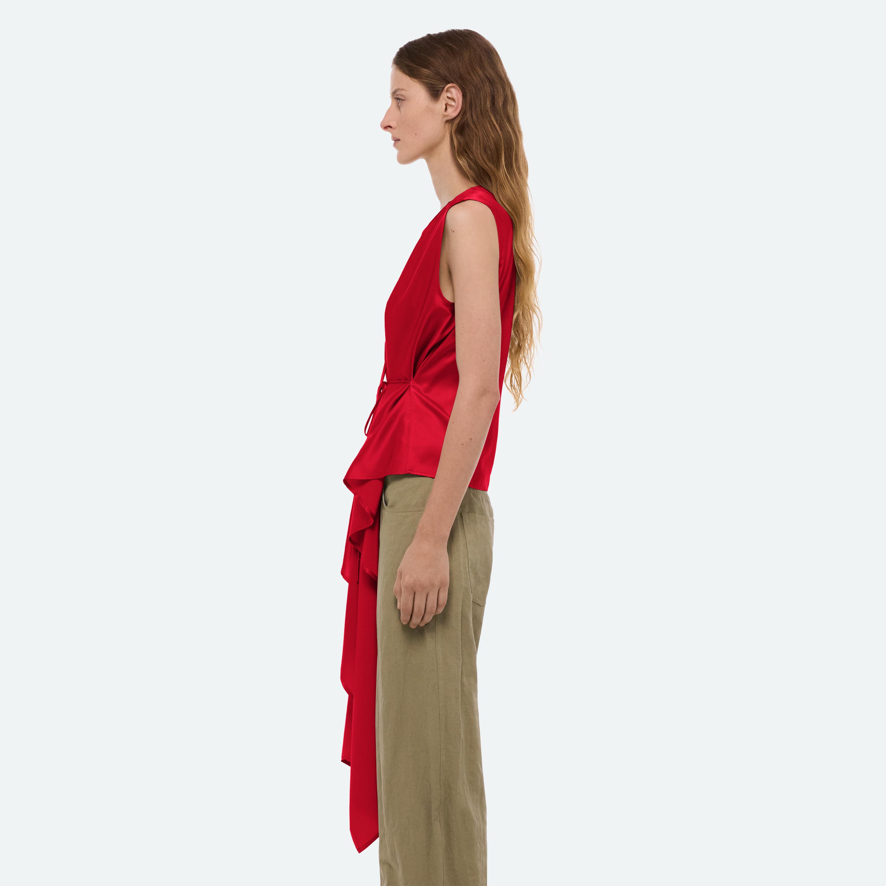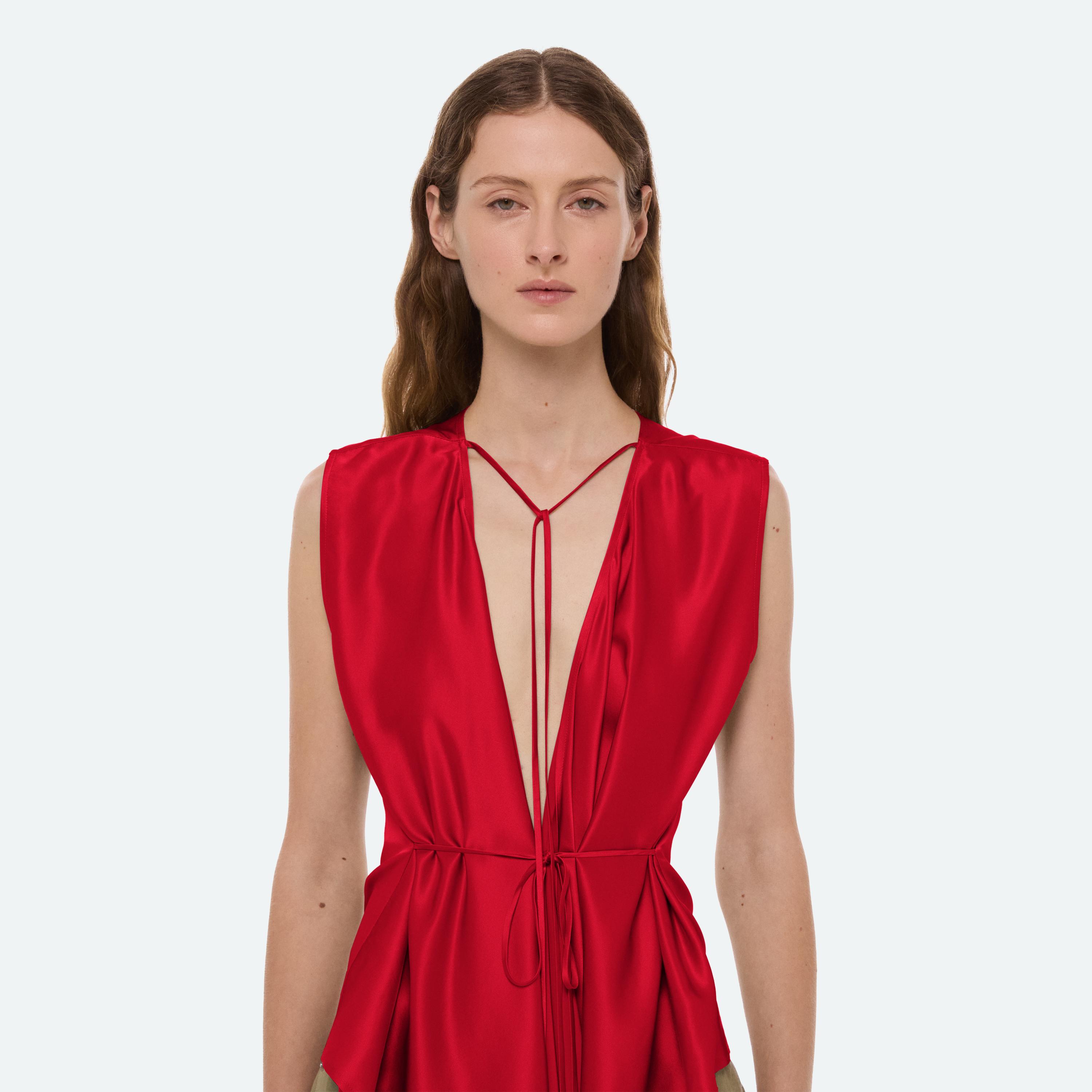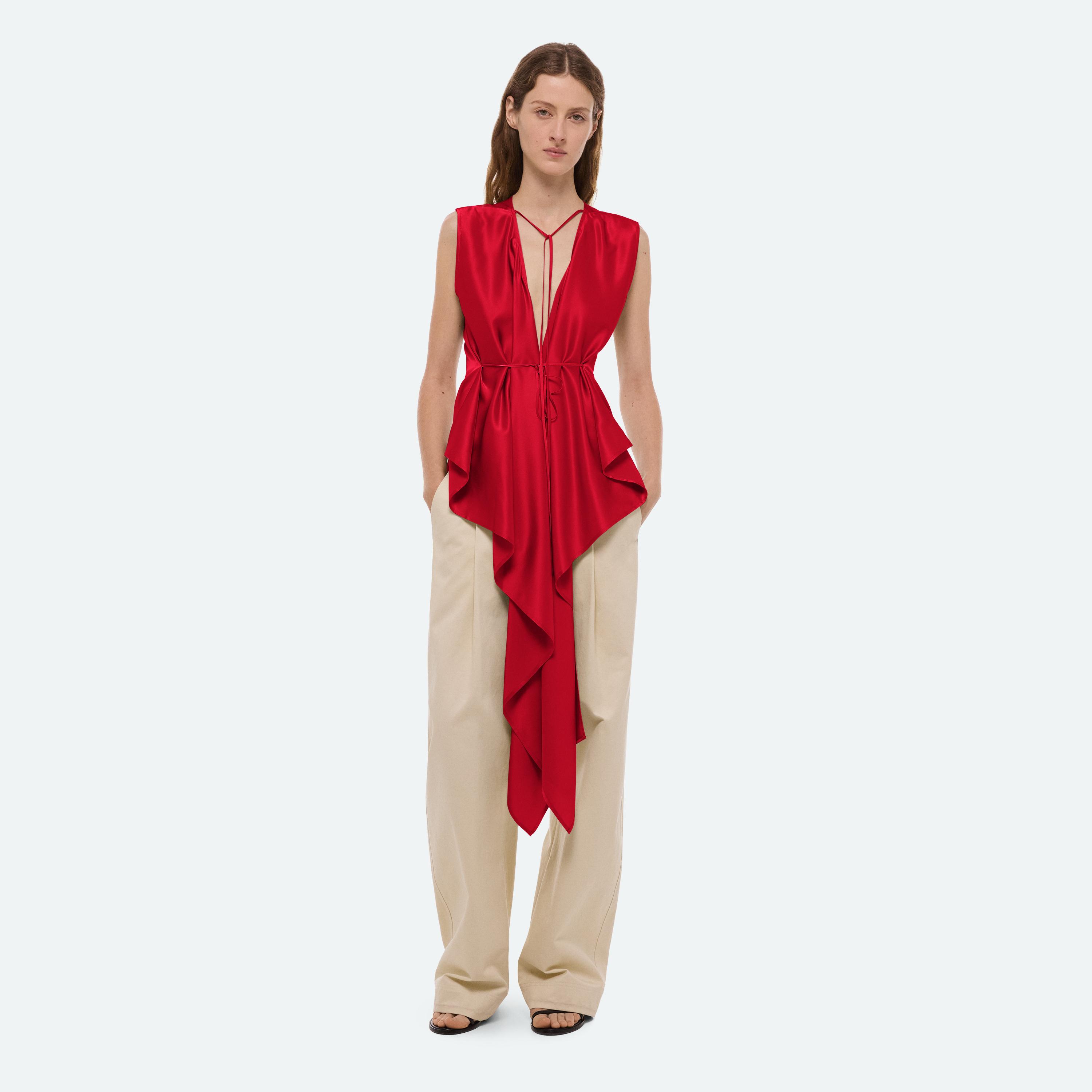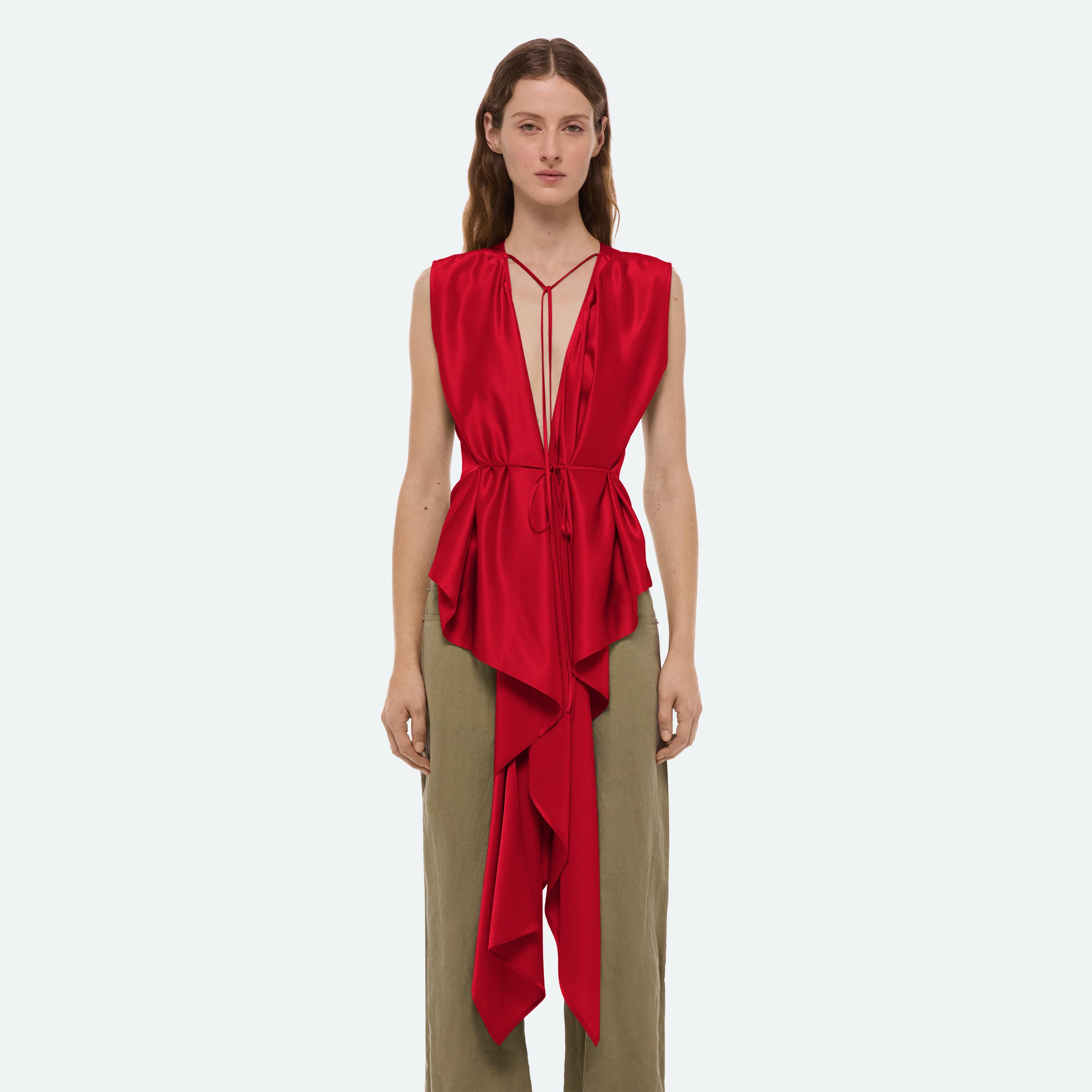 Sleeveless top in silk satin with exaggerated scarf detail and silk tie closure. Wear with the draped scarf in front for a deep V-neck, or reverse it for an open-back look.