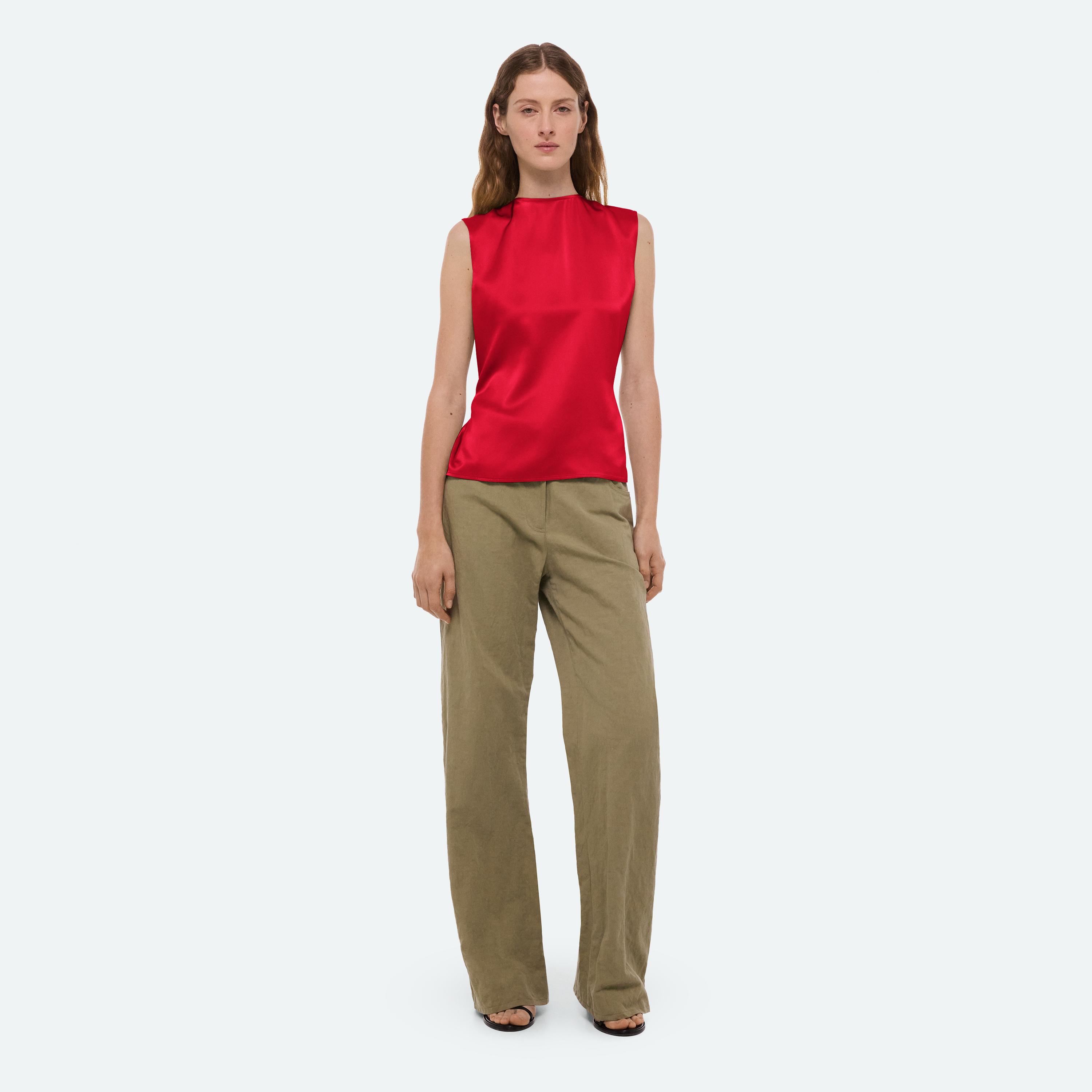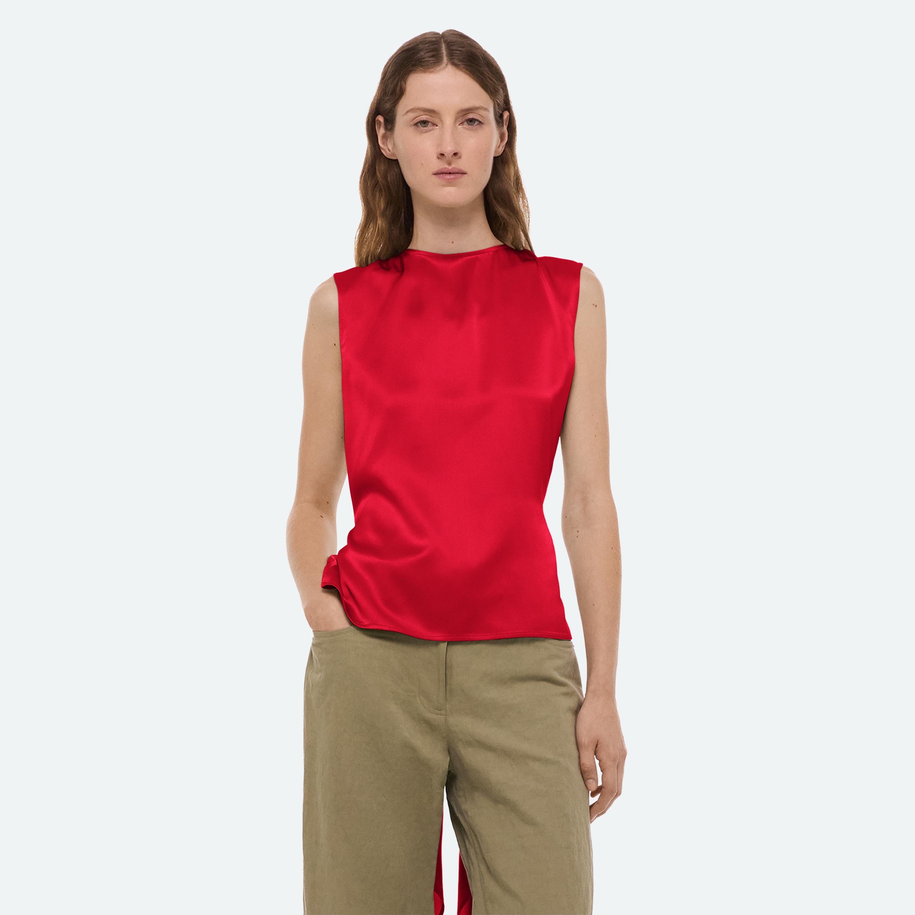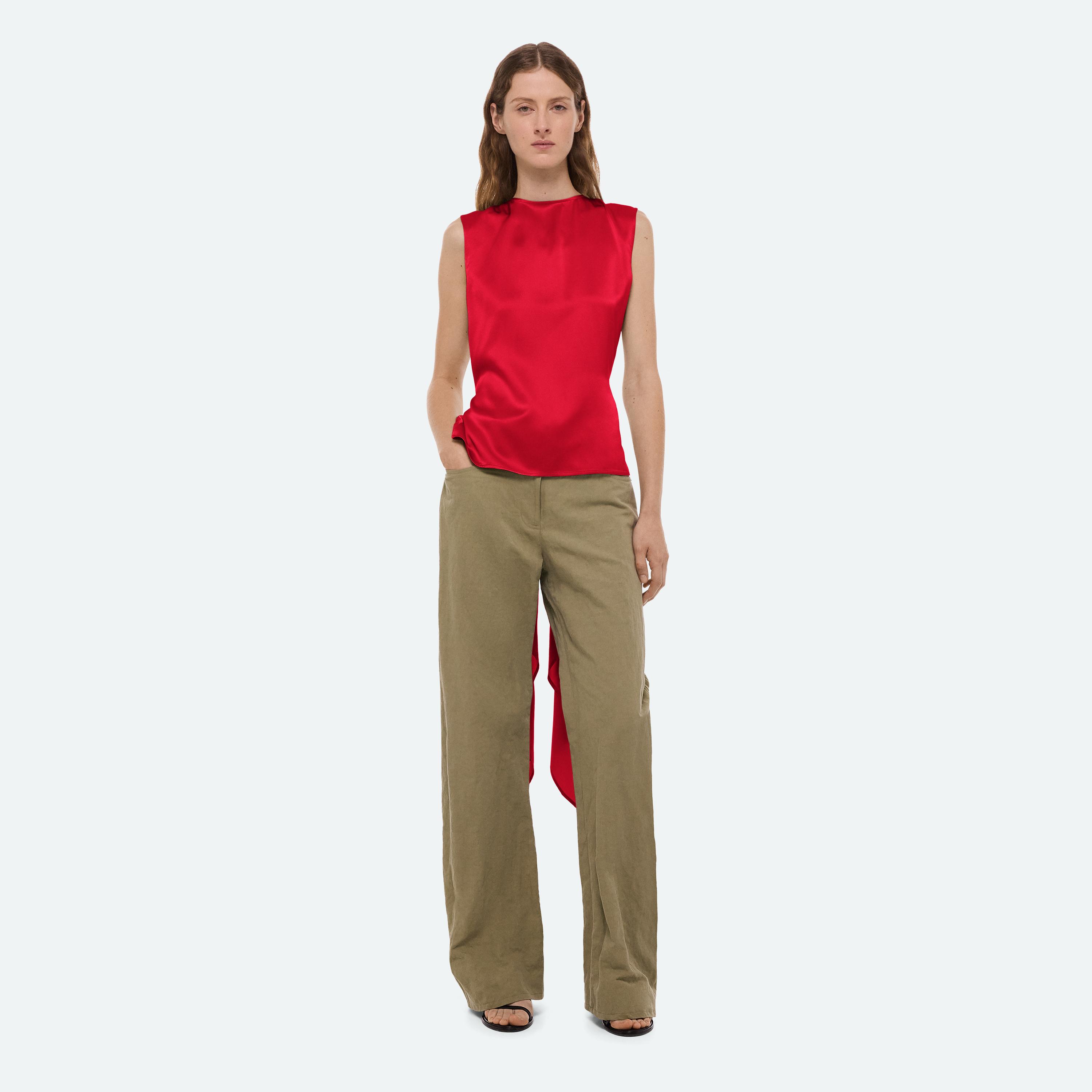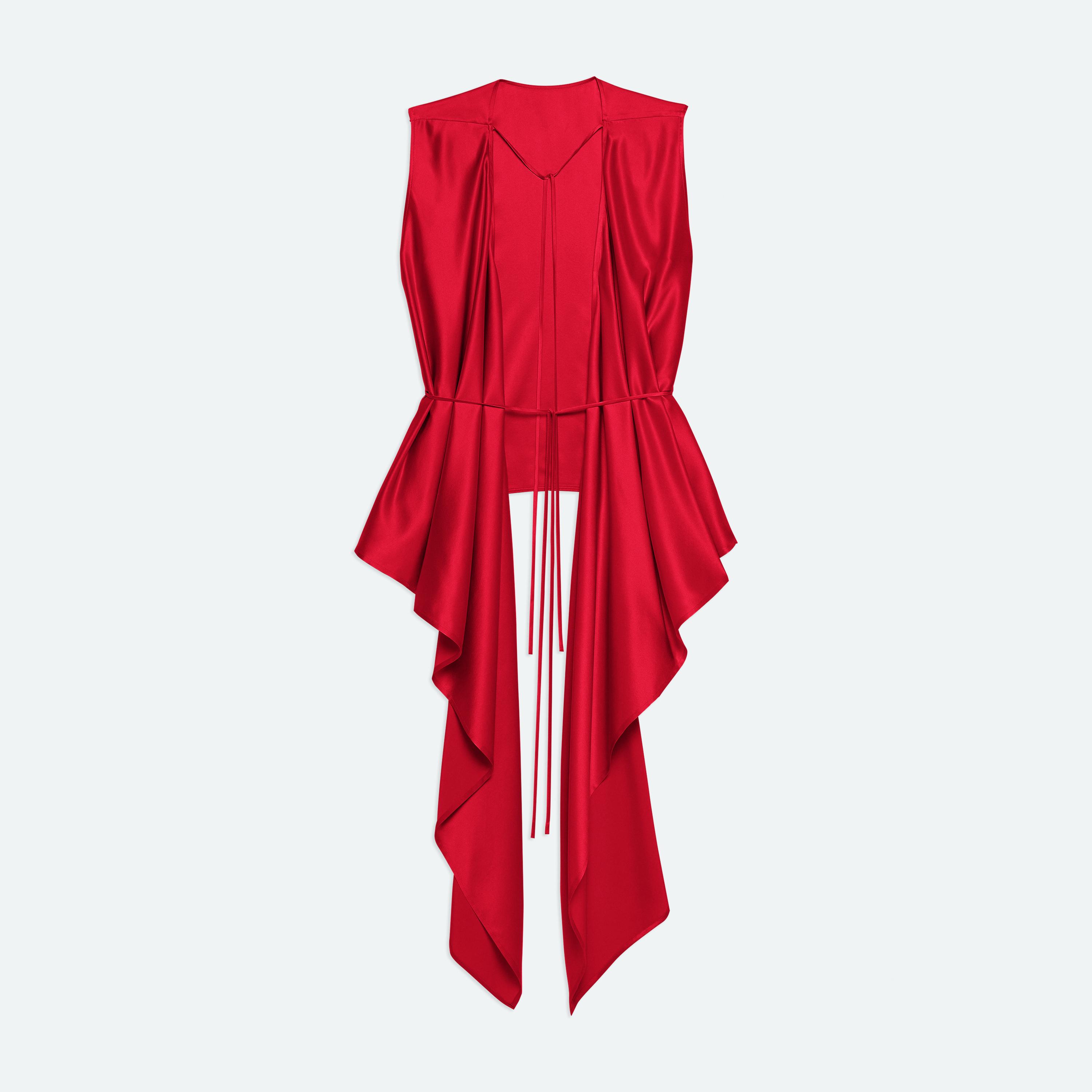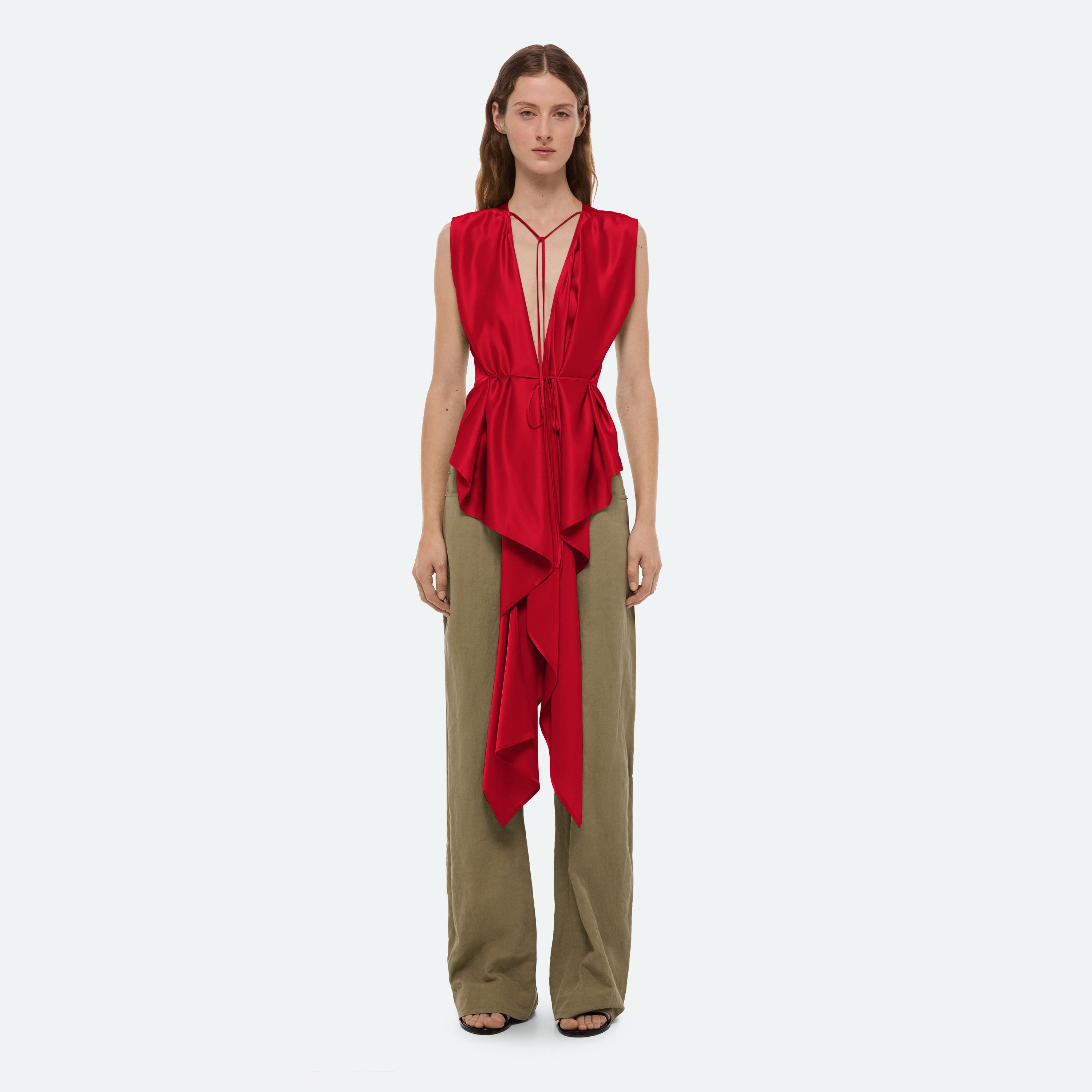 Sleeveless top in silk satin with exaggerated scarf detail and silk tie closure. Wear with the draped scarf in front for a deep V-neck, or reverse it for an open-back look.