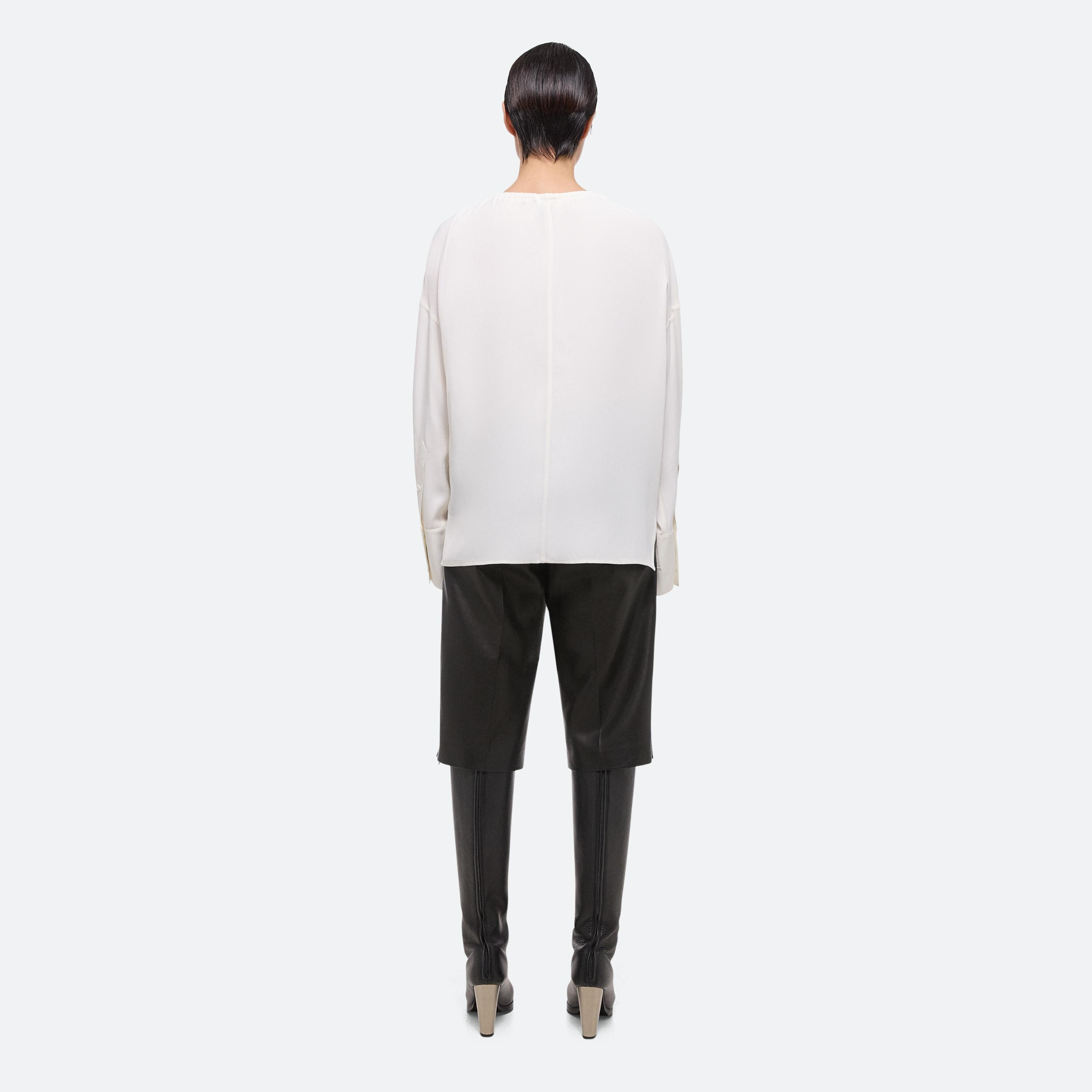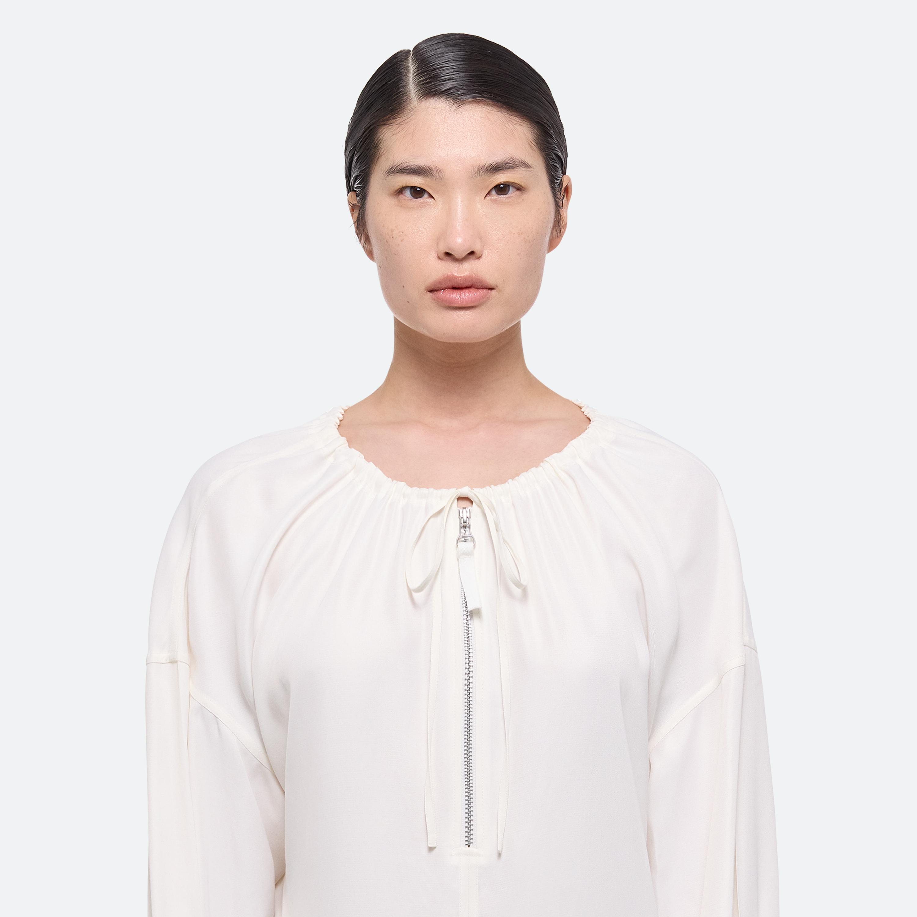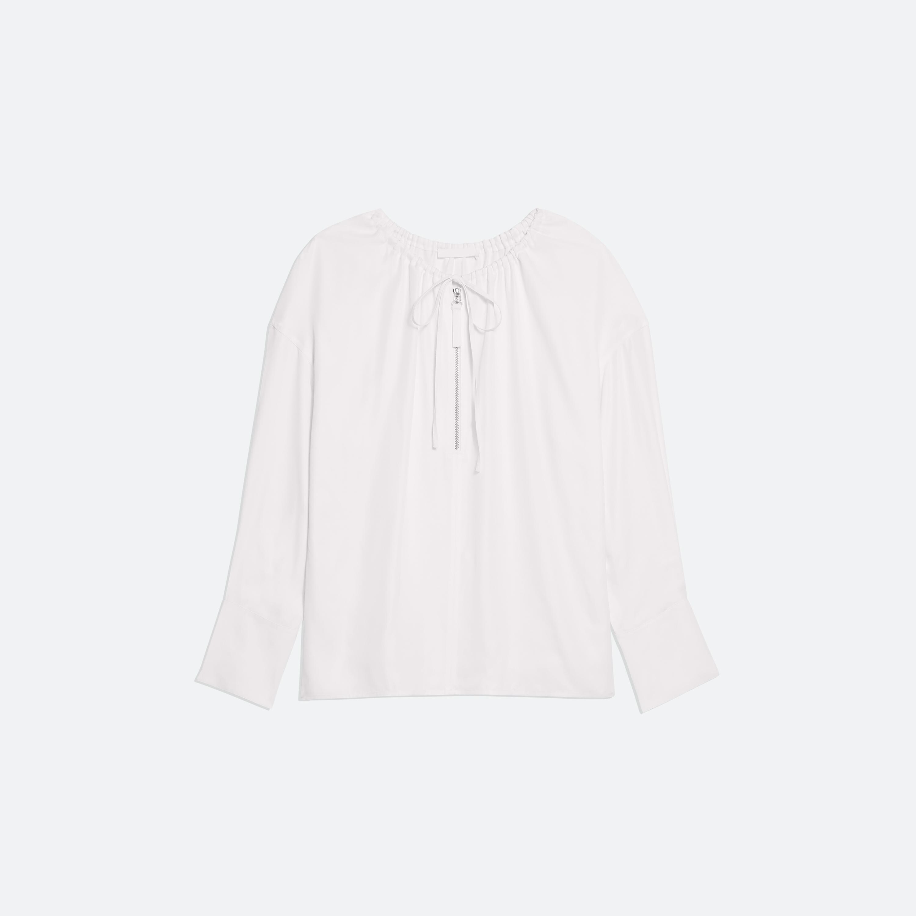 Oversized twill shirt with a gathered drawstring neckline and exposed half zip.