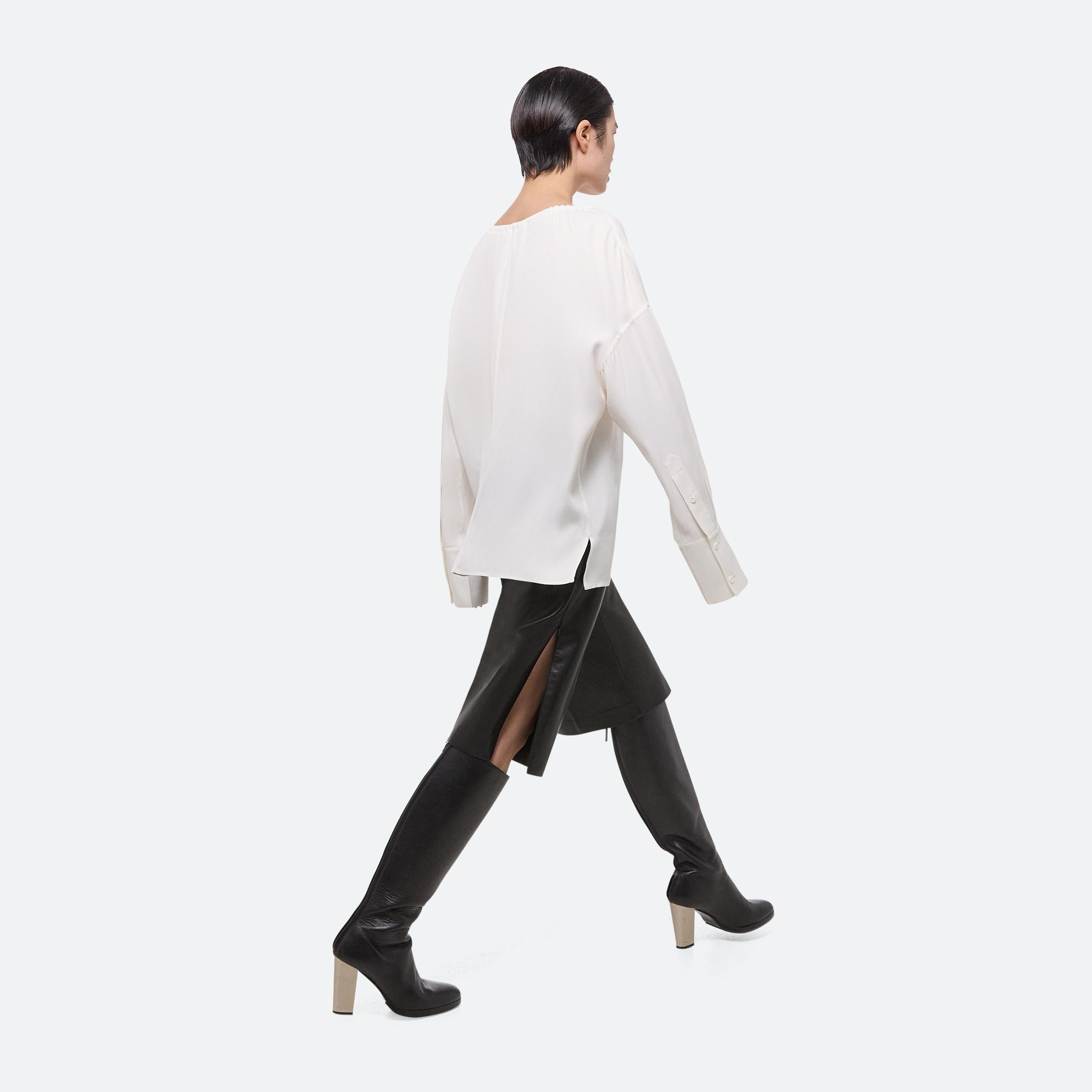 Oversized twill shirt with a gathered drawstring neckline and exposed half zip.