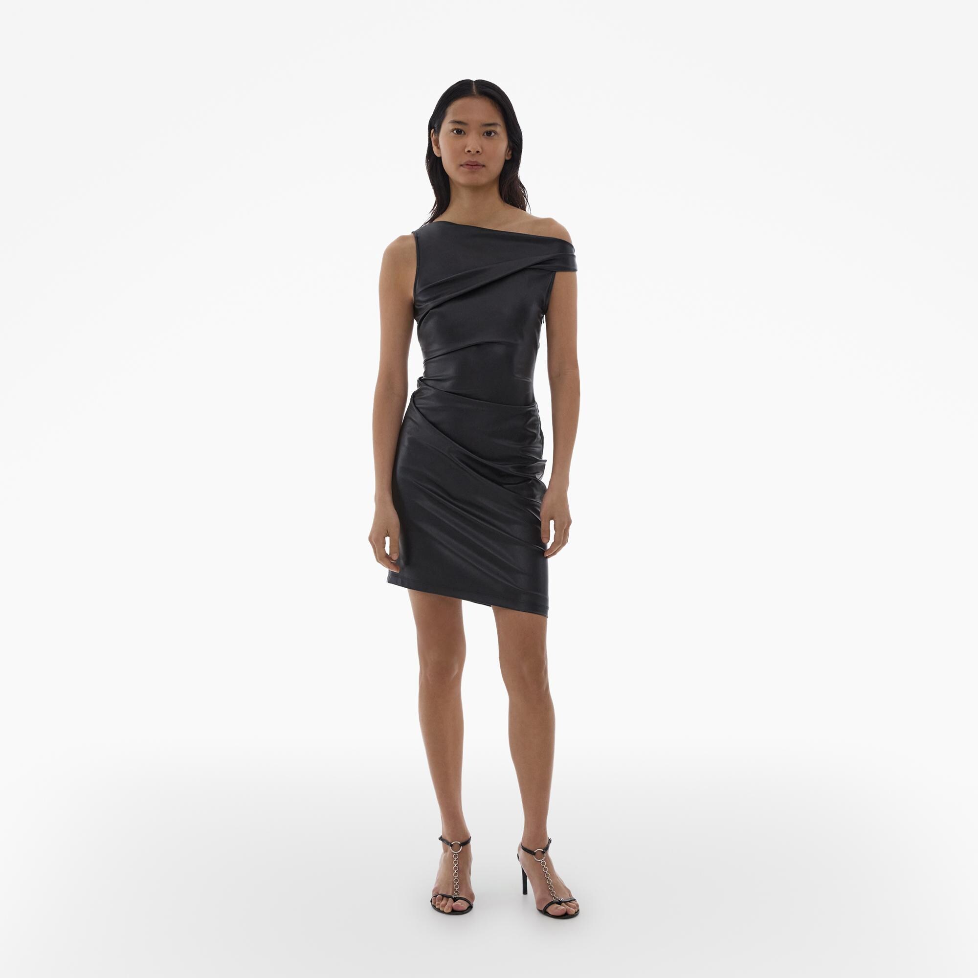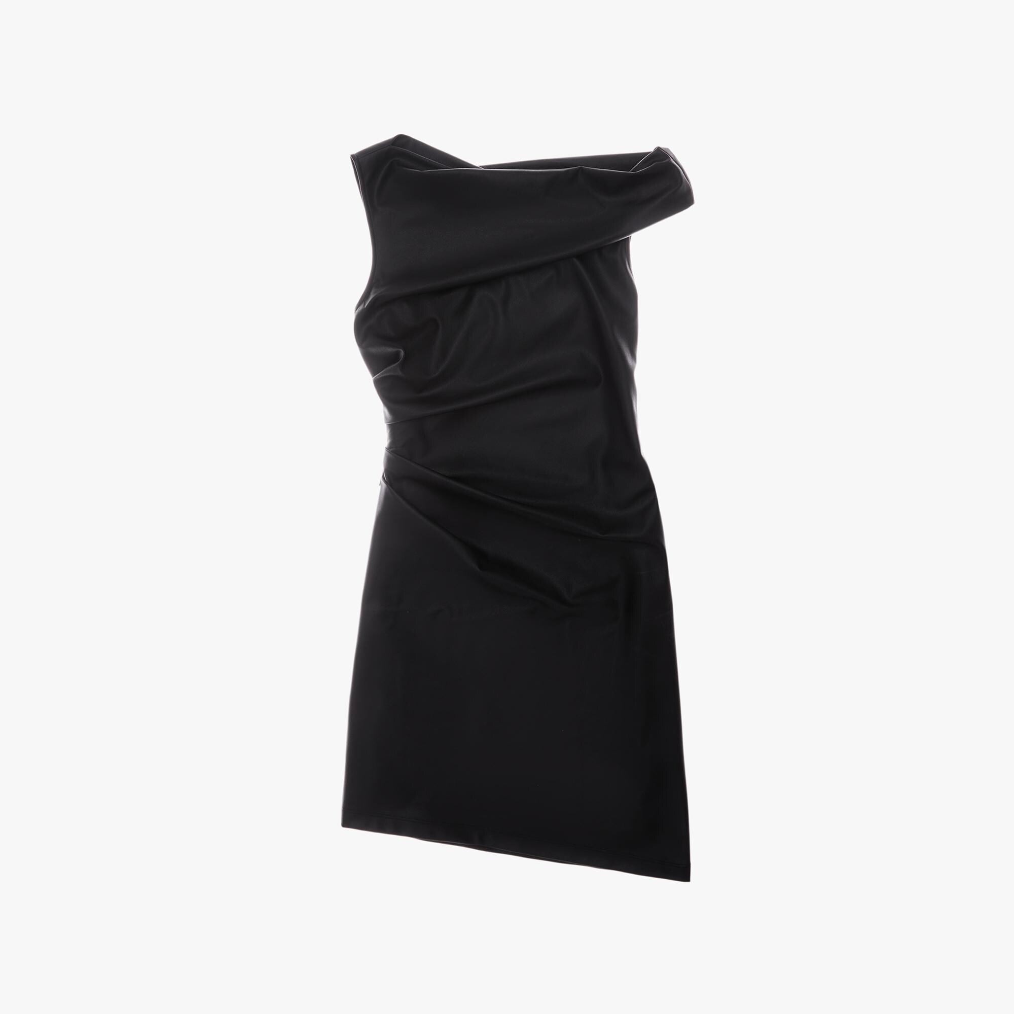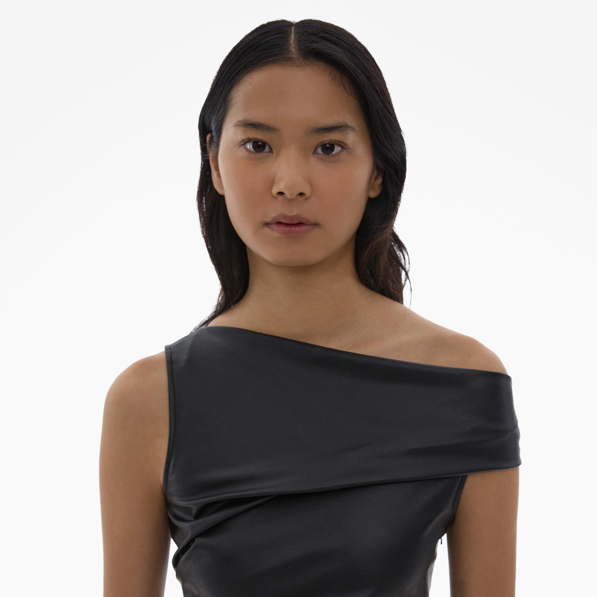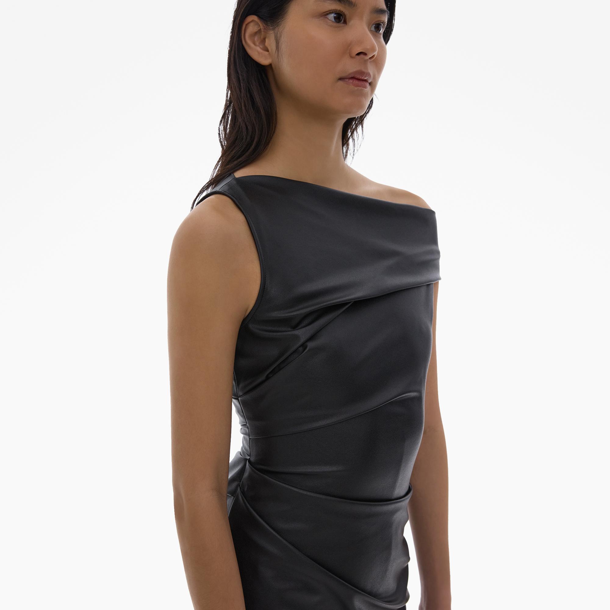 The Helmut Lang Midi Dress is an sleeveless style in a faux leather with an asymmetrical neckline and hemline.