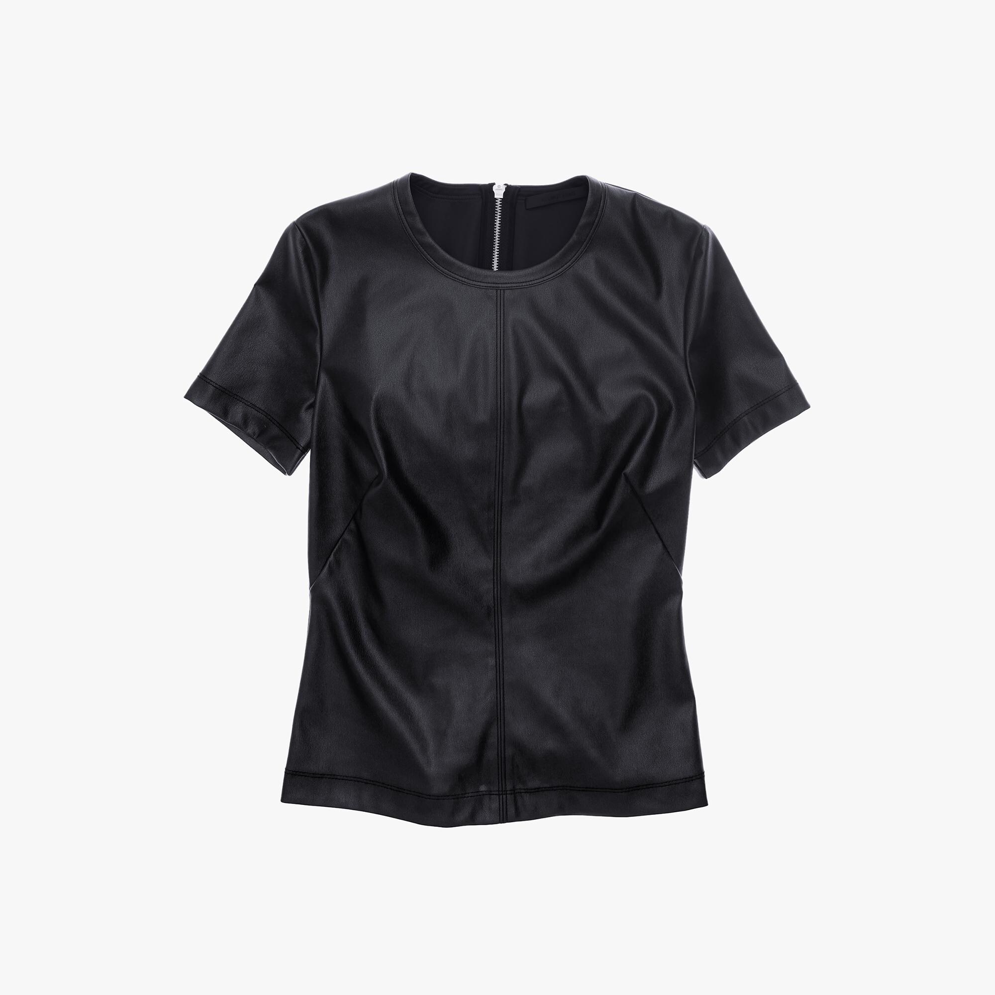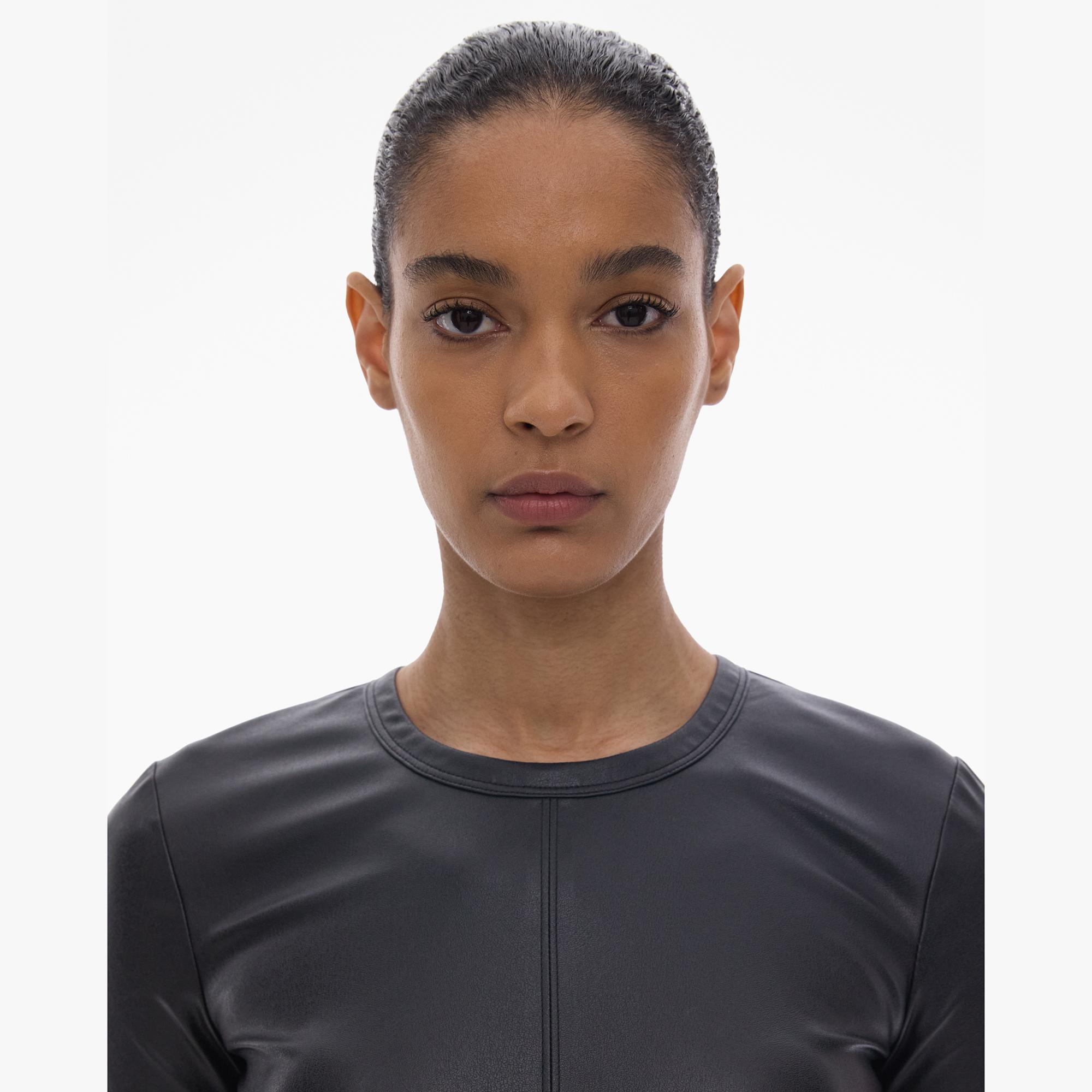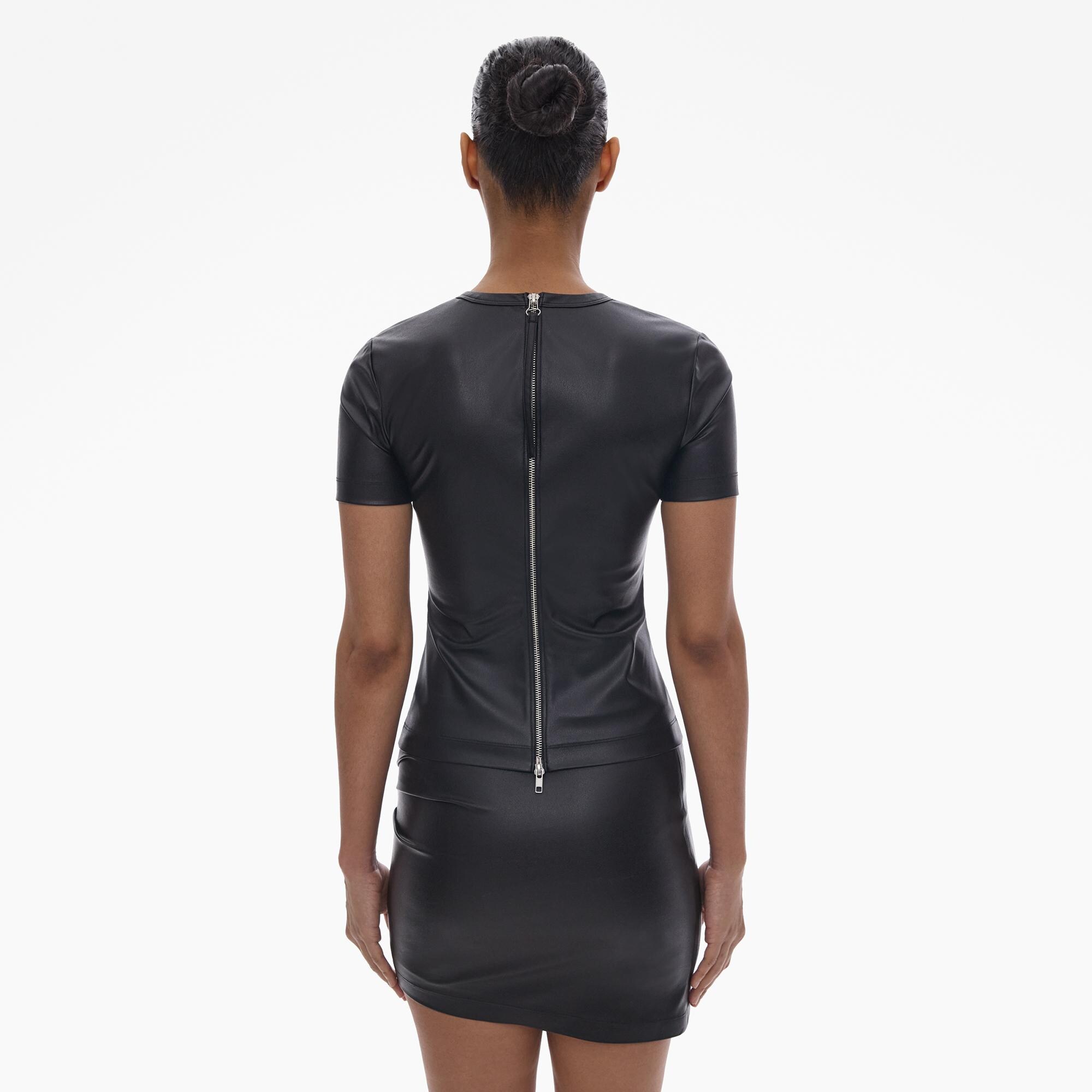 The Helmut Lang Tee is a slim-fitting style in stretch faux leather that is zipped along the back with a crew neckline and short sleeves.