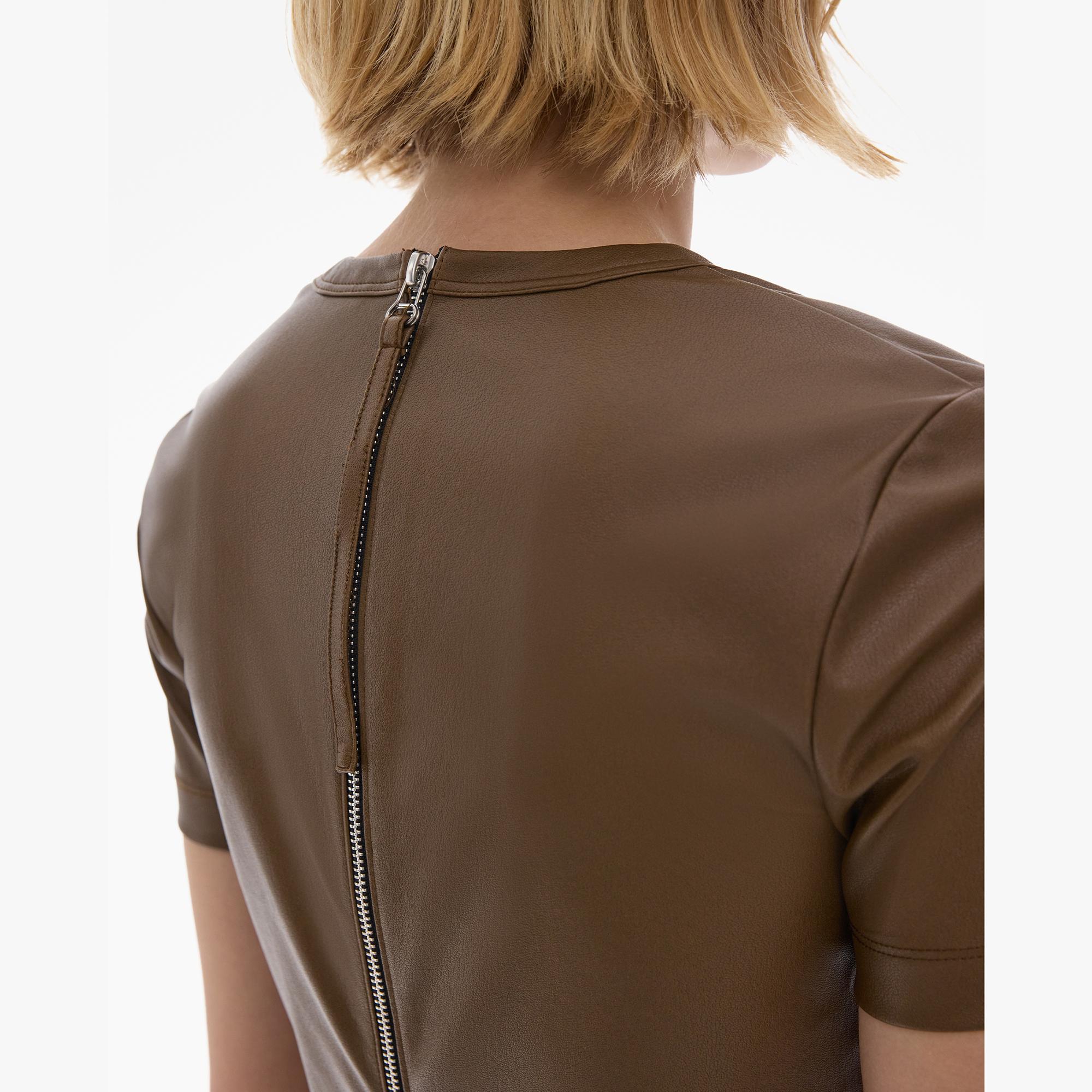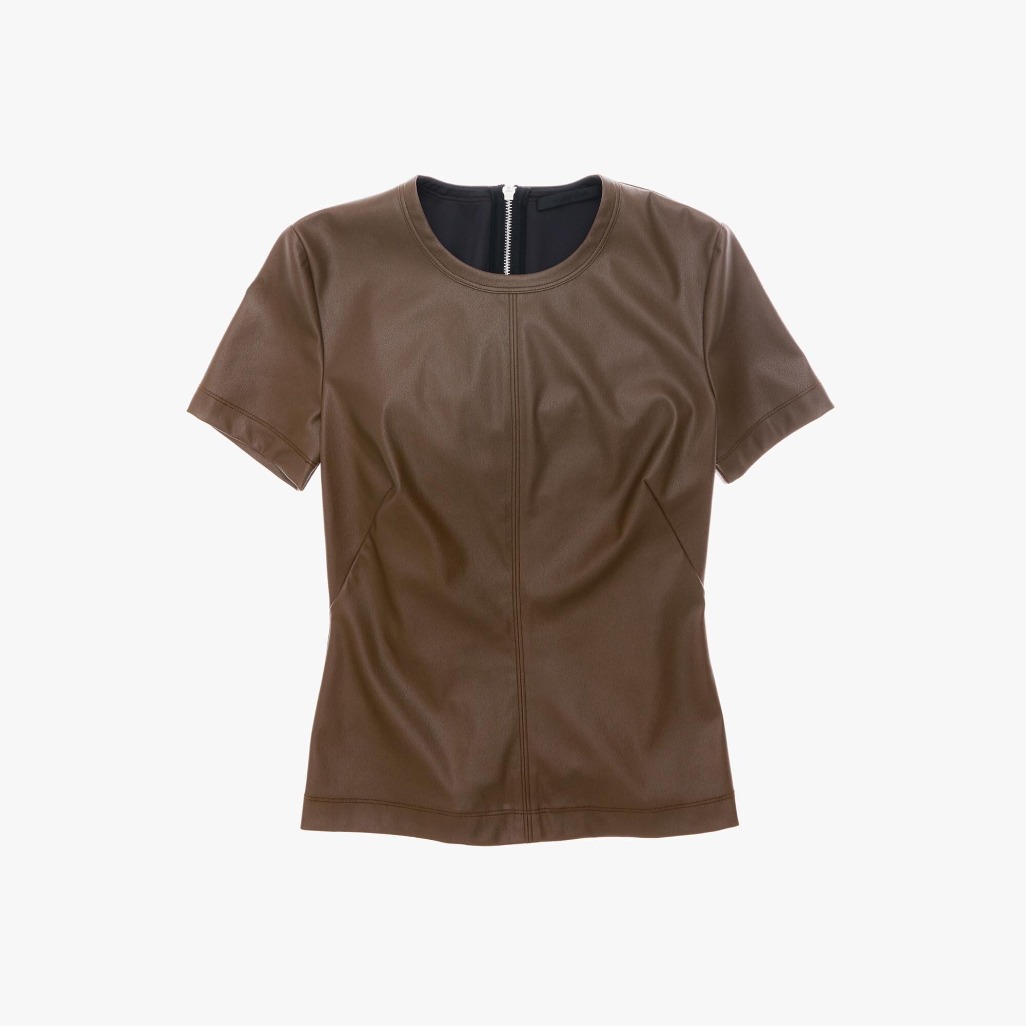 The Helmut Lang Tee is a slim-fitting style in stretch faux leather that is zipped along the back with a crew neckline and short sleeves.