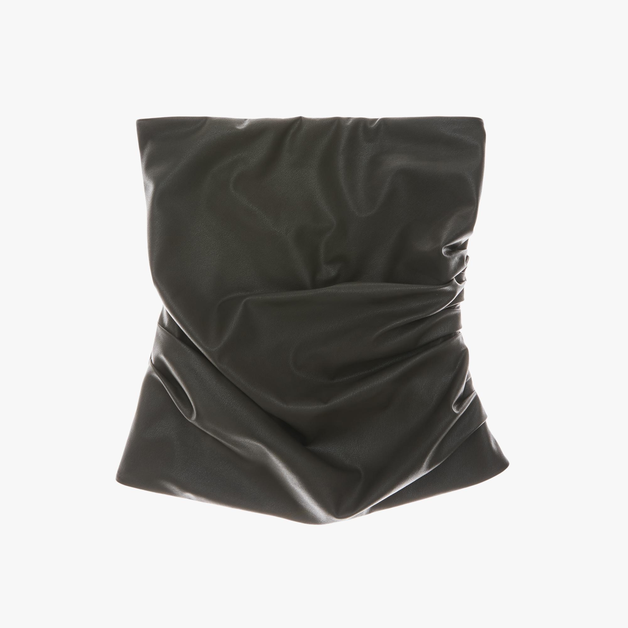 The Helmut Lang Tube Top is a pull-over style in a faux leather with ruched details throughout and a strapless neckline.