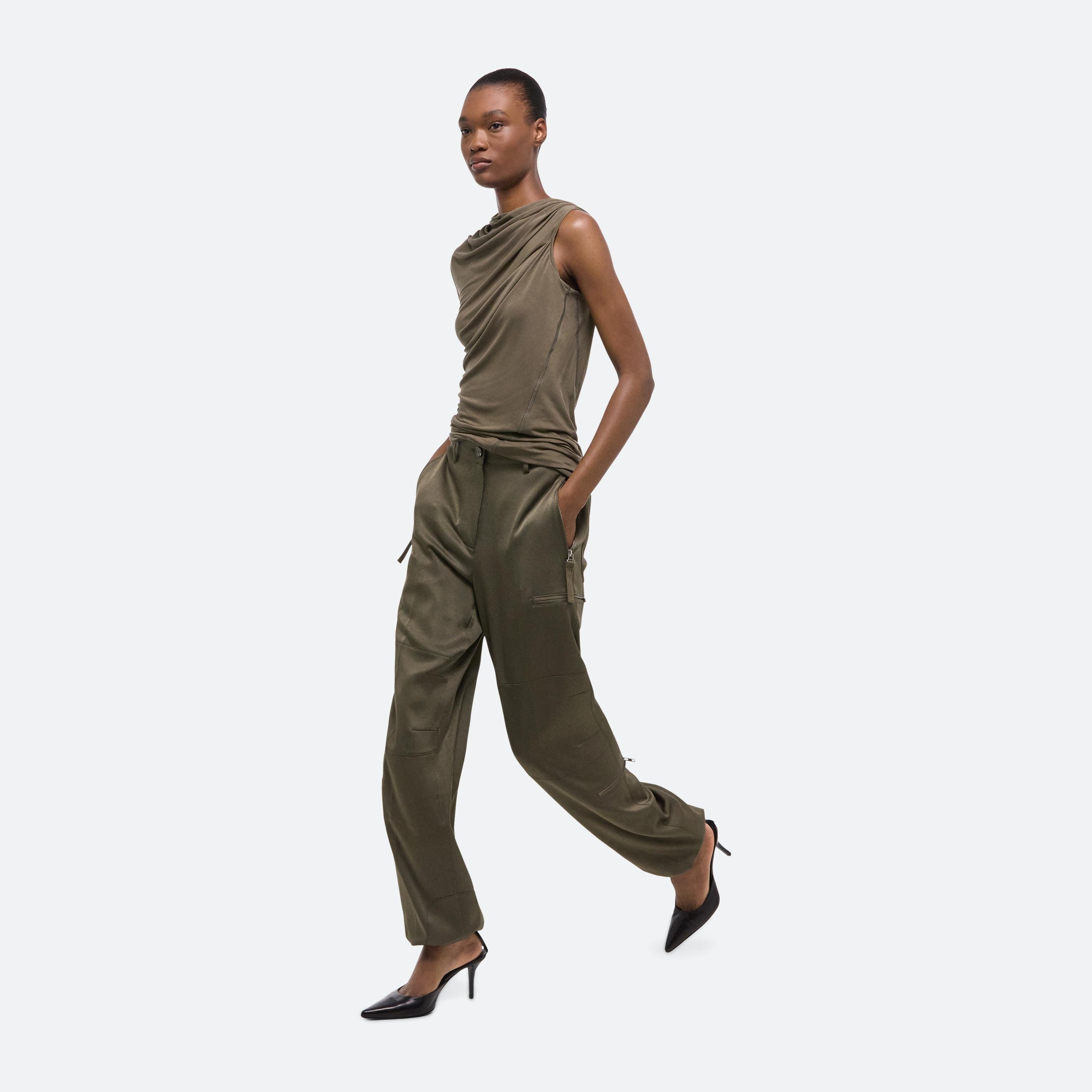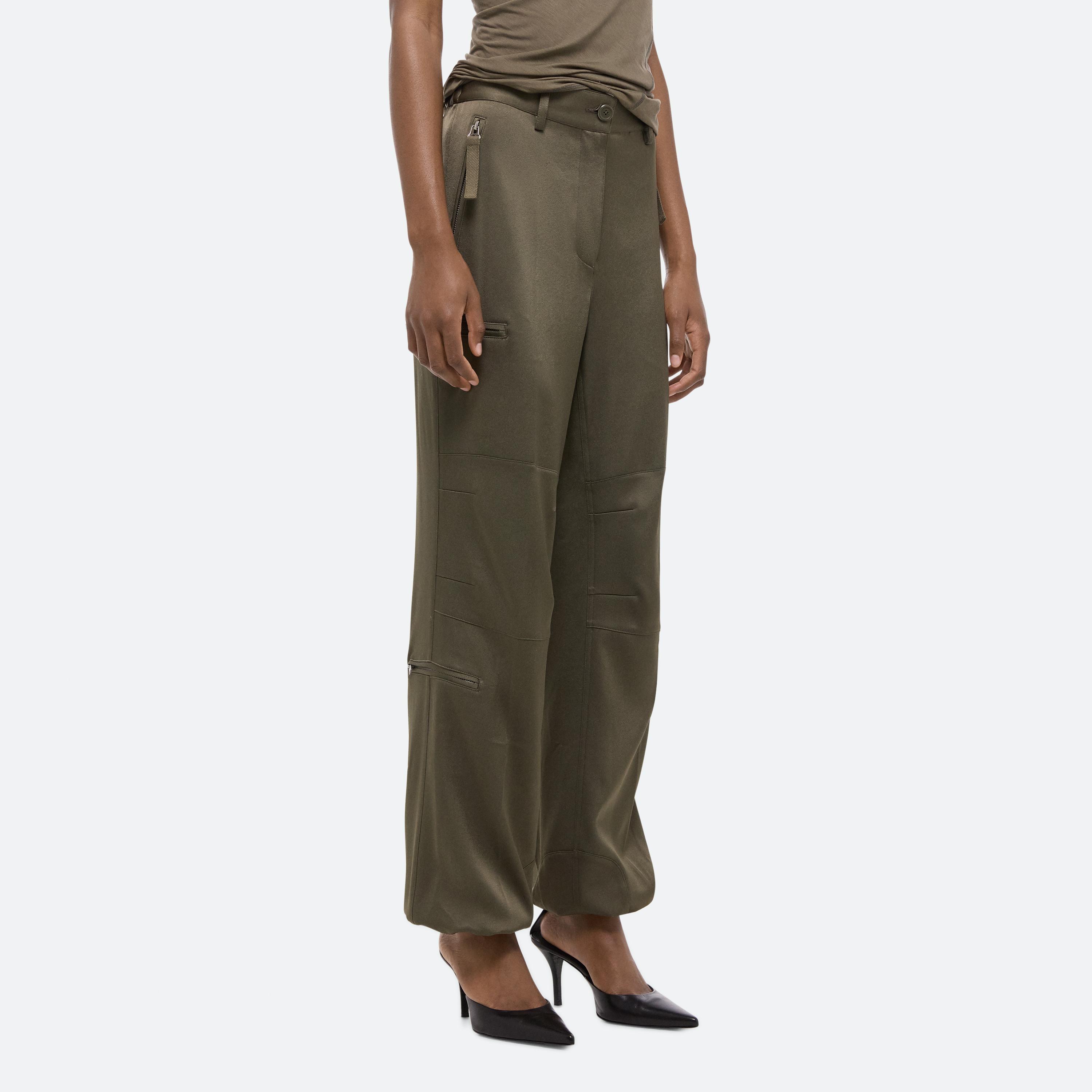 Mid-rise utility pants in crepe-backed satin. Inspired by the tactical details of aviation flight suits, with articulated knees and zip pockets throughout. Cinch the bungee cords at the ankle for a parachute fit.