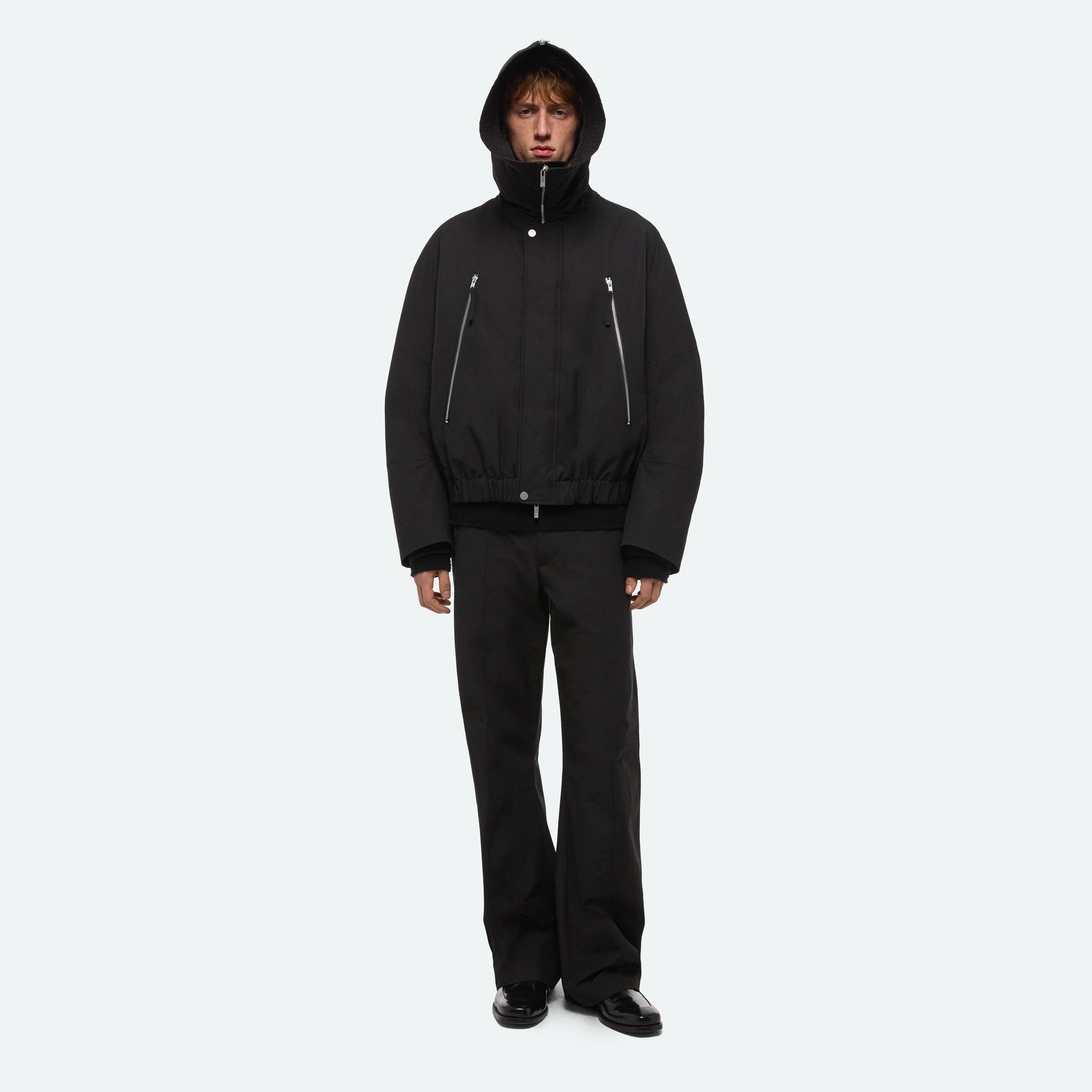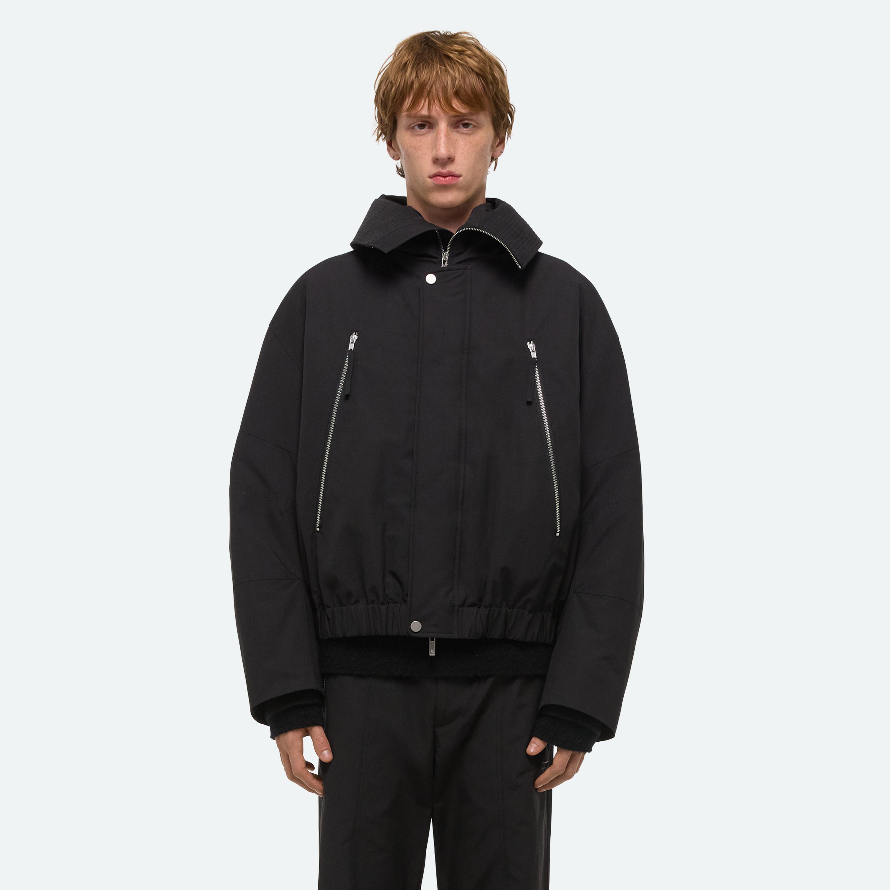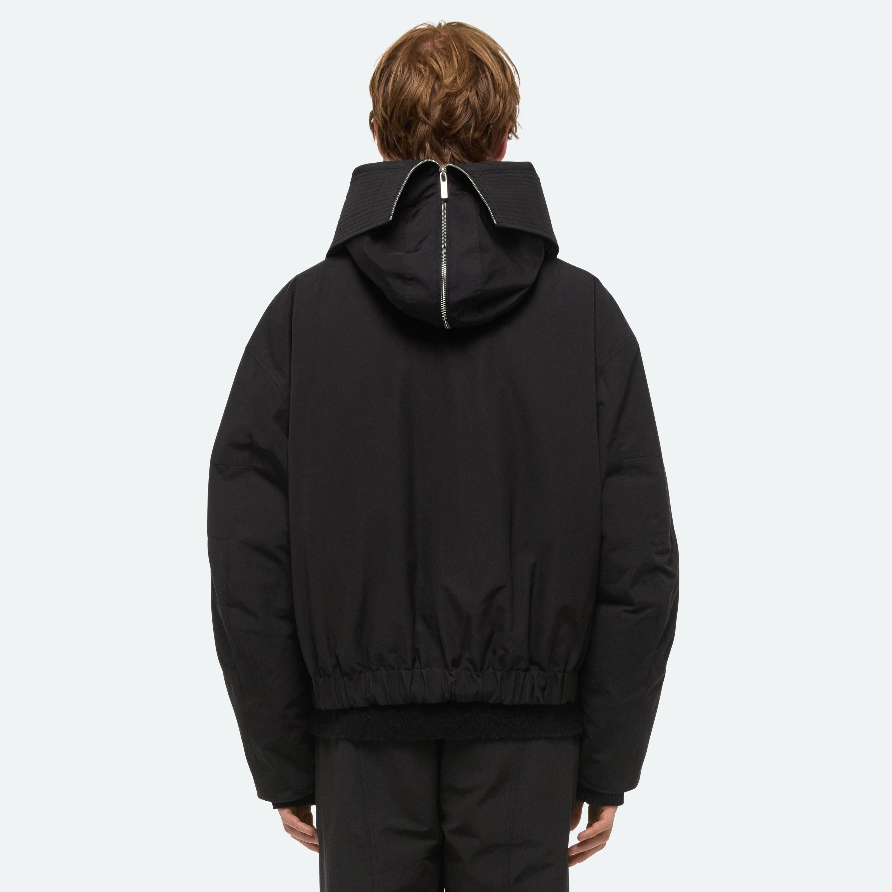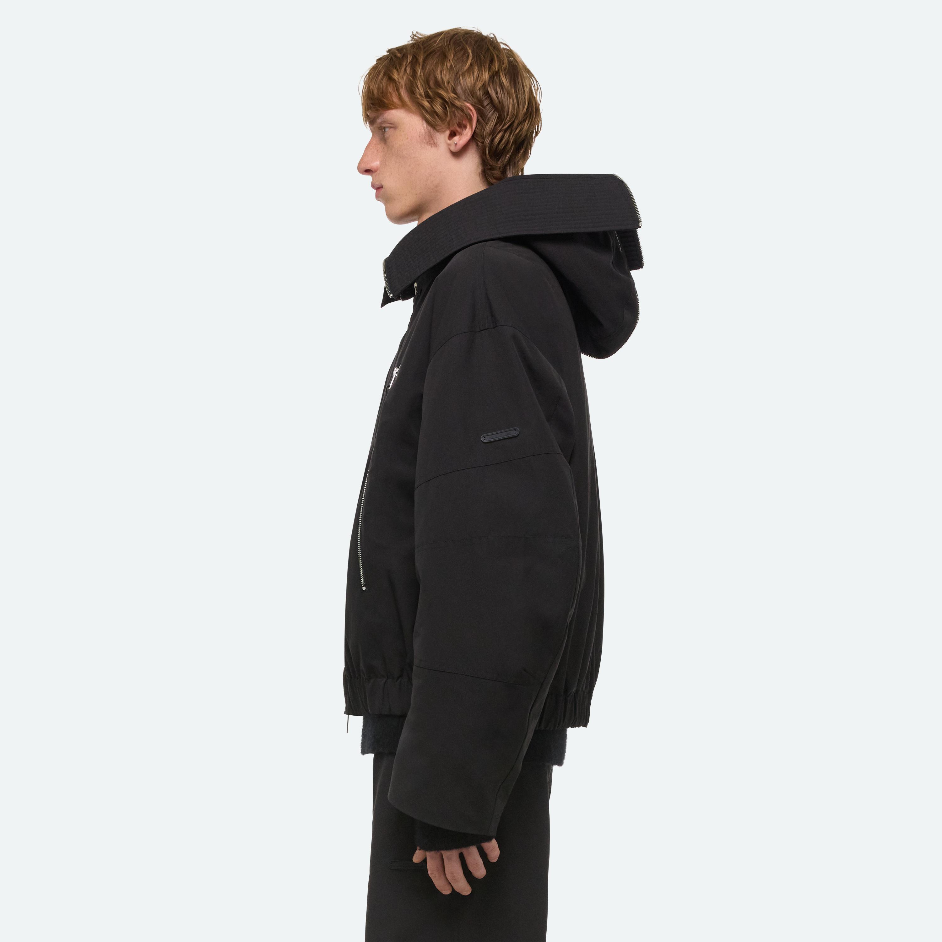 Padded bomber jacket in a technical cotton blend with a zip-open hood inspired by winter performance gear.