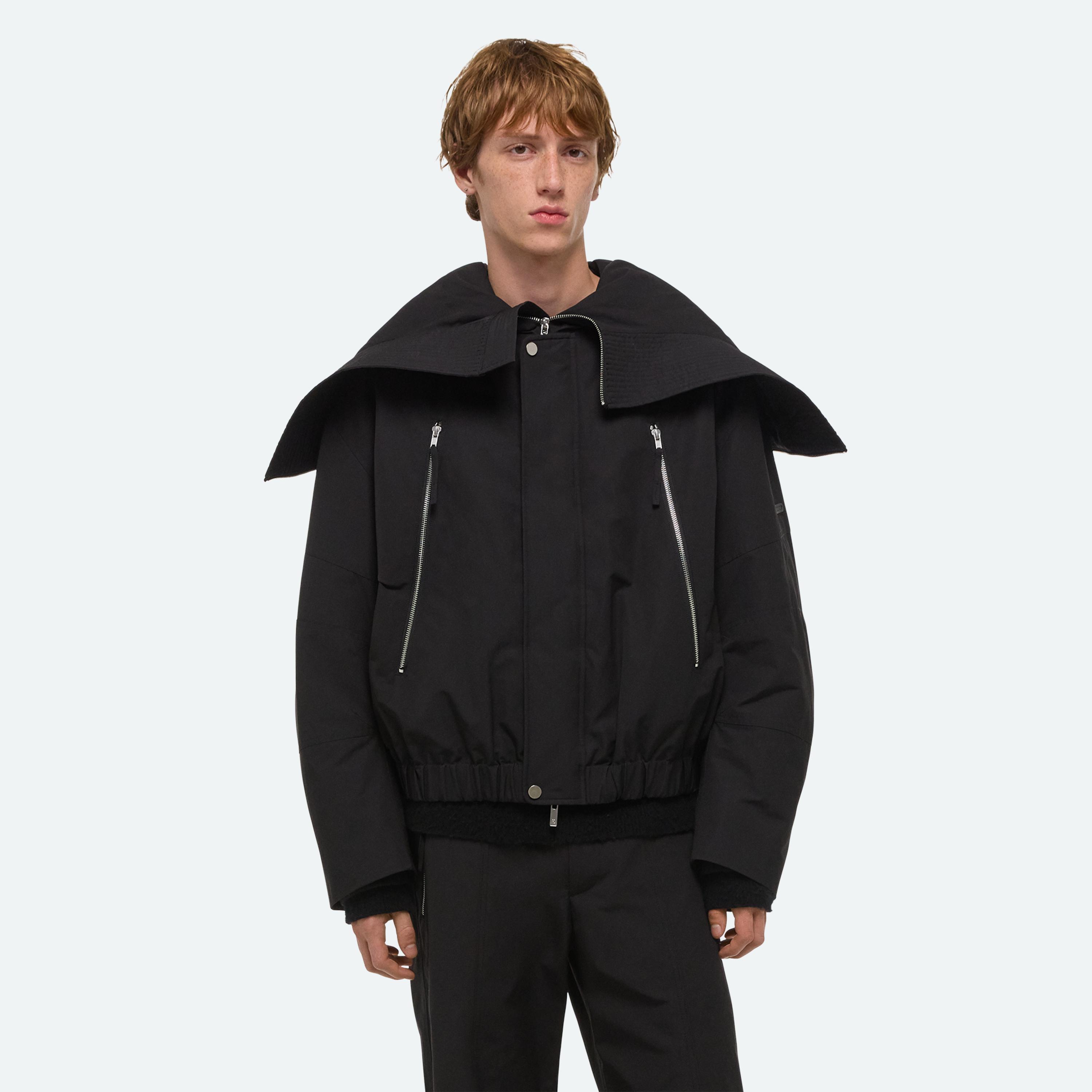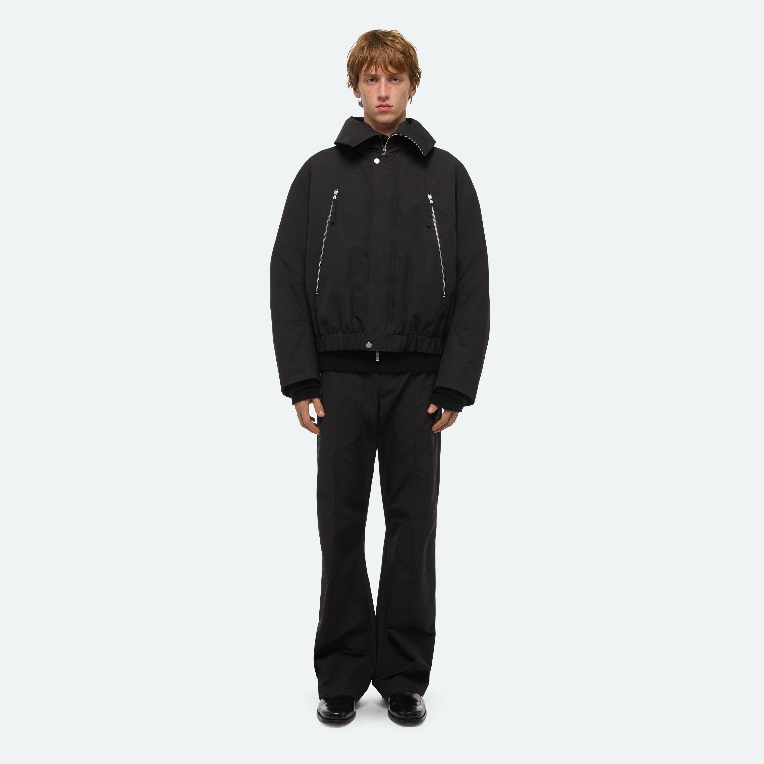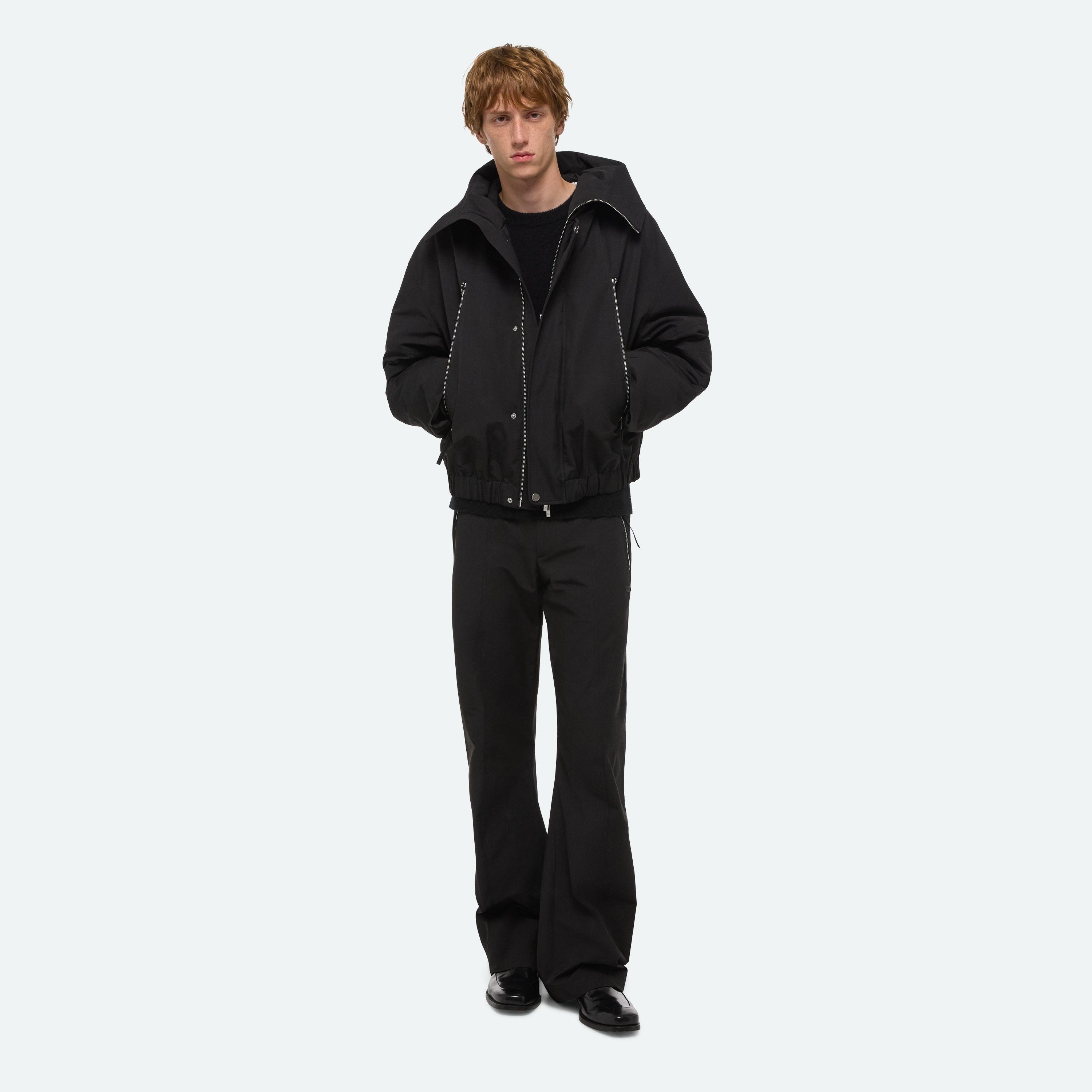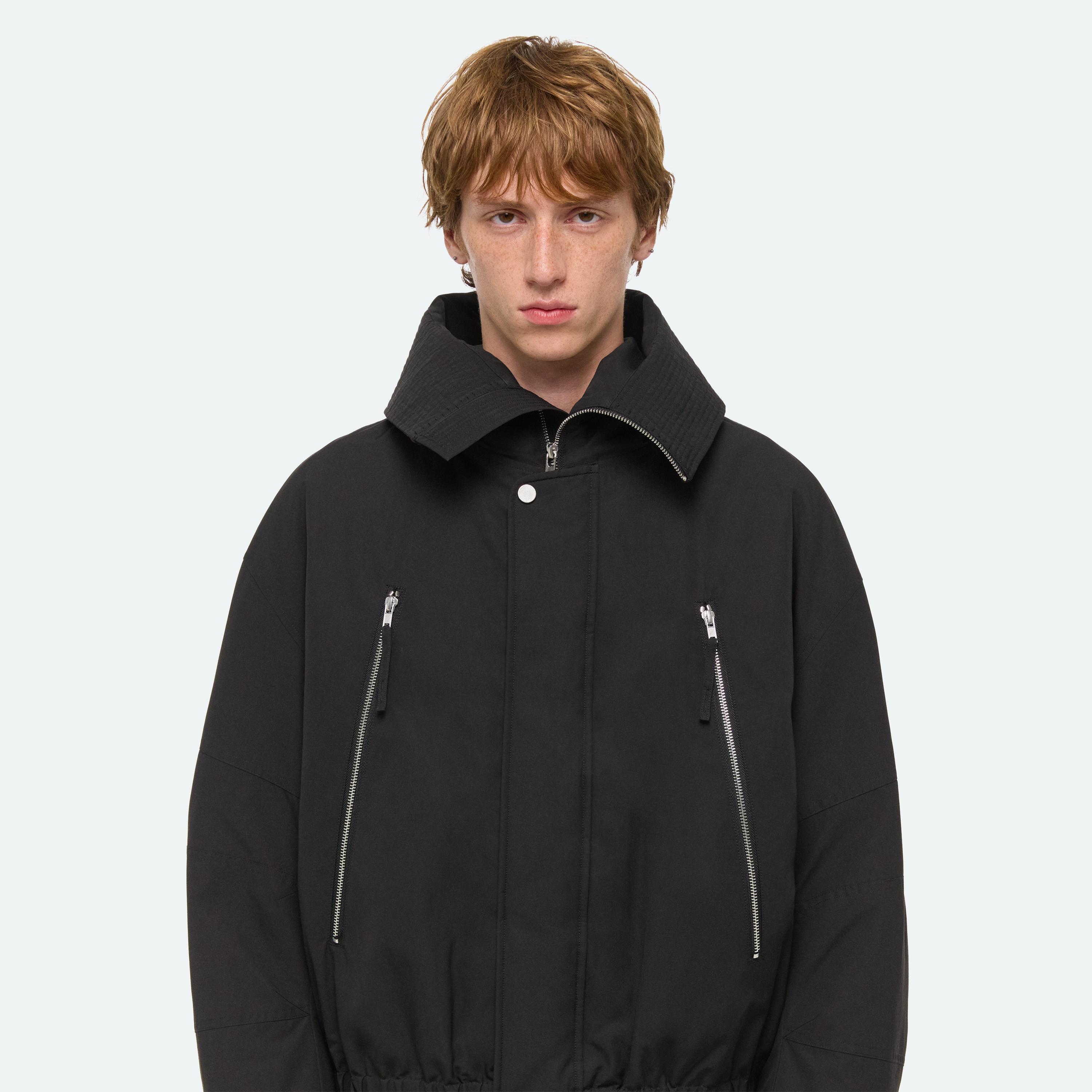 Padded bomber jacket in a technical cotton blend with a zip-open hood inspired by winter performance gear.
