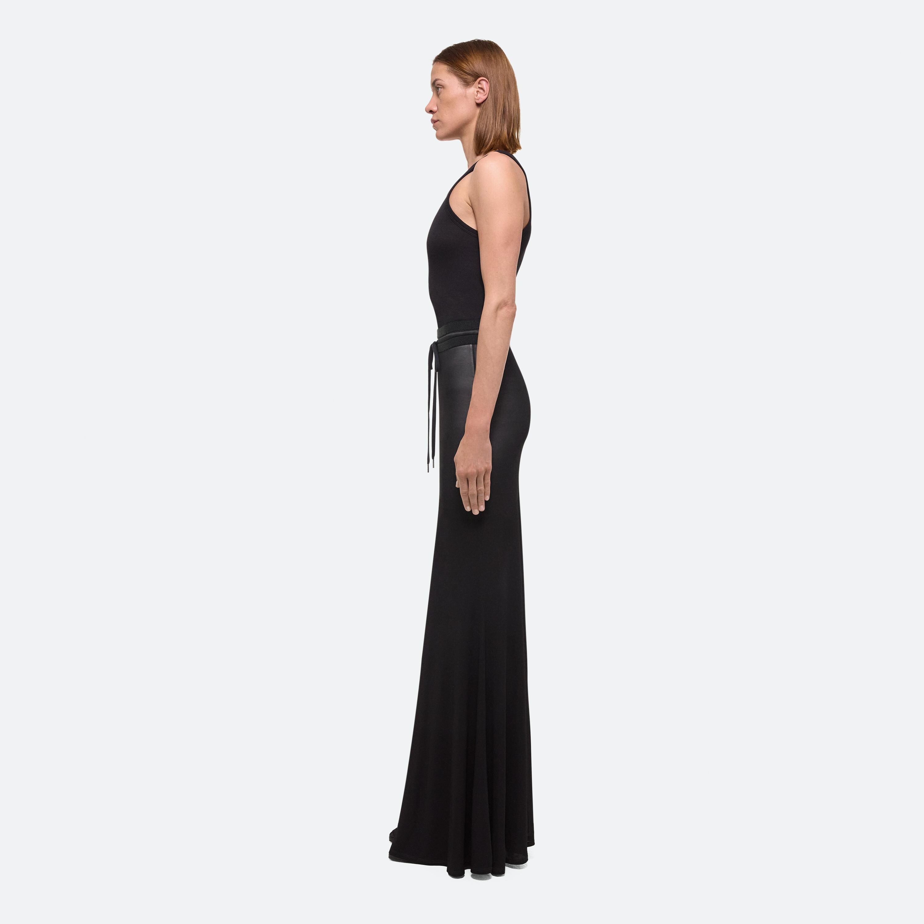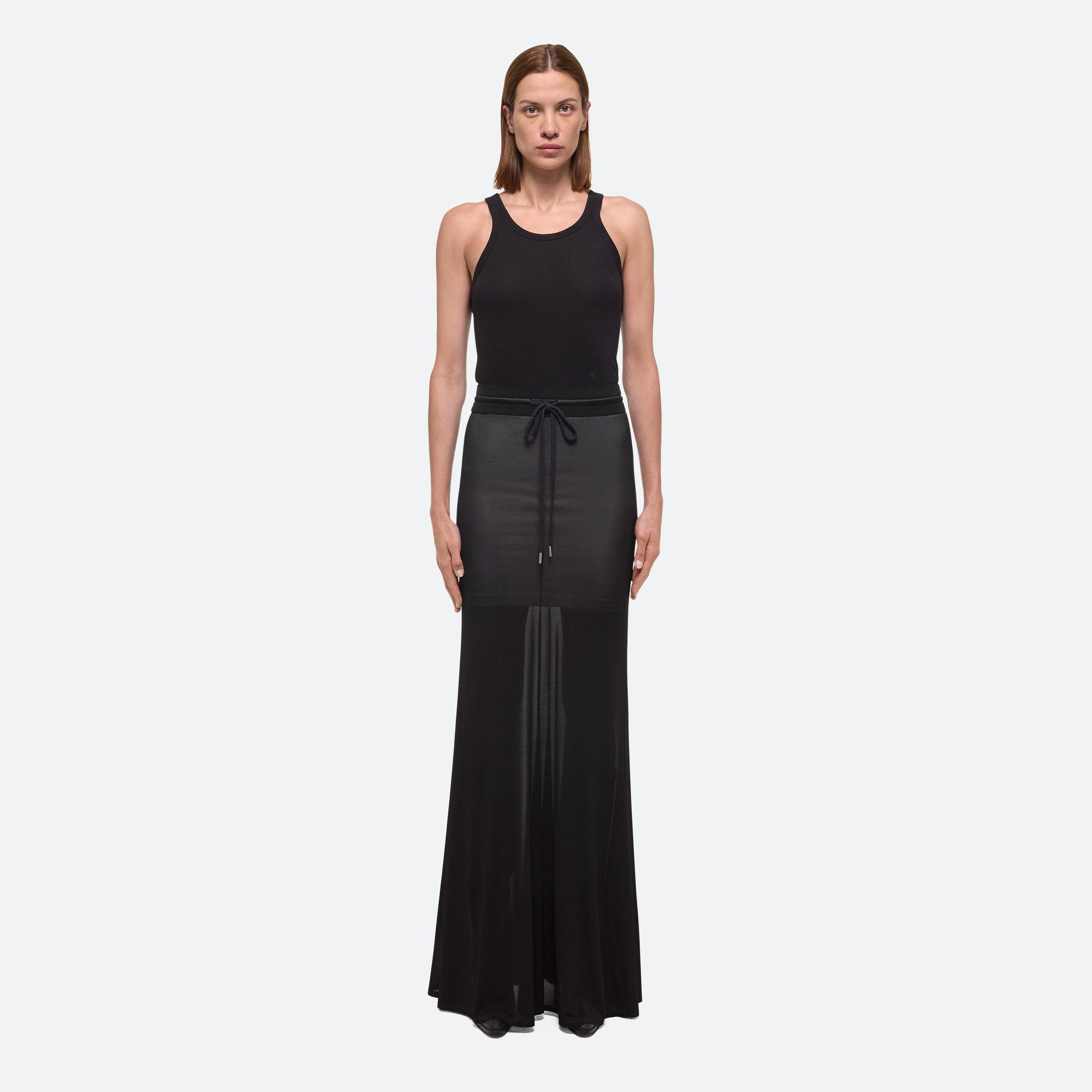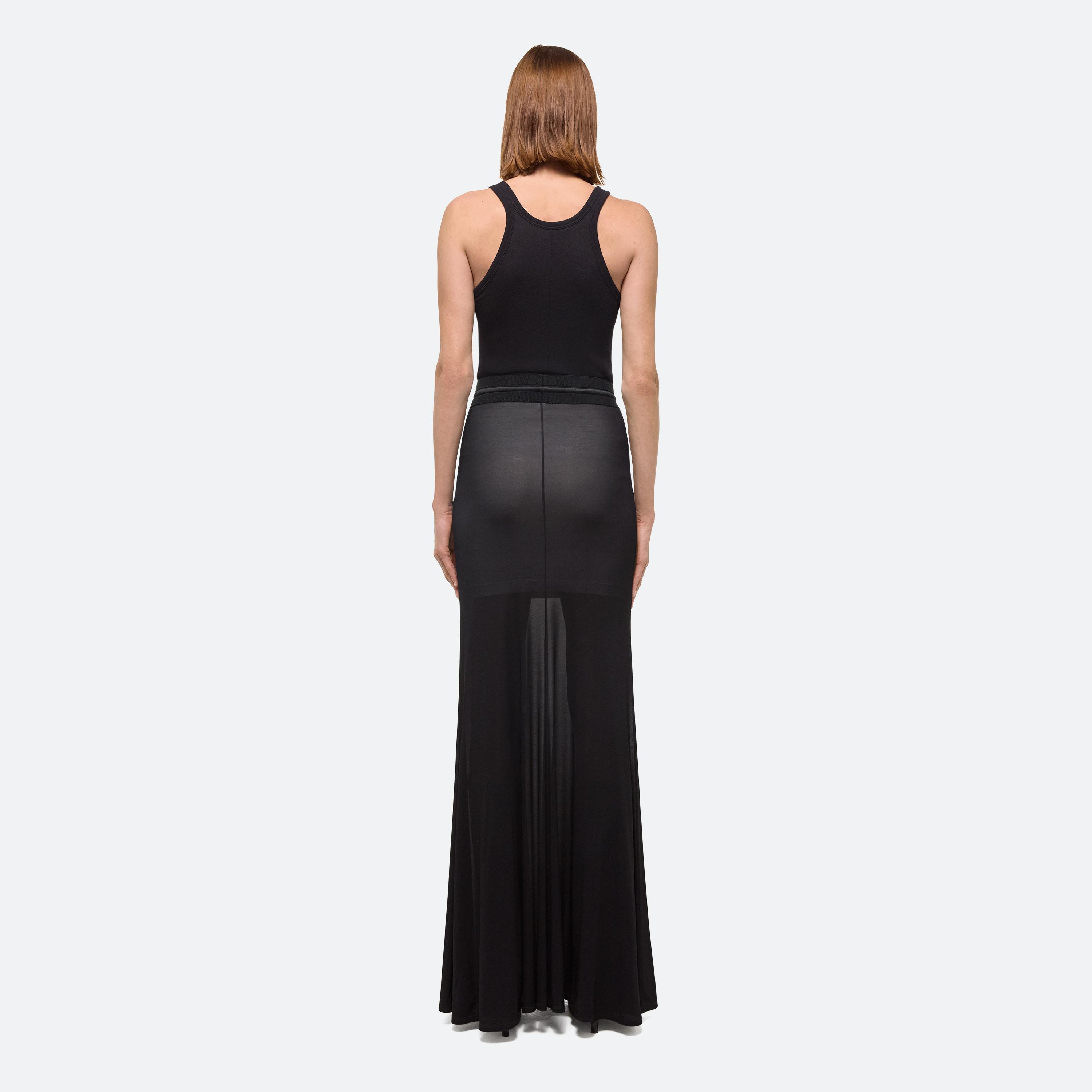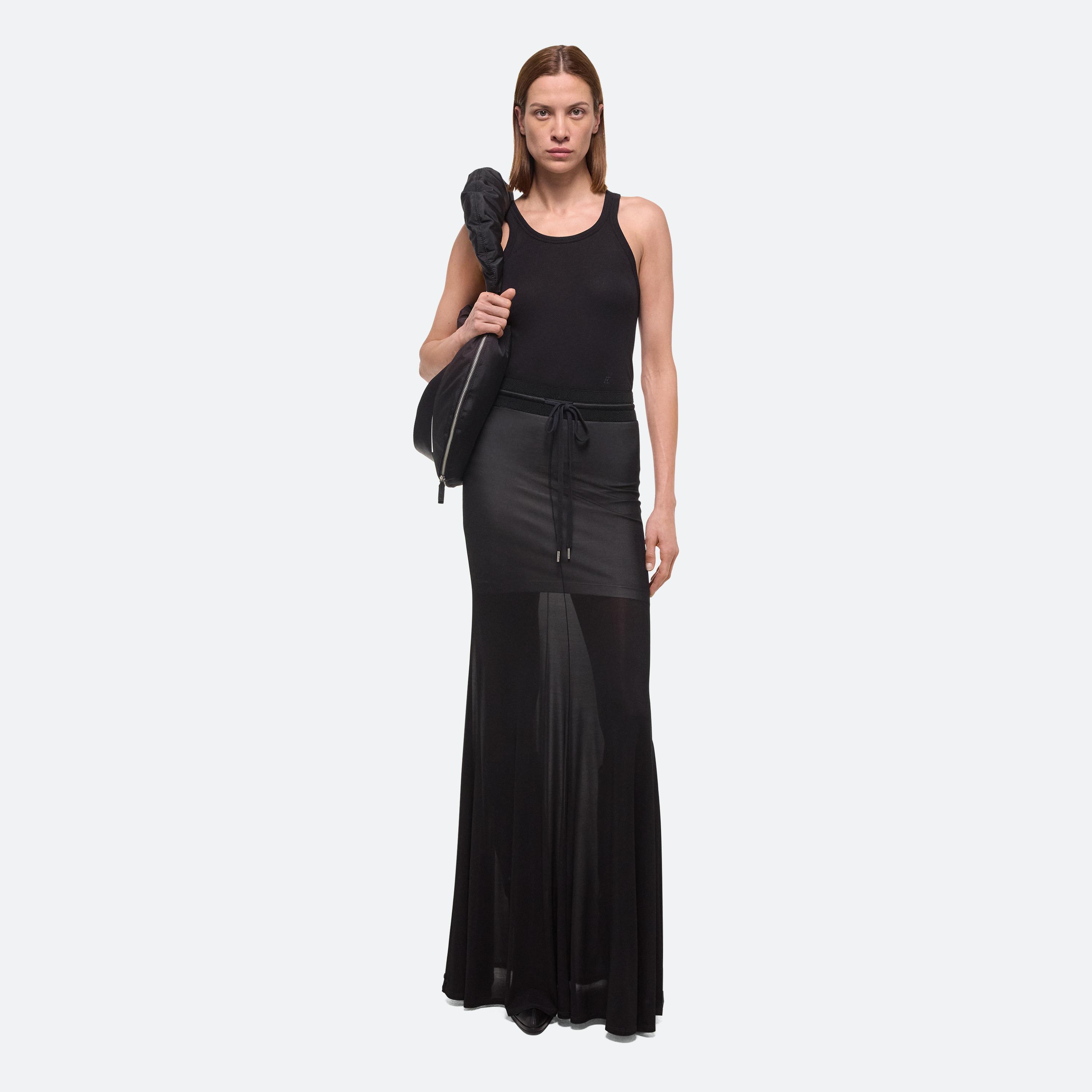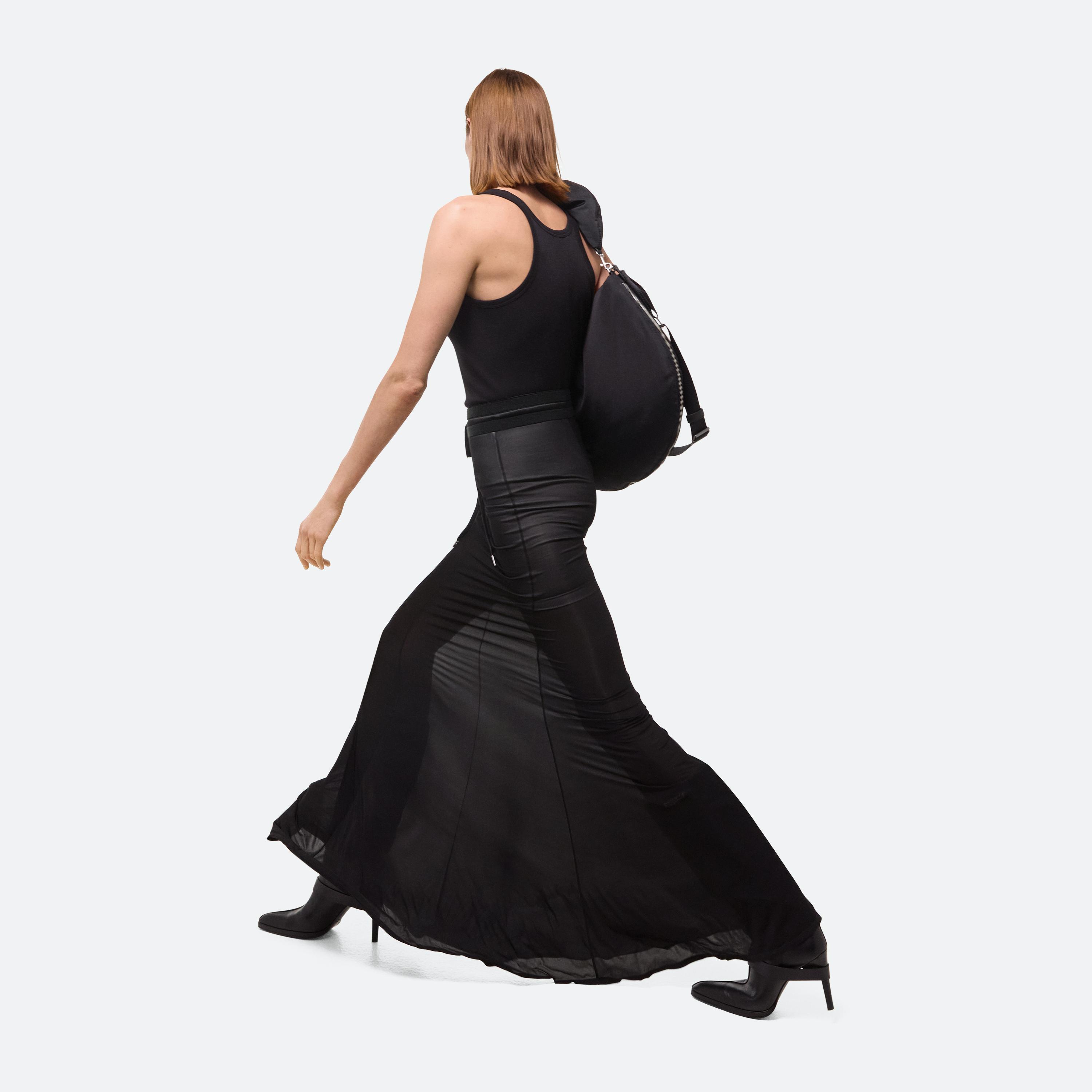 Layered skirt in a sheer hosiery-inspired fabric. Partially lined with a contrasting white jersey mini, creating an ongoing interplay between what is hidden and what can be seen.