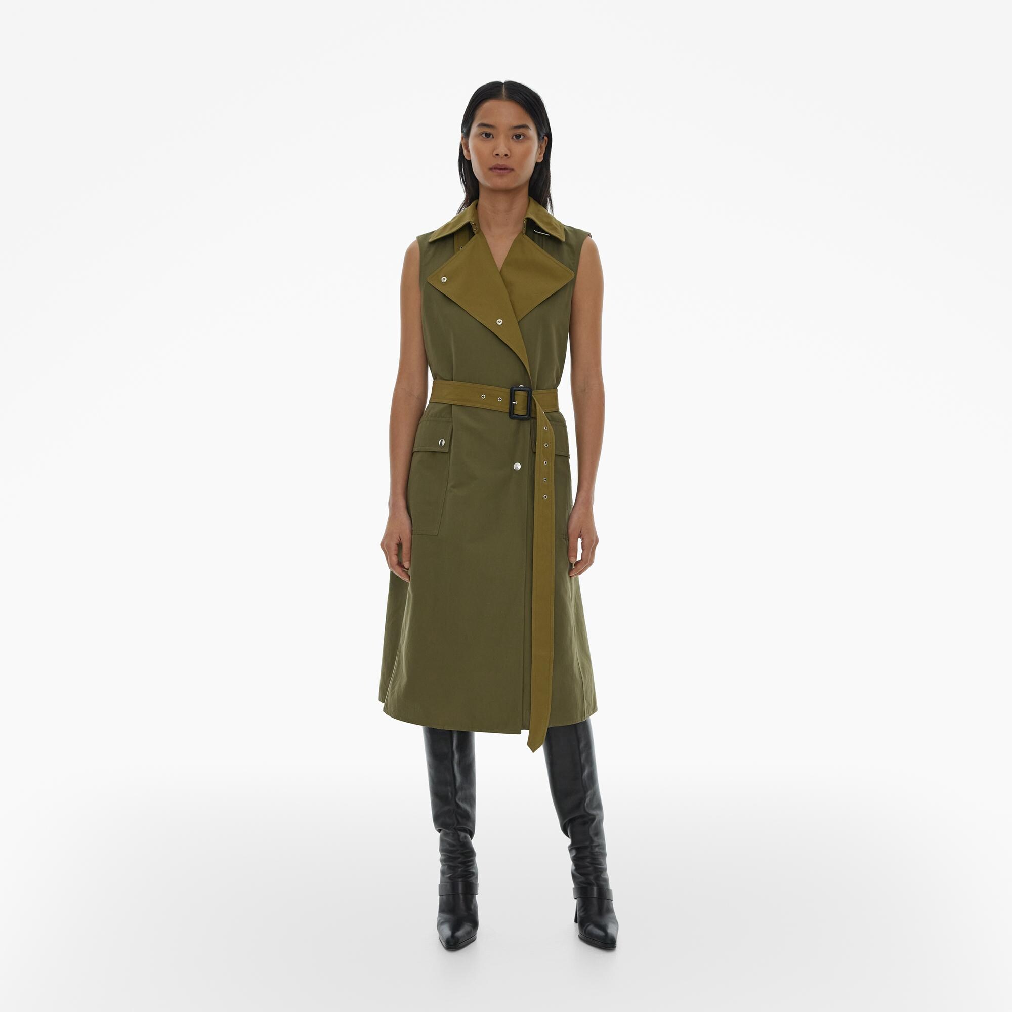 The Helmut Lang Trench Coat is a convertible style in two-tones of cotton-blend faille with an optional cropped jacket, optional longline vest, buckled pointed collar, double-breasted snap closures, flap patch pockets and optional buckle belt.