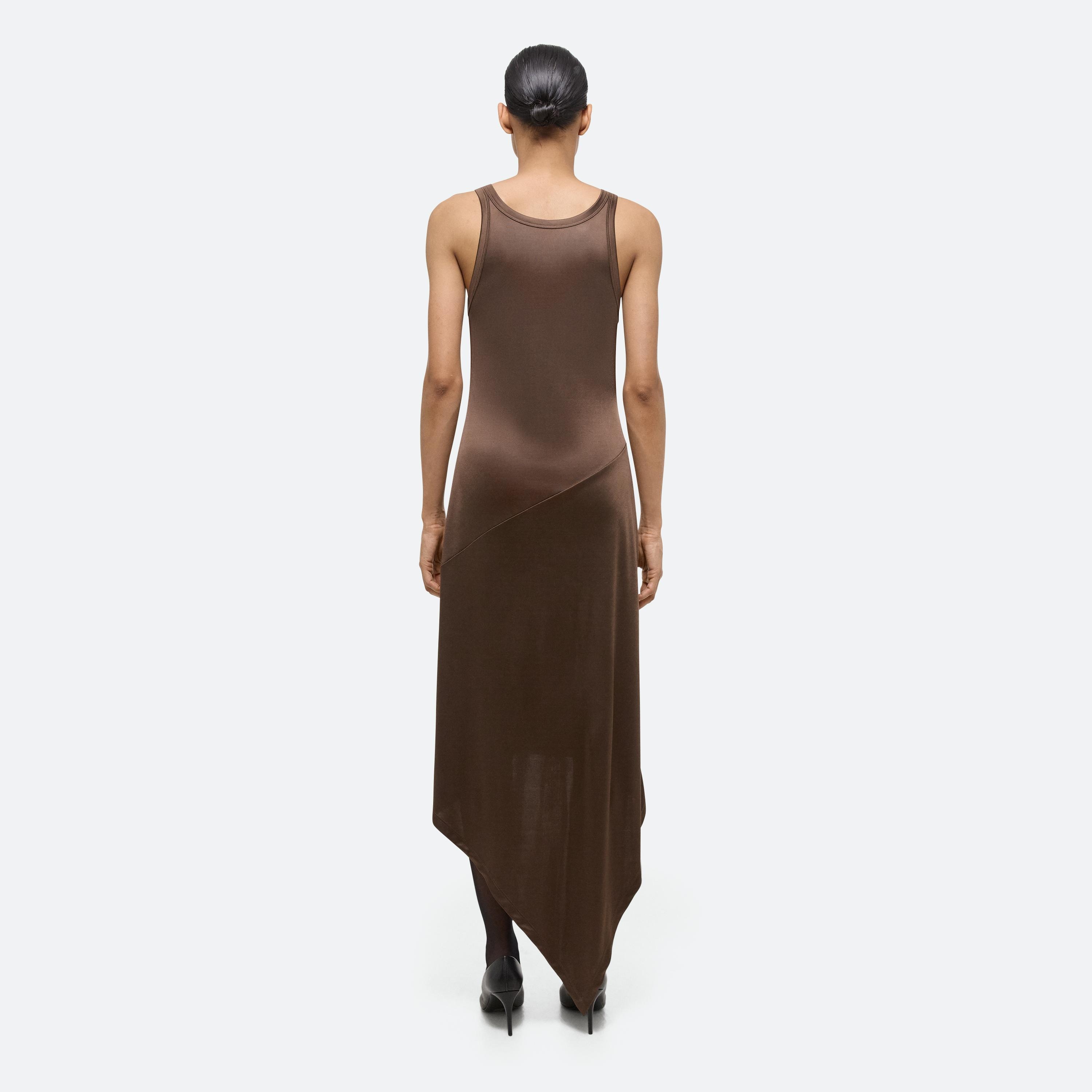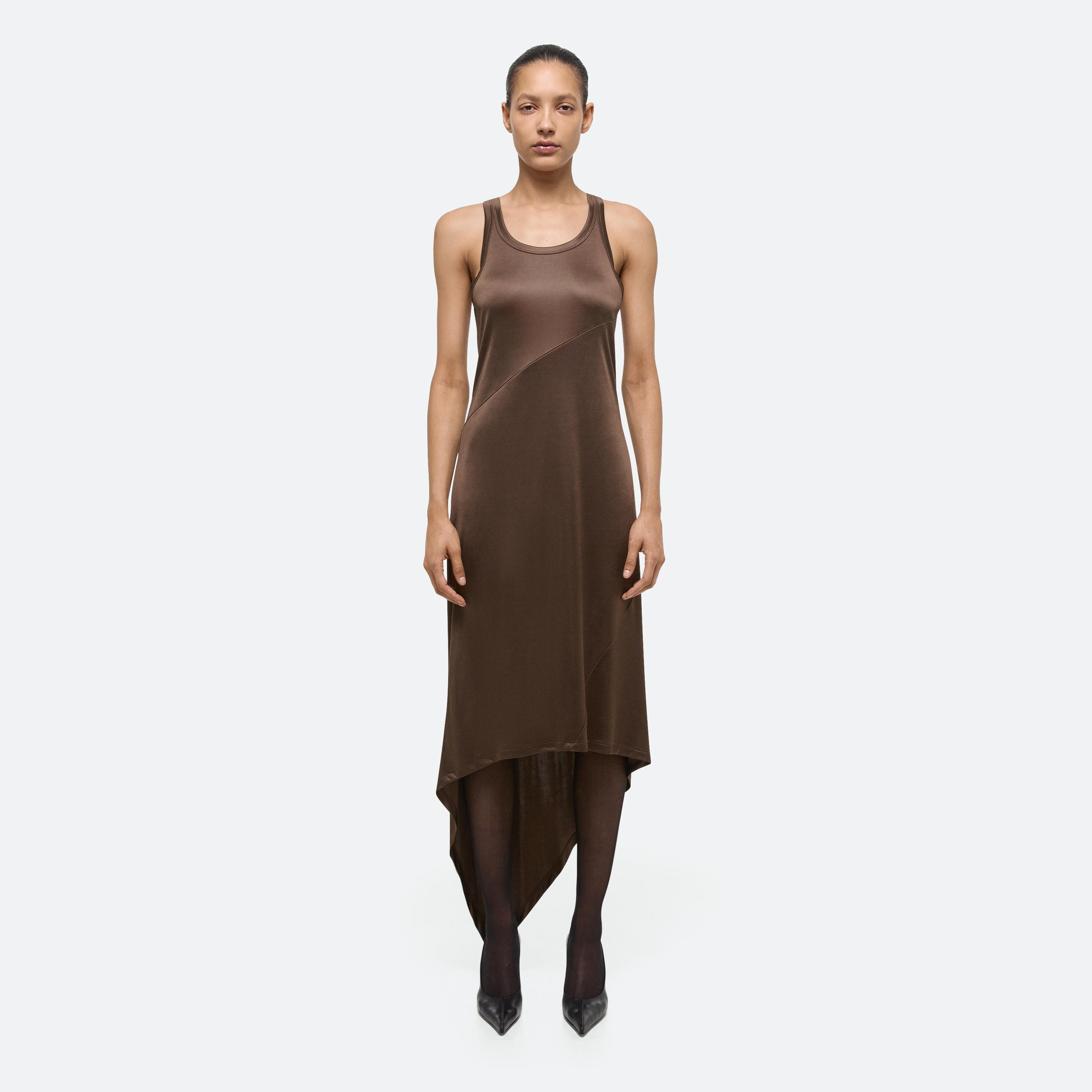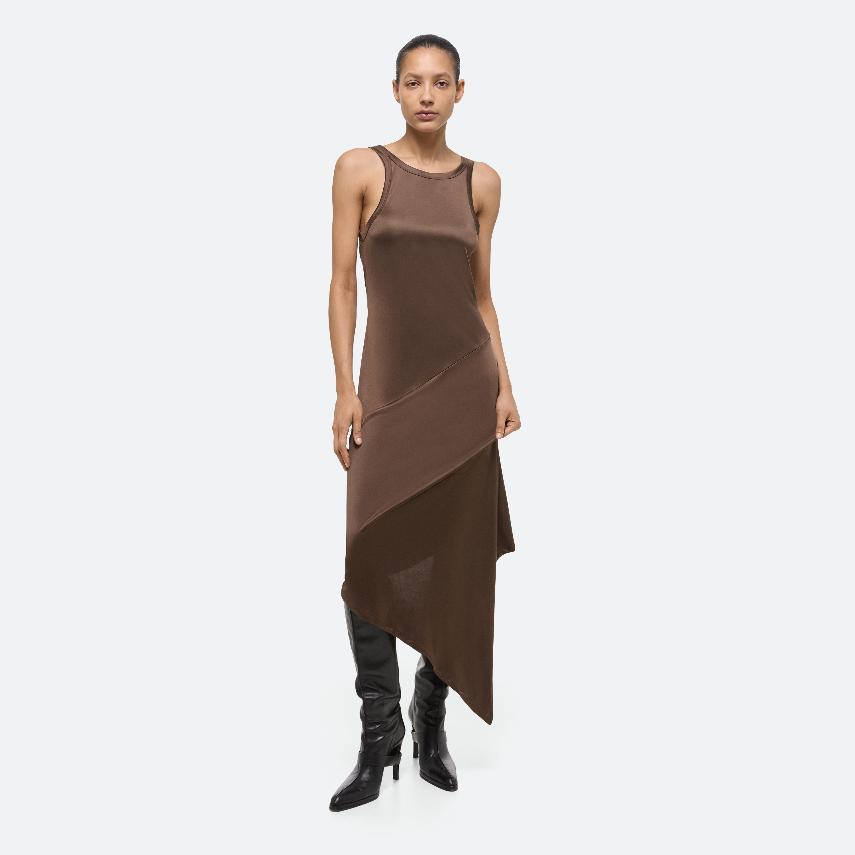 Sleeveless dress in a fluid Italian viscose jersey. Cut to wrap around the body, with a slim fit on top and relaxed cut through the body that flows into a scarf hem.