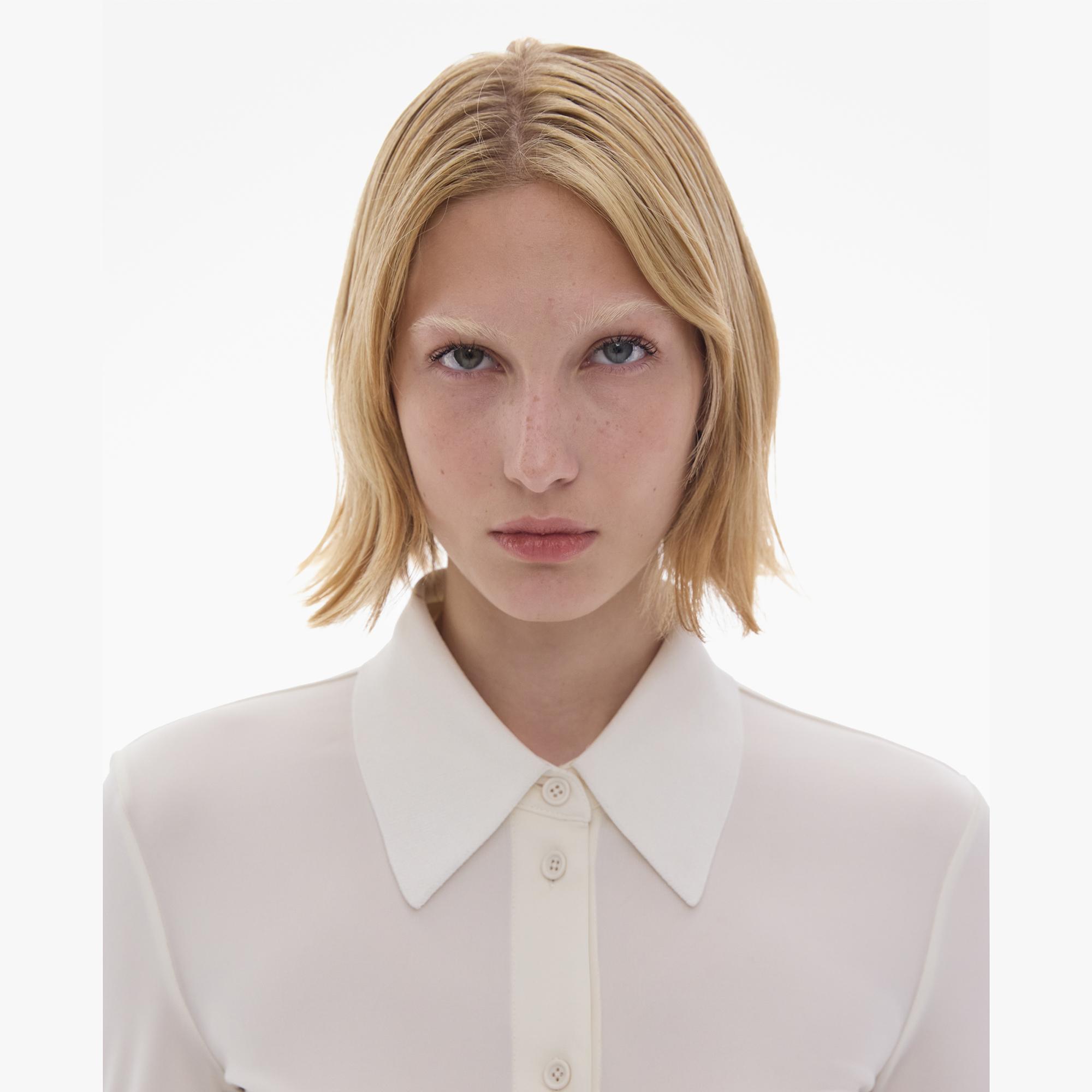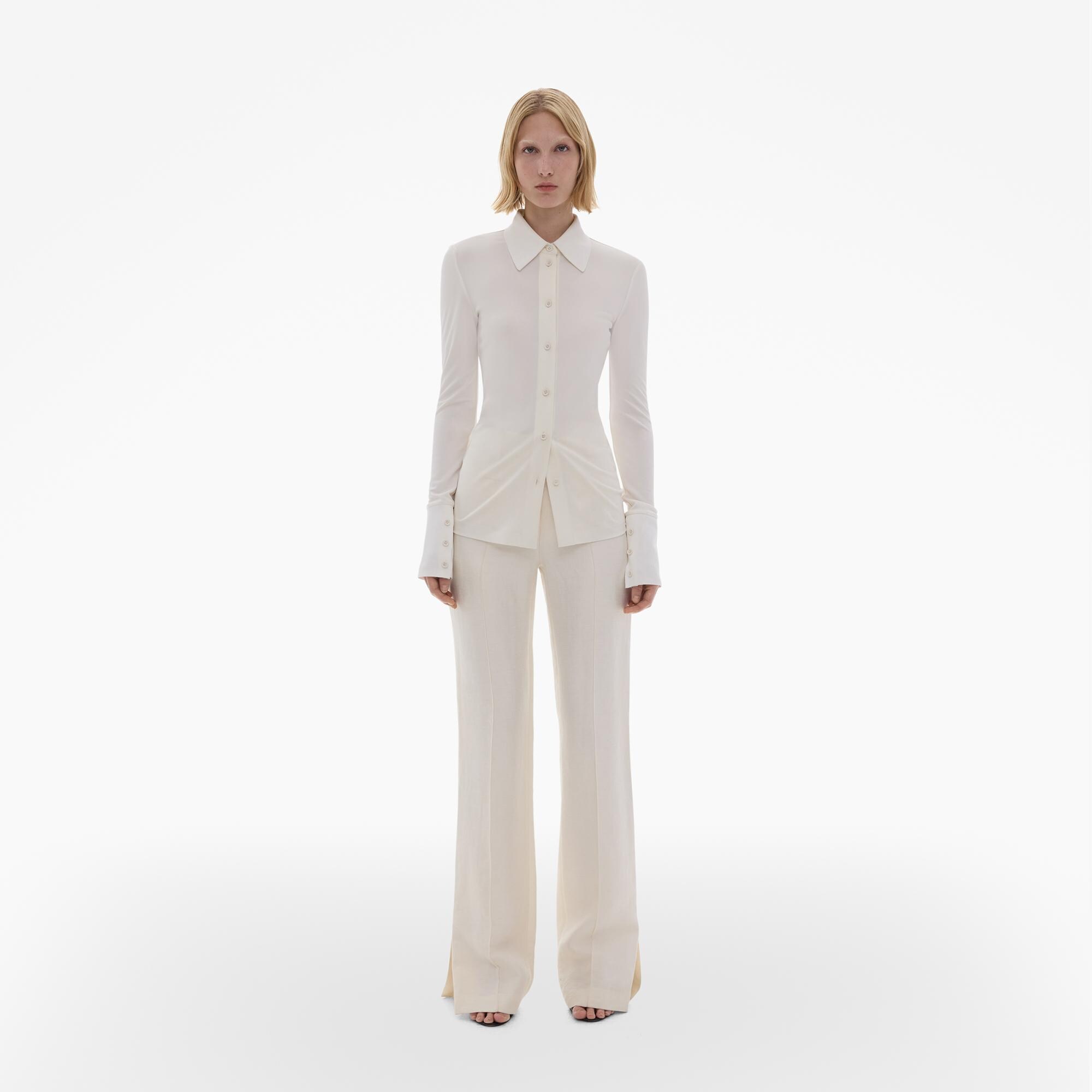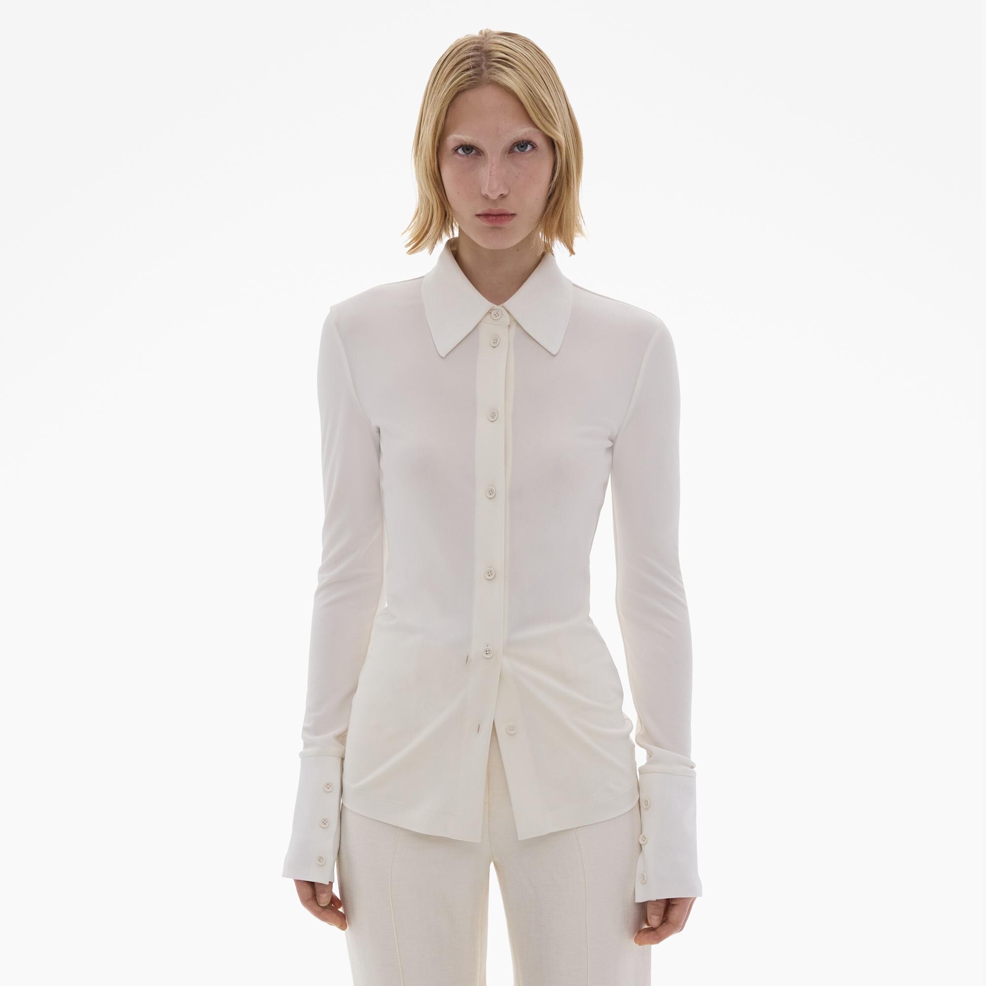 The Helmut Lang Shirt is a slim-fitting style in a lightweight viscose jersey that is detailed with a knit pointed collar and extended button cuffs, long sleeves, and button front closures.