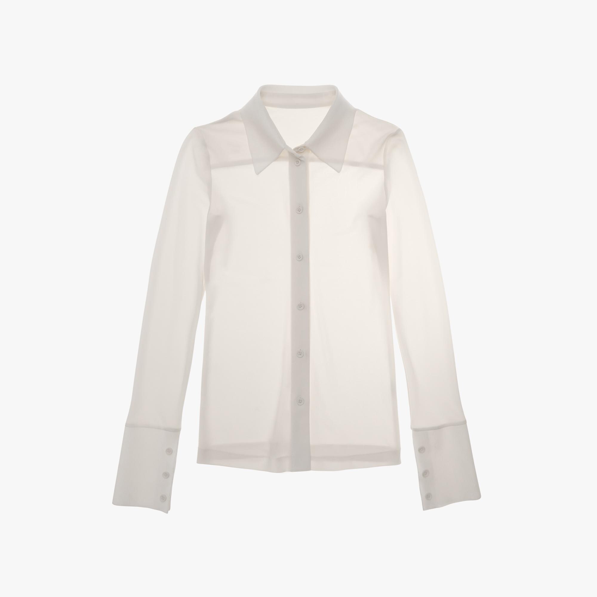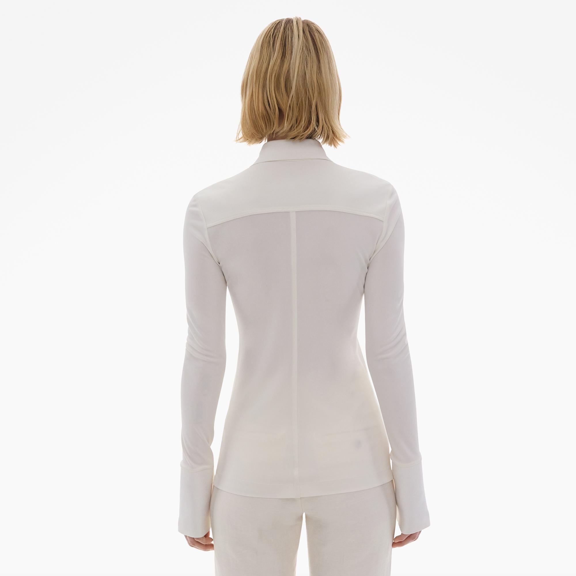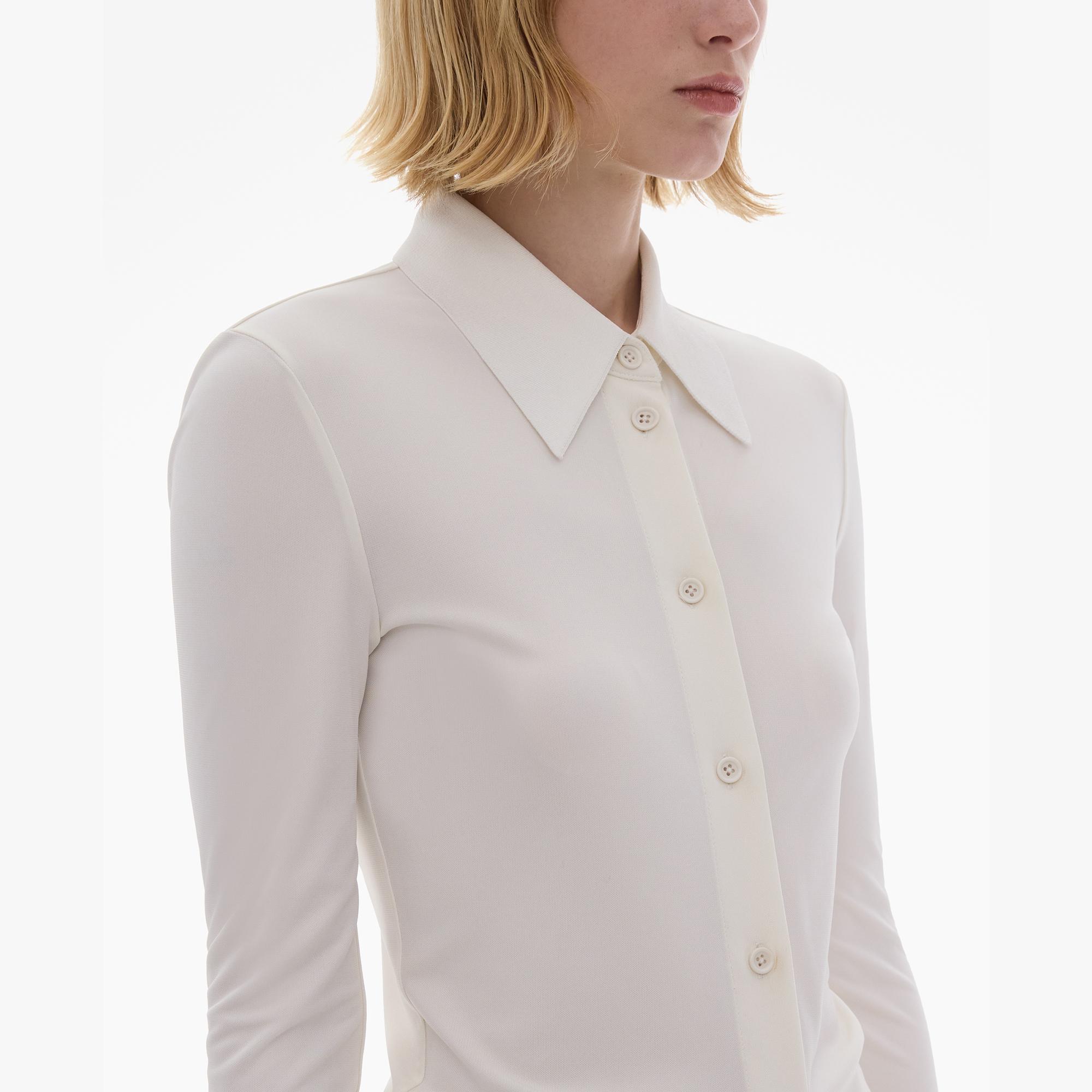 The Helmut Lang Shirt is a slim-fitting style in a lightweight viscose jersey that is detailed with a knit pointed collar and extended button cuffs, long sleeves, and button front closures.