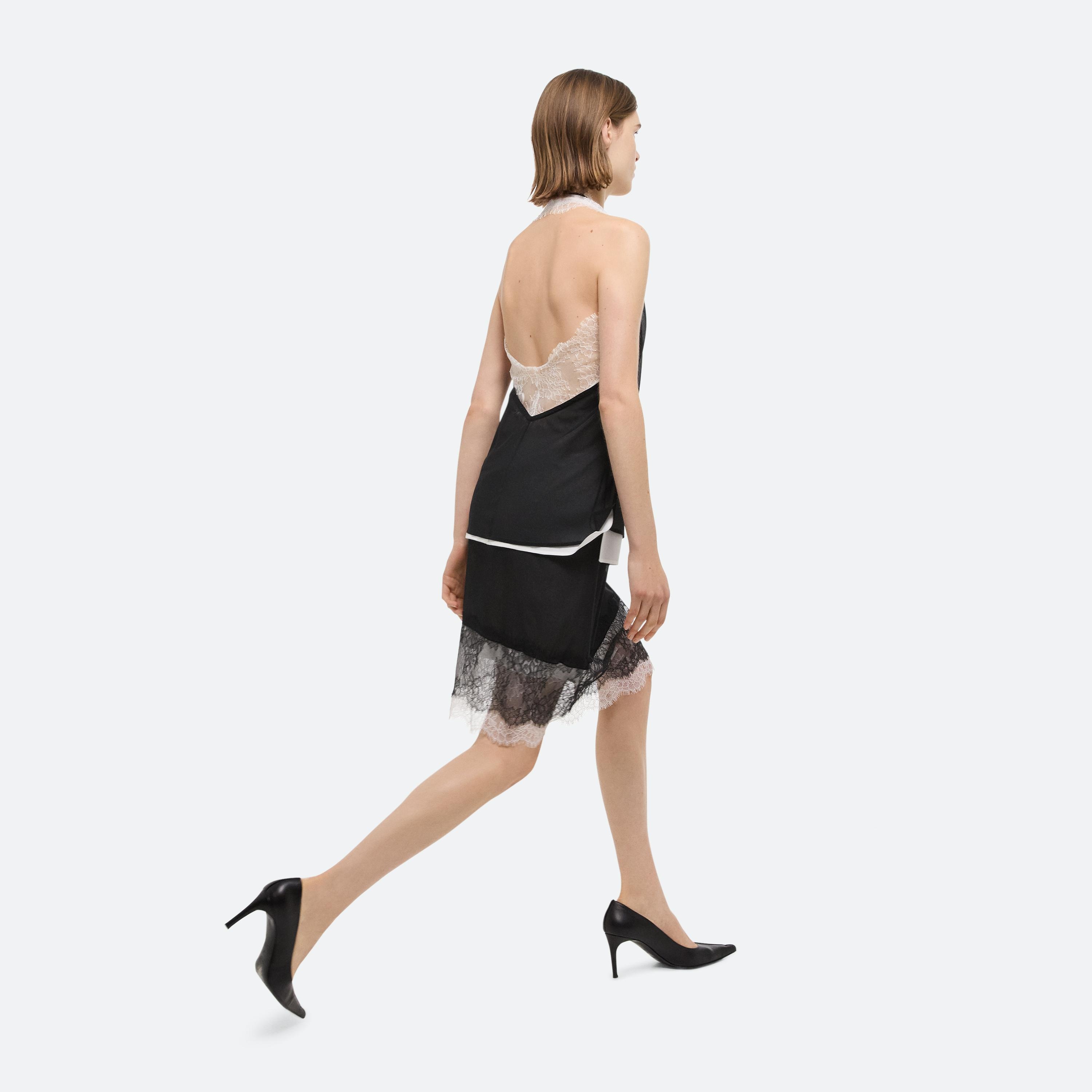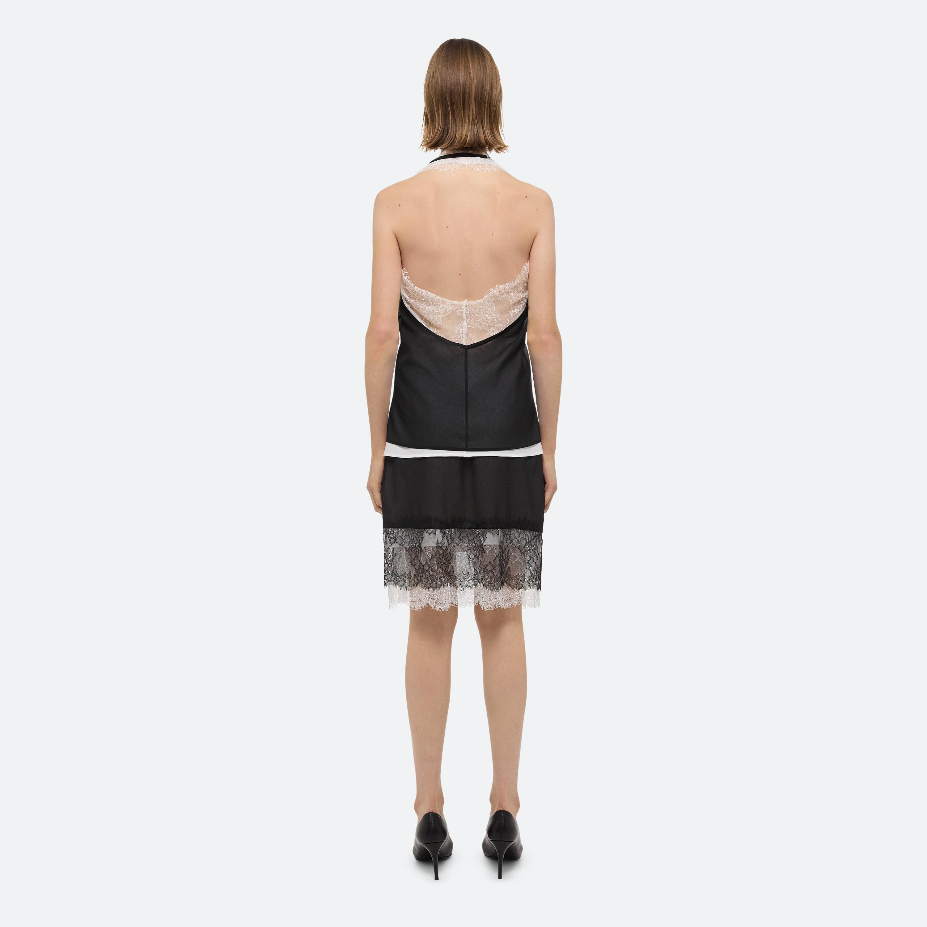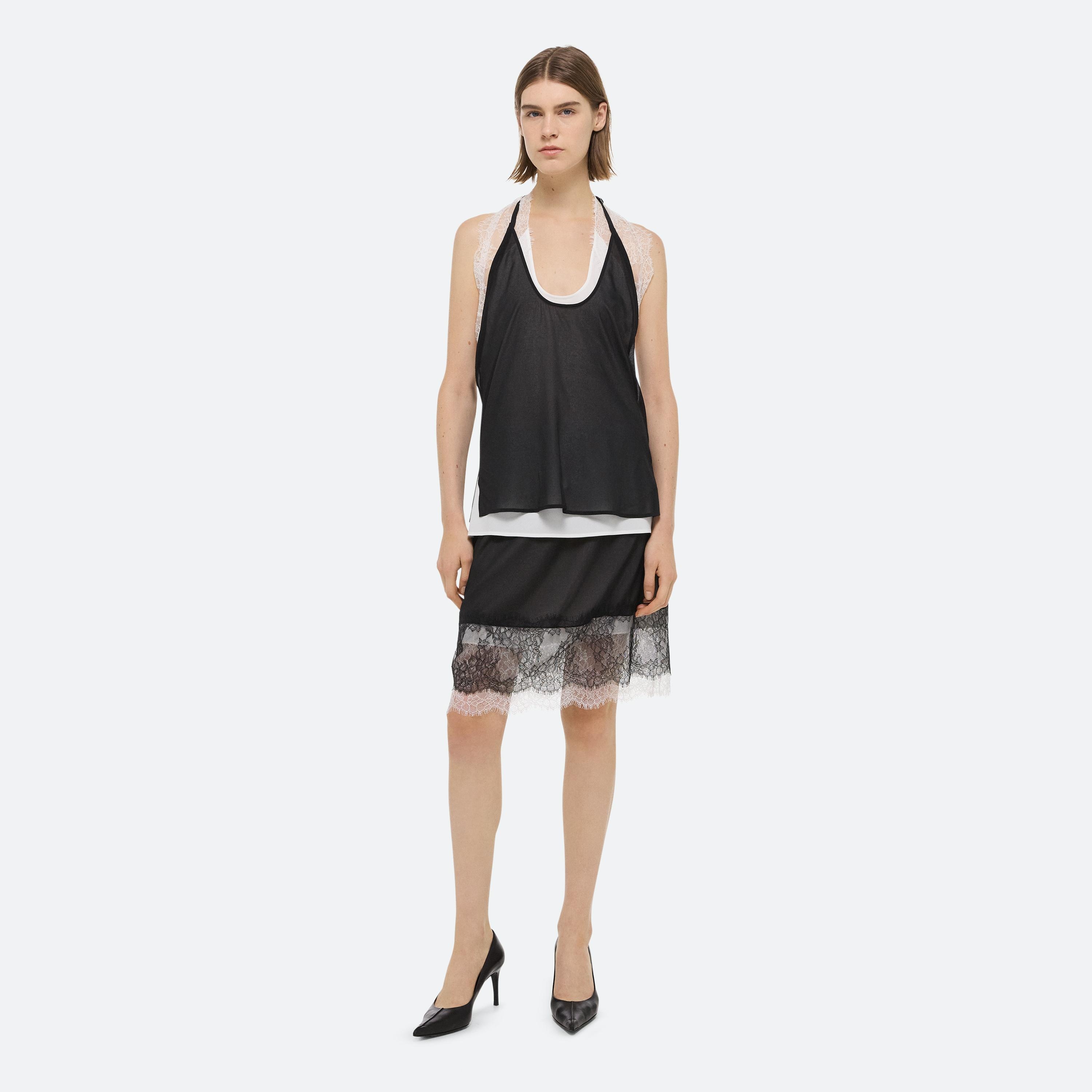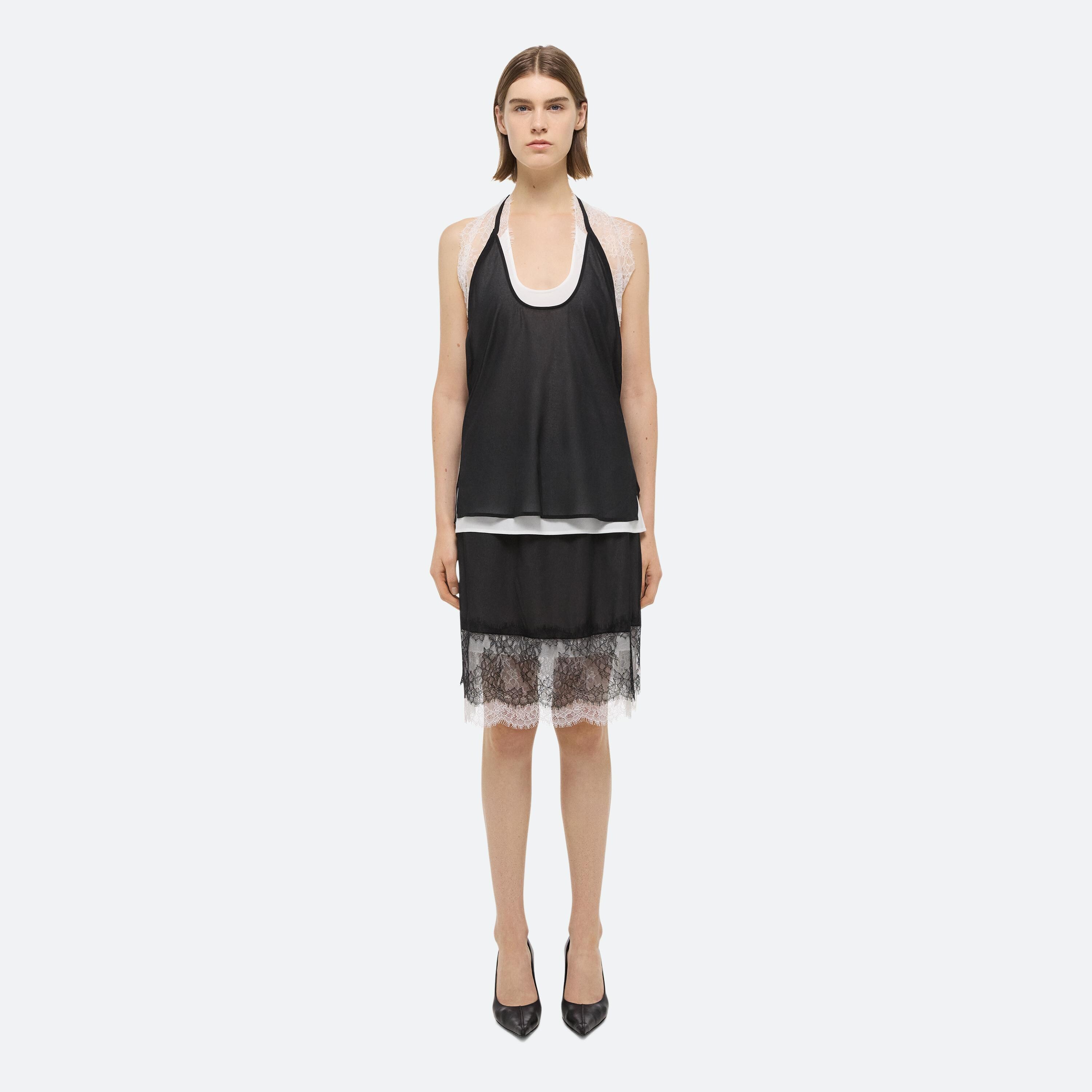 Layered silk skirt with sheer lace panels along the hem.