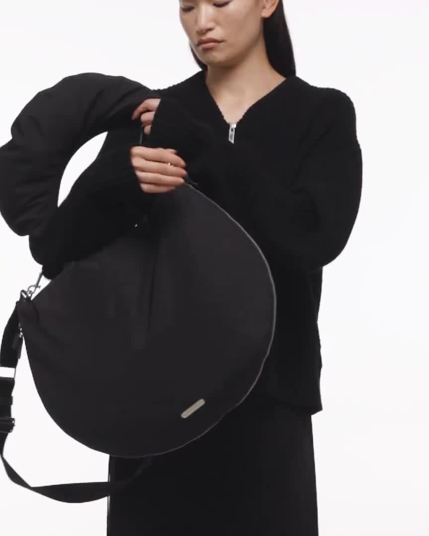 Convertible bag with a sculptural silhouette in a water-resistant nylon. Wear the smaller bag as a shoulder strap, unclip it to use as a neck pillow, and unzip it to use the hidden hood for protection from the elements.