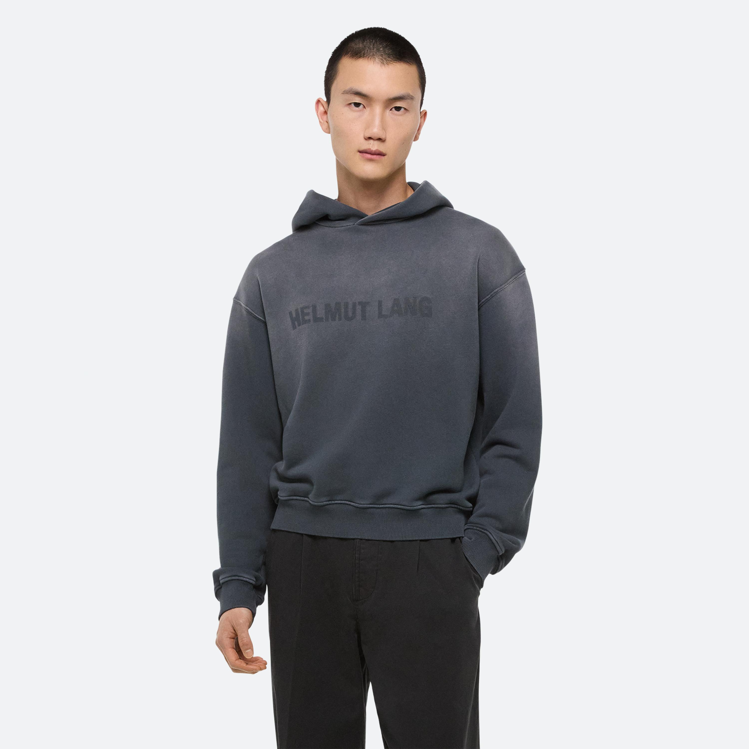 Hooded sweatshirt with laser-distressed logo detail on front. Finished with a garment dye process for a subtle ombre wash and vintage feel.