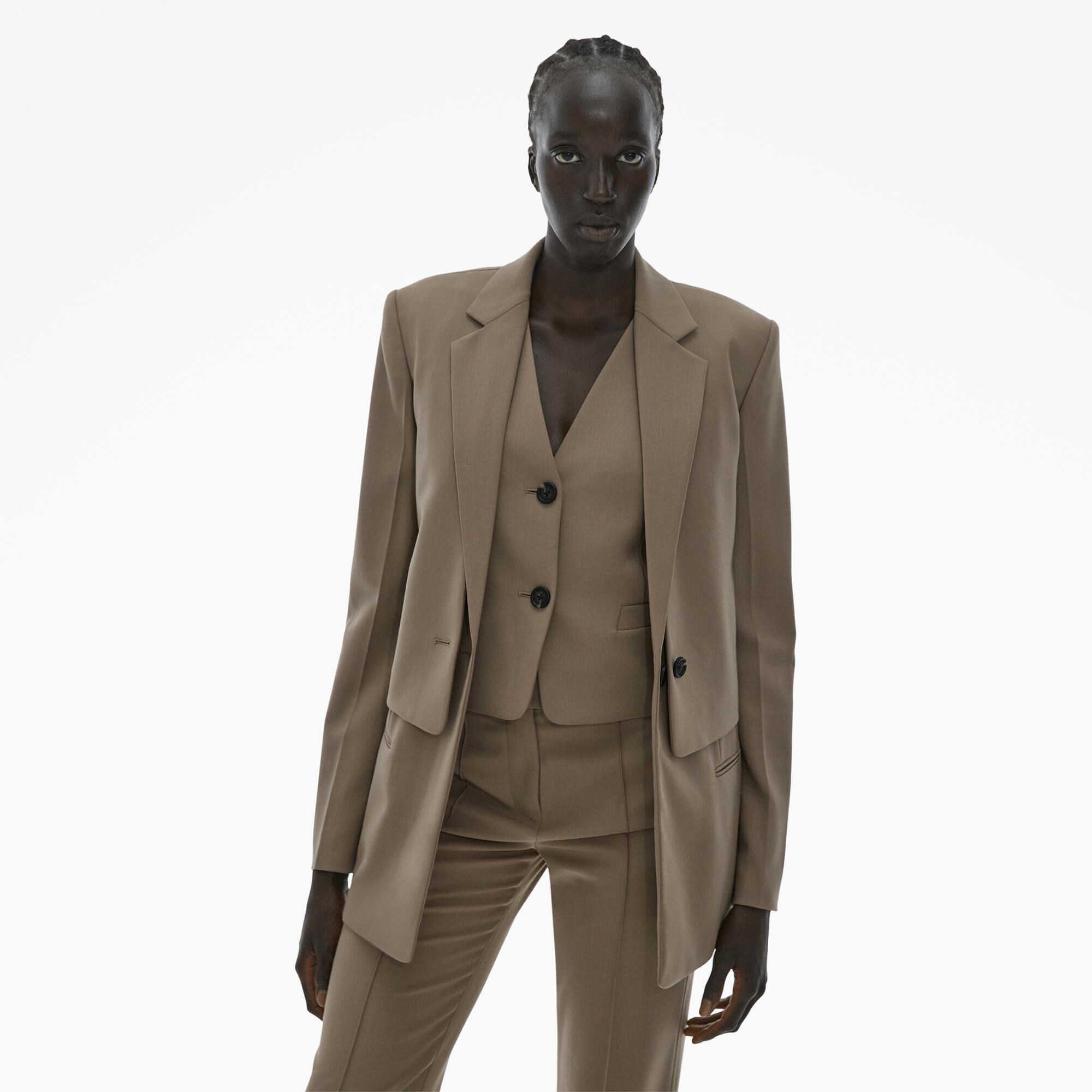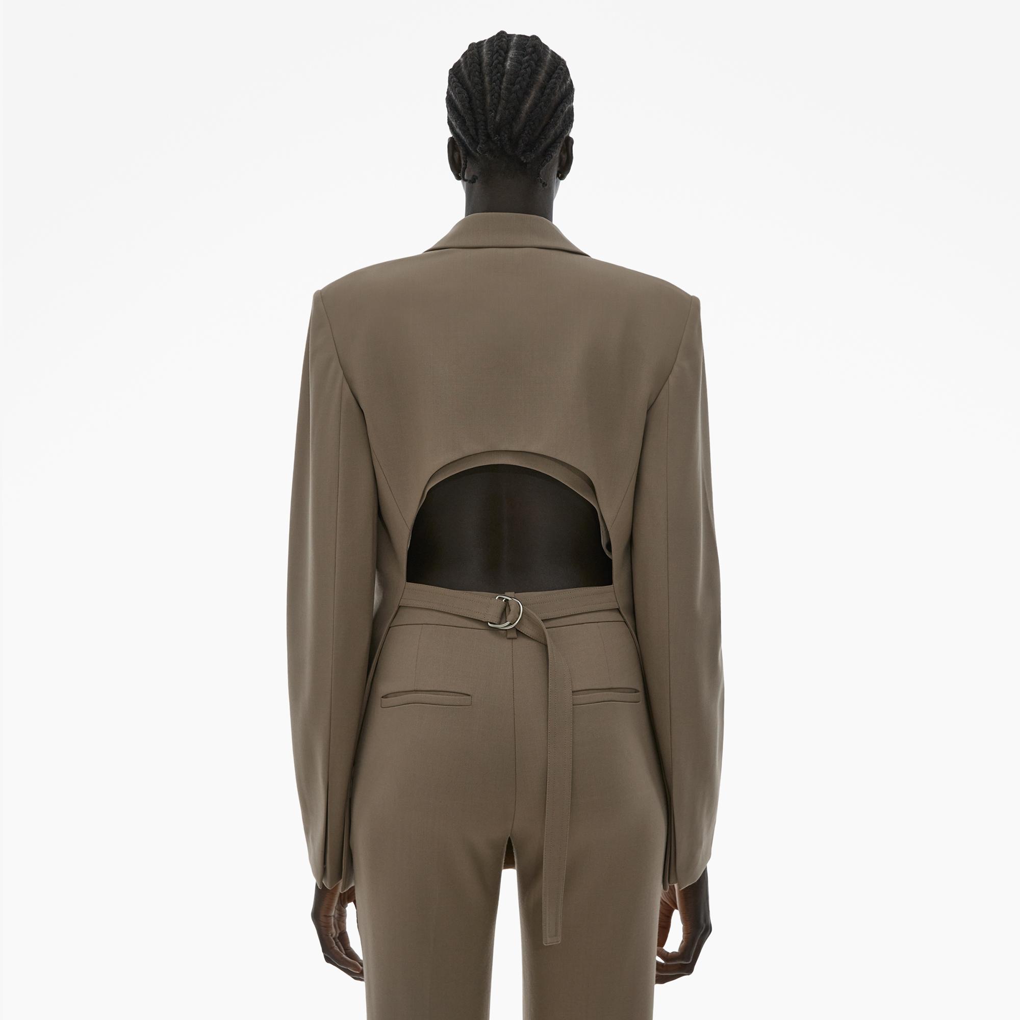 The Helmut Lang Layered Blazer is a tailored style in a stretch wool blend with notched lapels, layered front, single-button closure, and cut-out back.