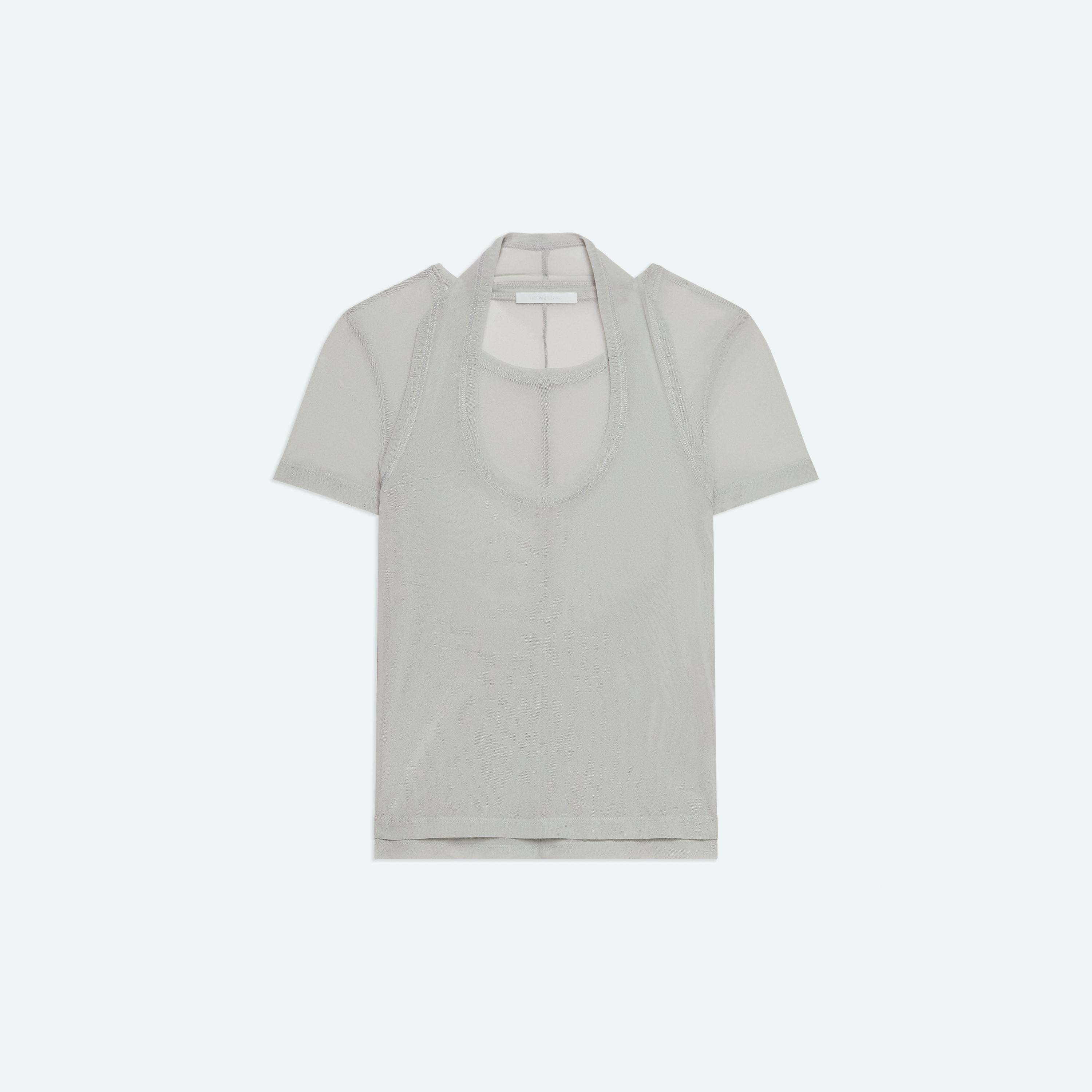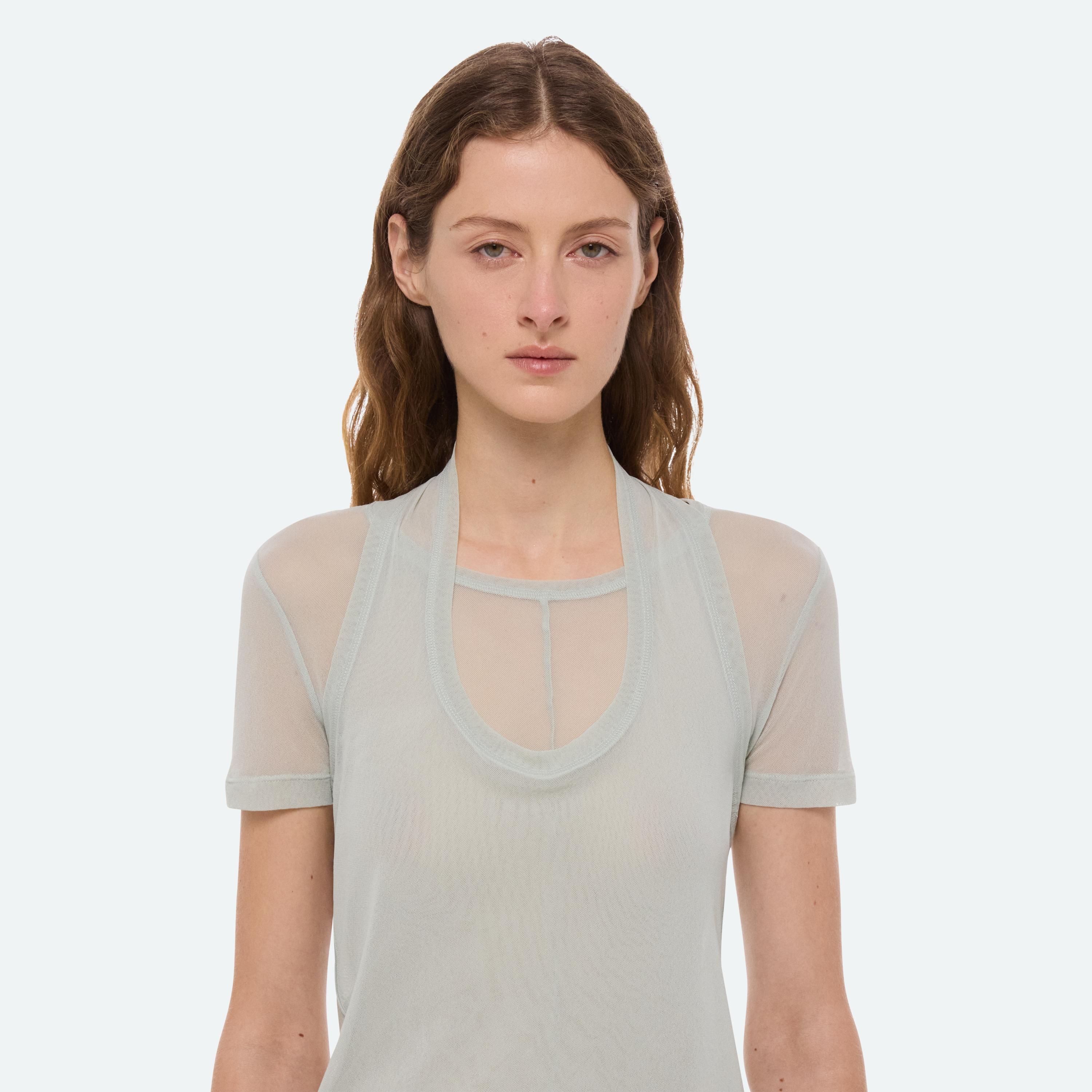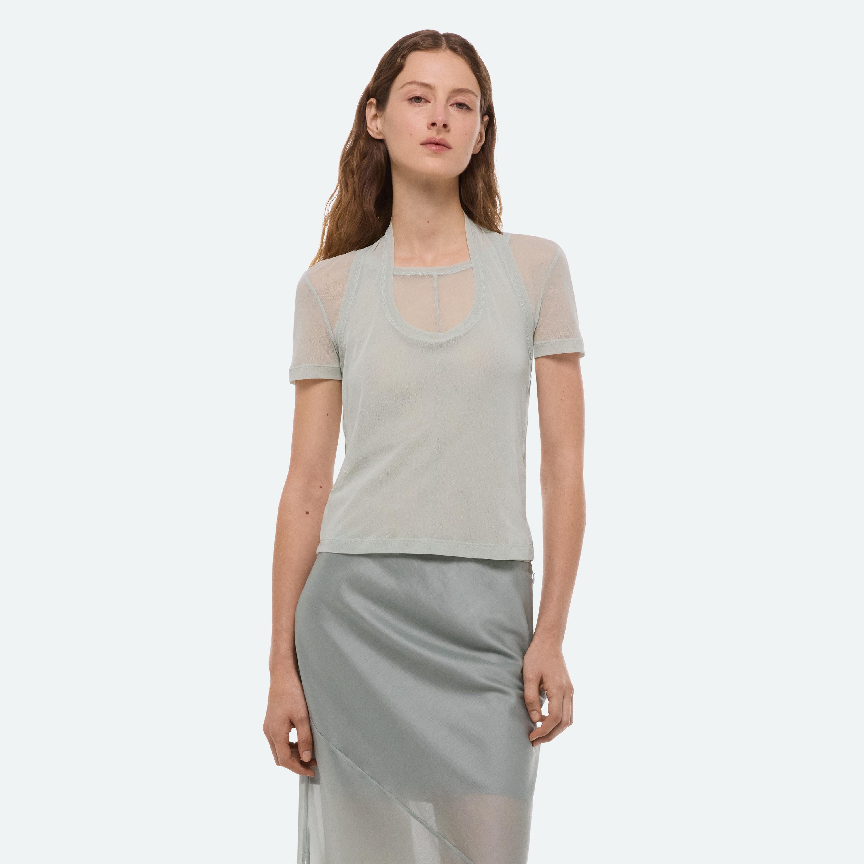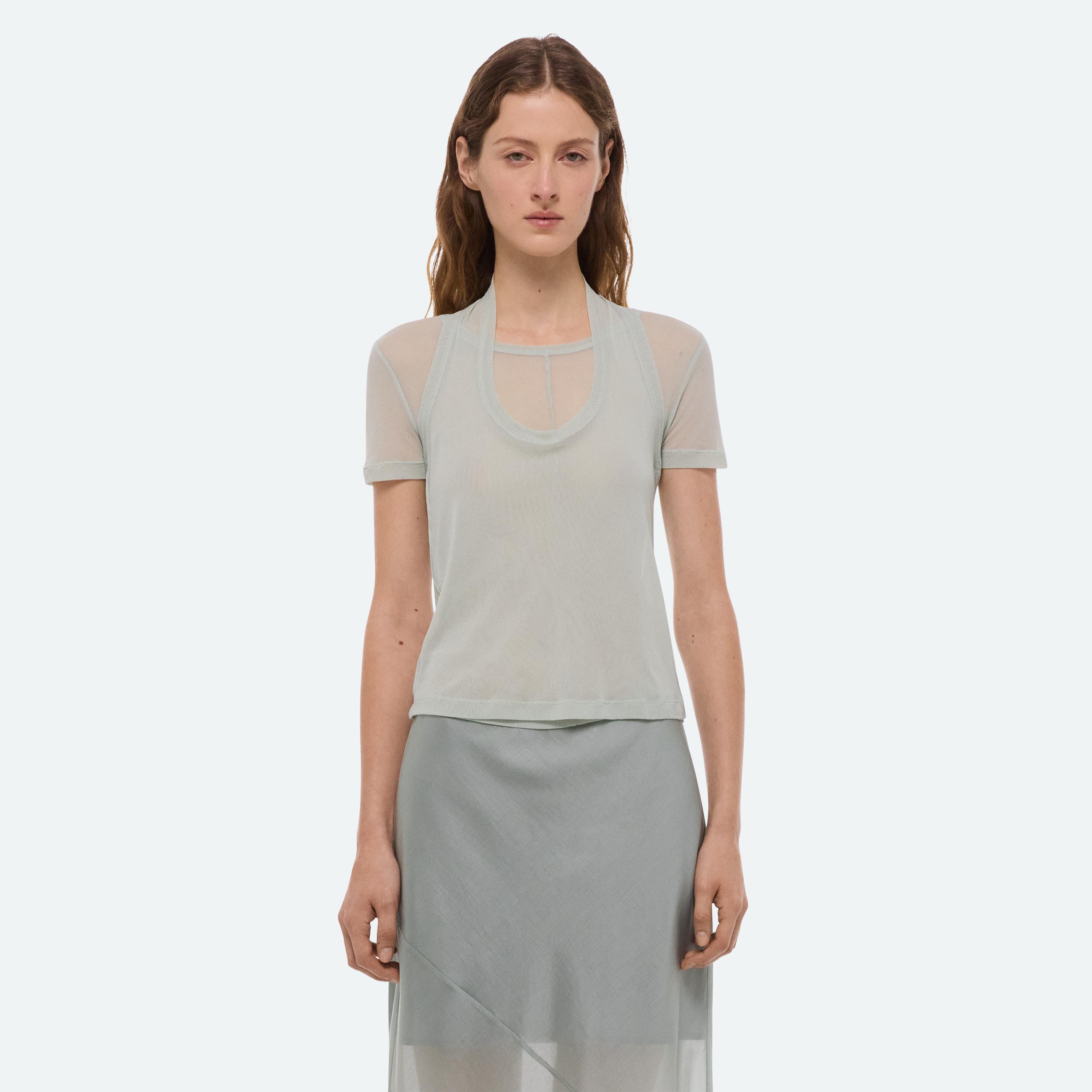 A sheer halterneck layered over a fitted mesh baby tee. Wear each piece on its own, or together for a look with contrasting sheer and opaque elements.