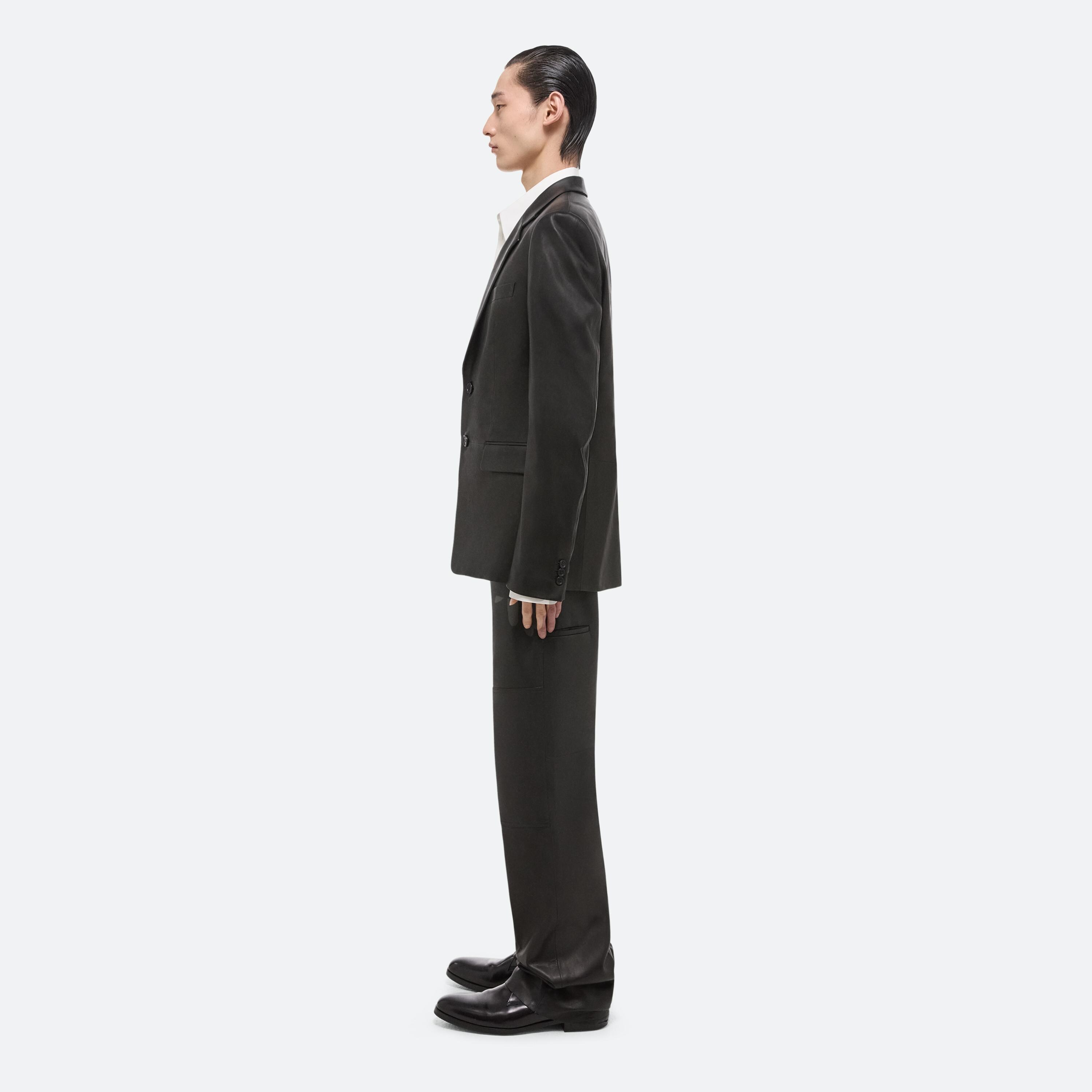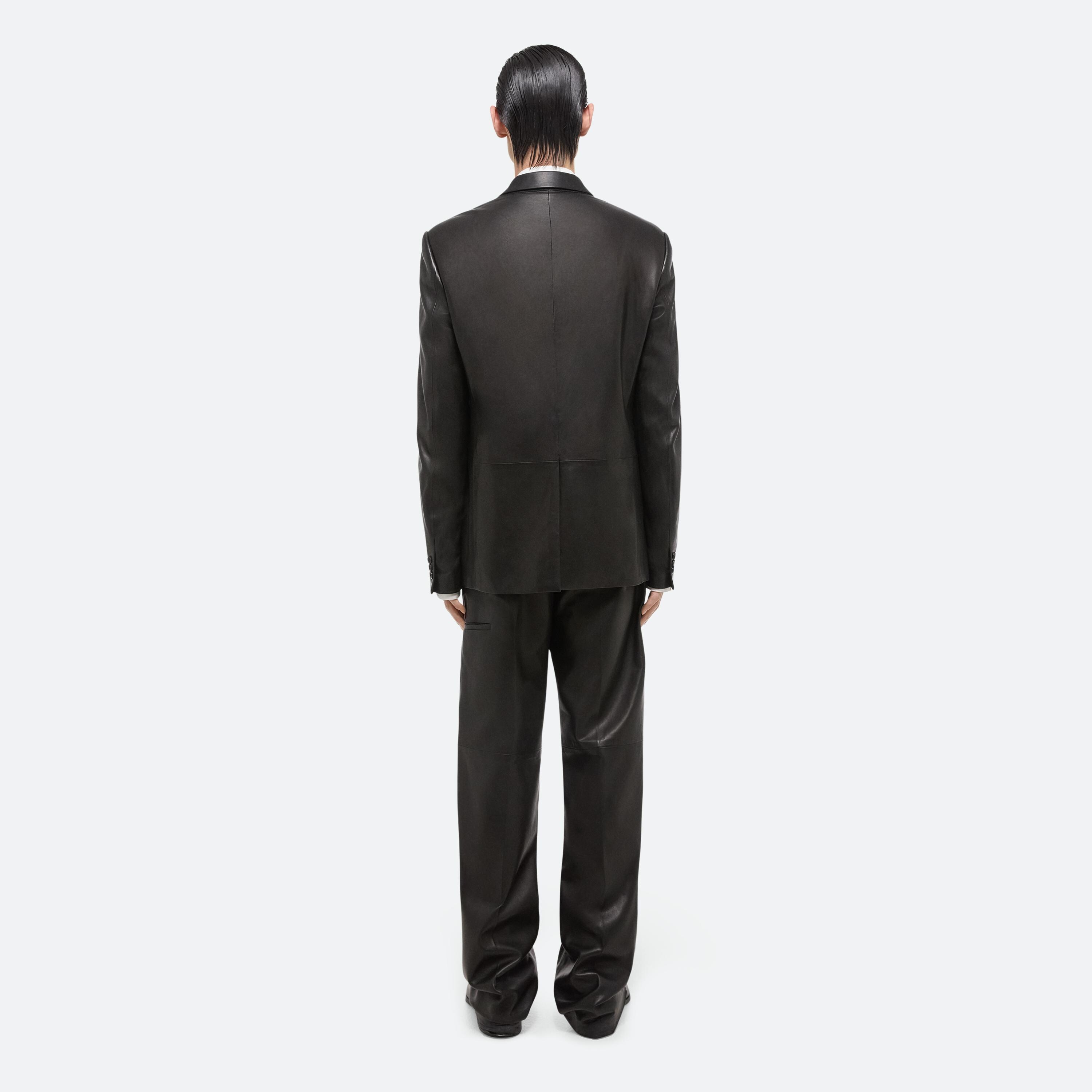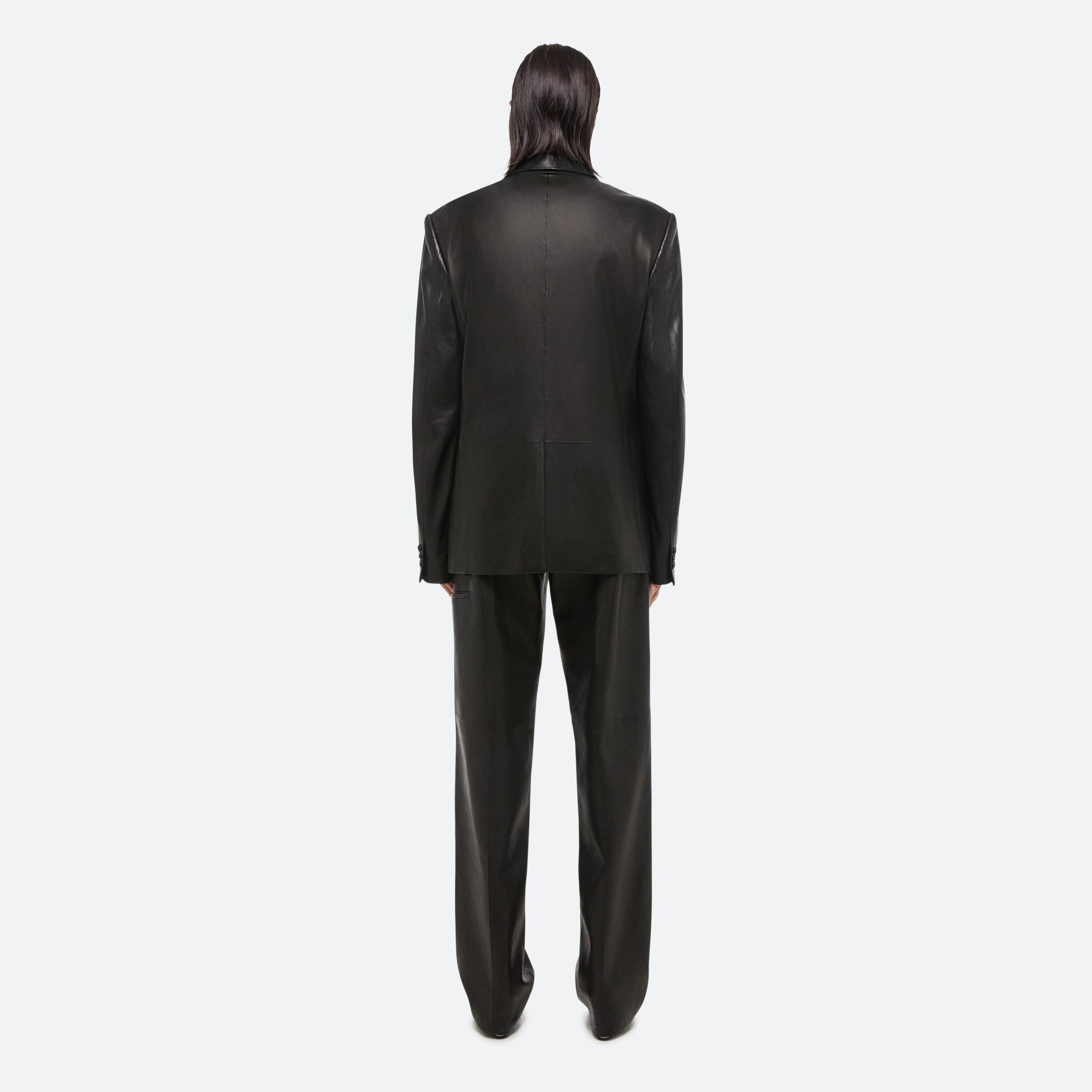 Tailored unisex peak lapel blazer in thick nappa leather. This garment was designed with many body types and gender expressions in mind.