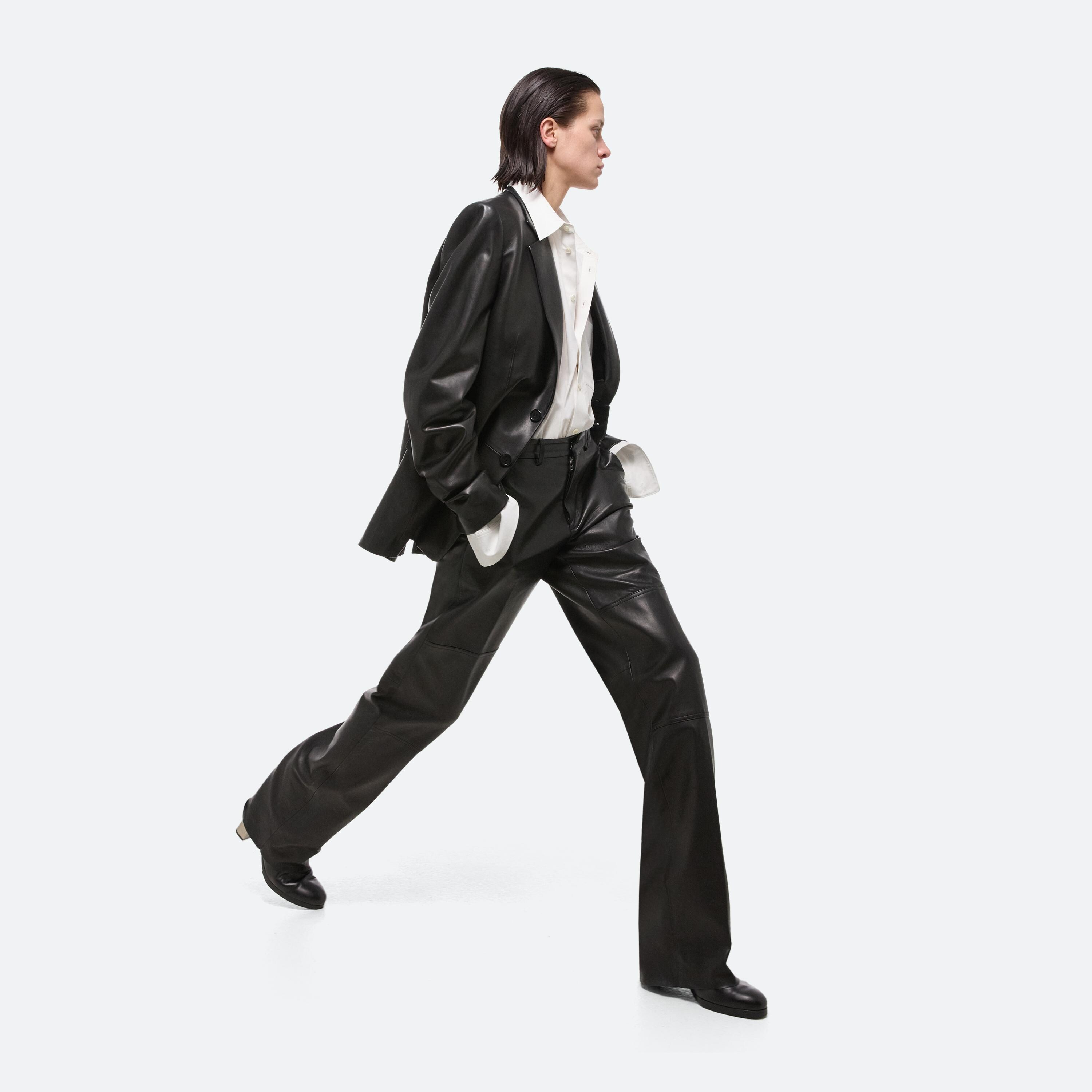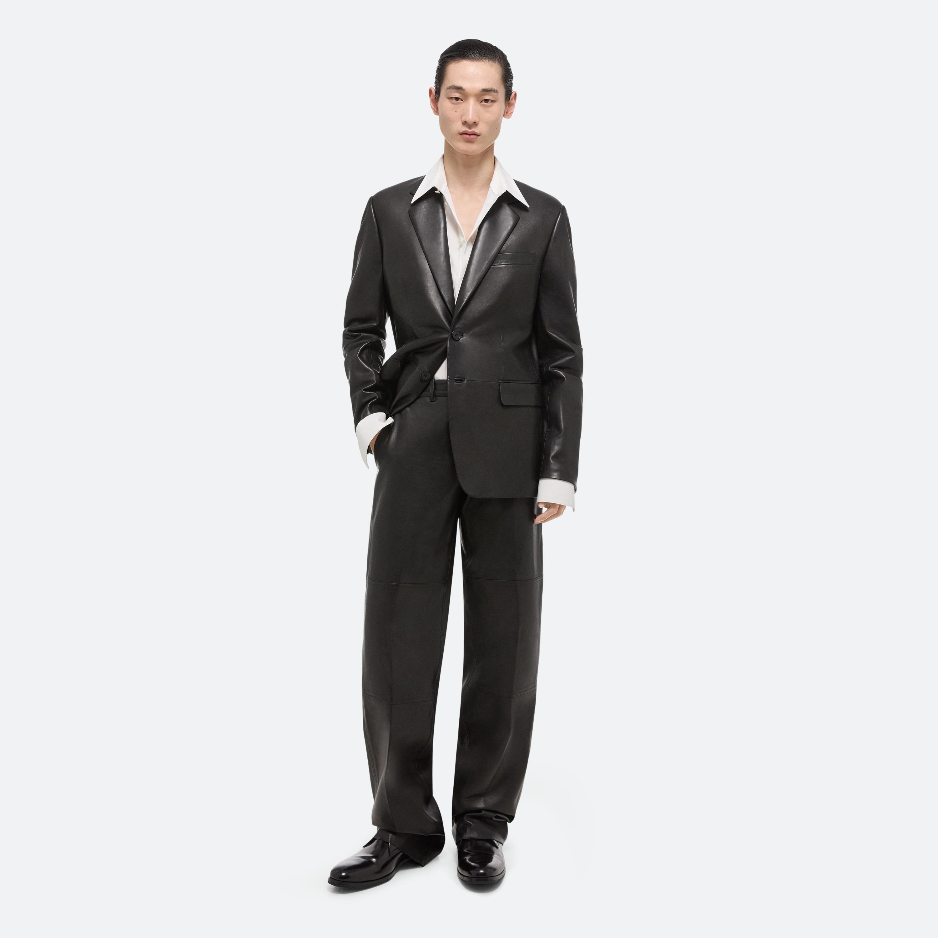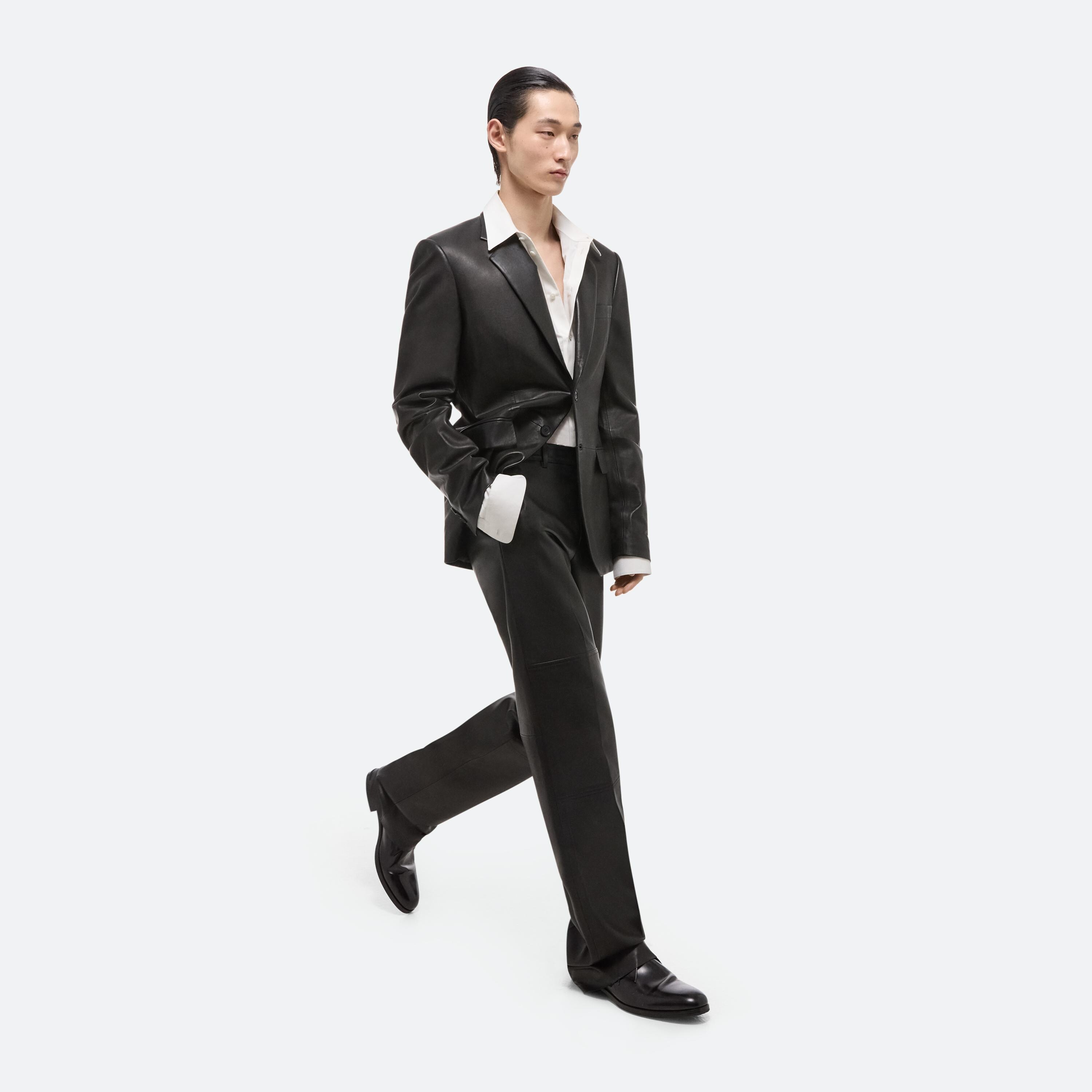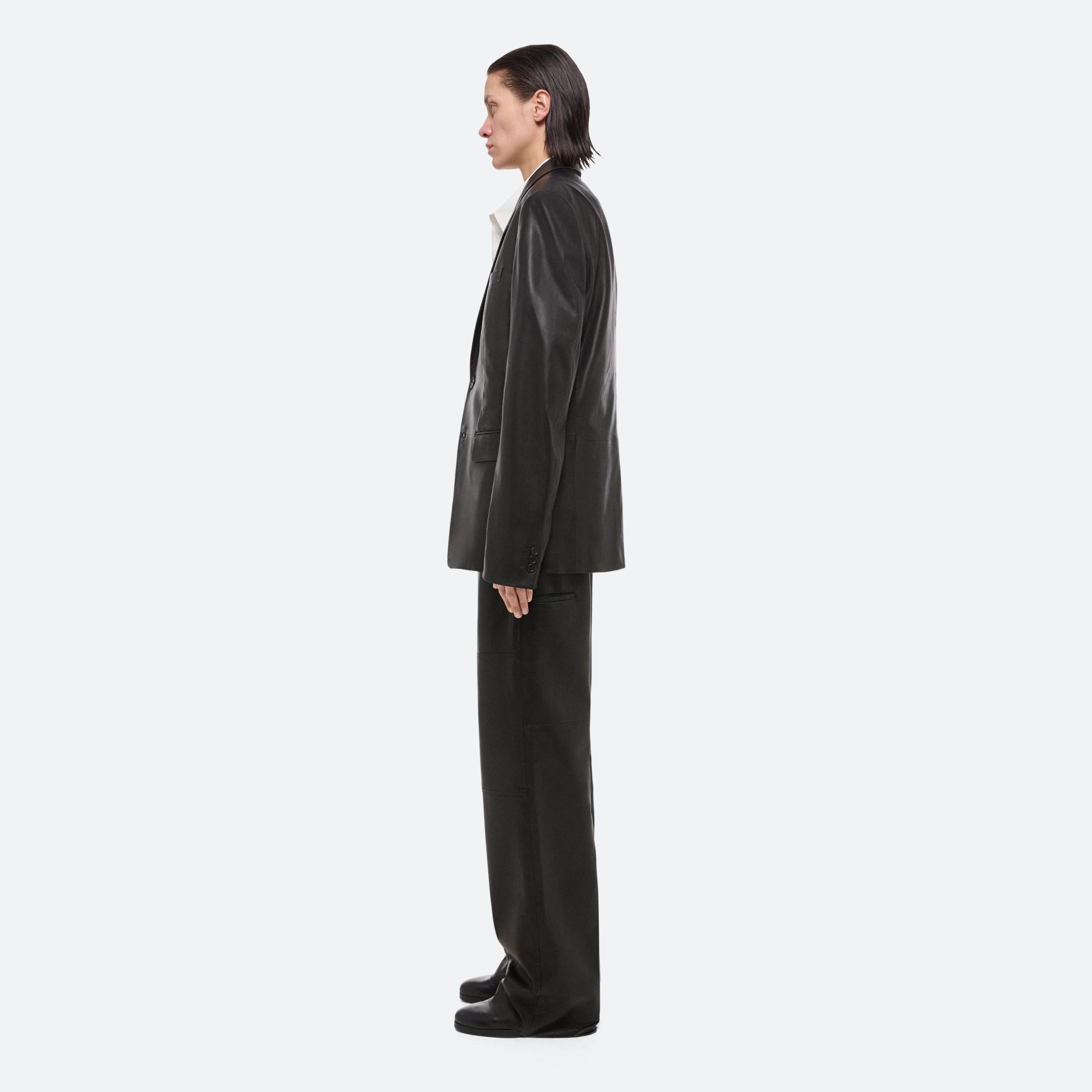 Tailored unisex peak lapel blazer in thick nappa leather. This garment was designed with many body types and gender expressions in mind.