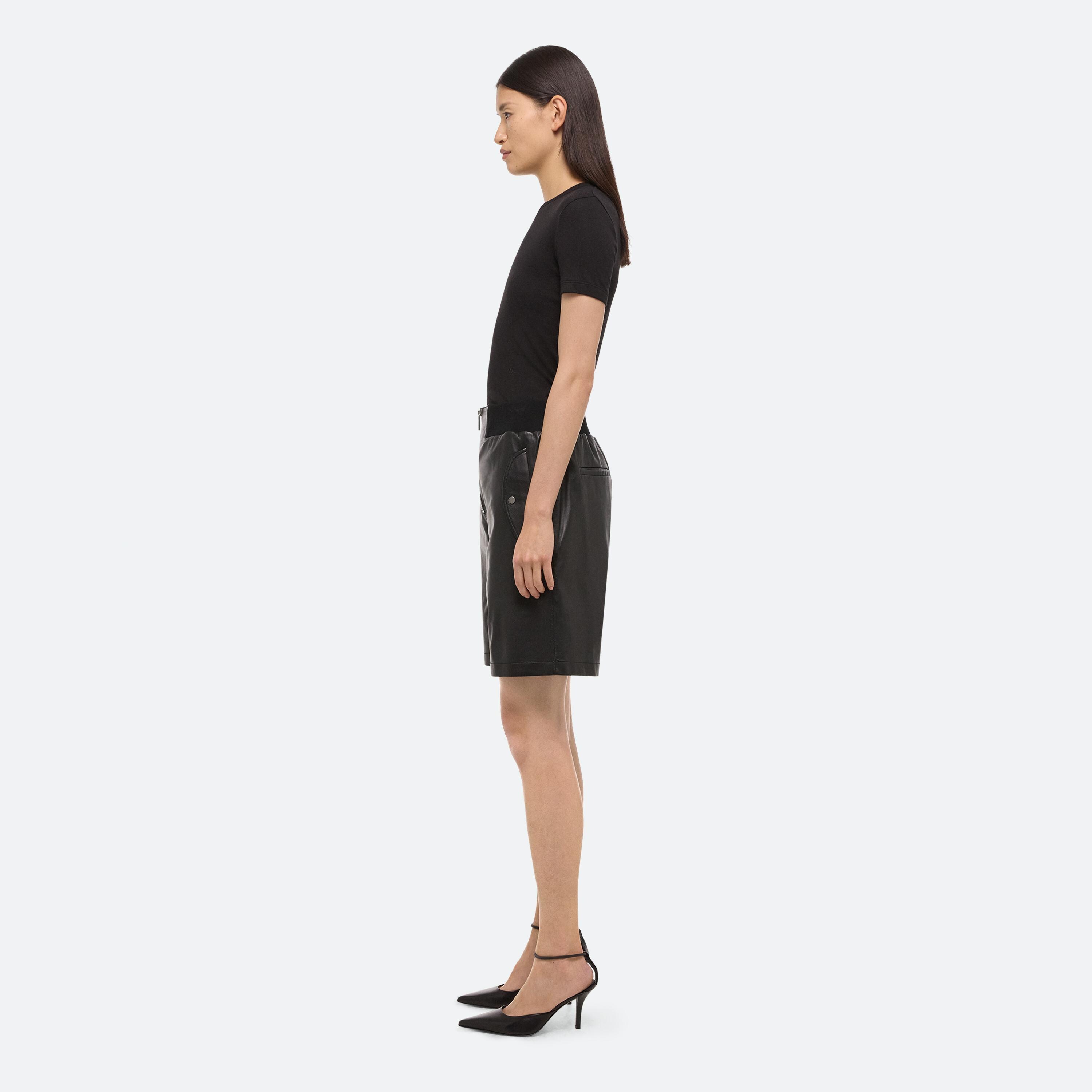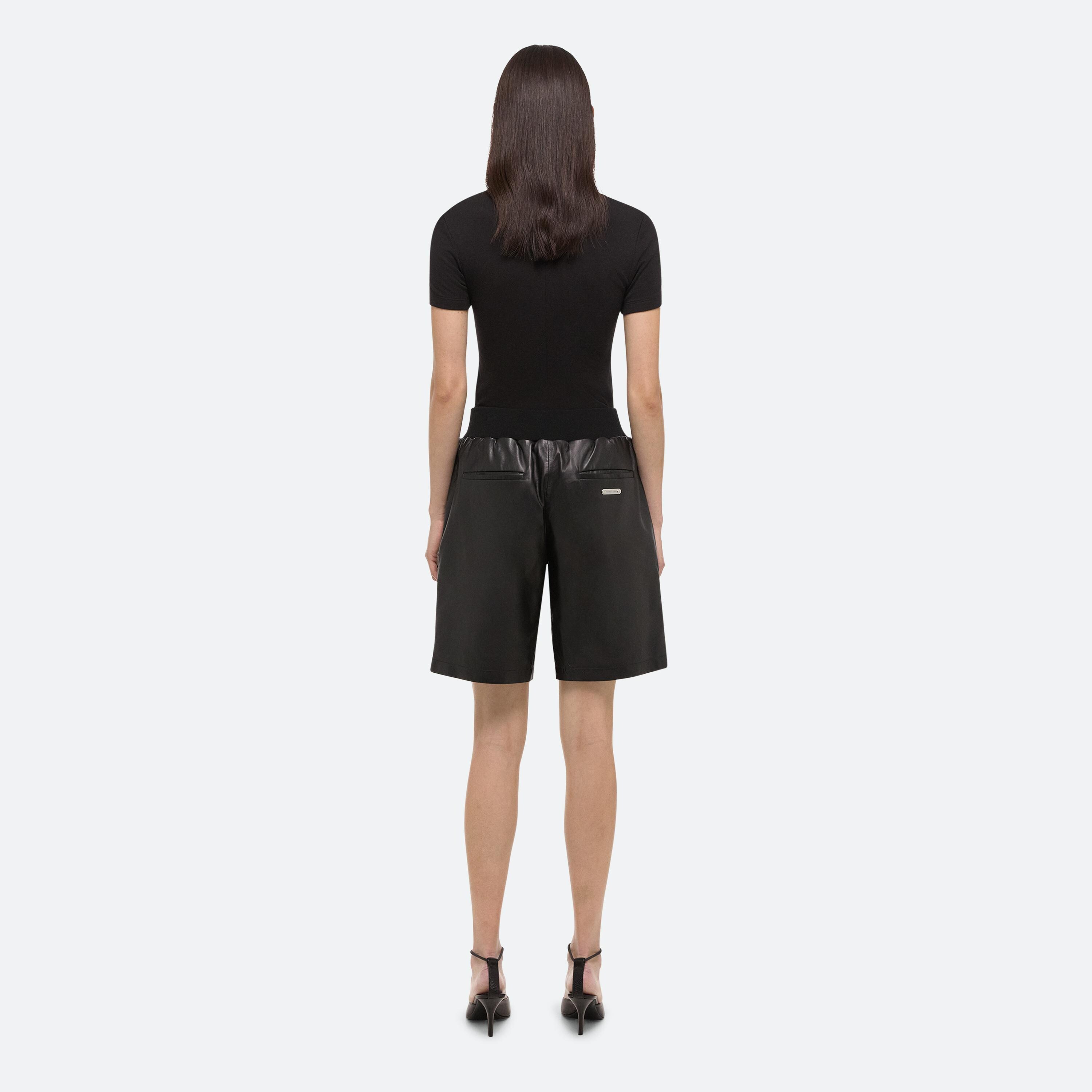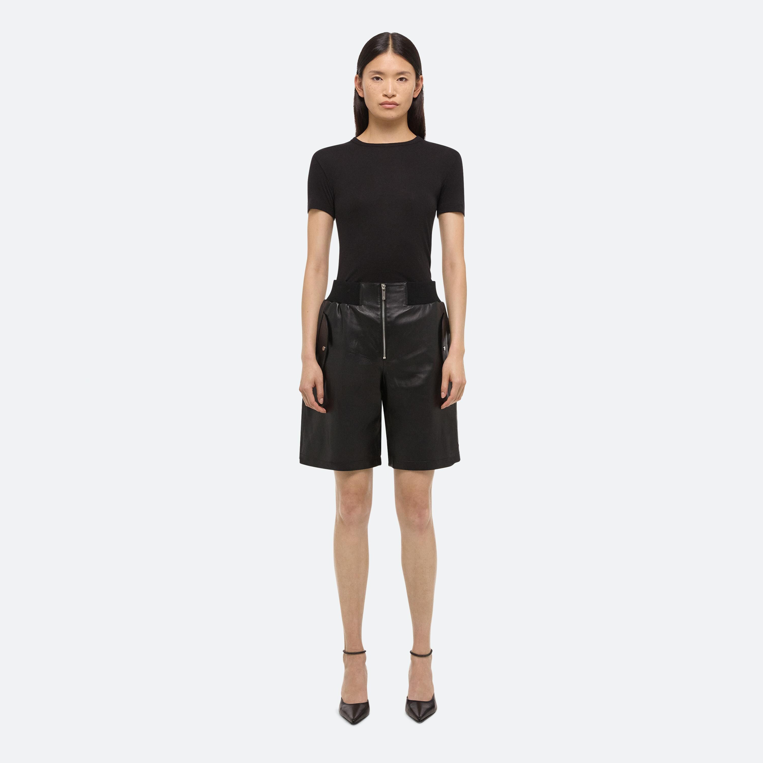 Supple lambskin leather shorts with bomber jacket details, including an exposed metal zip and snap pockets.