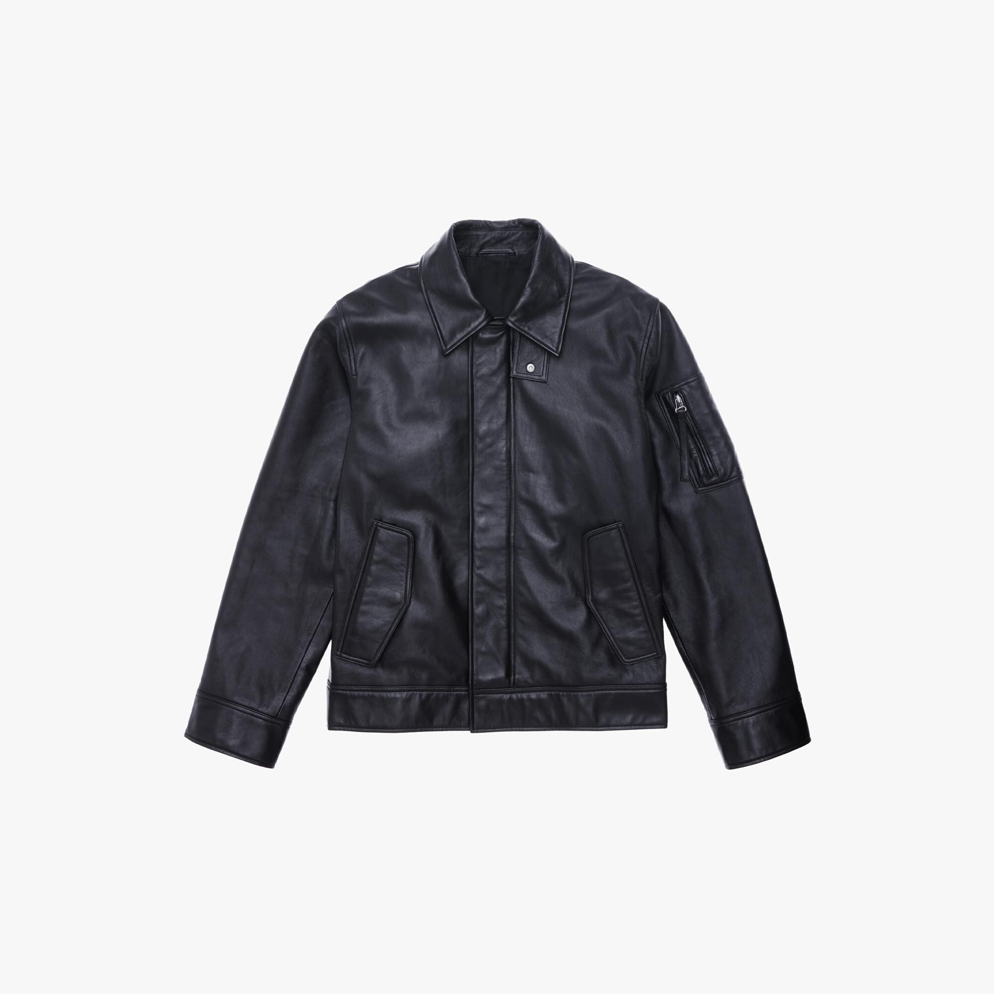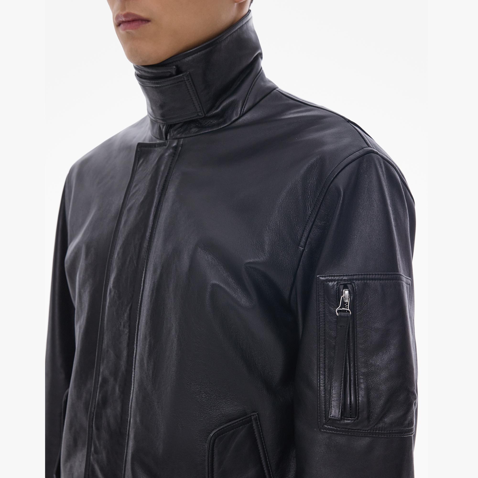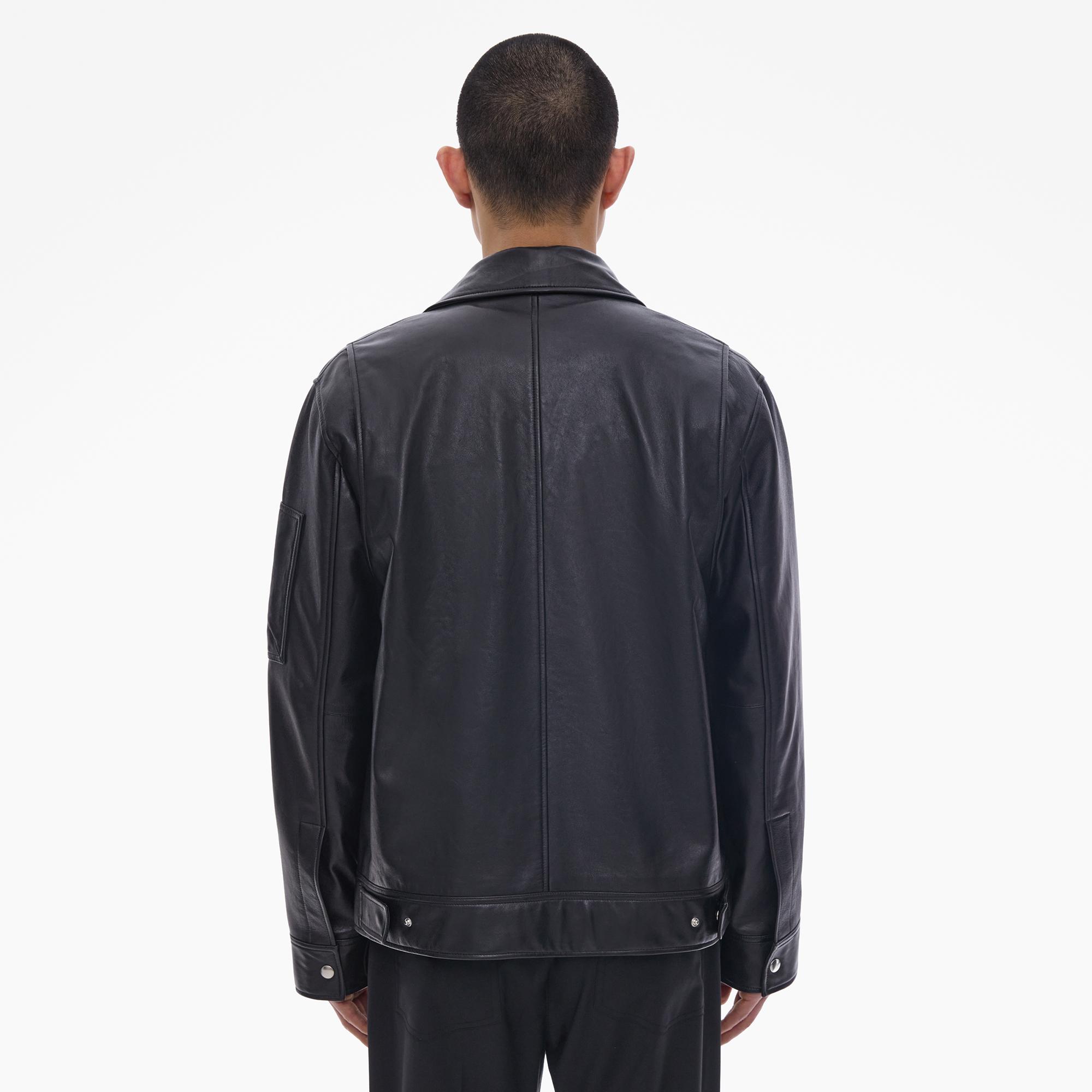 The Helmut Lang Flight Jacket is a straight-cut style in vegetable-tanned leather with a pointed collar, front zip and snap pockets, waist flap pockets, a zip sleeve pocket, and snap cuffs.