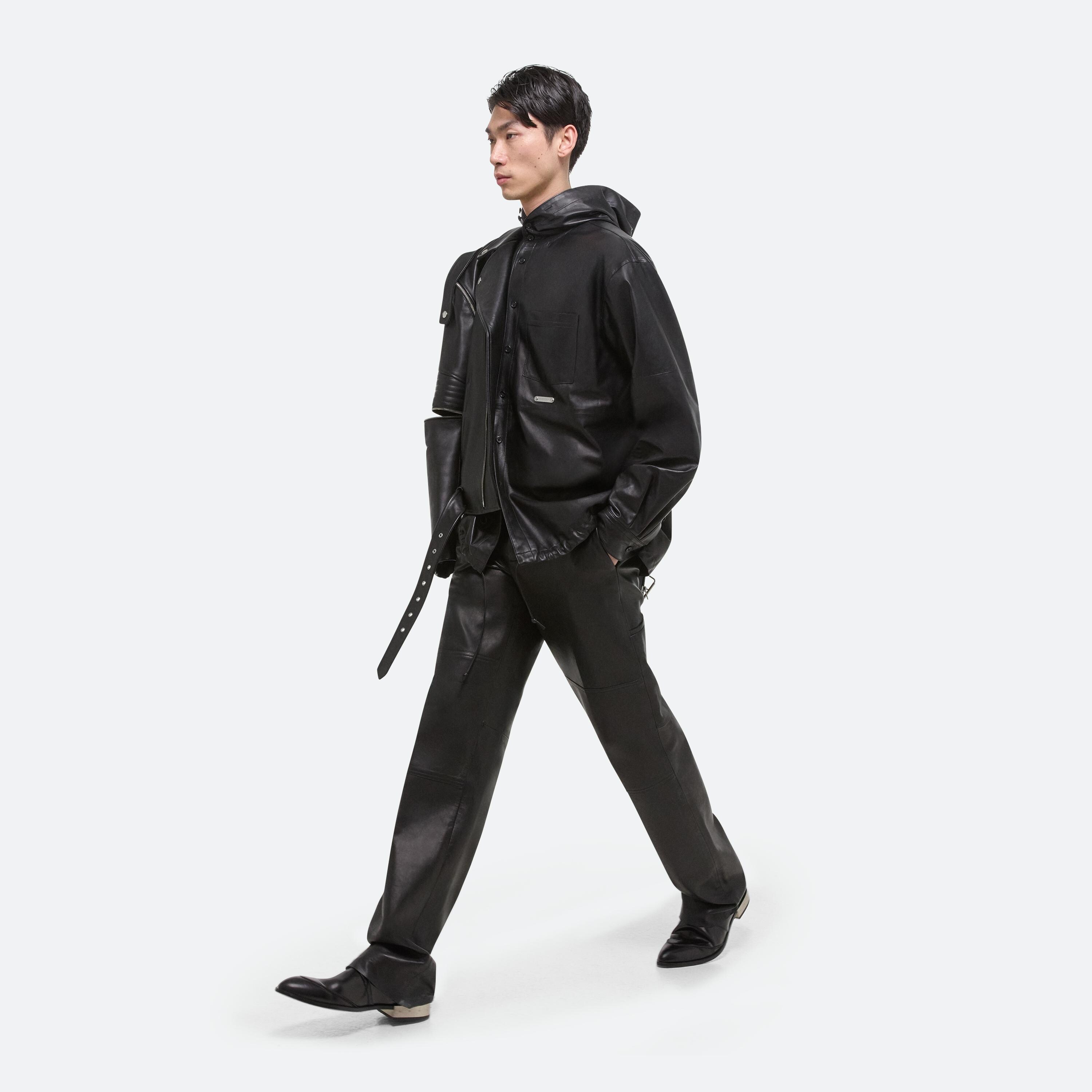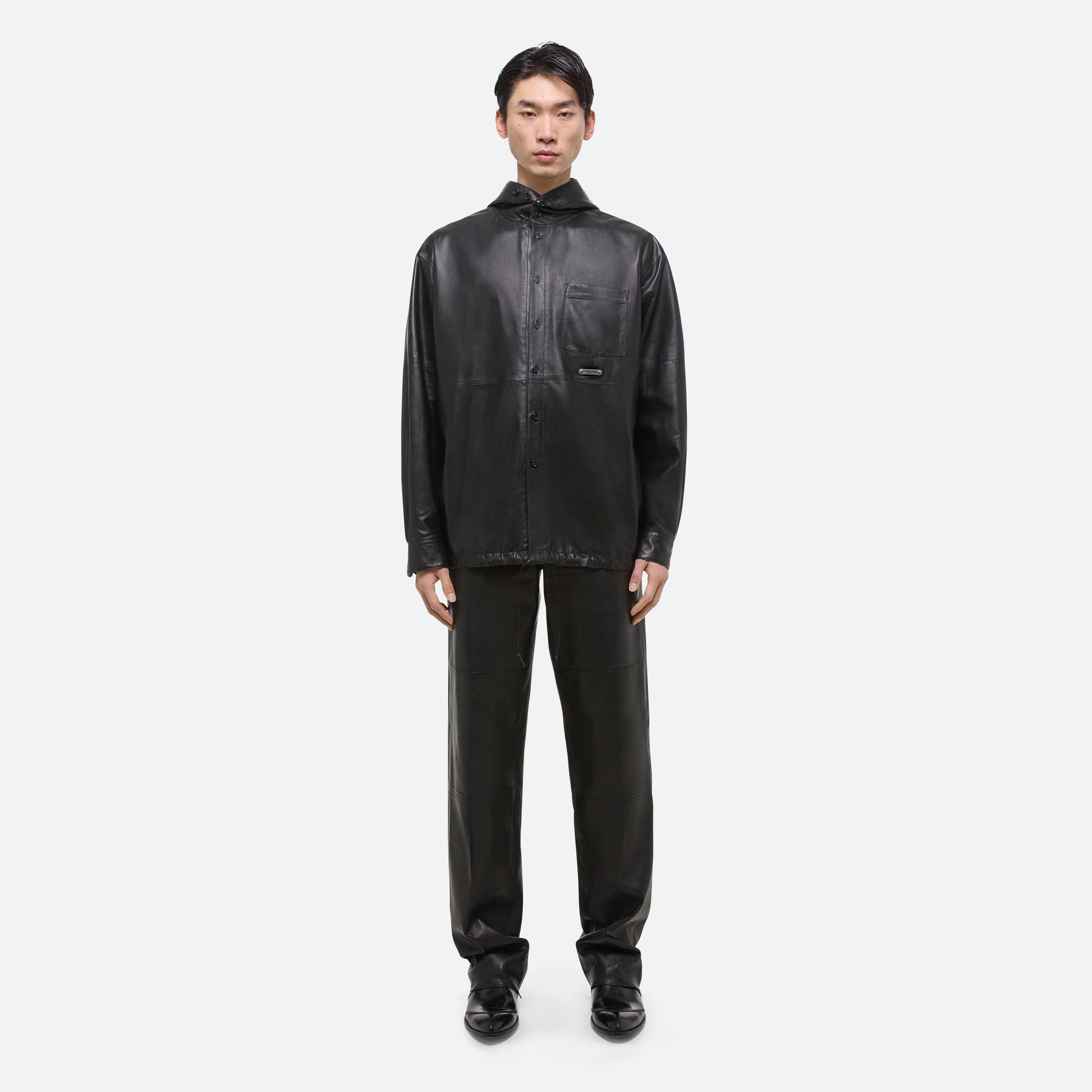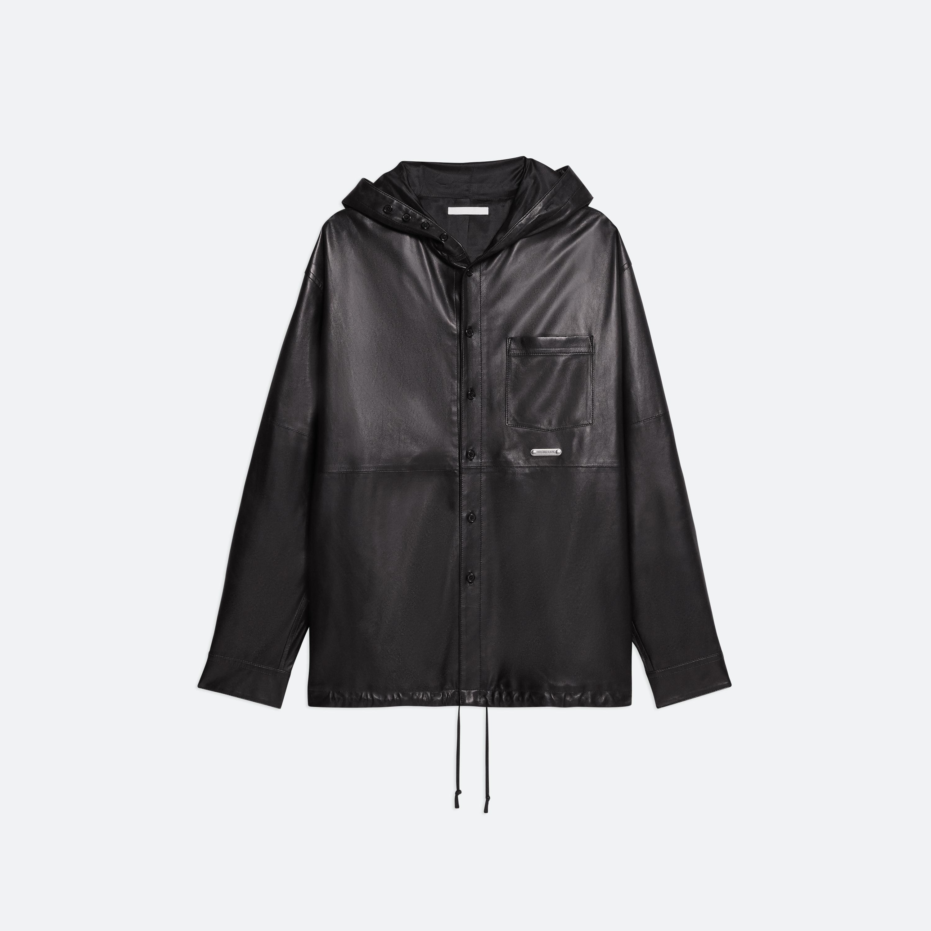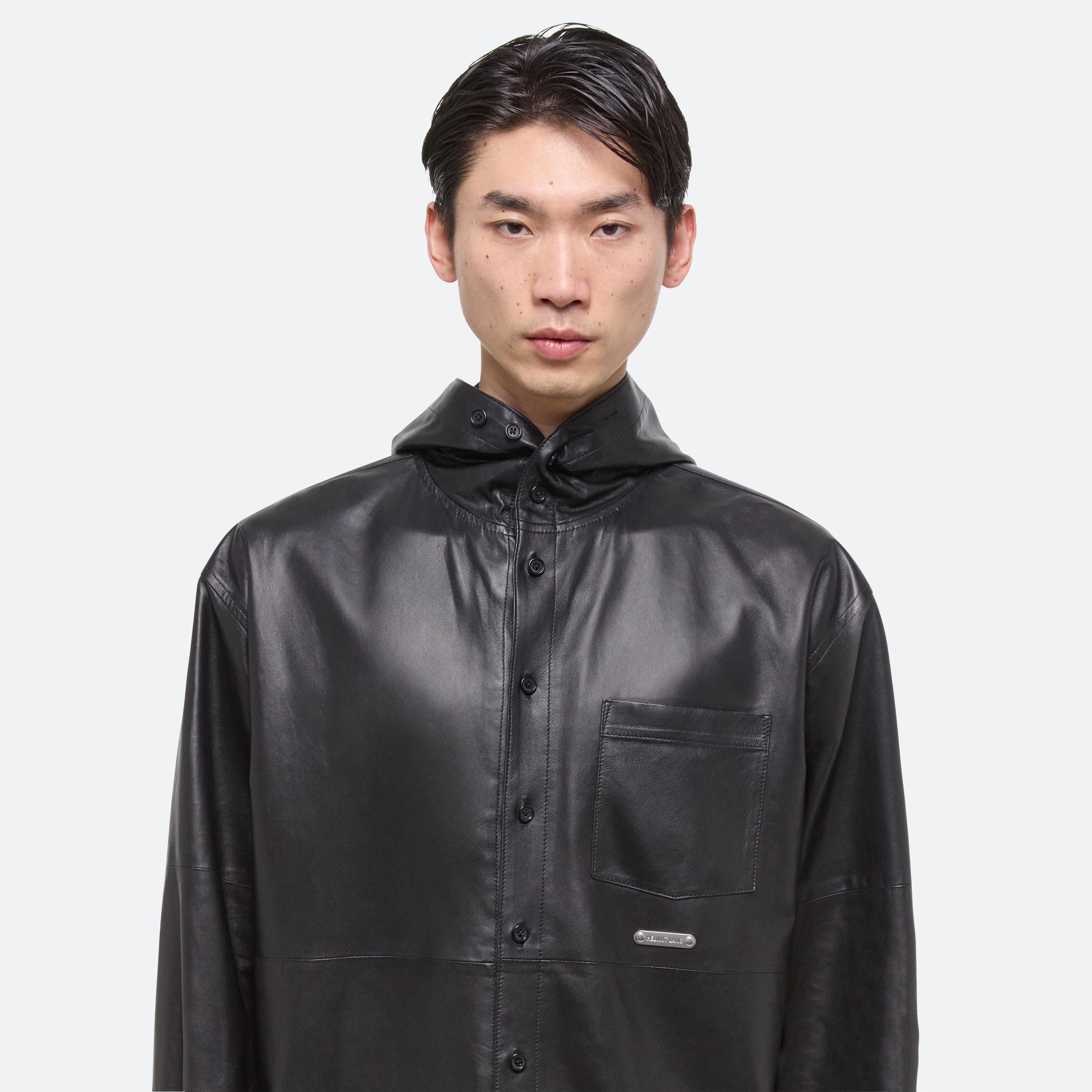 Oversized hooded shirt in supple lightweight lambskin leather. An infinite placket that extends along the hood and leather drawstrings at the hem create multiple styling options.