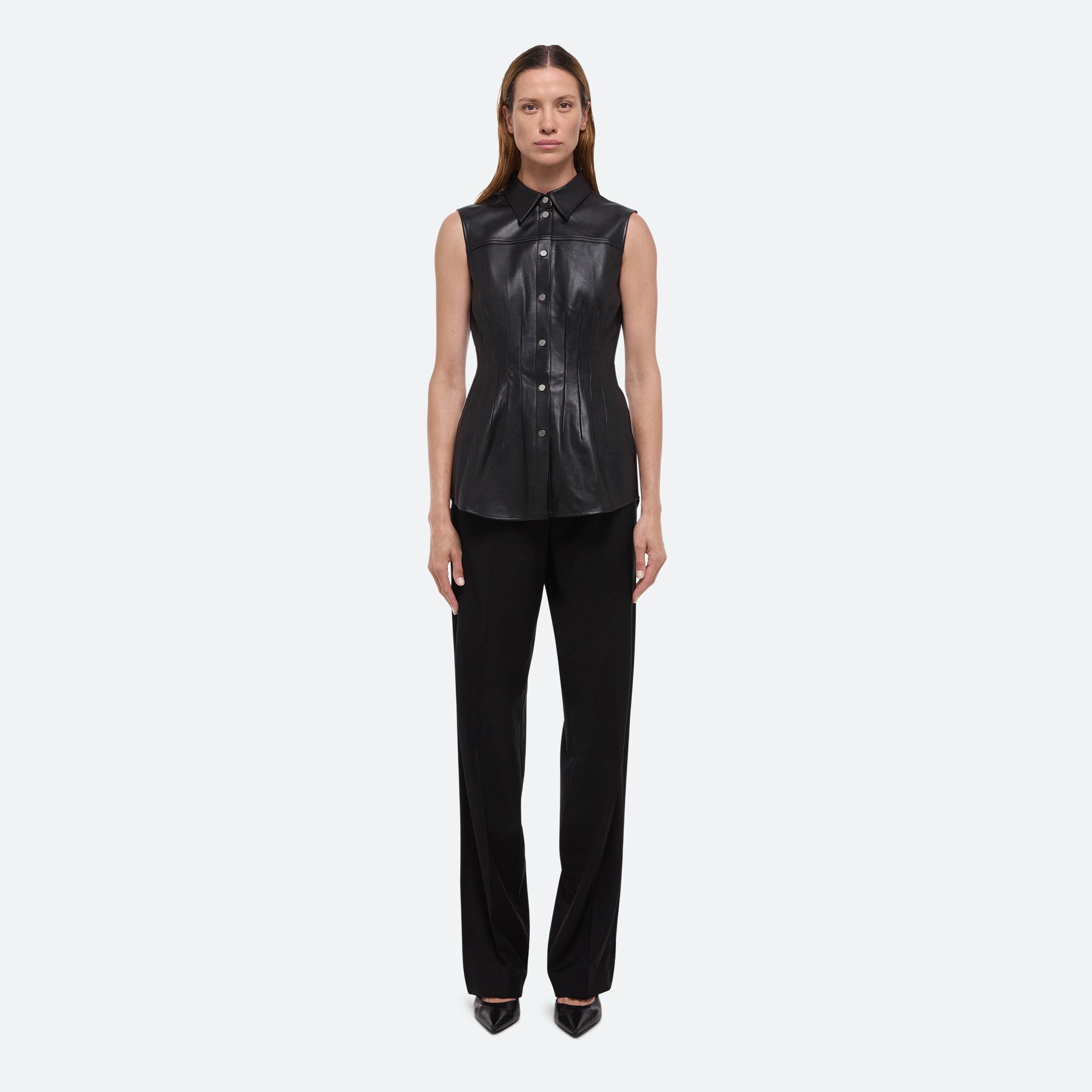 Sleeveless leather shirt with a fitted waist sculpted by darts.